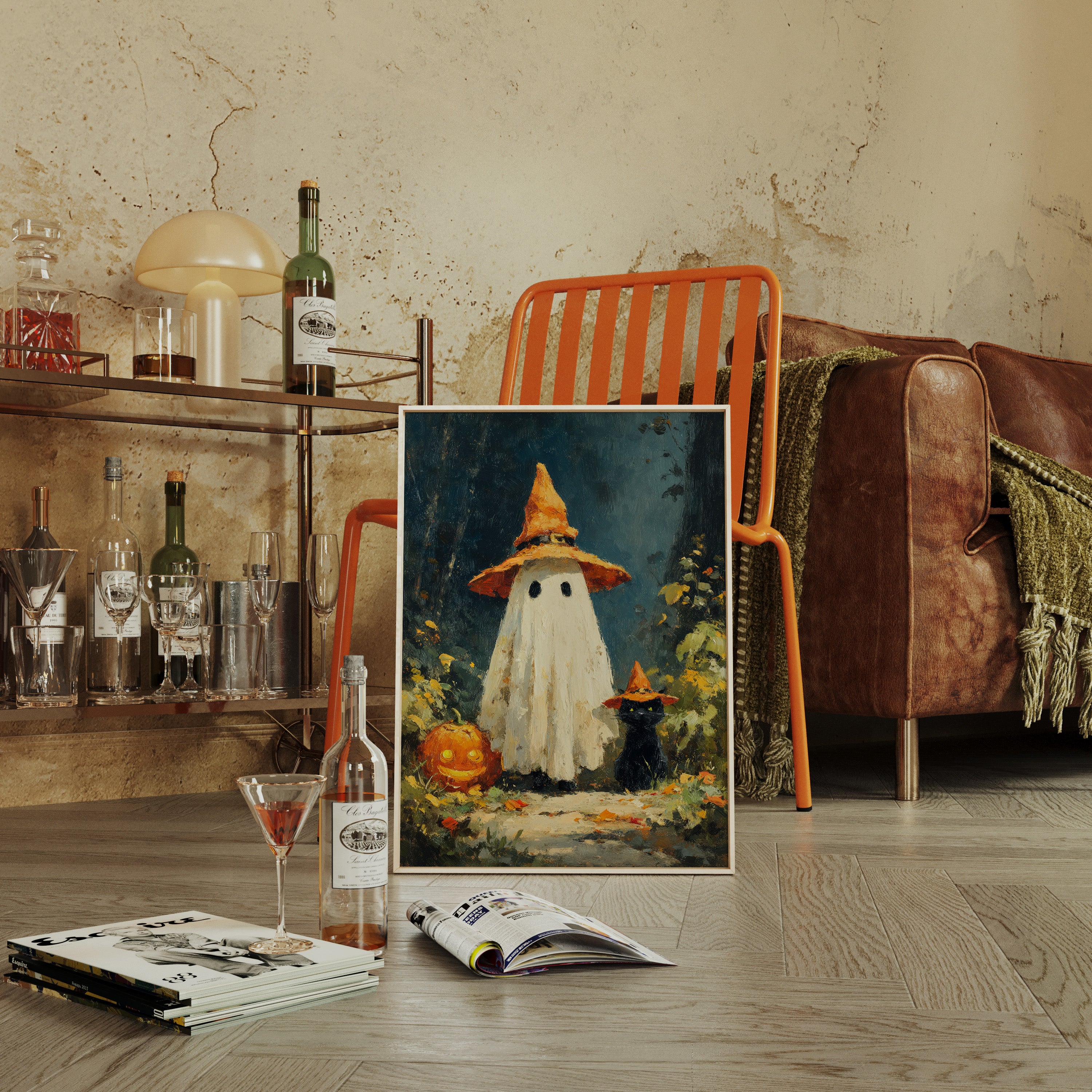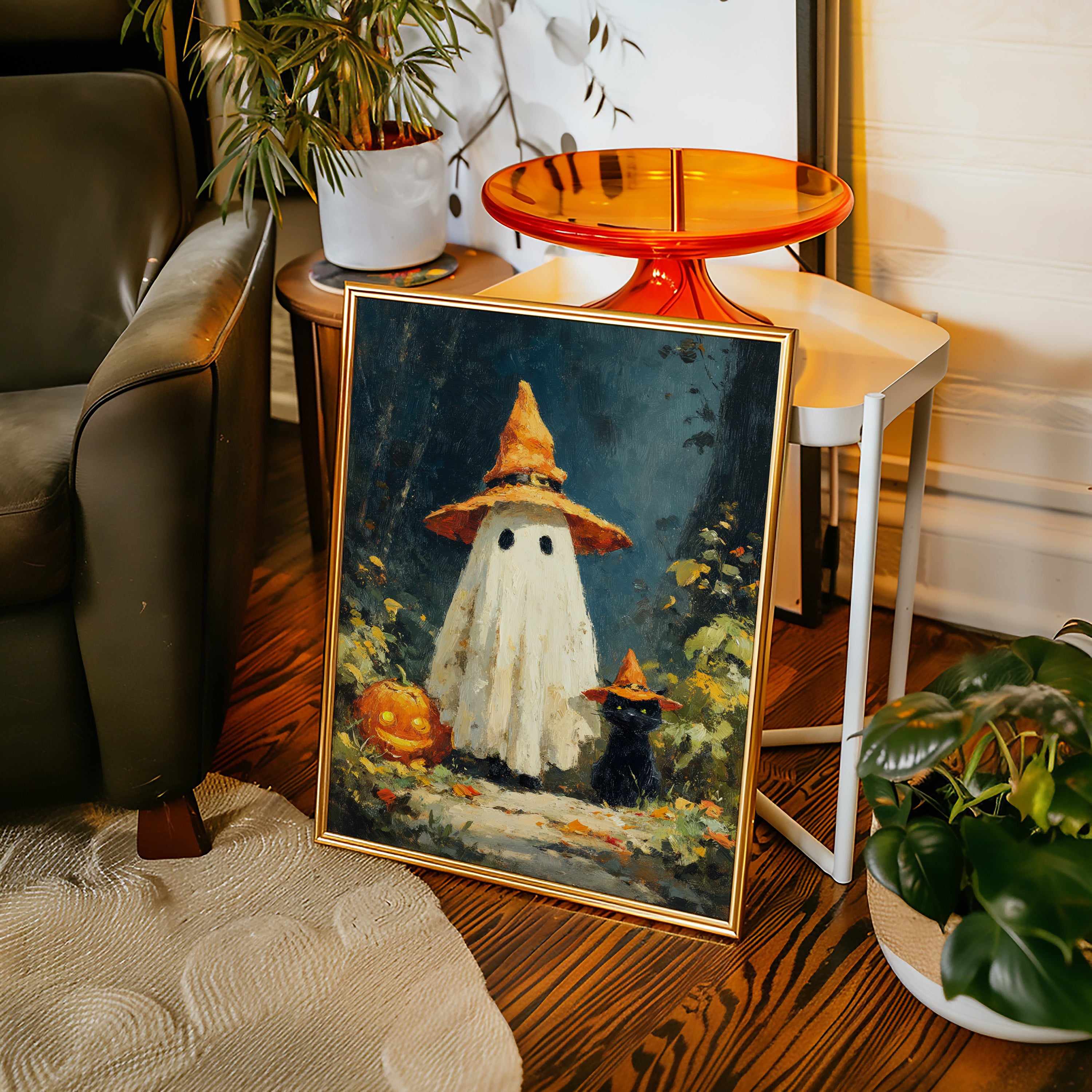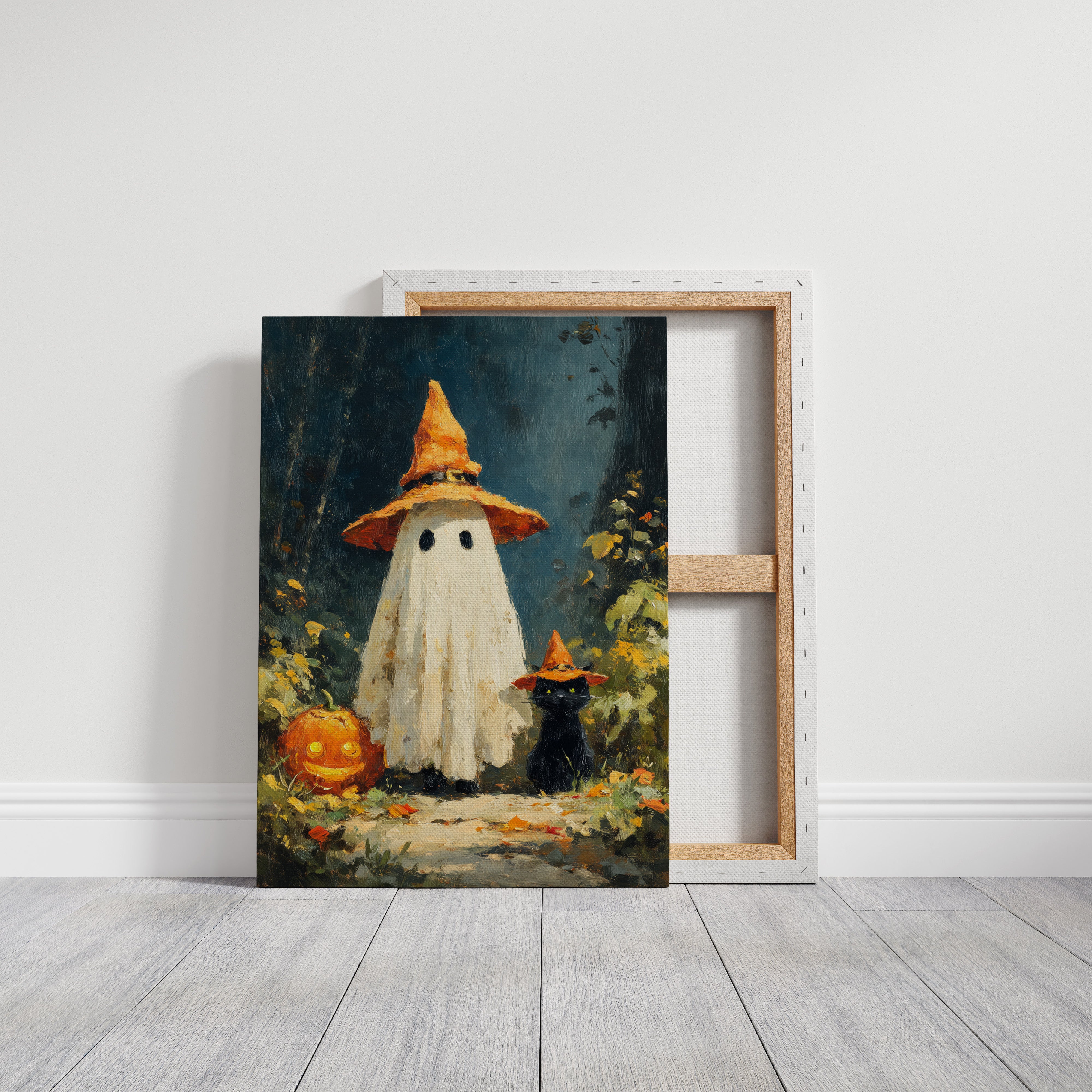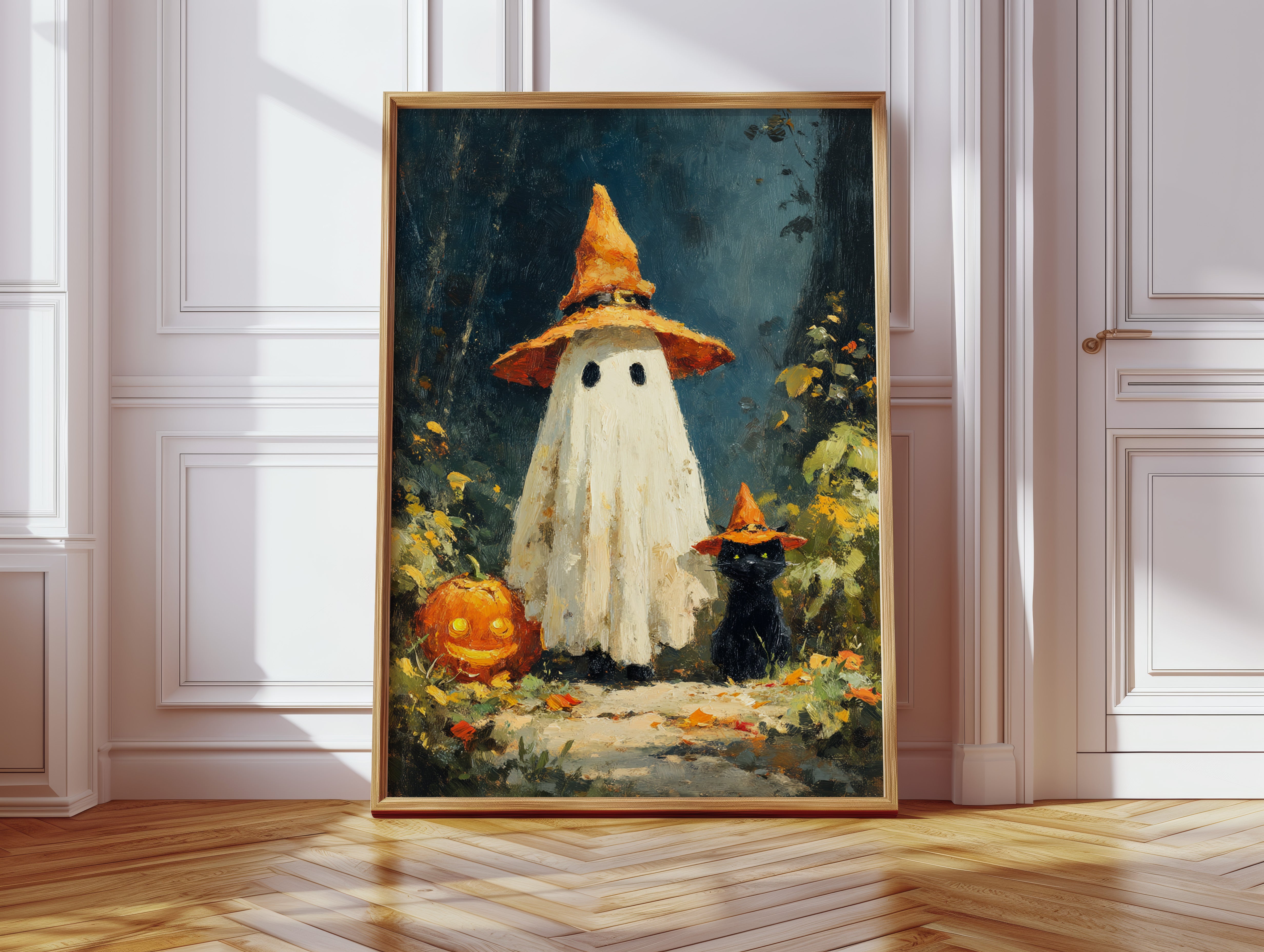 In a whimsical clearing, a ghostly figure and its feline companion stand watch, cloaked in the glow of autumn's bounty. This piece celebrates the enchanting spirit of fall, where magic dances amidst the leaves. The vibrant hues of orange and yellow create a playful yet mysterious ambiance, inviting viewers into a world where joy and eeriness intertwine. Perfect for a cozy nook or a seasonal display, this piece brings a sense of festive wonder to your home.