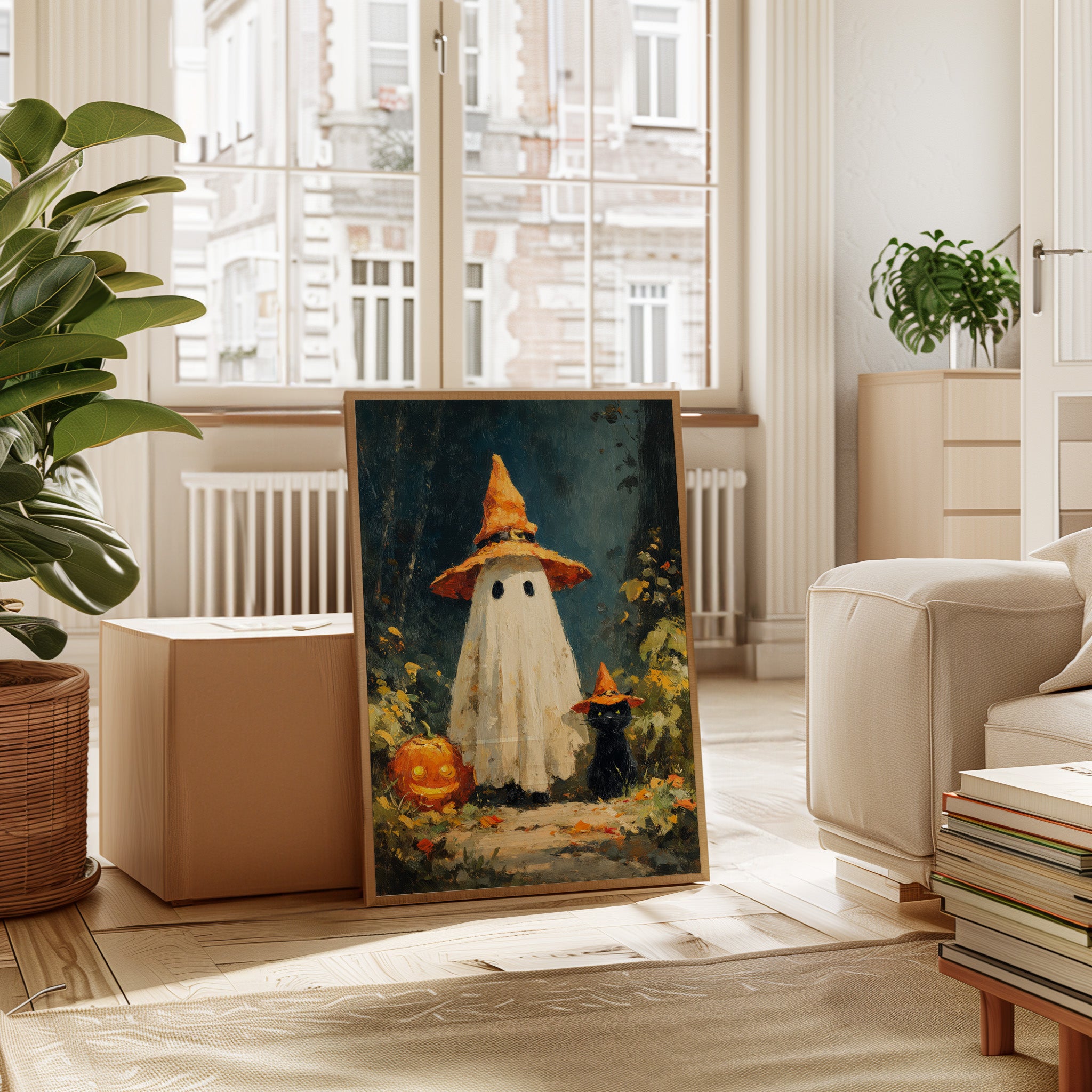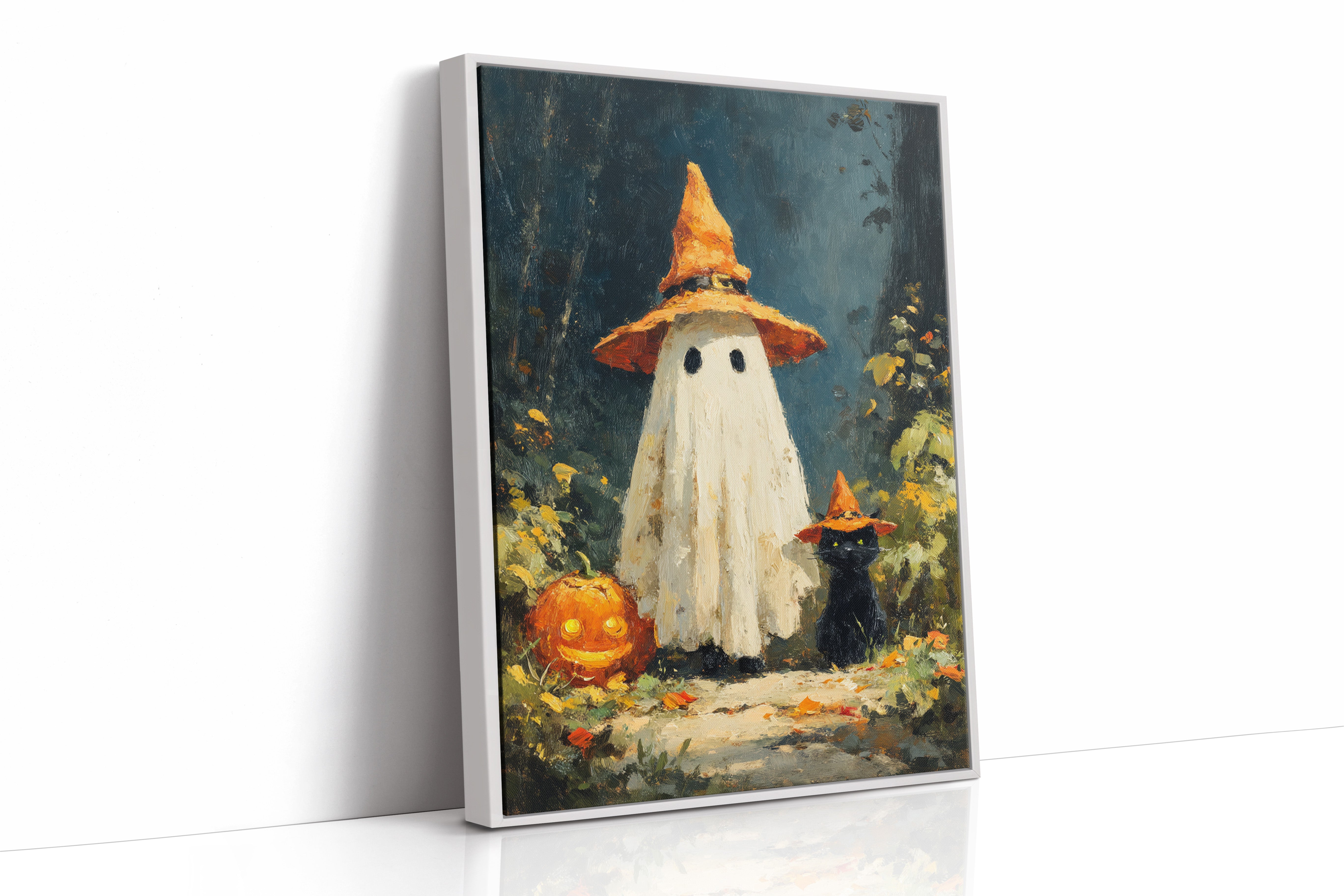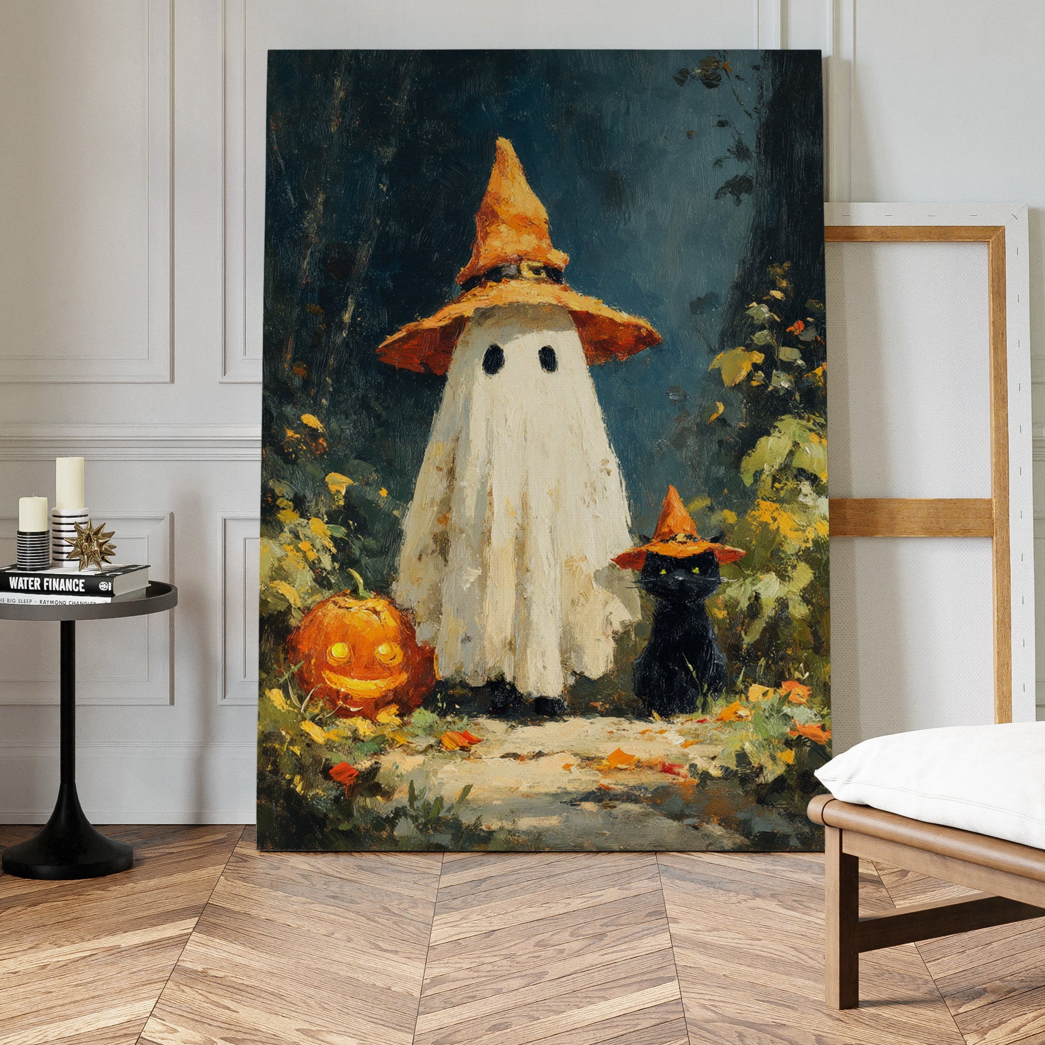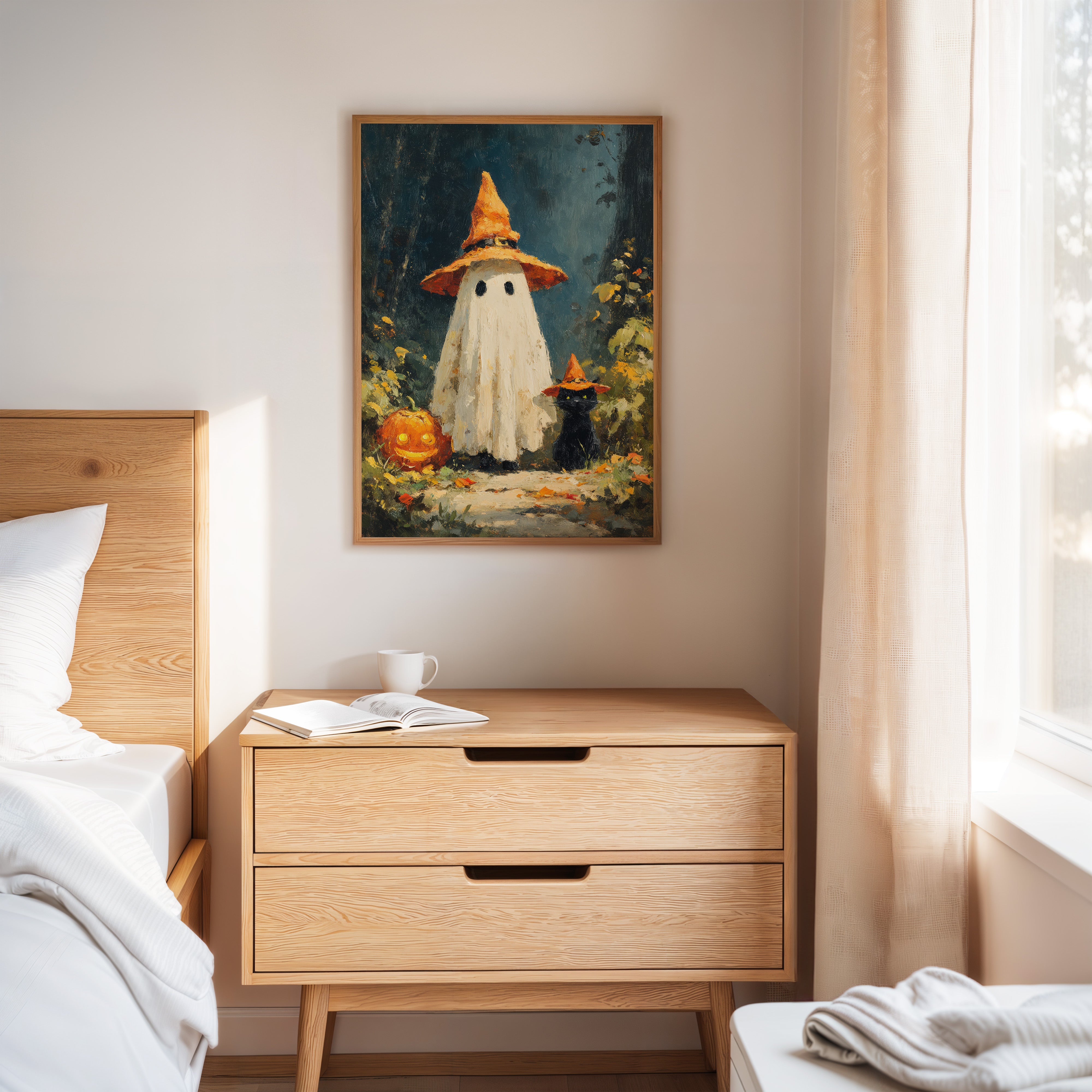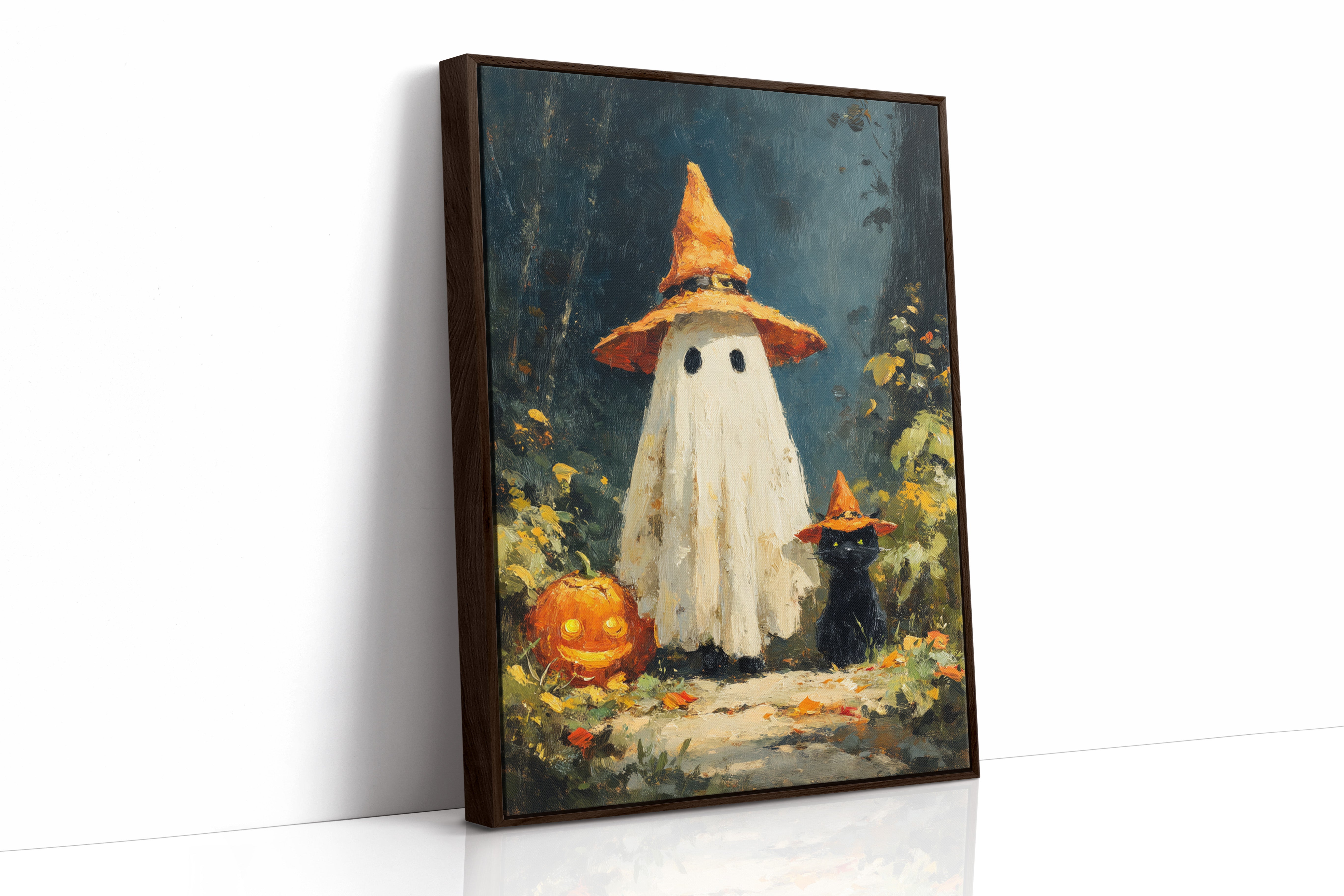 In a whimsical clearing, a ghostly figure and its feline companion stand watch, cloaked in the glow of autumn's bounty. This piece celebrates the enchanting spirit of fall, where magic dances amidst the leaves. The vibrant hues of orange and yellow create a playful yet mysterious ambiance, inviting viewers into a world where joy and eeriness intertwine. Perfect for a cozy nook or a seasonal display, this piece brings a sense of festive wonder to your home.