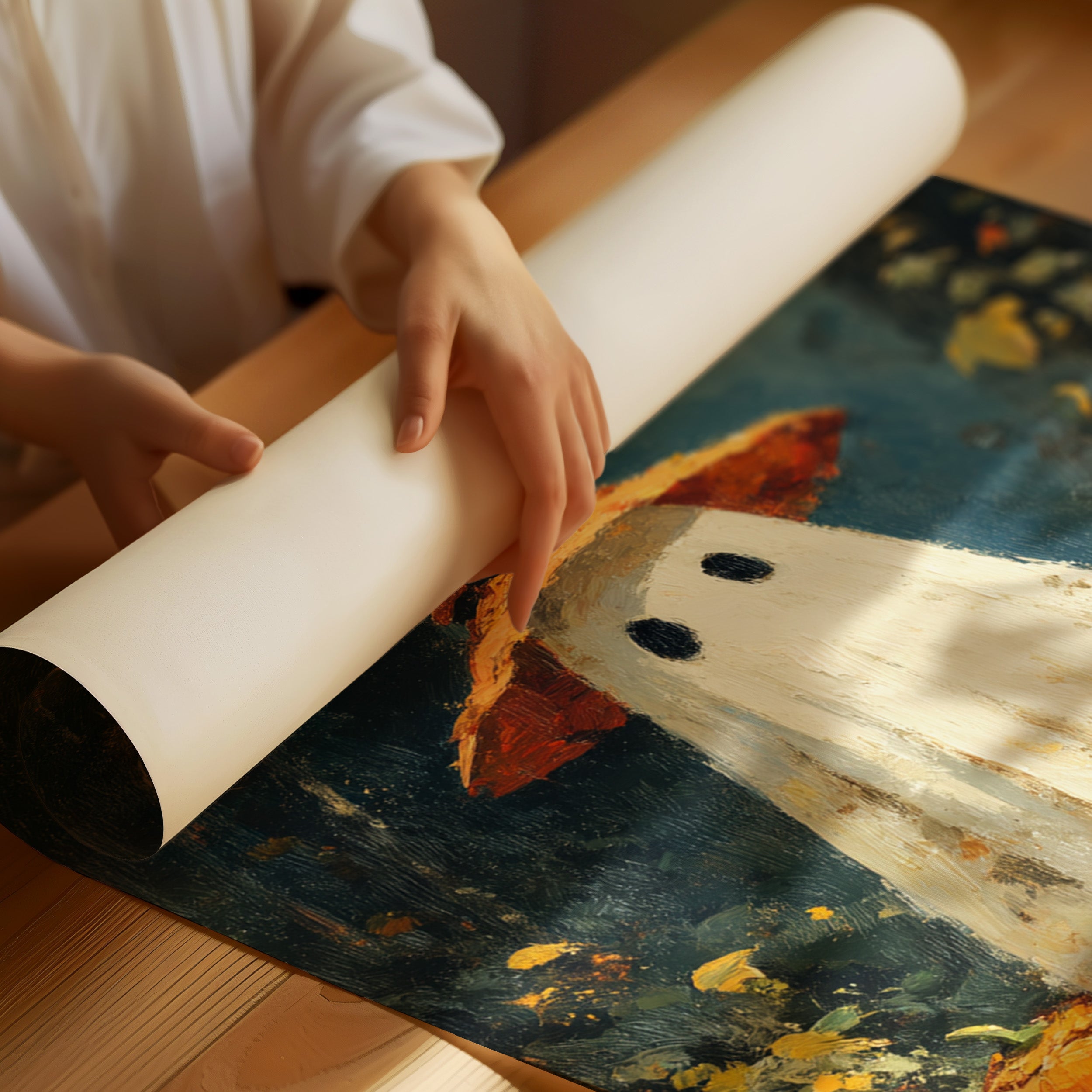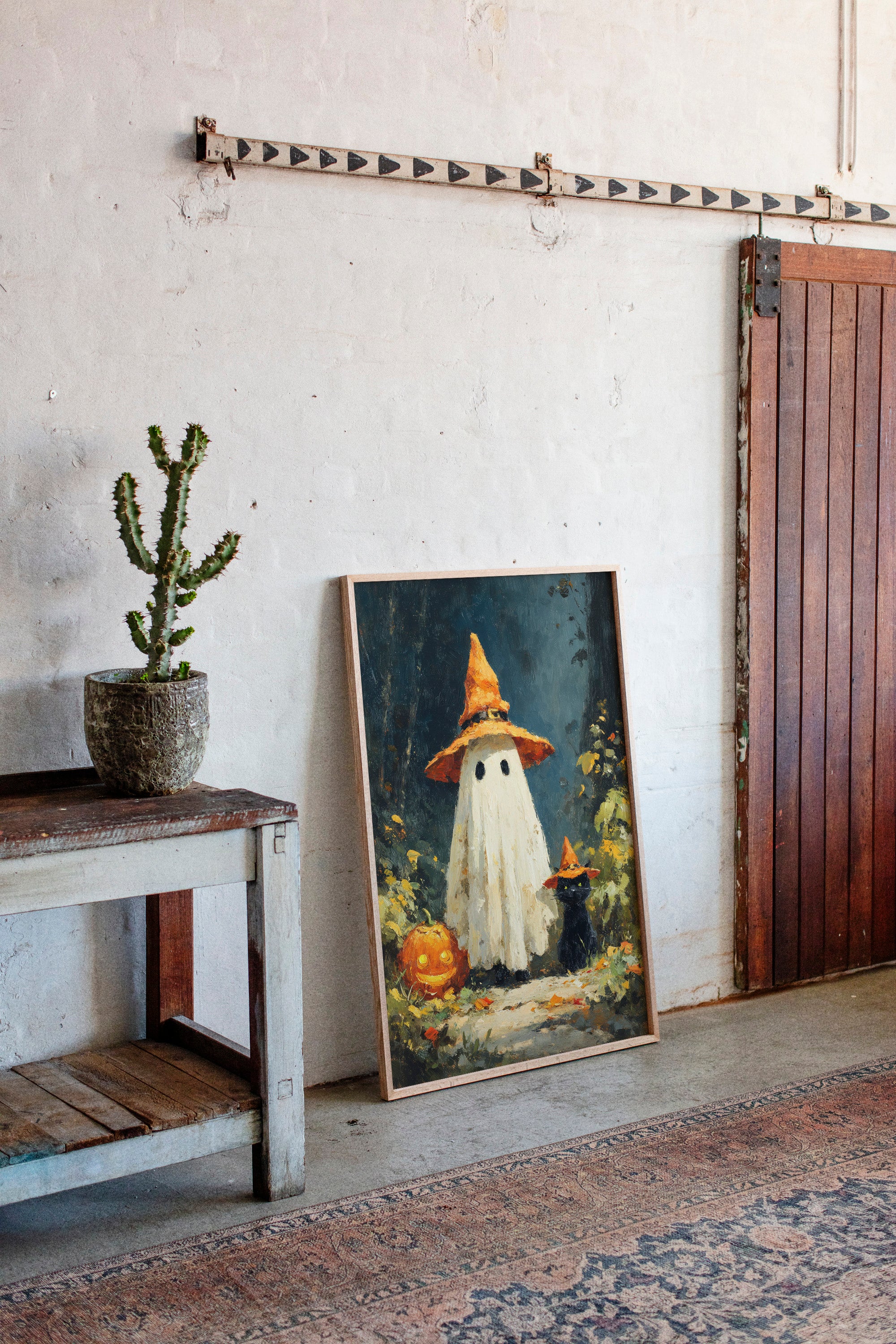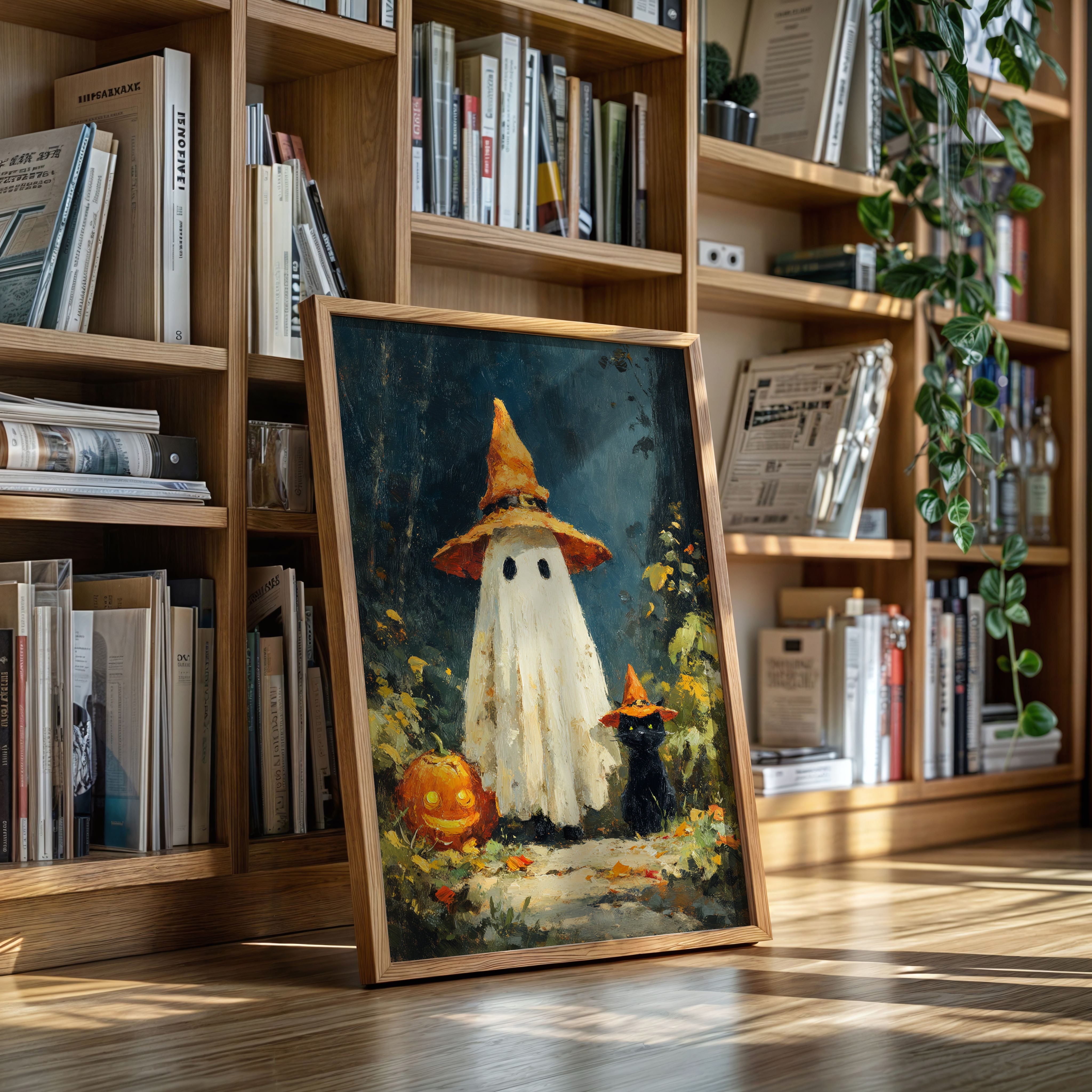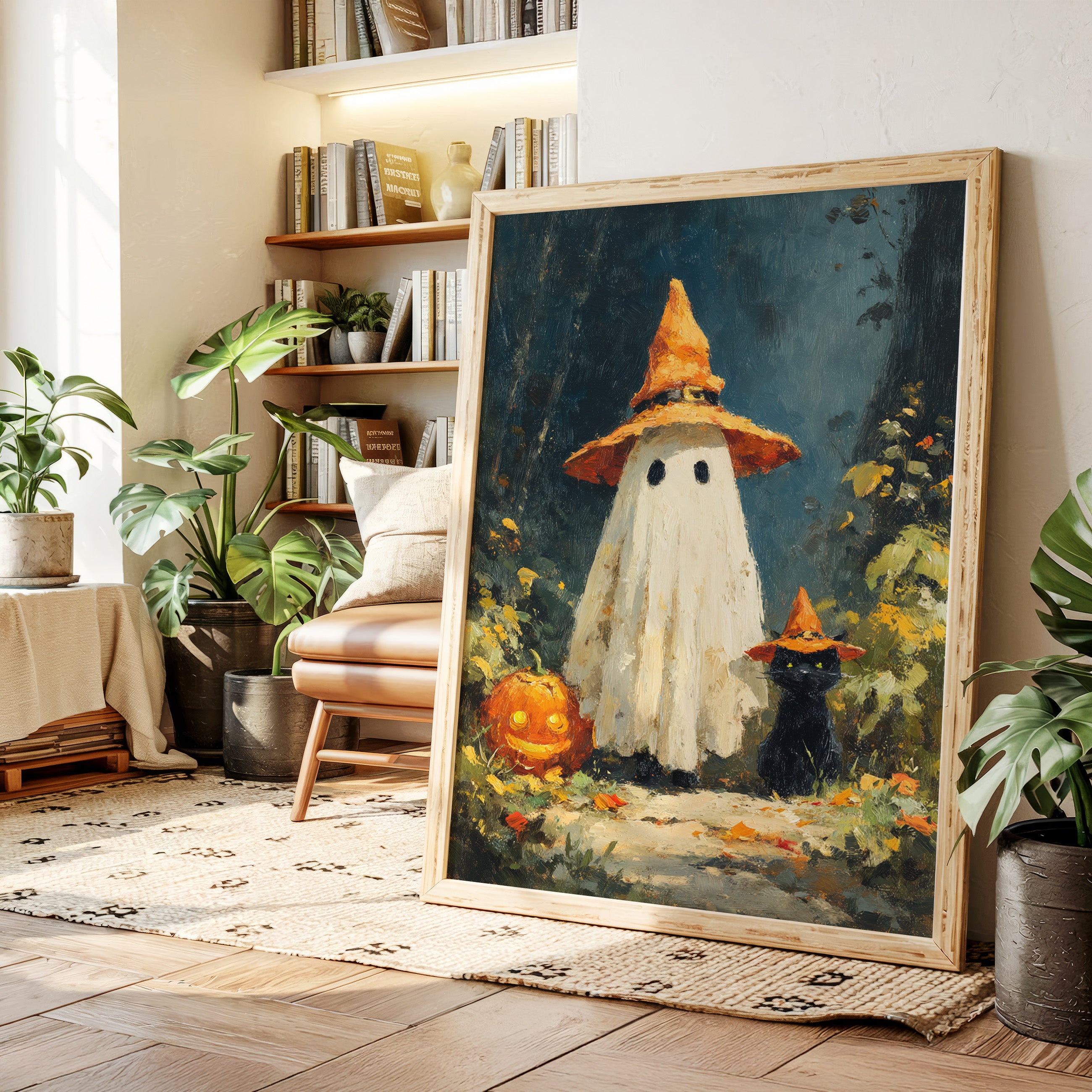 In a whimsical clearing, a ghostly figure and its feline companion stand watch, cloaked in the glow of autumn's bounty. This piece celebrates the enchanting spirit of fall, where magic dances amidst the leaves. The vibrant hues of orange and yellow create a playful yet mysterious ambiance, inviting viewers into a world where joy and eeriness intertwine. Perfect for a cozy nook or a seasonal display, this piece brings a sense of festive wonder to your home.