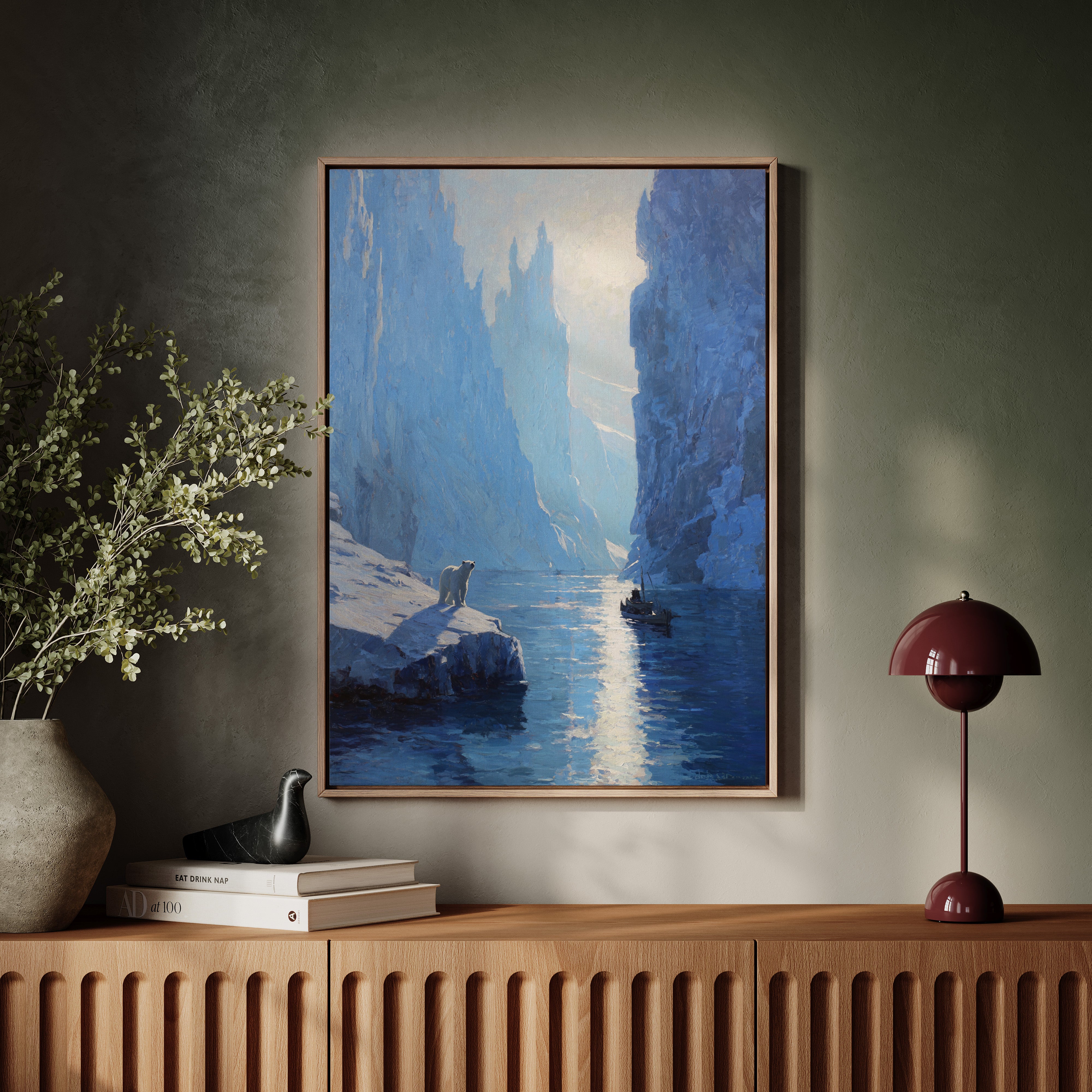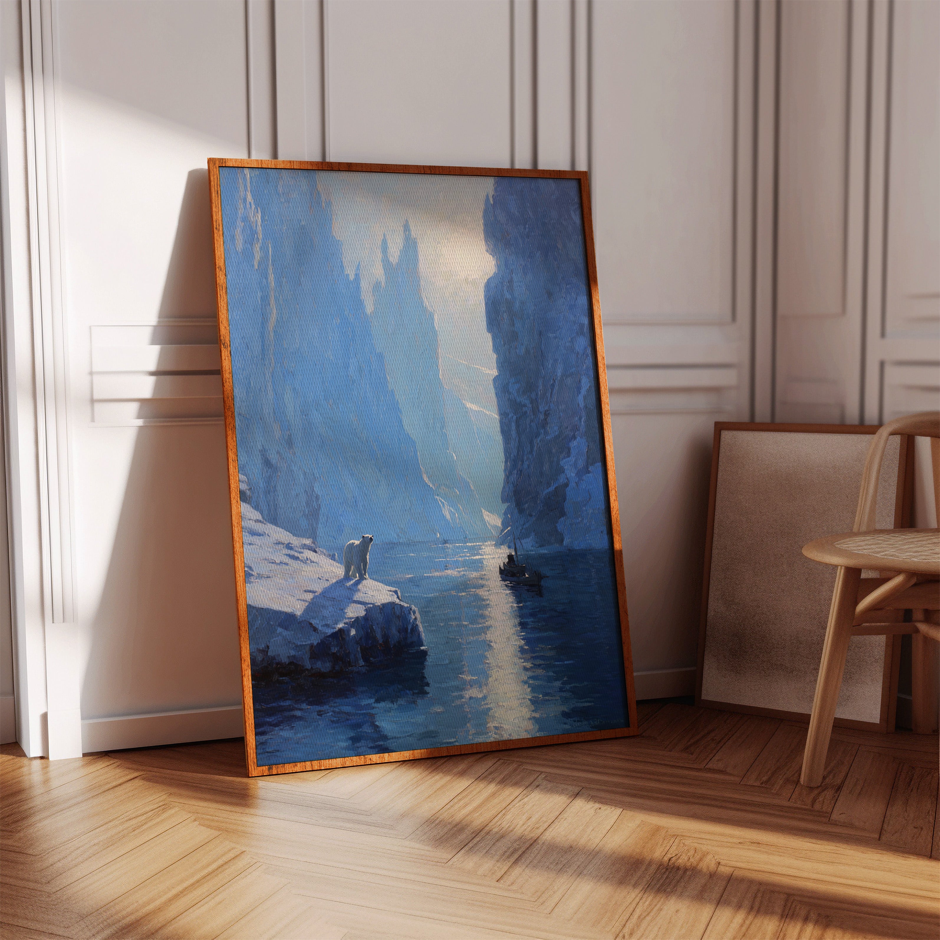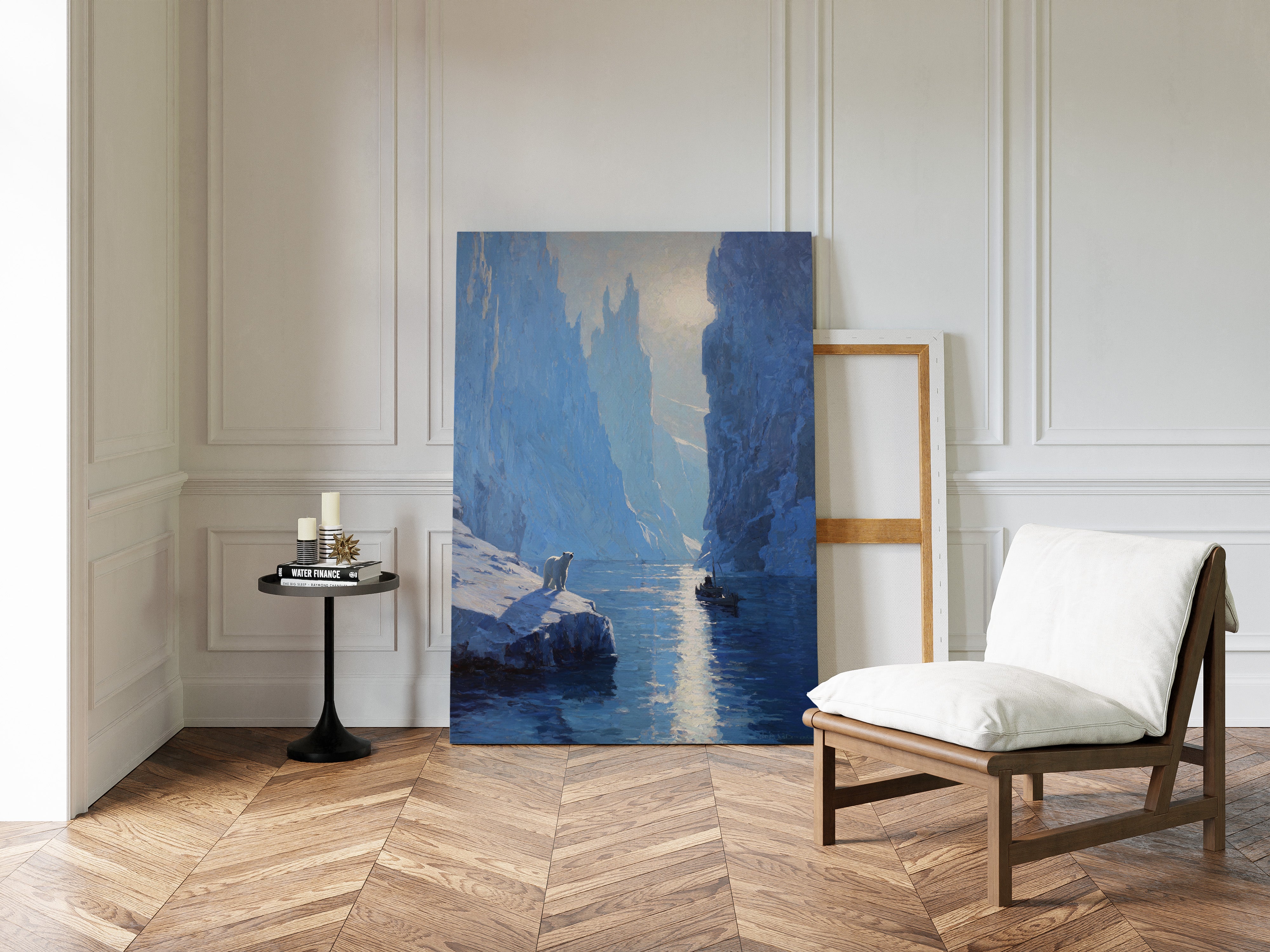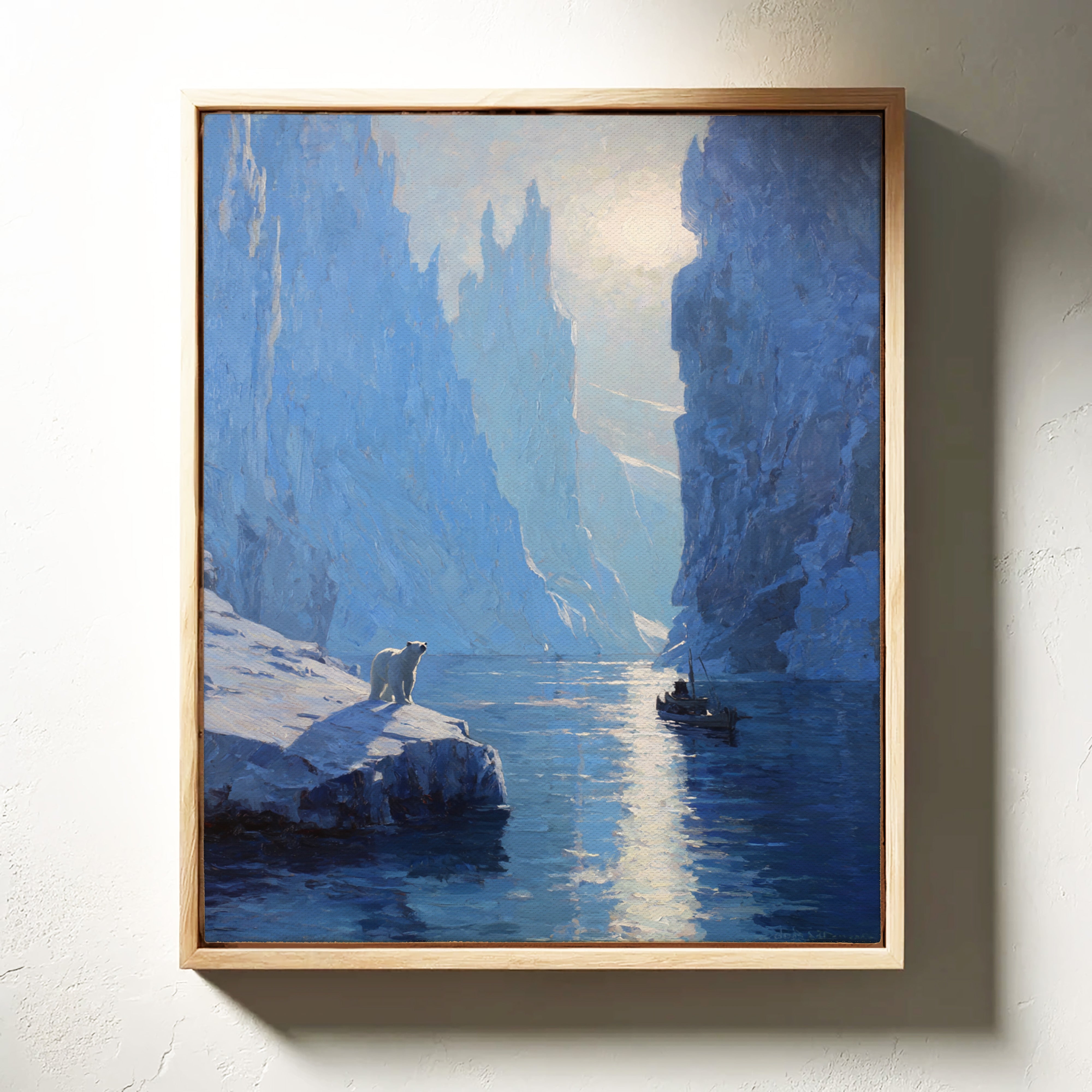A solitary polar bear stands sentinel on a rocky outcrop, gazing into the vastness of an icy fjord, where crystalline cliffs rise majestically against a shimmering sky. This piece embodies the serene elegance of the Artisanal collection, inviting contemplation and wonder. As cool blues and whites dance across the canvas, the textures of the ice and water evoke a sense of peace, while the lone bear hints at the resilience of nature in a fragile world. Perfect for a tranquil living room or a serene study, this artwork brings the beauty of the Arctic indoors.