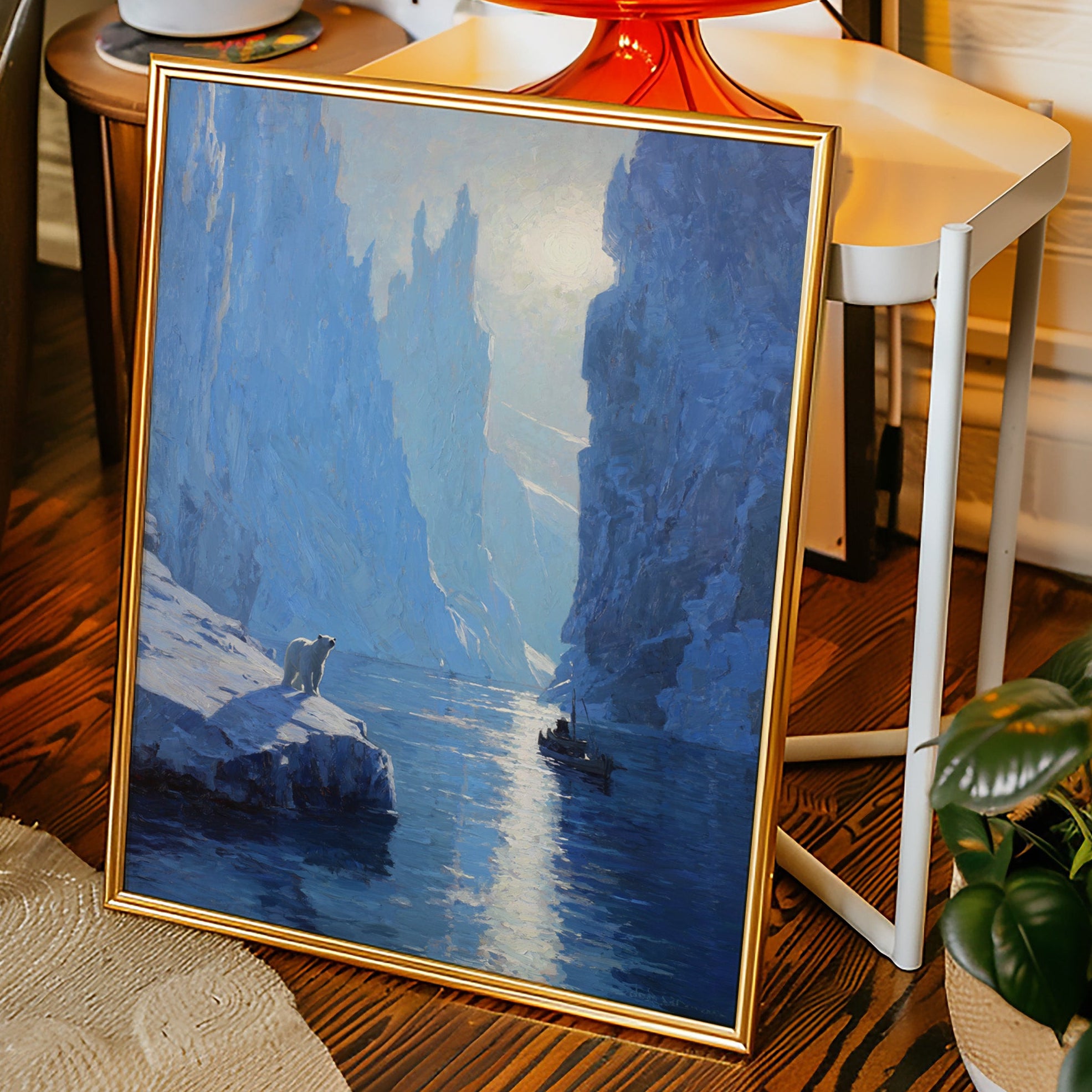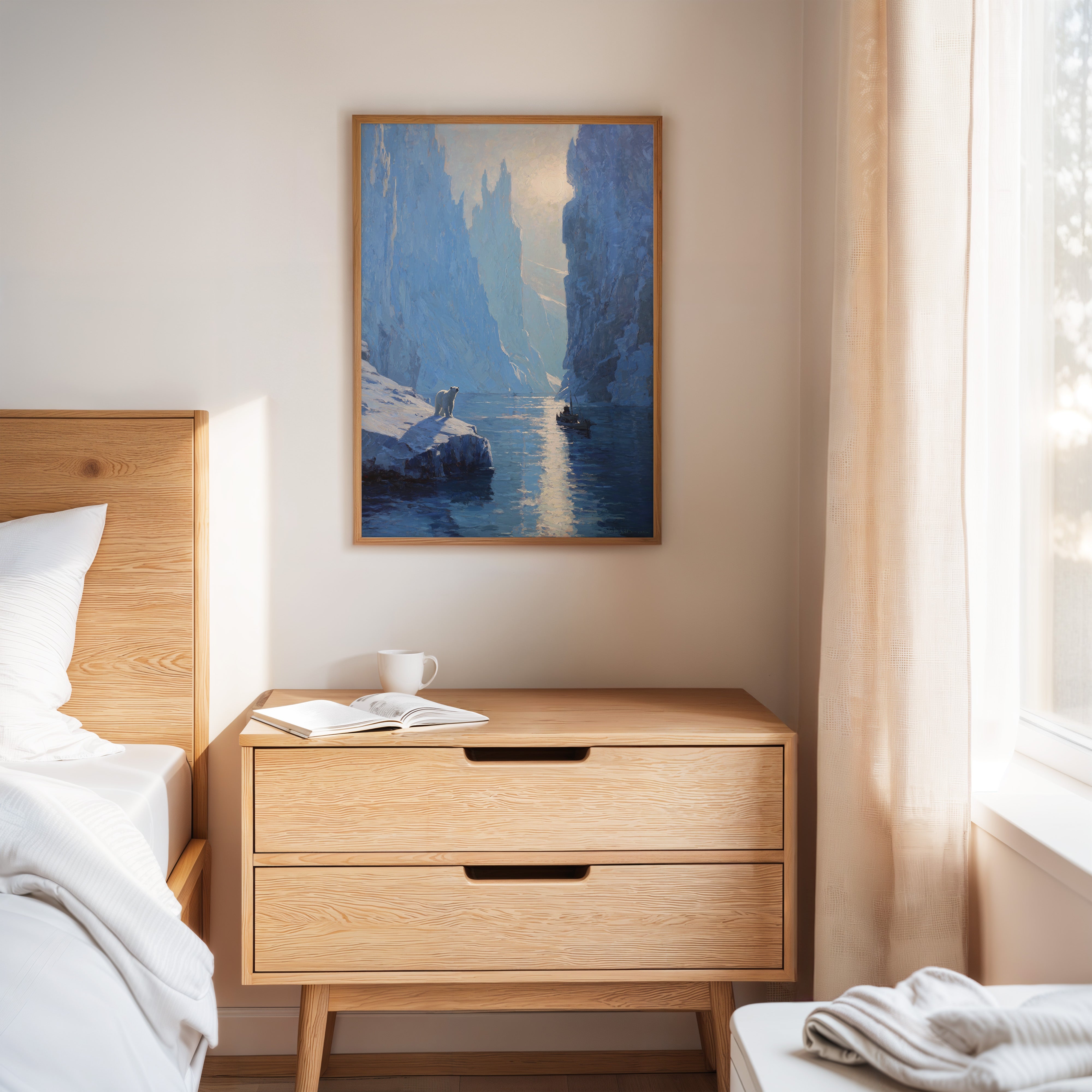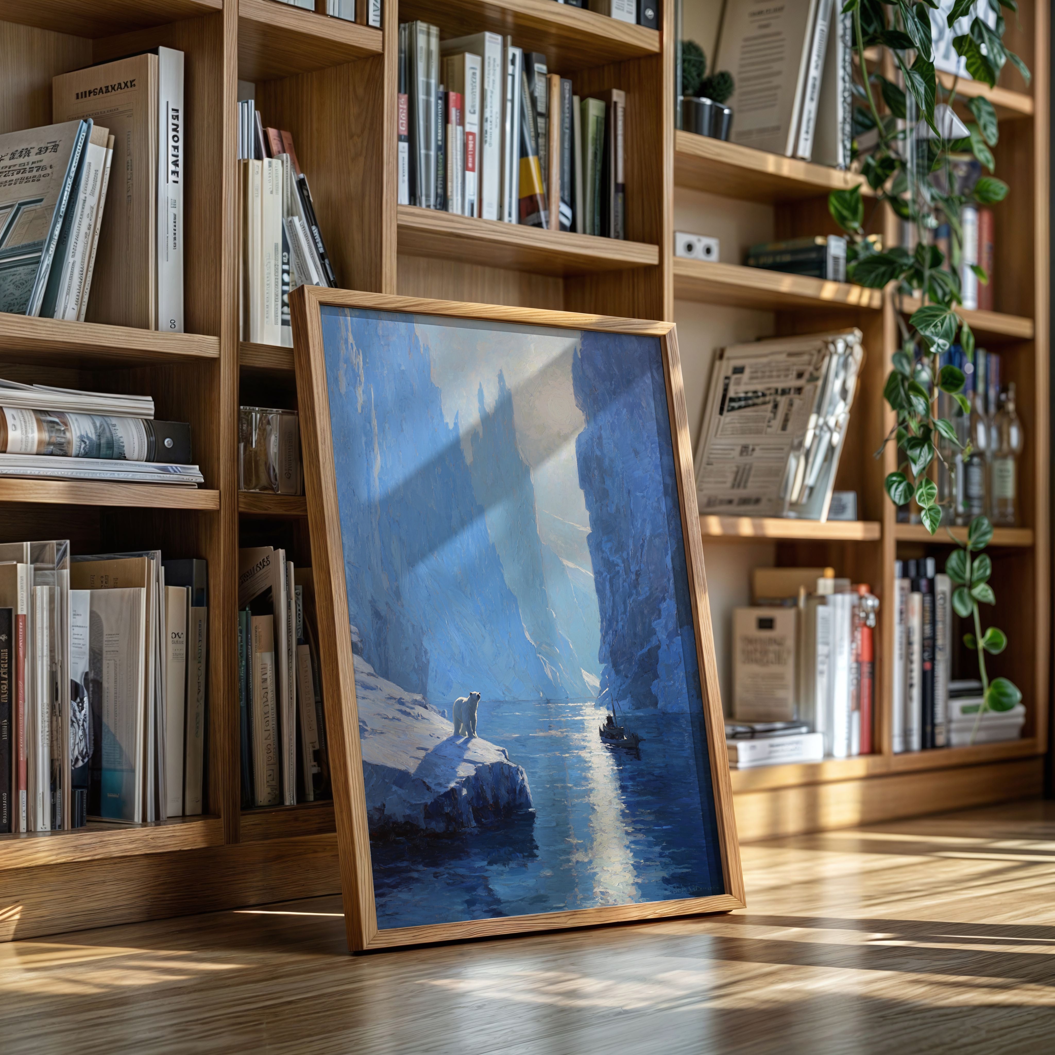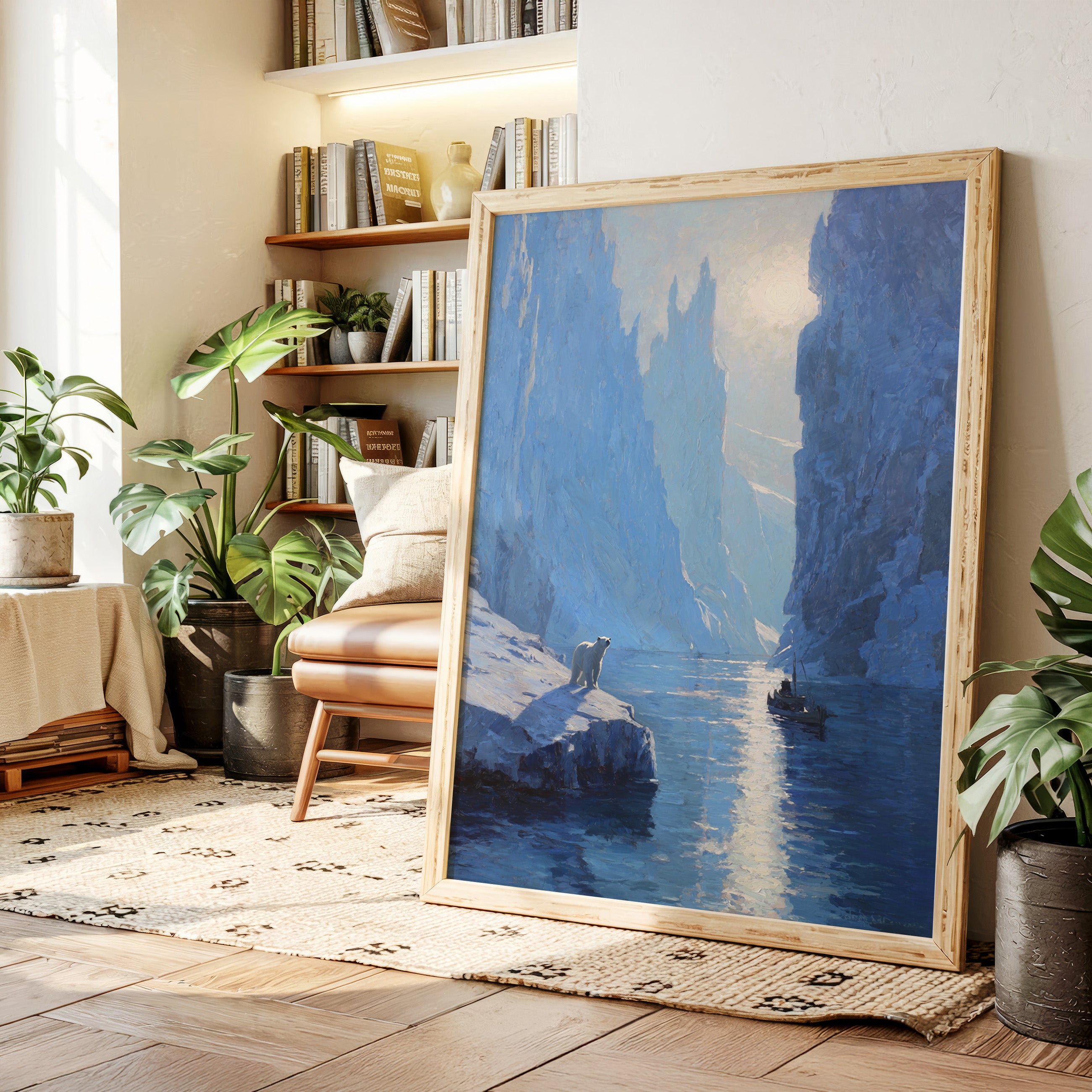 A solitary polar bear stands sentinel on a rocky outcrop, gazing into the vastness of an icy fjord, where crystalline cliffs rise majestically against a shimmering sky. This piece embodies the serene elegance of the Artisanal collection, inviting contemplation and wonder. As cool blues and whites dance across the canvas, the textures of the ice and water evoke a sense of peace, while the lone bear hints at the resilience of nature in a fragile world. Perfect for a tranquil living room or a serene study, this artwork brings the beauty of the Arctic indoors.