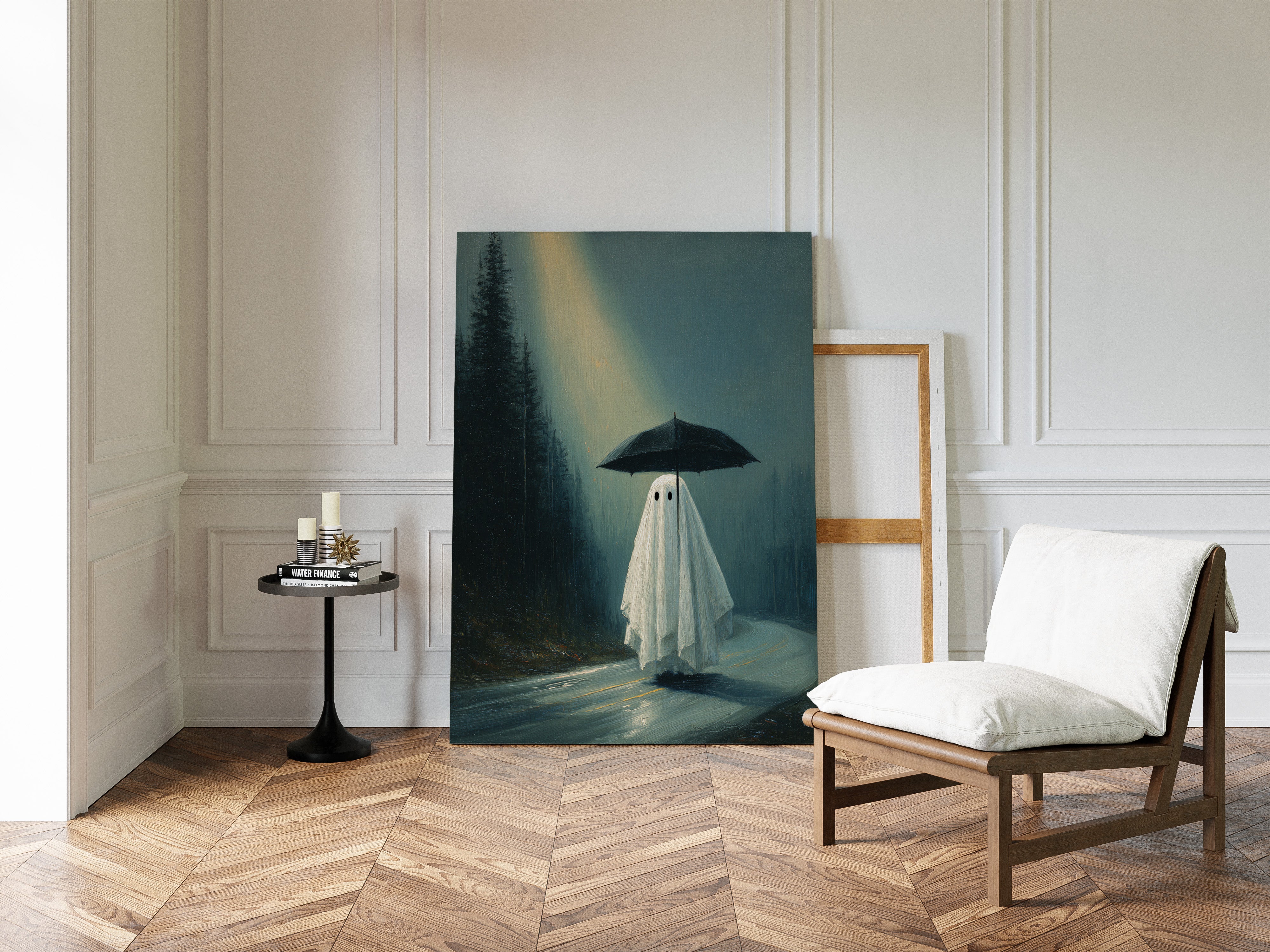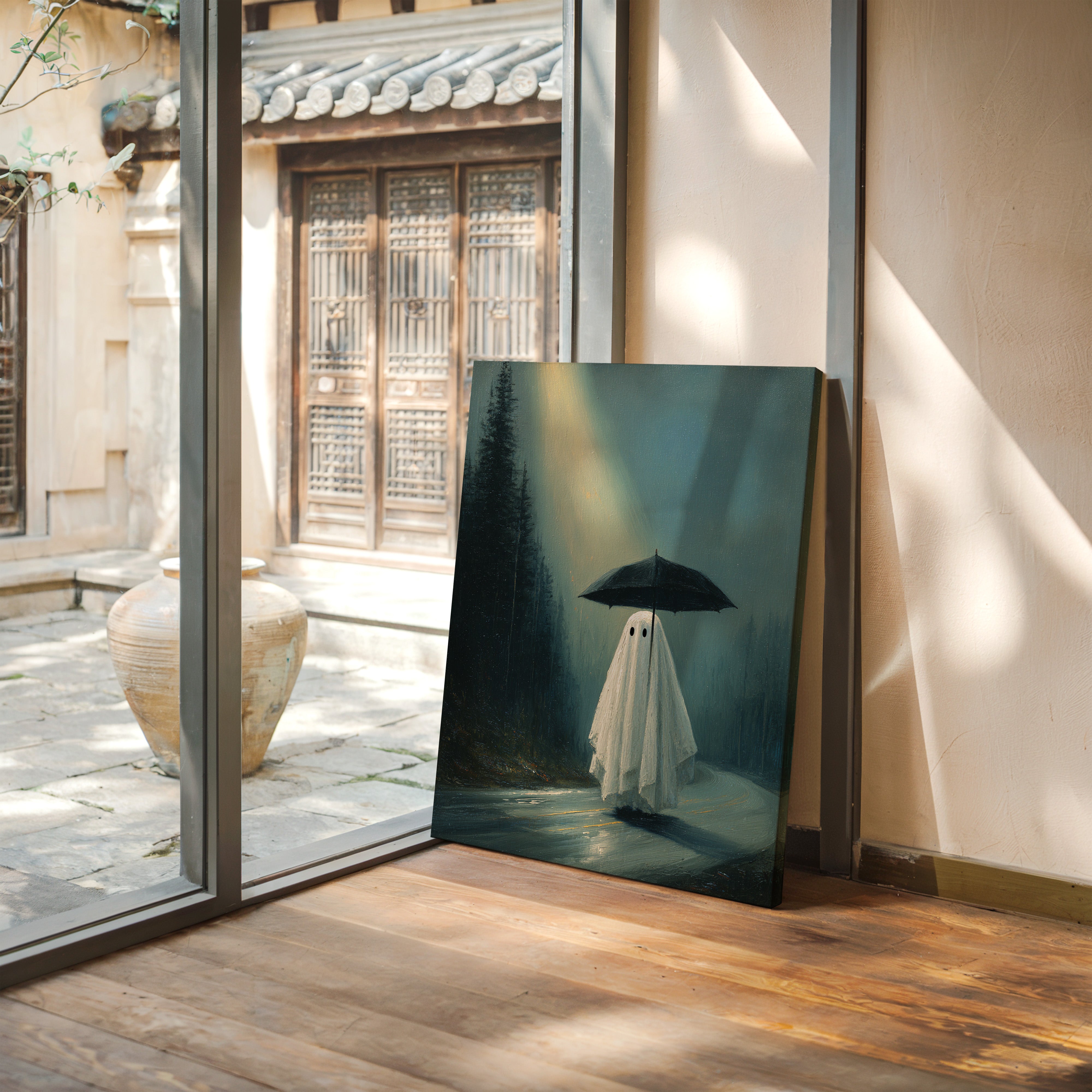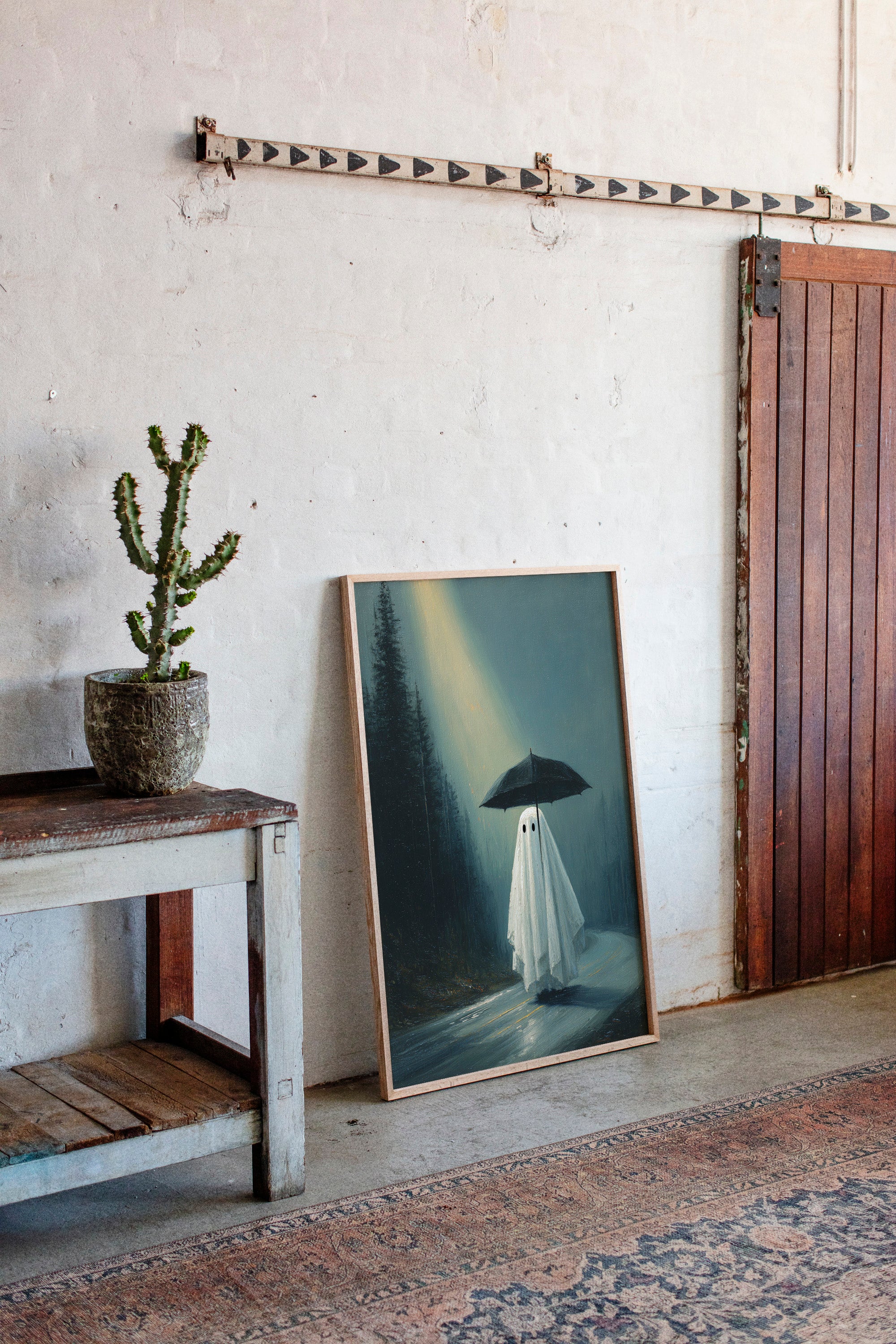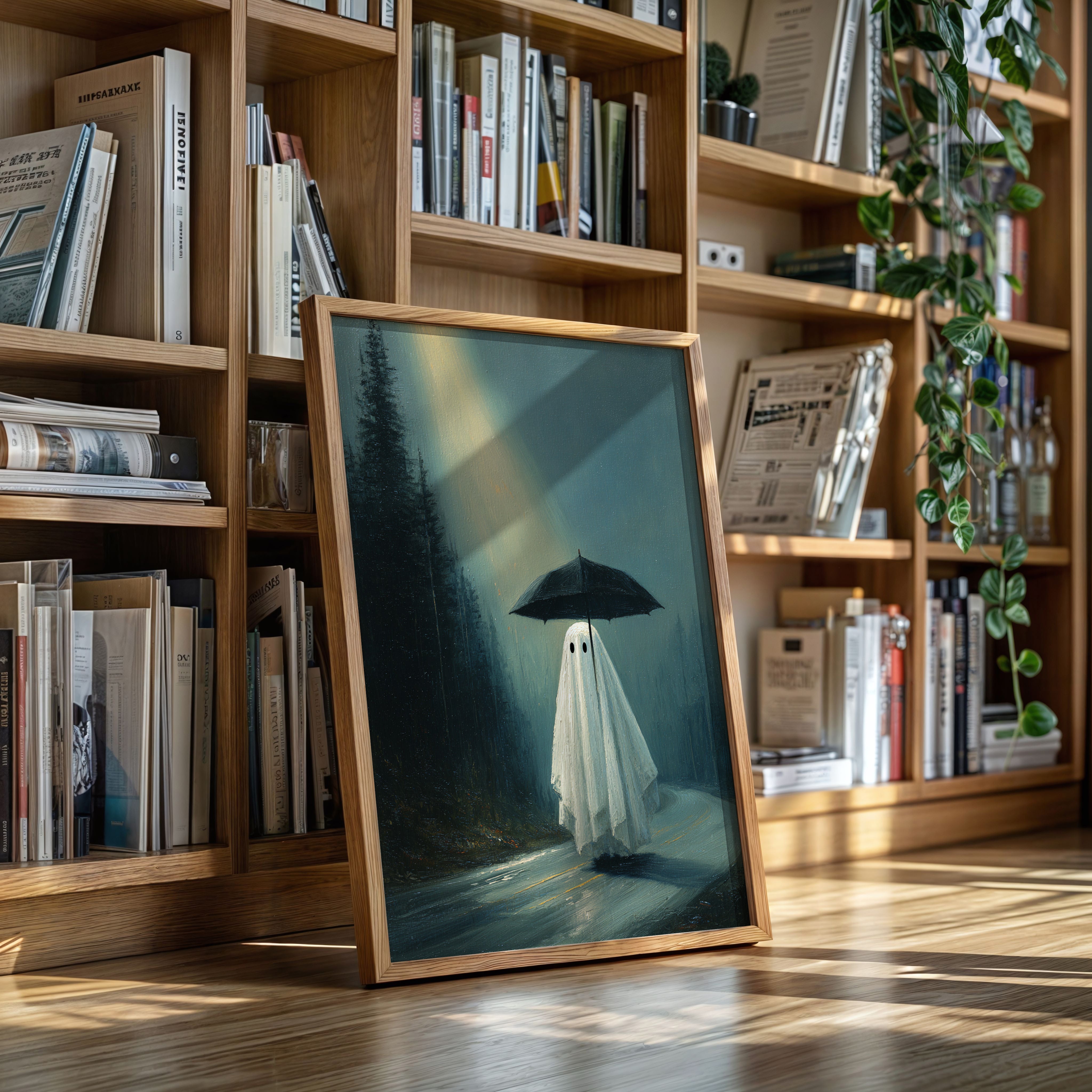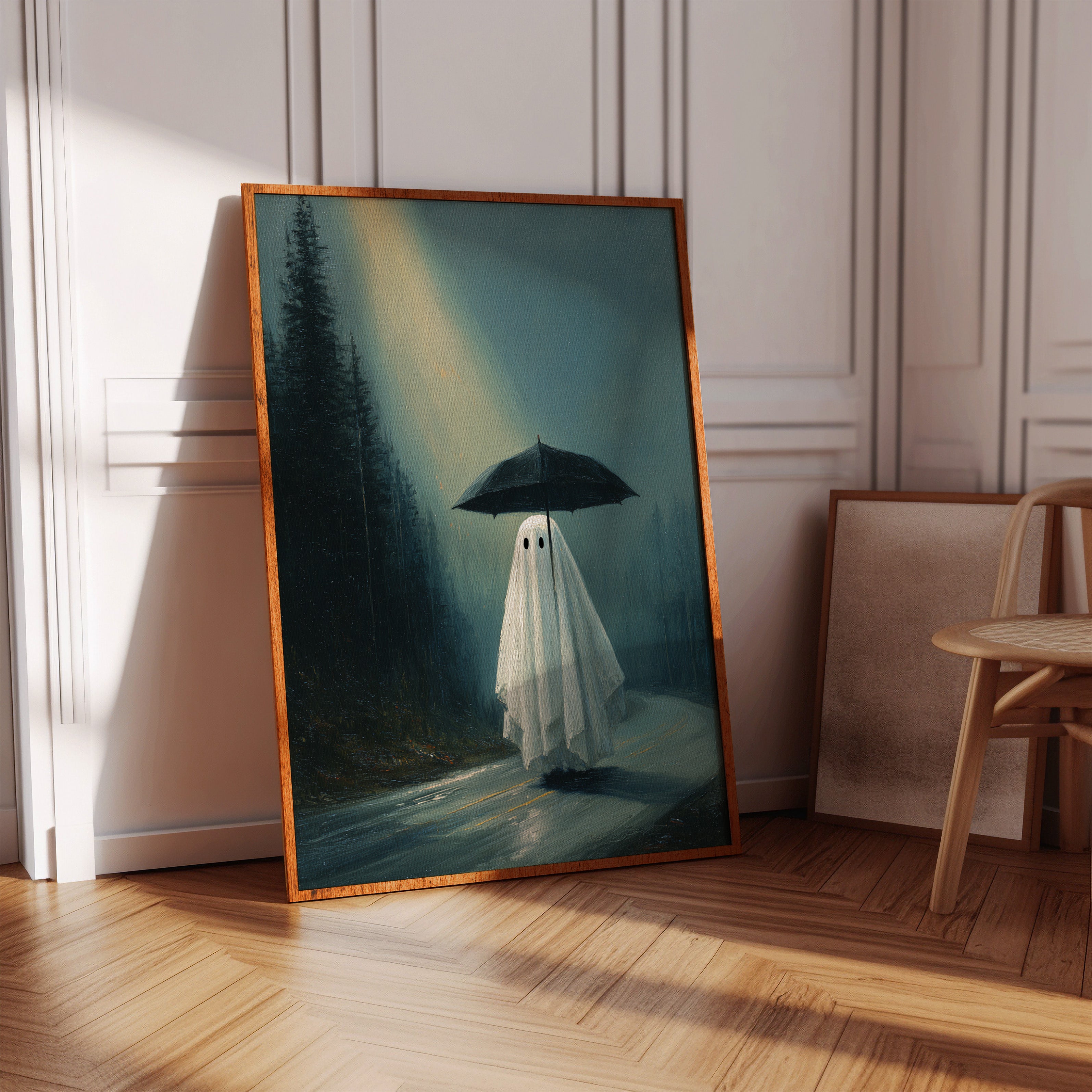 In the stillness of a misty evening, a solitary figure drifts along a winding road, cloaked in ethereal fabric. This piece captures the enchanting allure of the unseen, where the ordinary meets the extraordinary. Glimmers of light pierce through the dense fog, illuminating the playful contrast of the ghostly form against the deep greens and soft grays of the forest. Ideal for a cozy nook or an inviting hallway, it invites contemplation and curiosity.