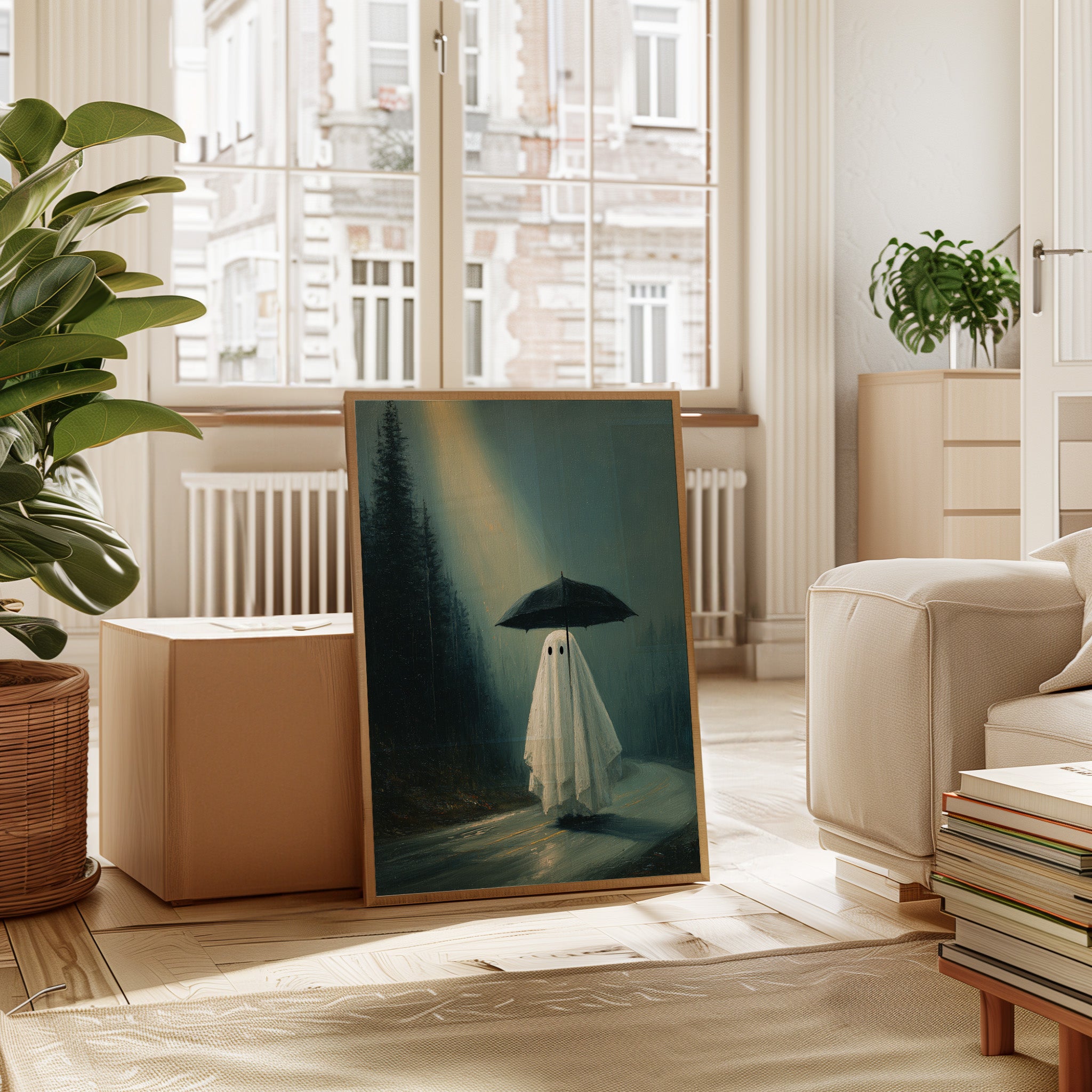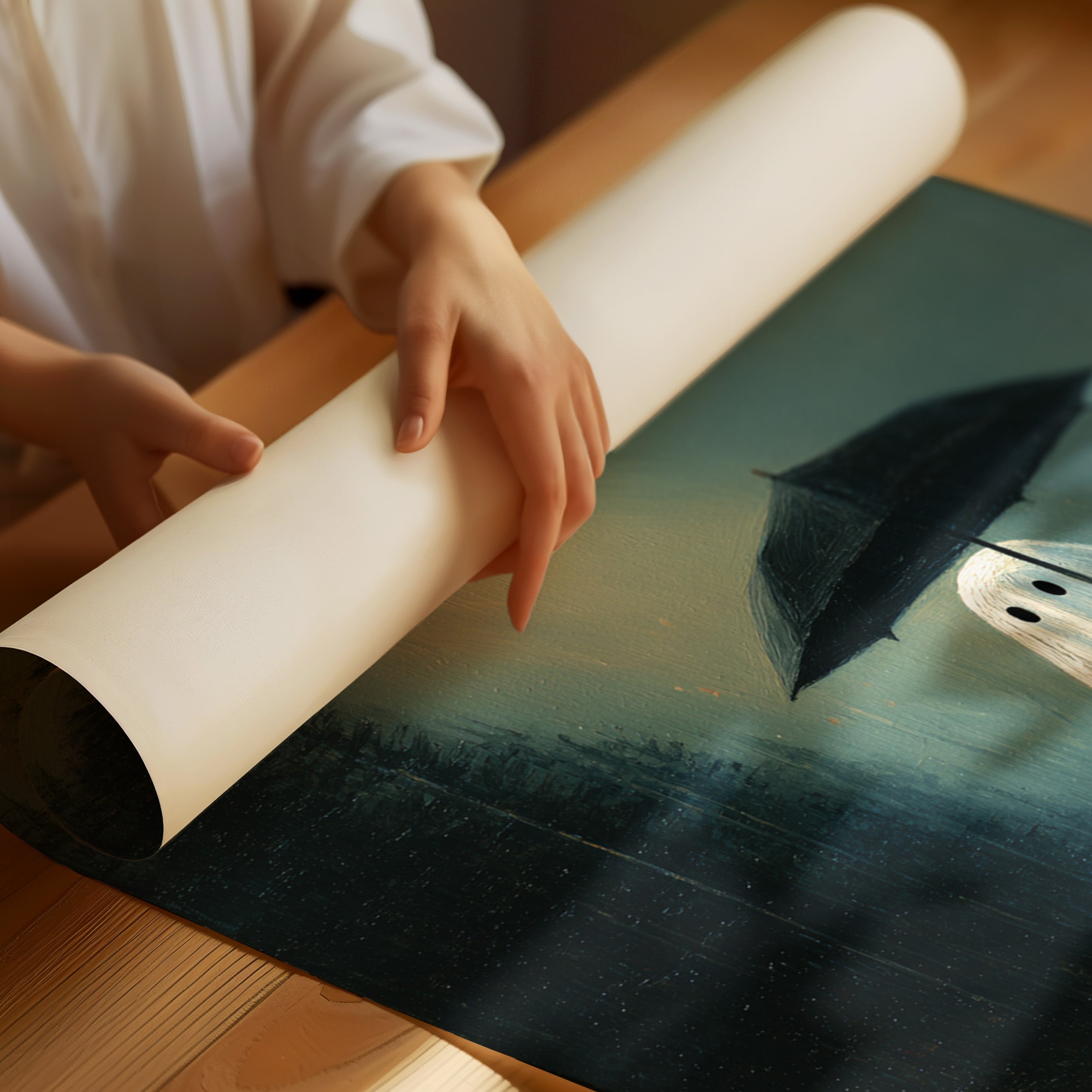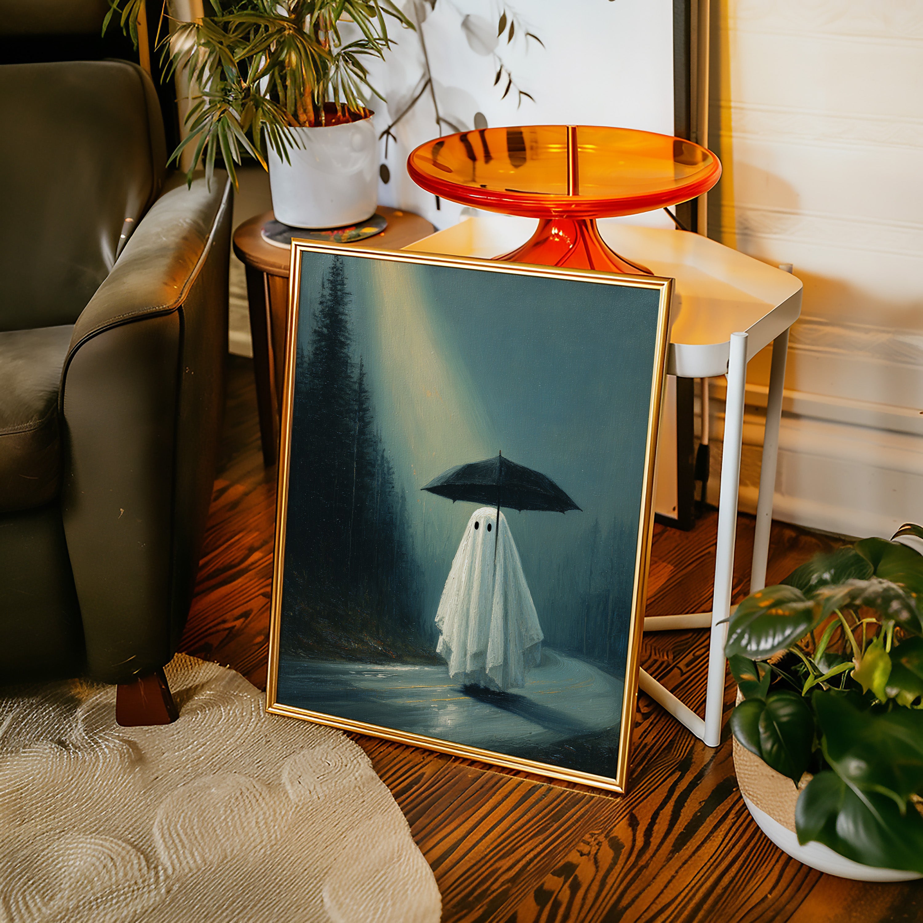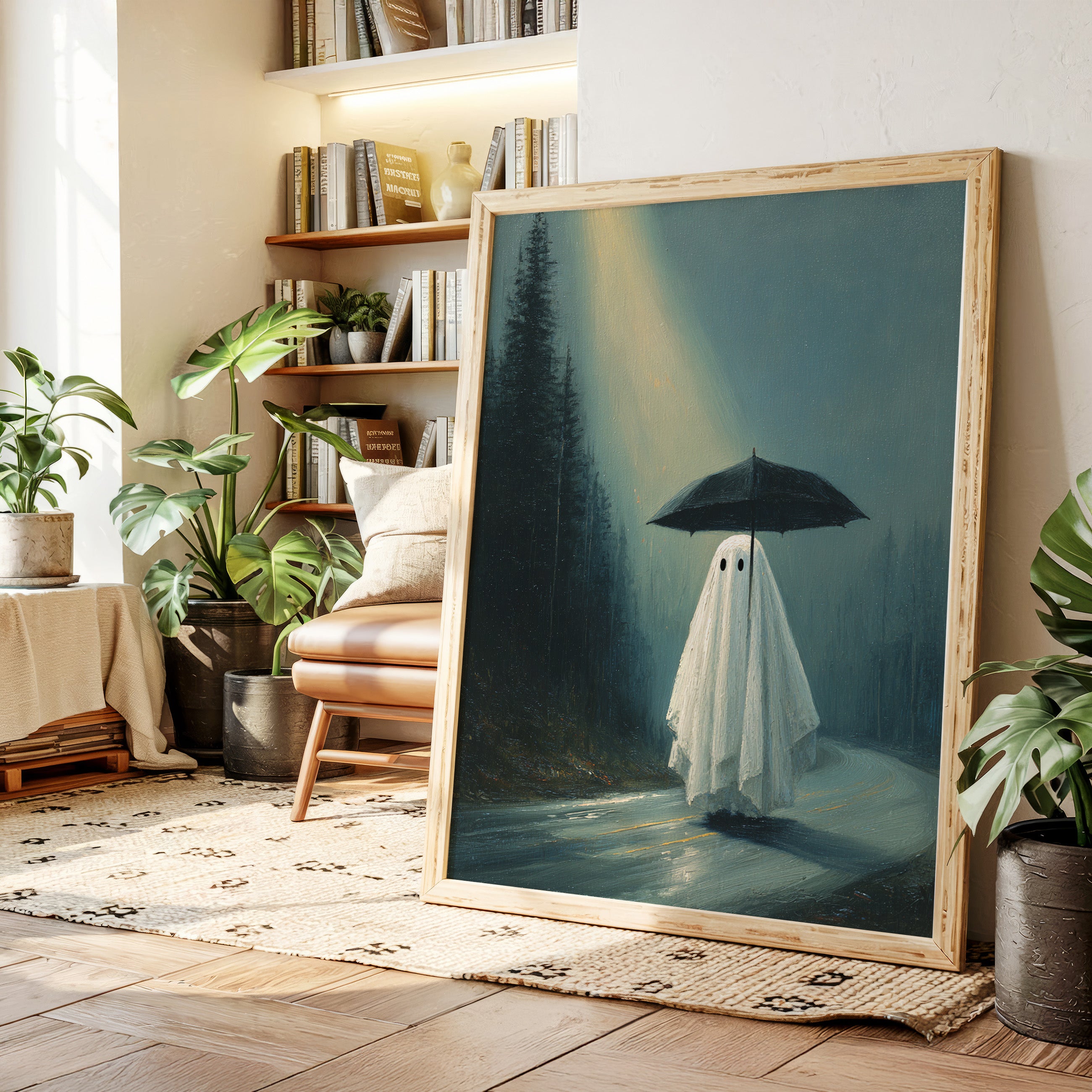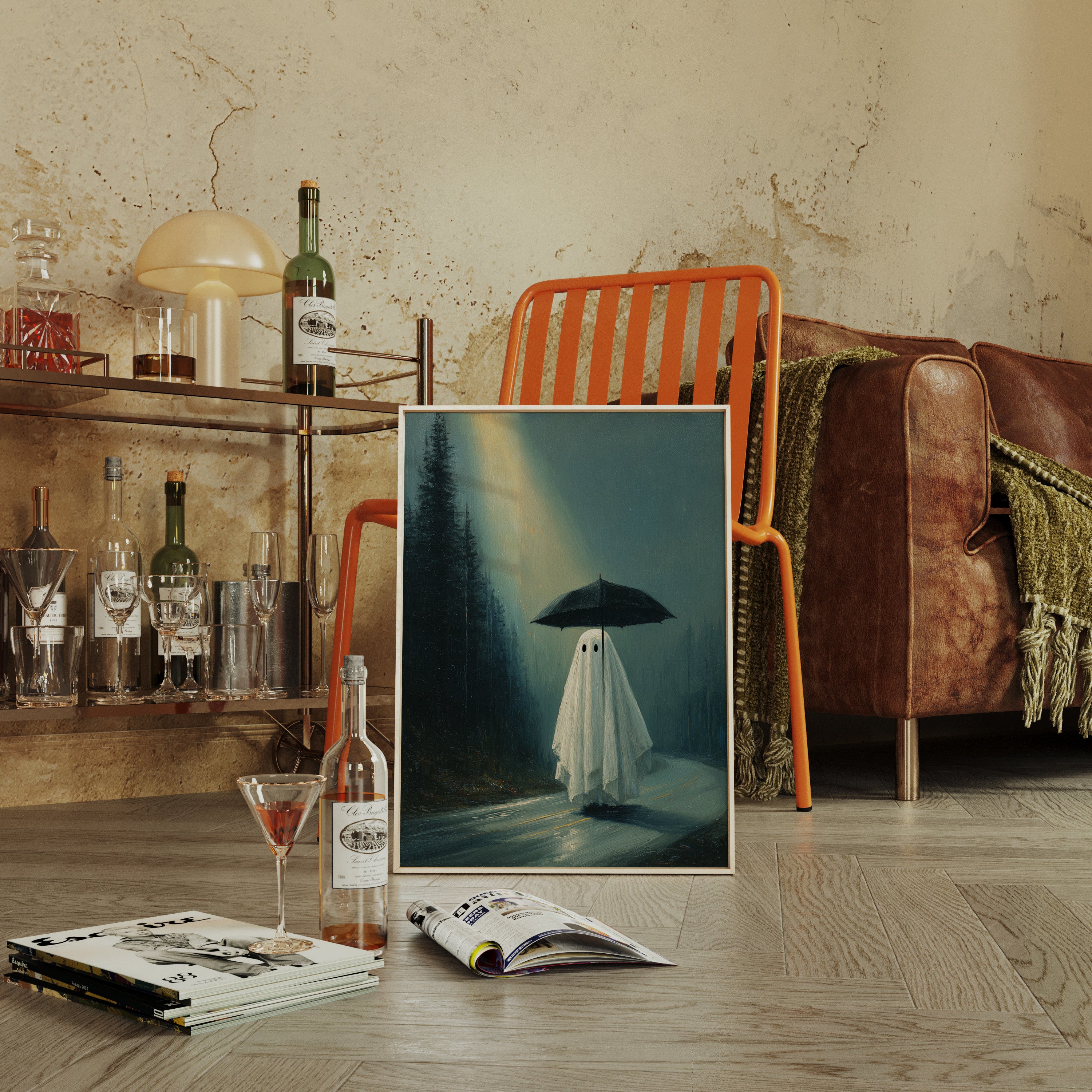 In the stillness of a misty evening, a solitary figure drifts along a winding road, cloaked in ethereal fabric. This piece captures the enchanting allure of the unseen, where the ordinary meets the extraordinary. Glimmers of light pierce through the dense fog, illuminating the playful contrast of the ghostly form against the deep greens and soft grays of the forest. Ideal for a cozy nook or an inviting hallway, it invites contemplation and curiosity.
