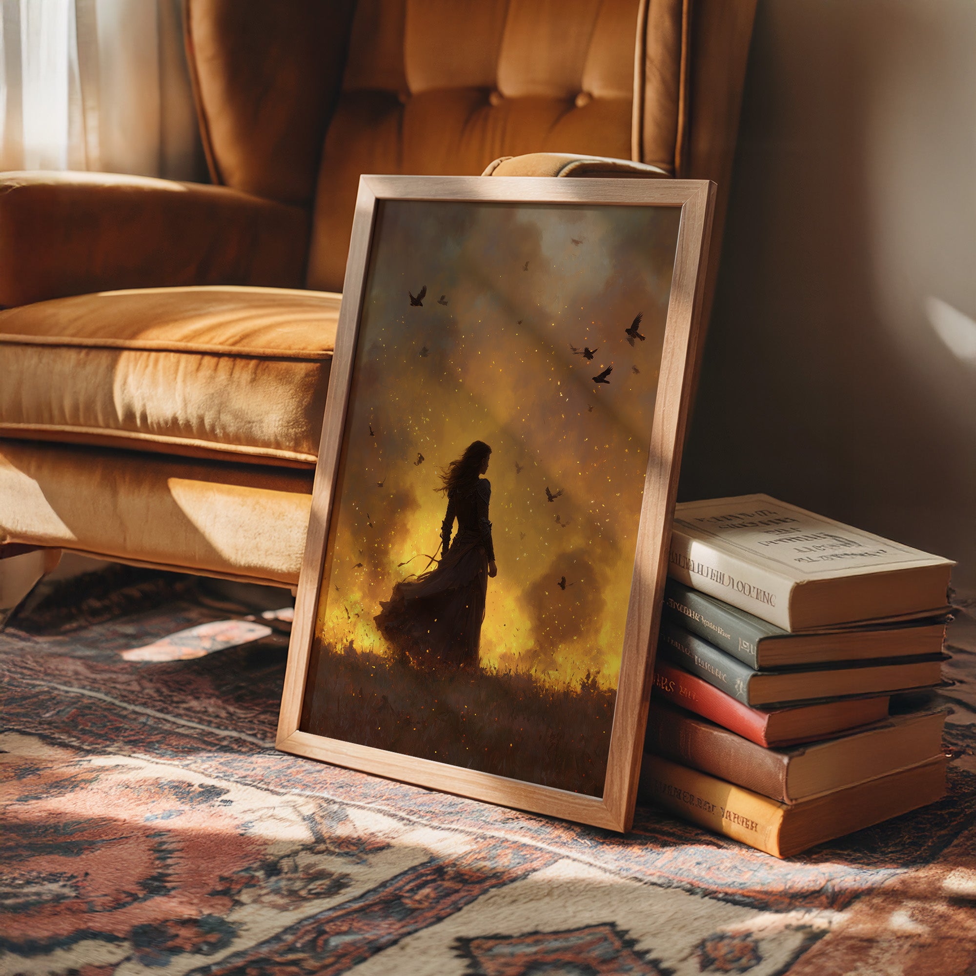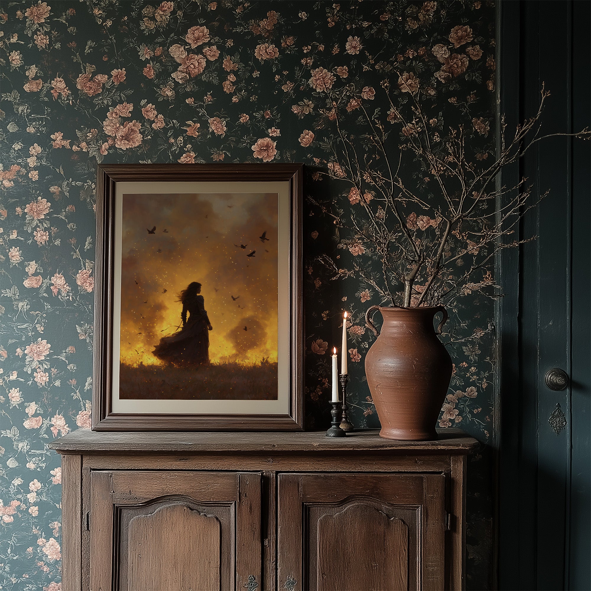 A solitary figure stands defiant against a burning horizon, her dress flowing like smoke in the wind. Golden sparks rise around her silhouette, mingling with birds taking flight through an amber sky that blazes with both destruction and possibility. This atmospheric piece captures that liminal moment when endings transform into beginnings, where loss and liberation dance together in the same breath.
