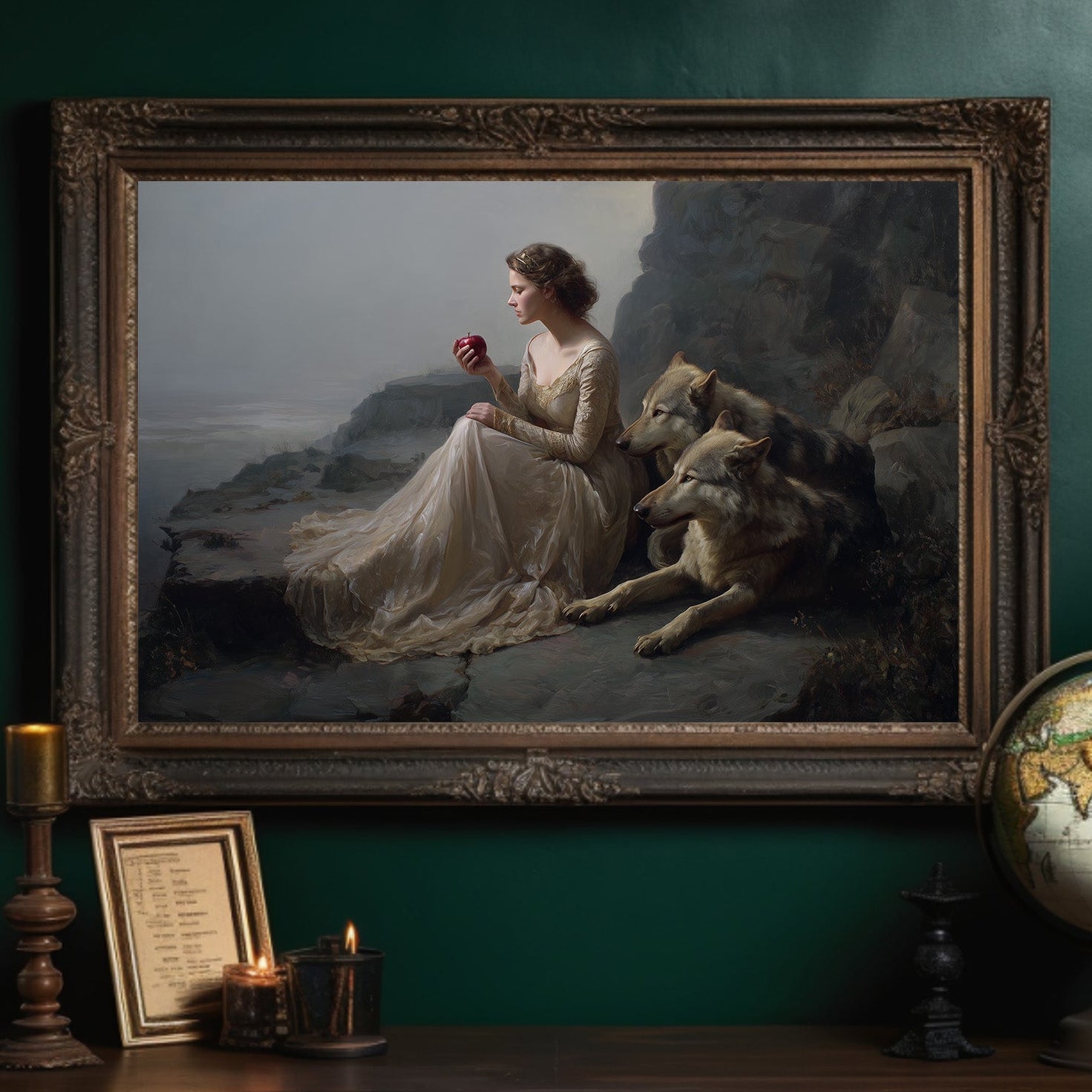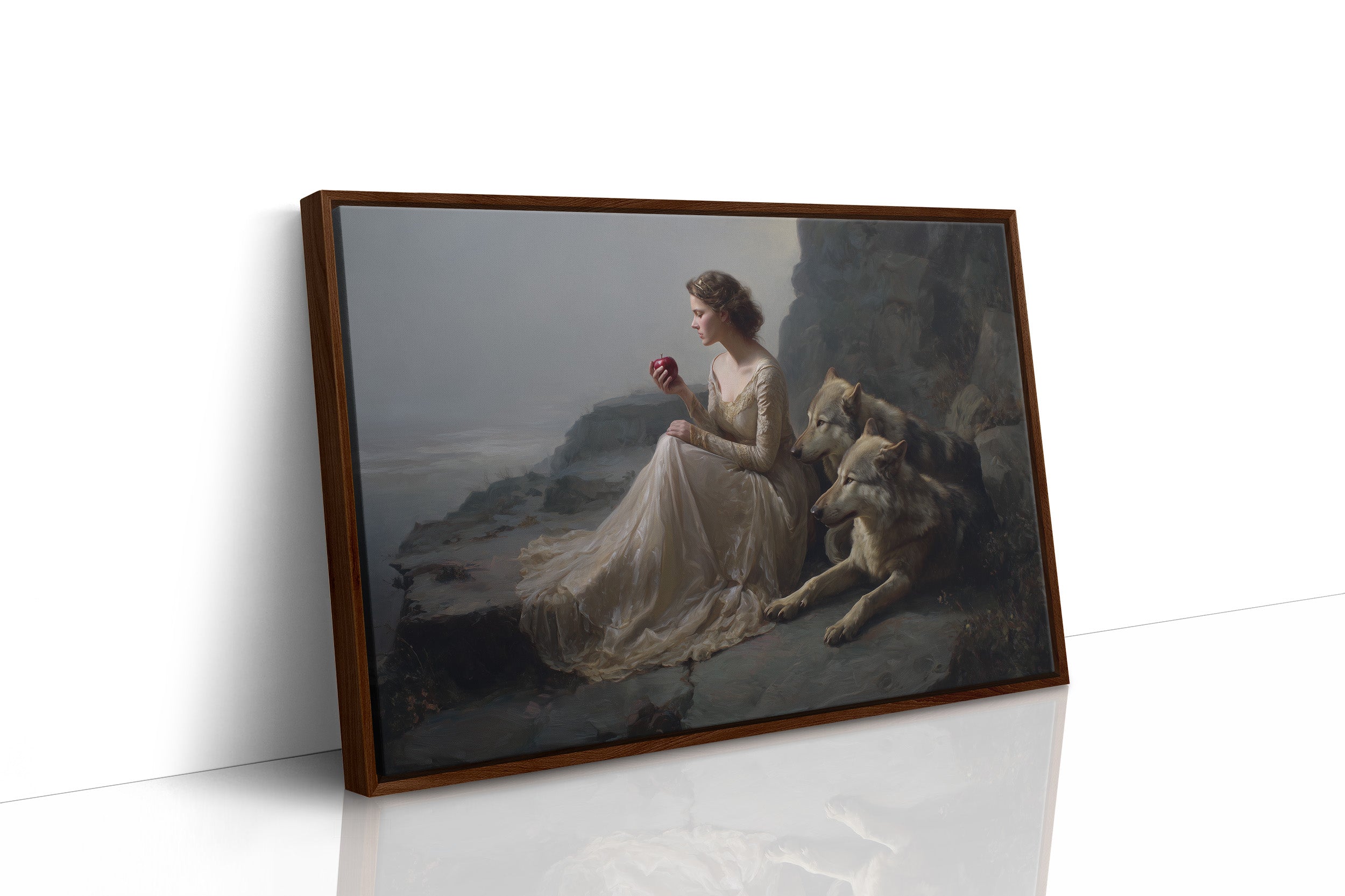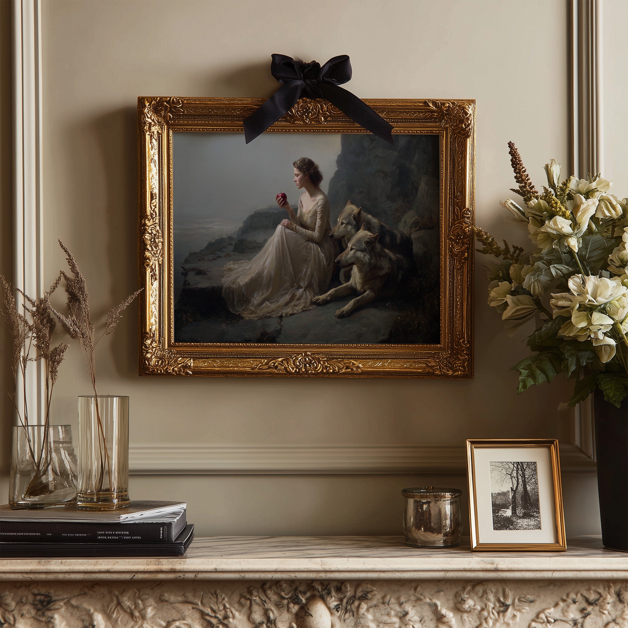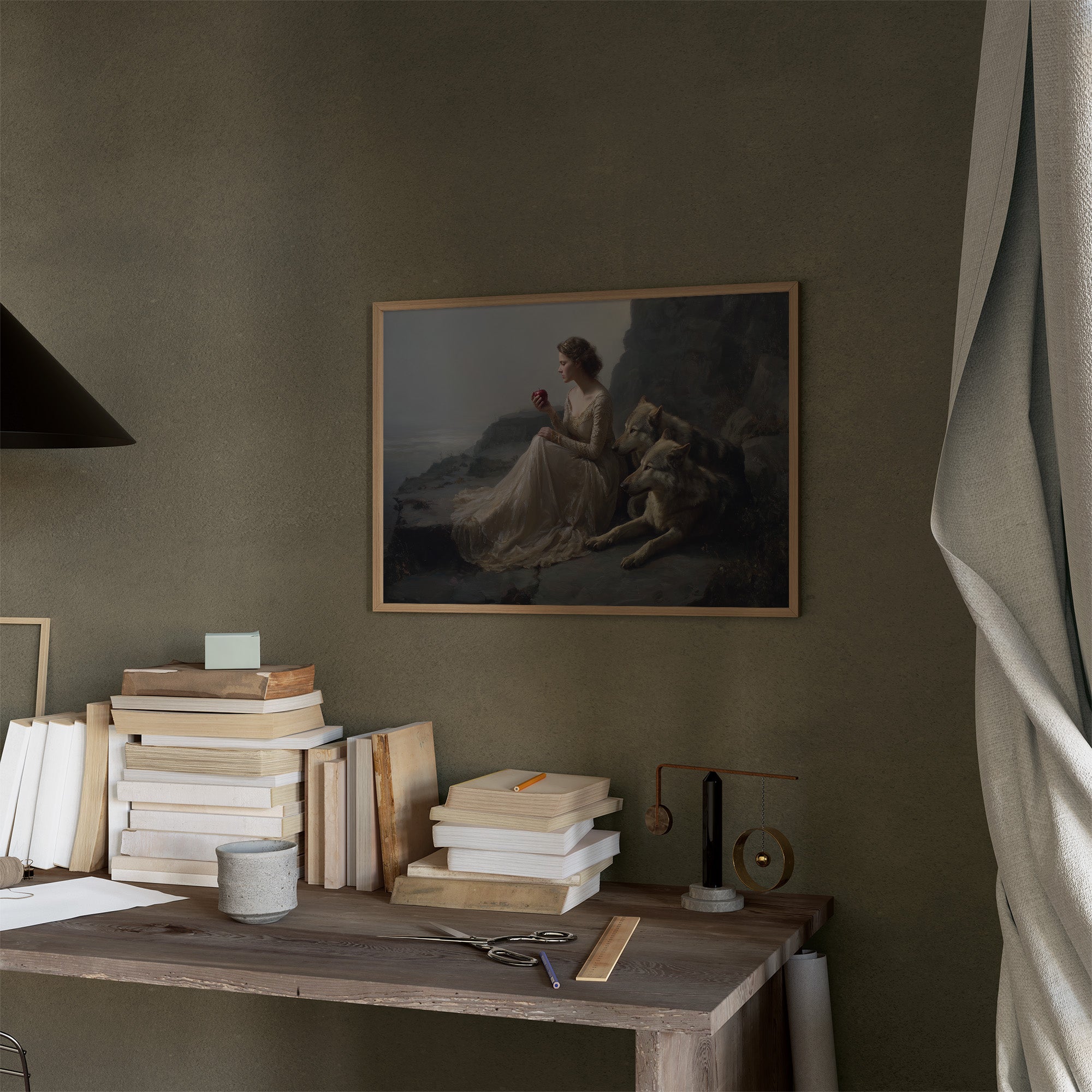 A classical painting rests against wooden shelves laden with stories yet to be discovered. The gilded frame captures a timeless scenea figure in flowing white beside loyal wolves against a misty coastal backdrop. Rich wood tones of the bookcase create a perfect sanctuary for this artistic treasure, while gentle greenery adds life to this literary corner. Perfect for a sophisticated study, reading nook, or any space where art and literature intertwine to create intellectual warmth.