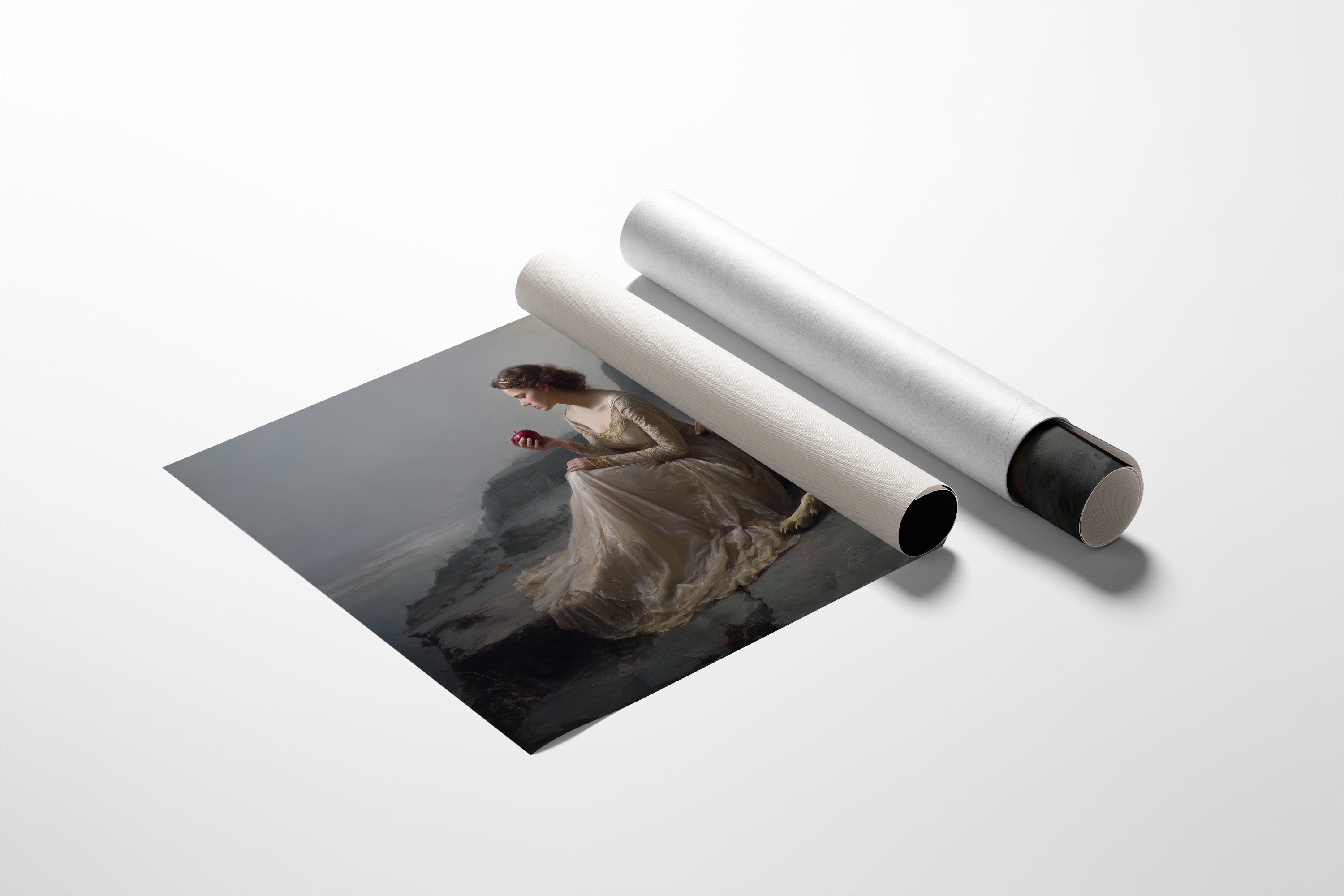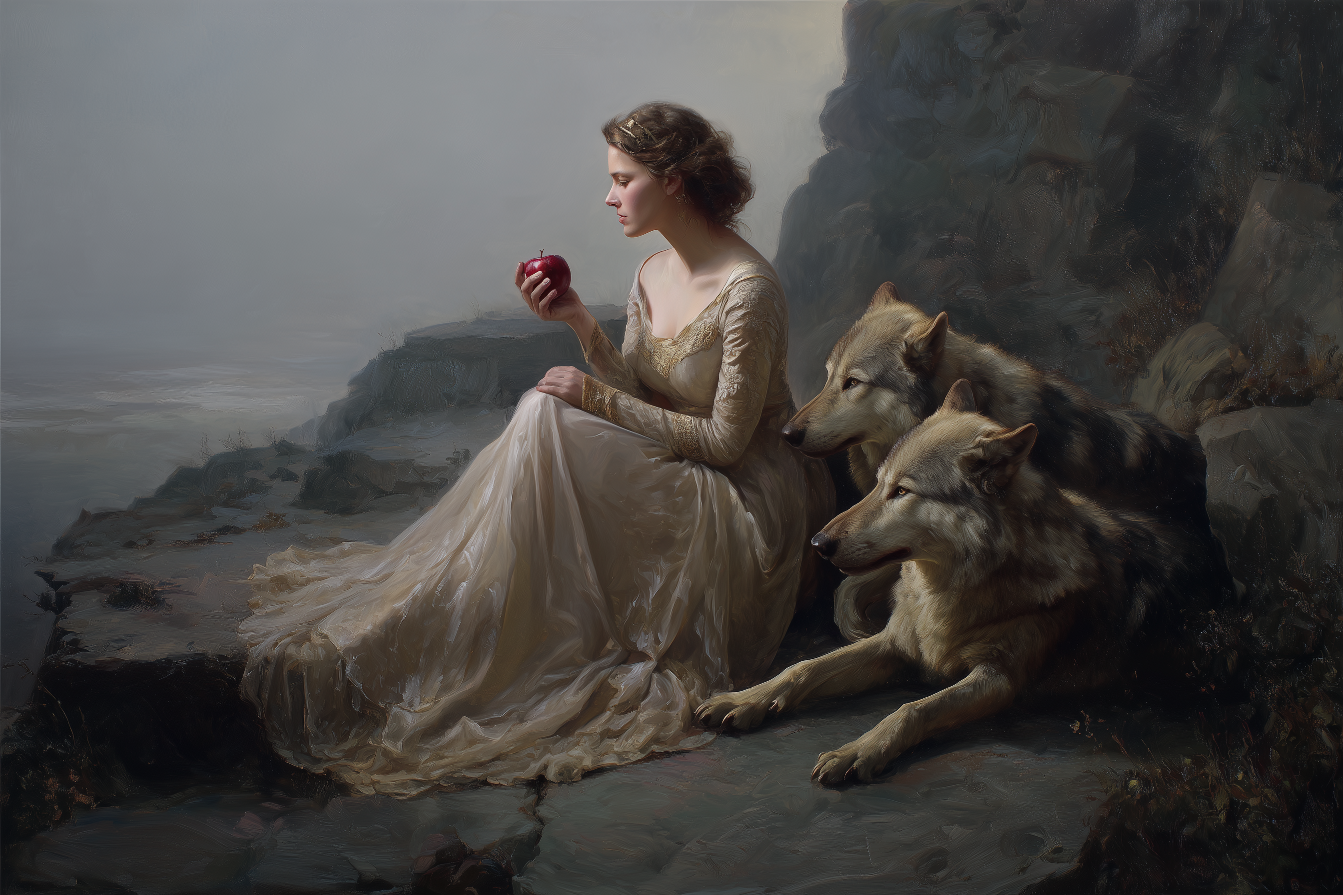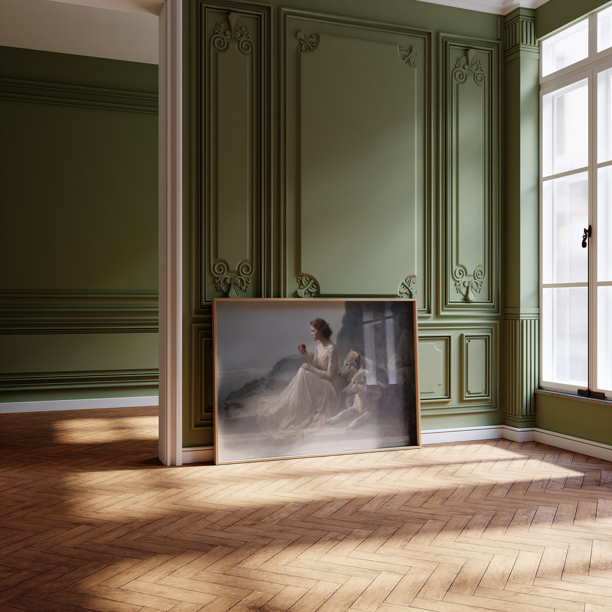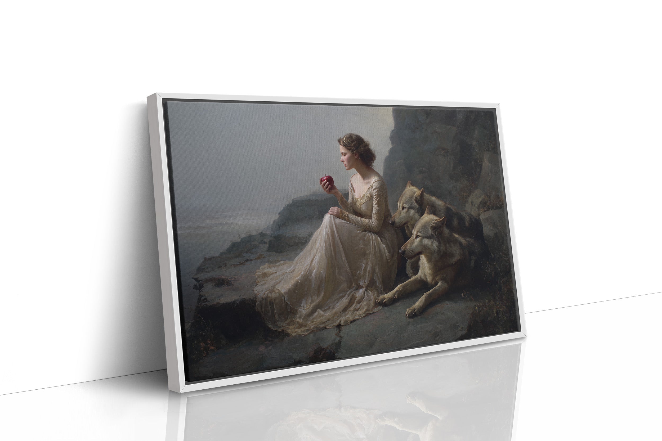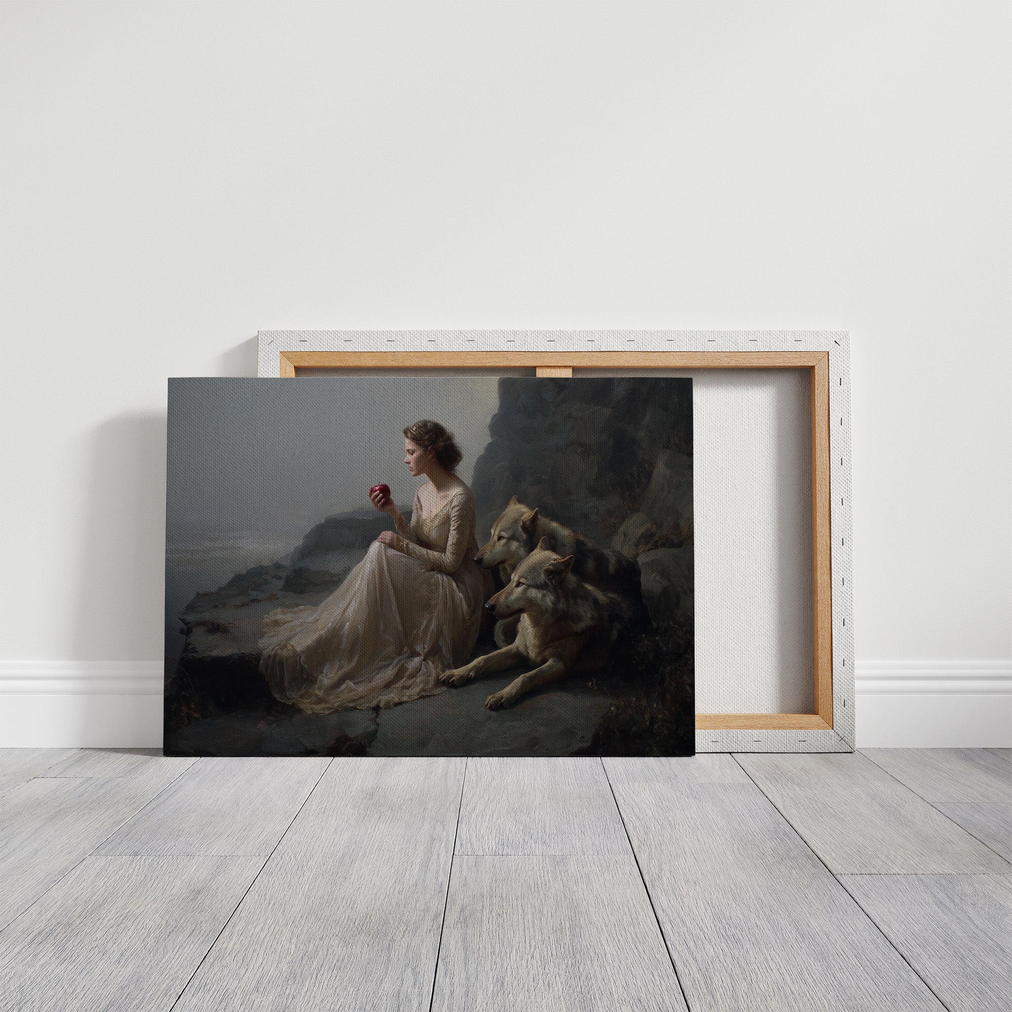 A classical painting rests against wooden shelves laden with stories yet to be discovered. The gilded frame captures a timeless scenea figure in flowing white beside loyal wolves against a misty coastal backdrop. Rich wood tones of the bookcase create a perfect sanctuary for this artistic treasure, while gentle greenery adds life to this literary corner. Perfect for a sophisticated study, reading nook, or any space where art and literature intertwine to create intellectual warmth.