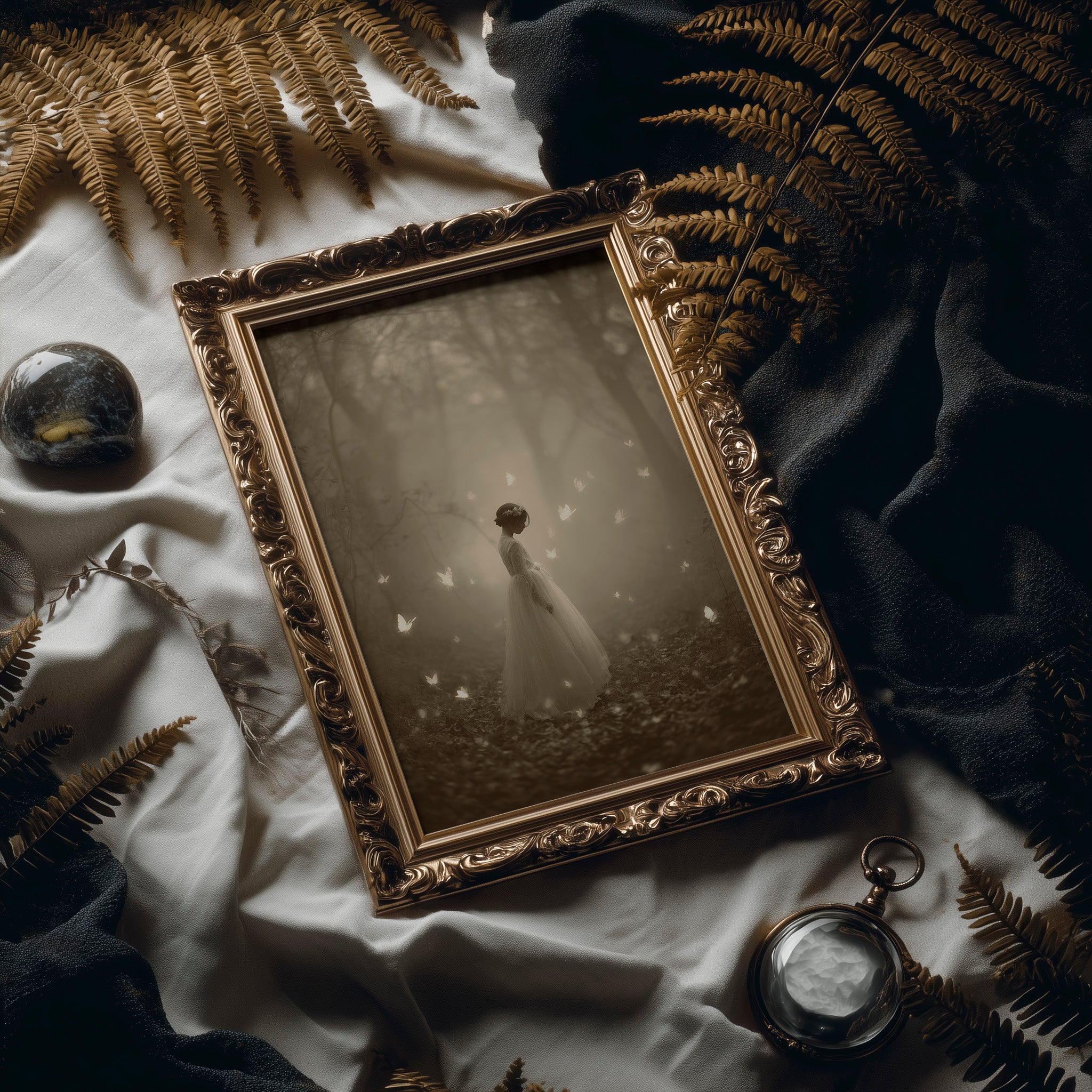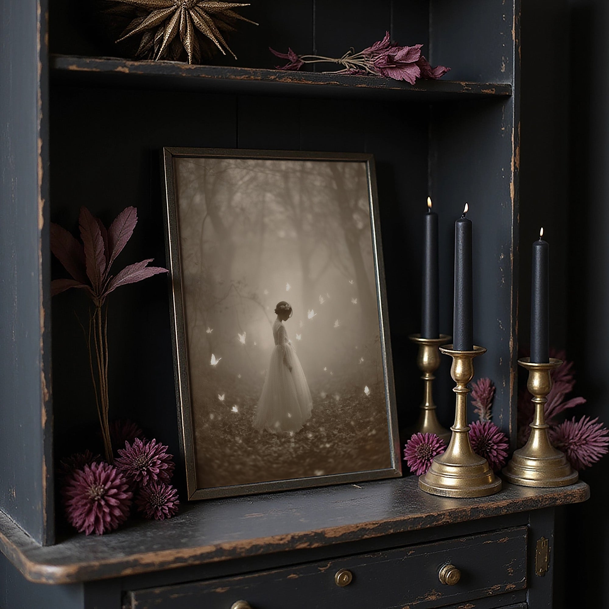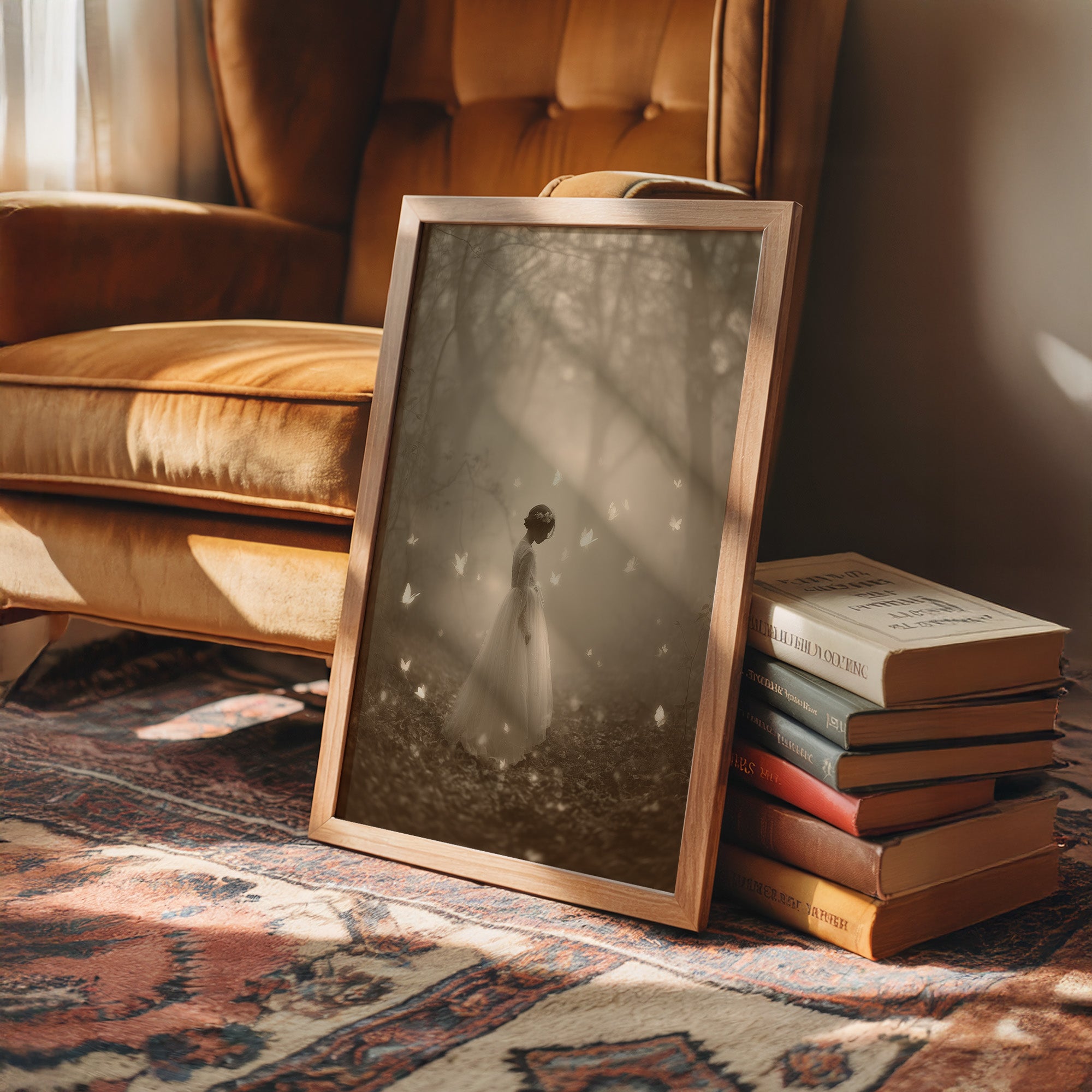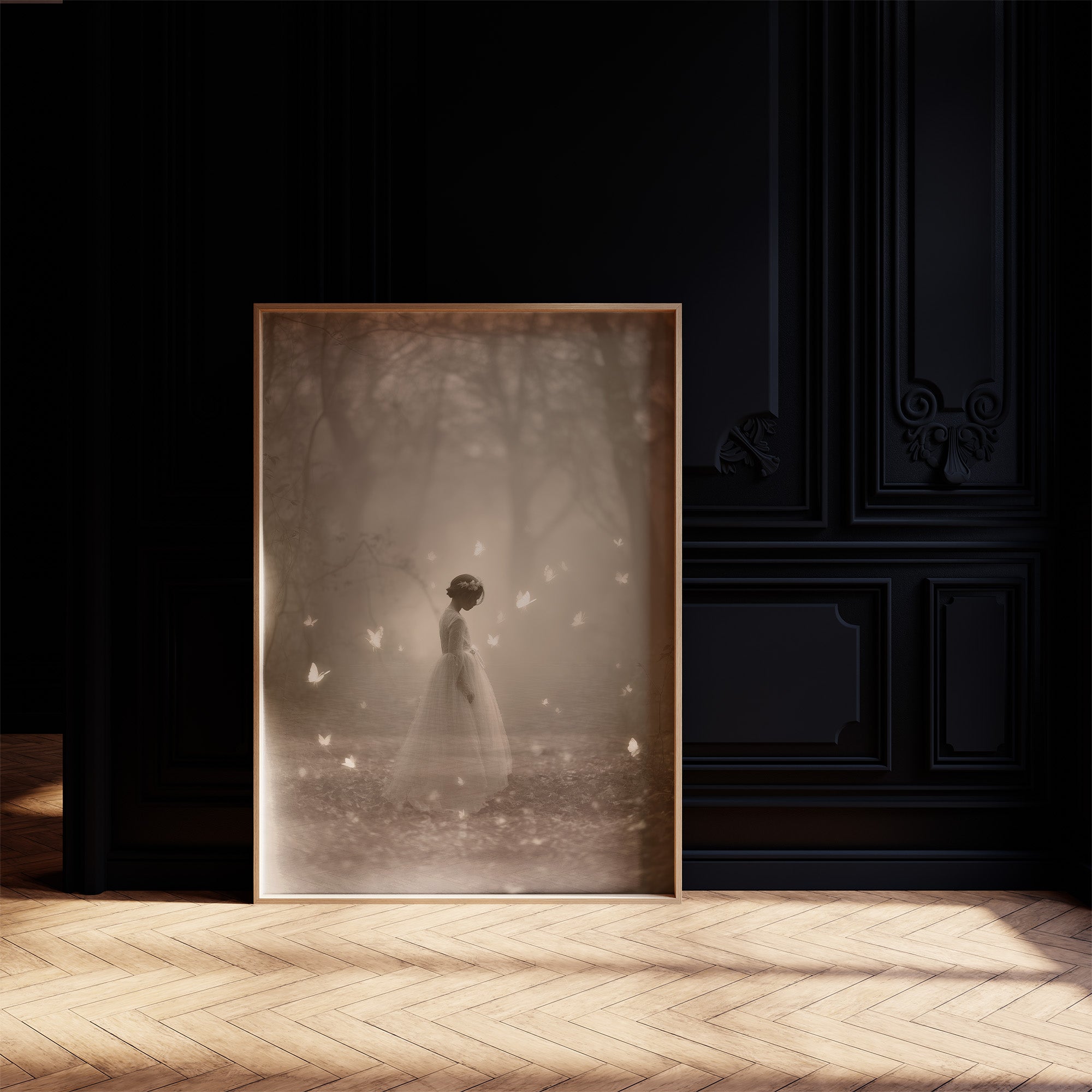 A figure stands suspended in time, bathed in ethereal fog while luminous butterflies dance around her white dress. The sepia-toned photograph captures that liminal space between reality and dreams, where the forest blurs into soft obscurity and light seems to emanate from within the scene itself. The delicate silhouettes of fluttering wings create a constellation of light against the muted background, suggesting a moment of transformation or transcendence. This haunting image would bring an air of mystery and contemplative beauty to a modern bedroom or sophisticated living space with dark walls.