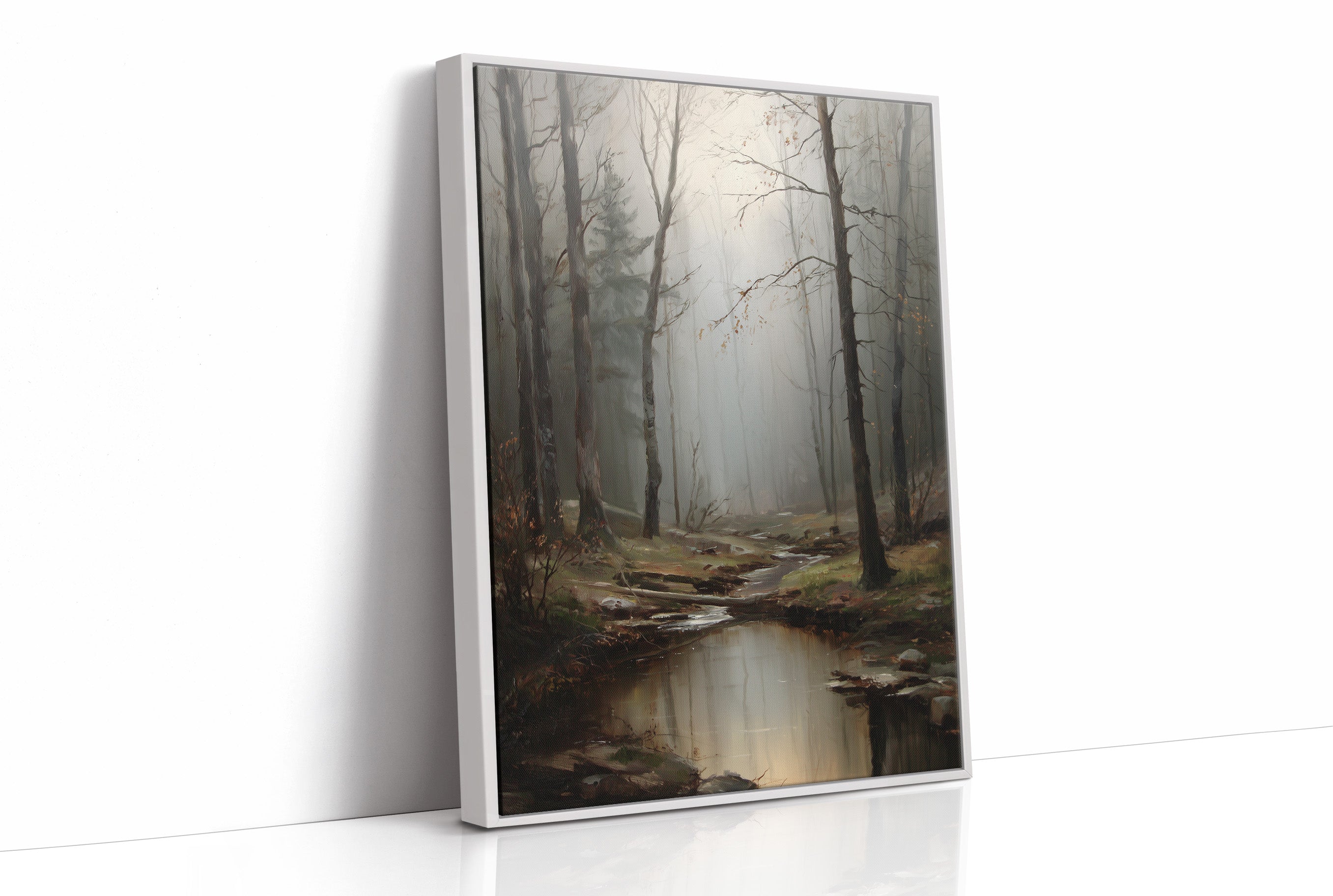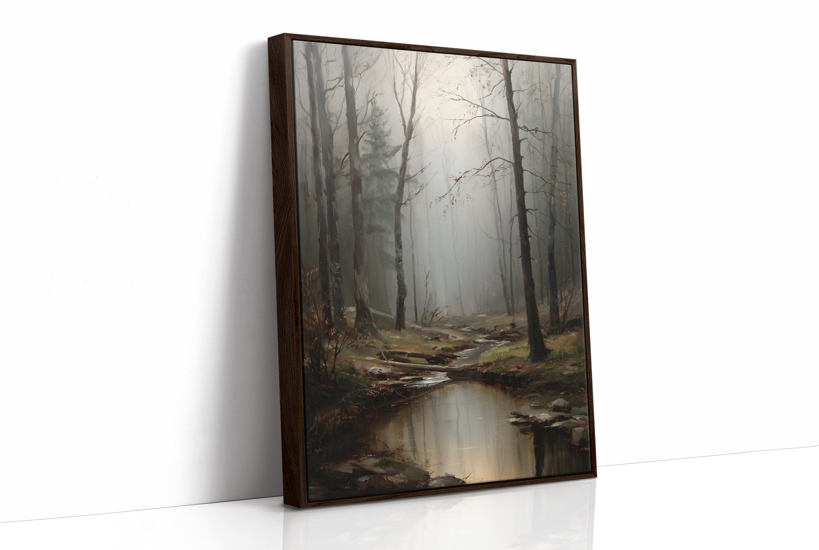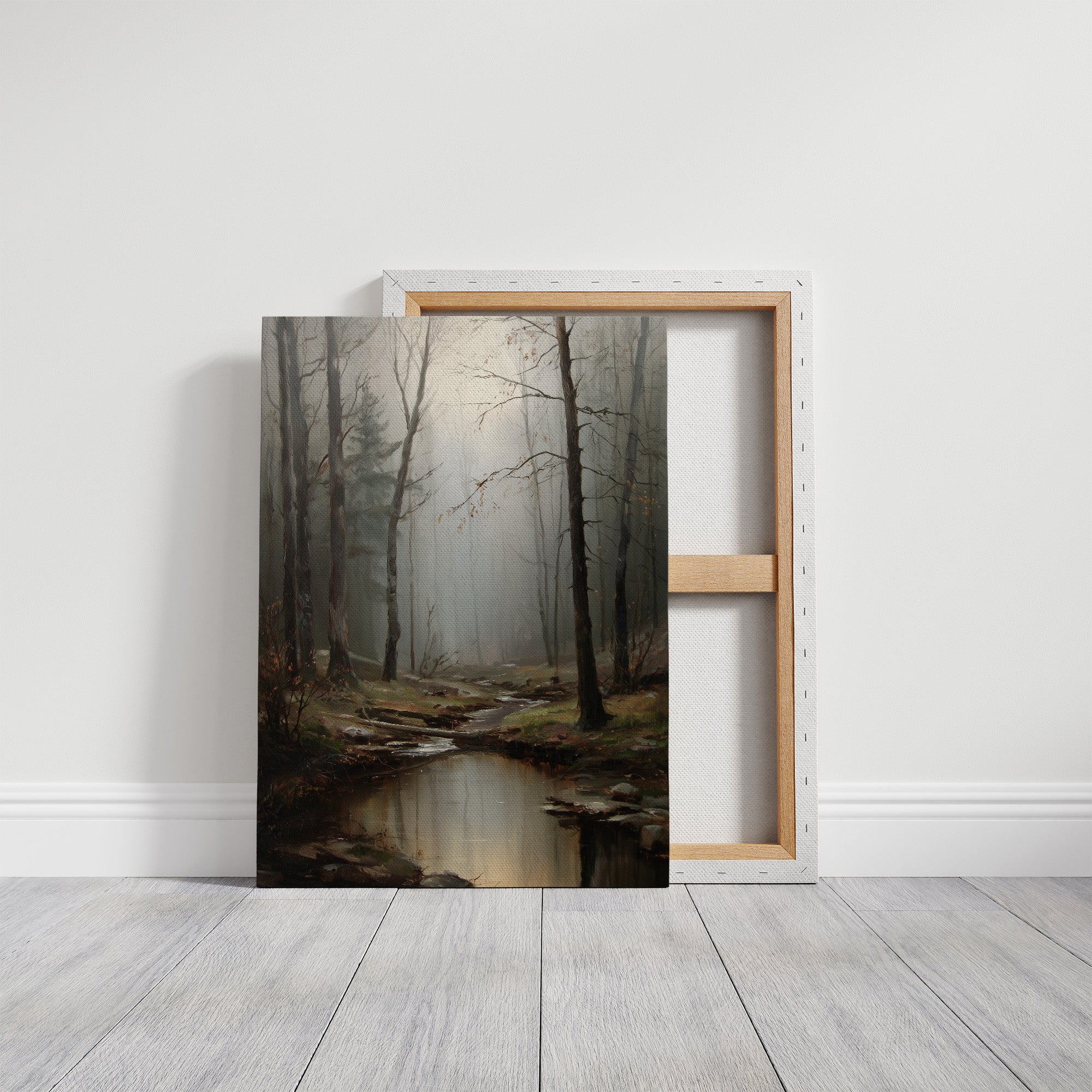 Stillness hangs like a soft veil over the forest path, where morning light struggles through a dense fog. Bare trees stand sentinel along a quiet stream, their skeletal forms creating a delicate architecture against the misty backdrop. Subtle earth tones blend with muted grays, creating a contemplative scene where water mirrors the quiet solitude of winter's approach. This atmospheric piece brings serene woodland energy to minimalist spaces.