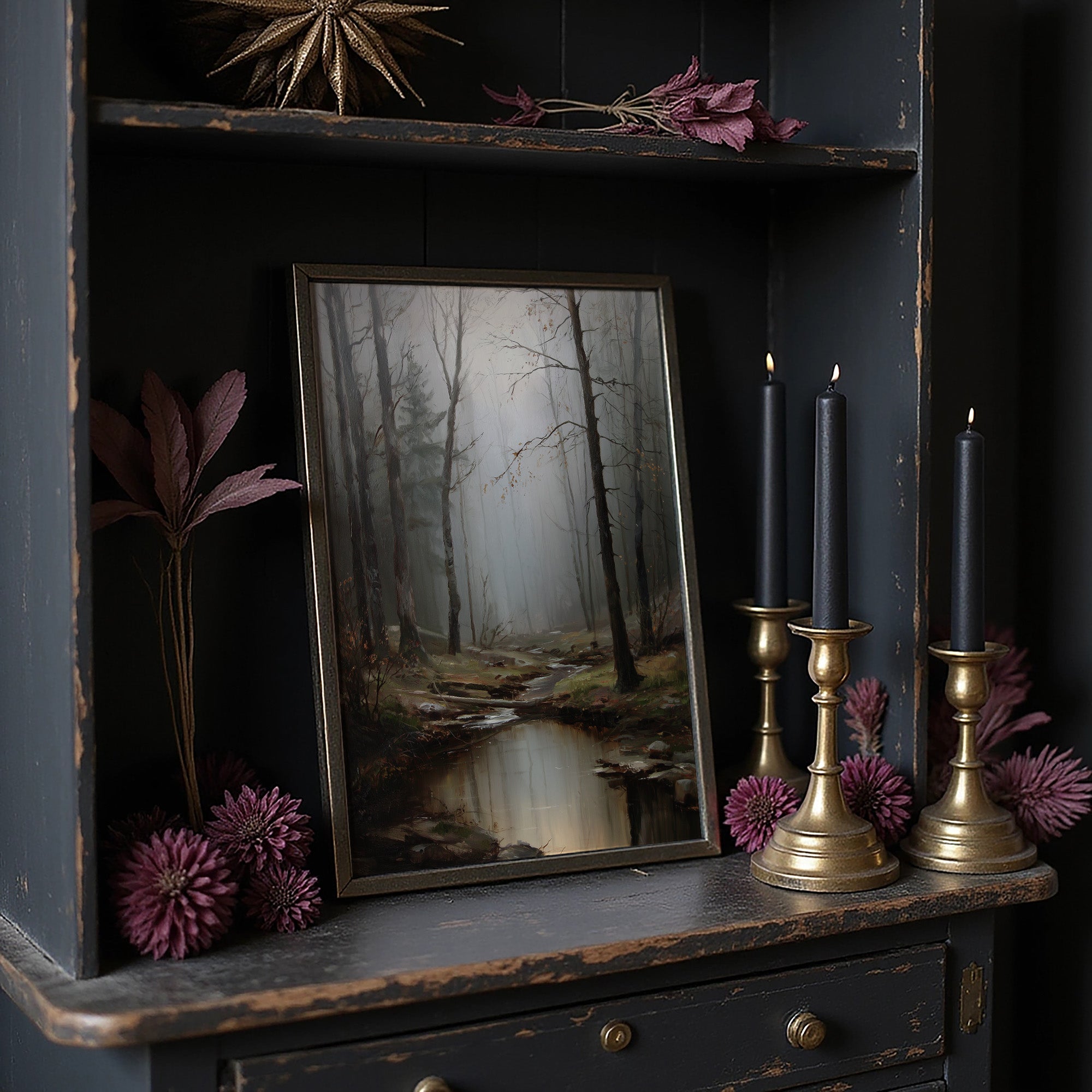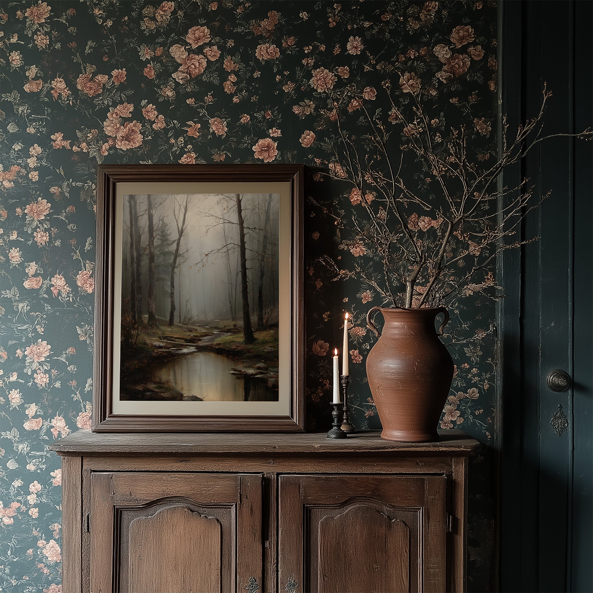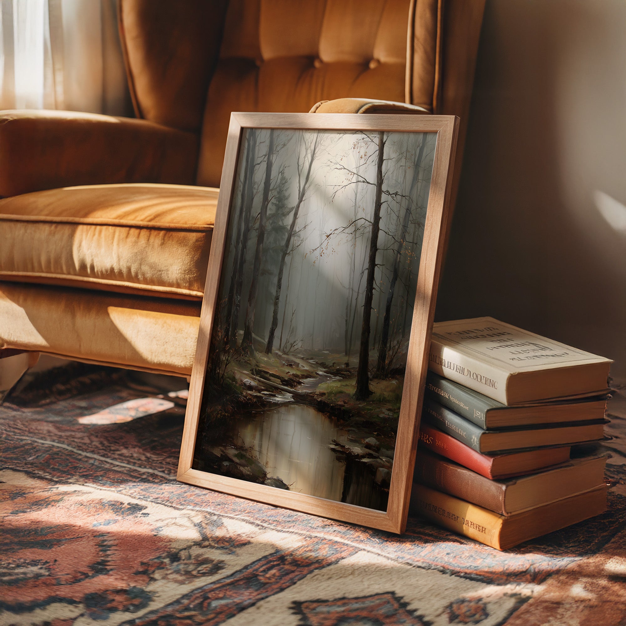 Stillness hangs like a soft veil over the forest path, where morning light struggles through a dense fog. Bare trees stand sentinel along a quiet stream, their skeletal forms creating a delicate architecture against the misty backdrop. Subtle earth tones blend with muted grays, creating a contemplative scene where water mirrors the quiet solitude of winter's approach. This atmospheric piece brings serene woodland energy to minimalist spaces.