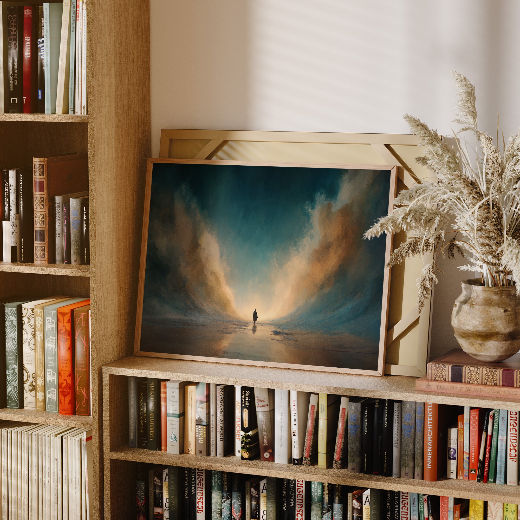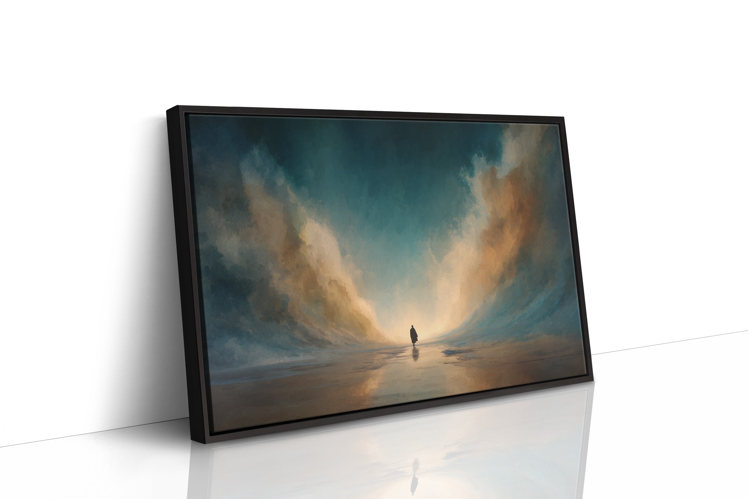 A solitary figure stands at the threshold of impossibility, where towering clouds create a path through teal waters. The painting captures that breathless moment of decision, when the universe seems to bend around a single soul. Warm golden light filters through the atmospheric billows, creating a dramatic contrast against the deep turquoise sky that feels both threatening and inviting. This contemplative piece brings depth and narrative to a reading nook or study, inviting viewers to pause and consider their own journeys.