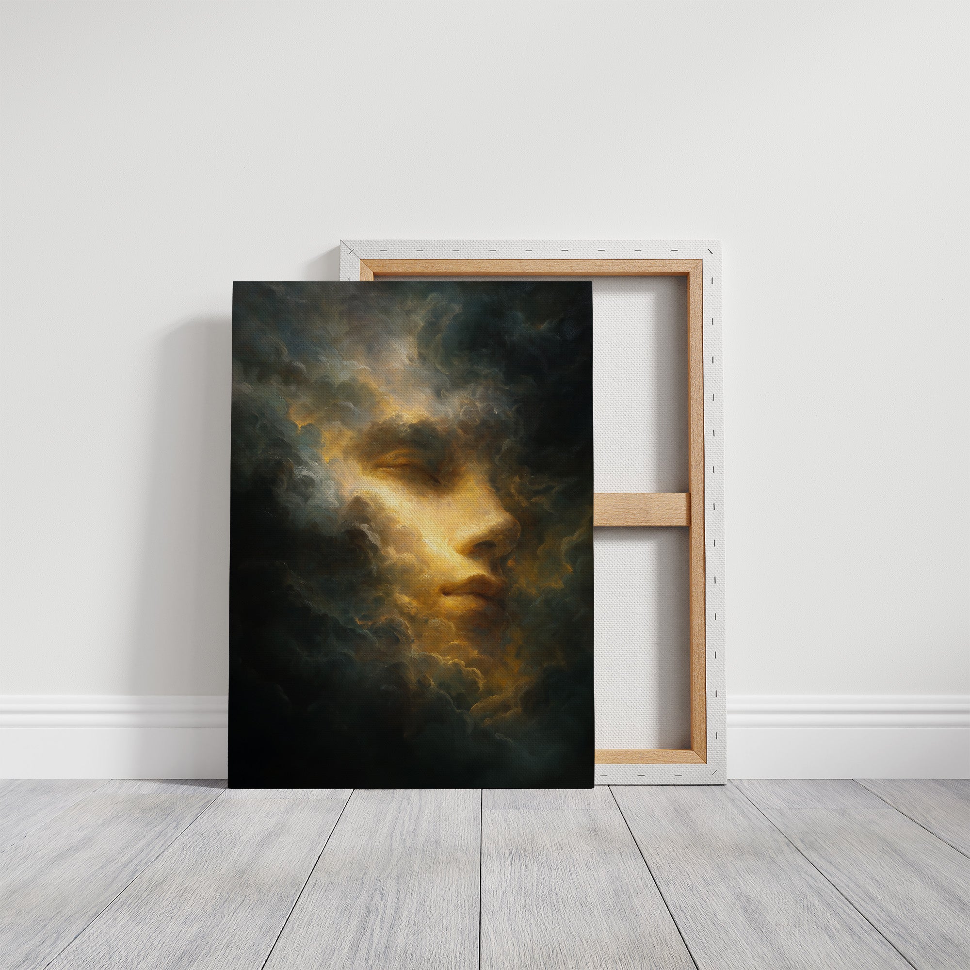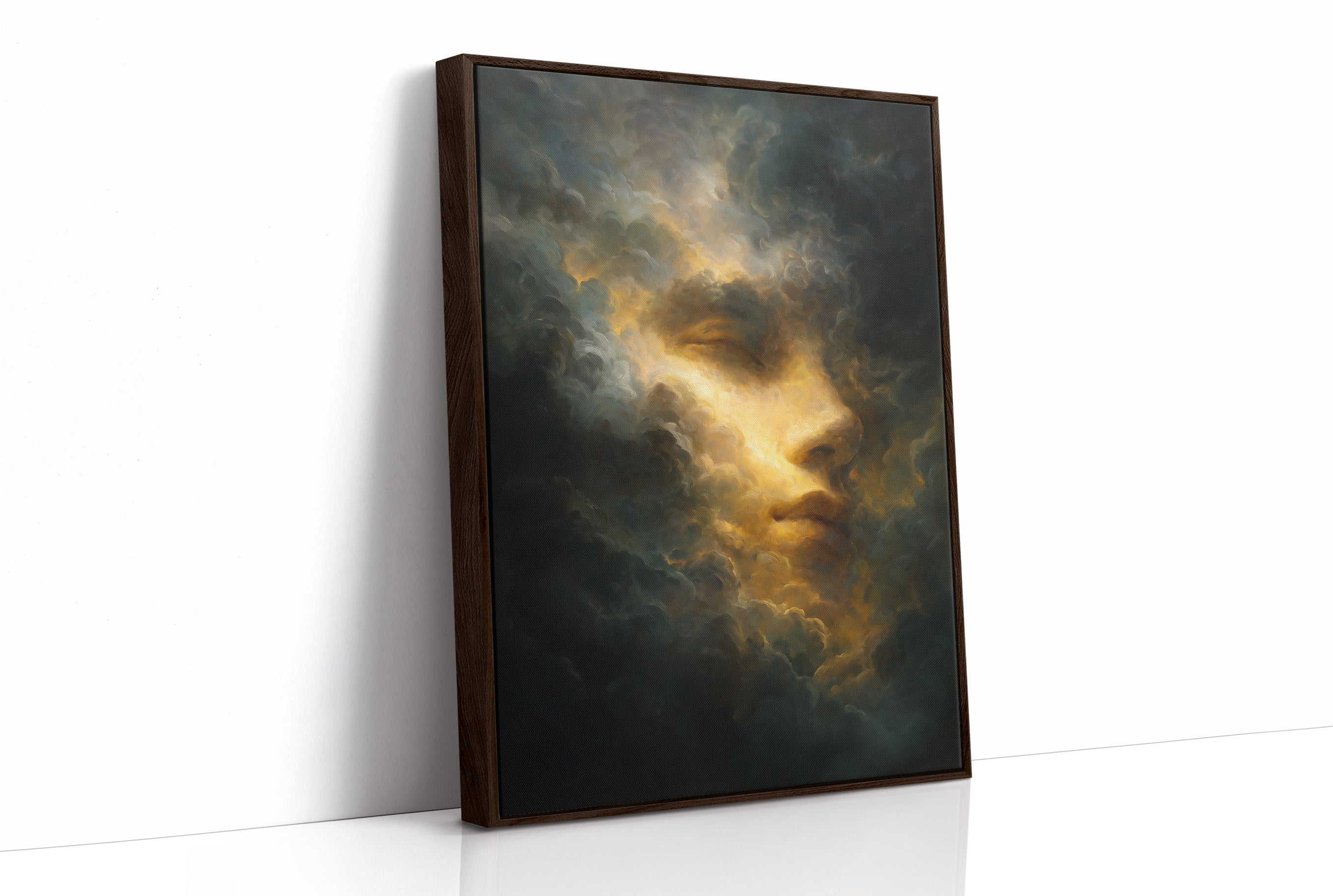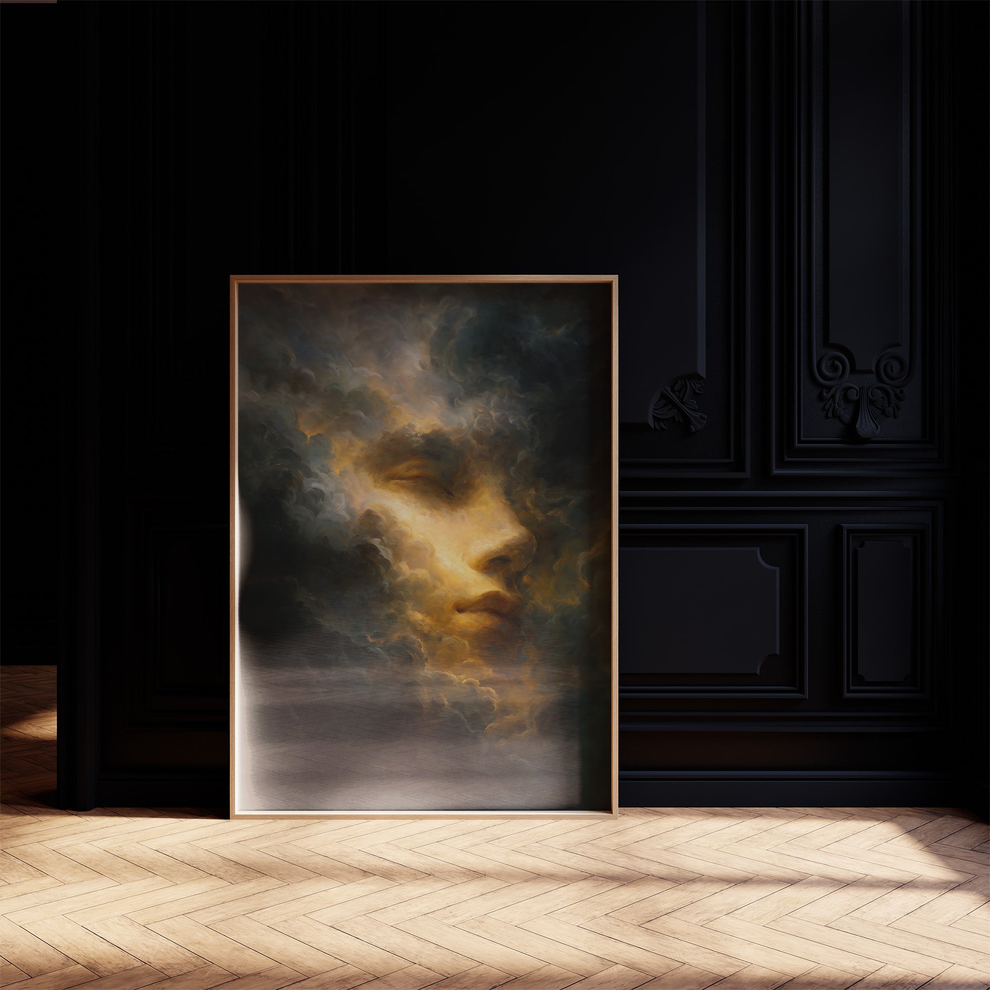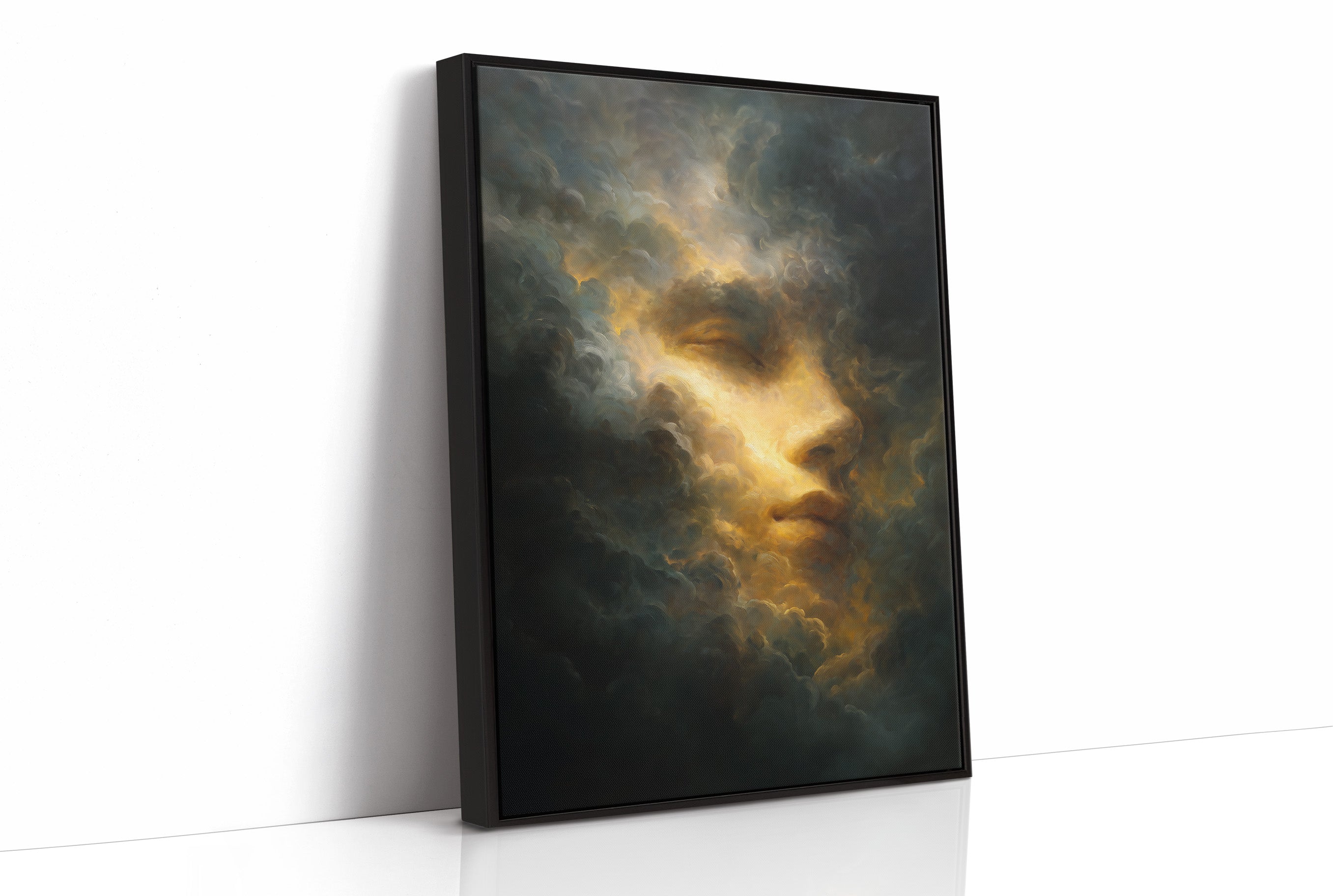 A haunting presence emerges from swirling tempests and golden light, neither fully formed nor completely abstract. The ethereal portrait blends stormy grays with warm amber hues, creating a dreamlike vision where features materialize and dissolve like thoughts at dawn. Against the dramatic black wall, this mysterious figure exists in the liminal space between reality and imagination, a testament to the beautiful uncertainty of human perception. This striking piece would command attention in a minimalist living space or create an evocative focal point in a sophisticated study.