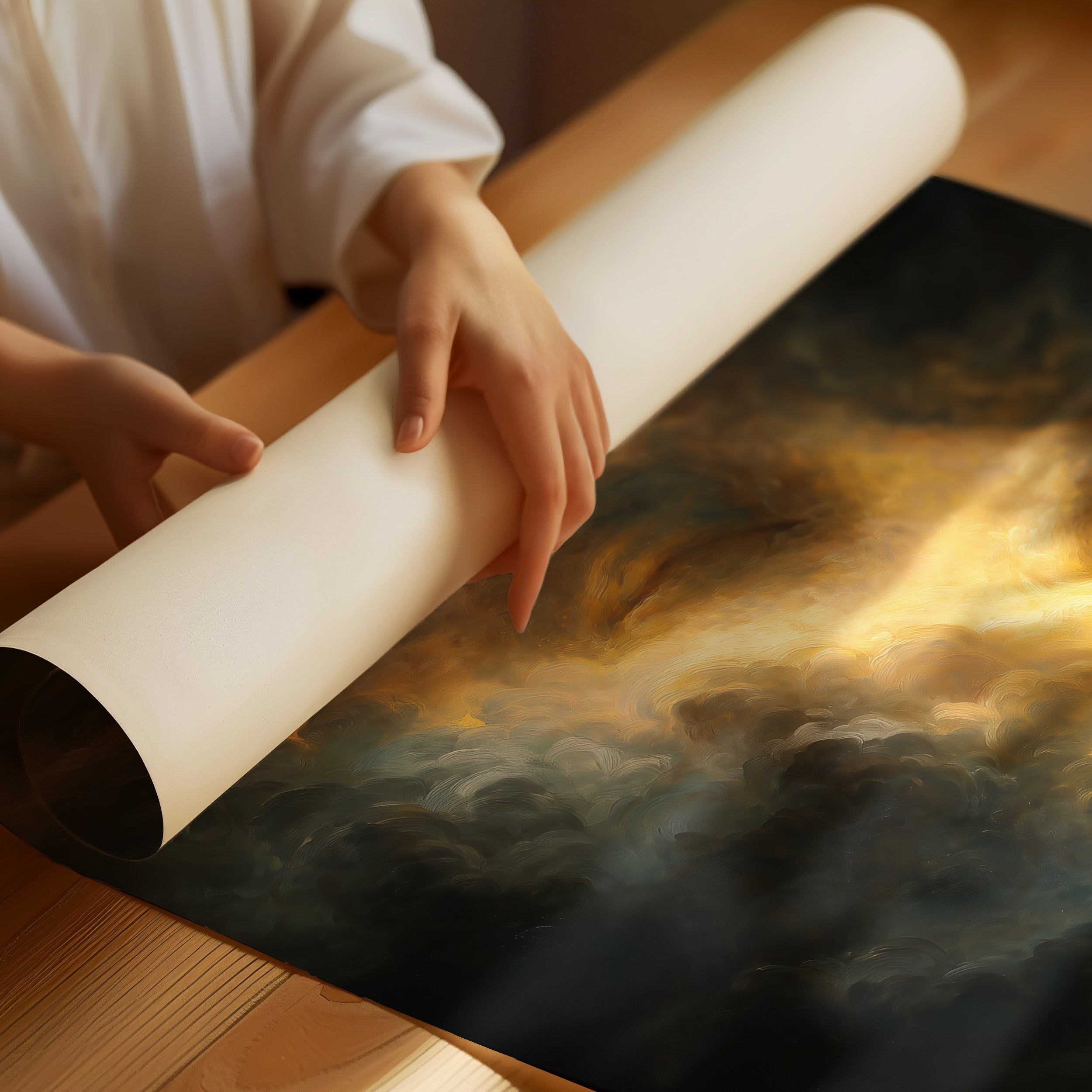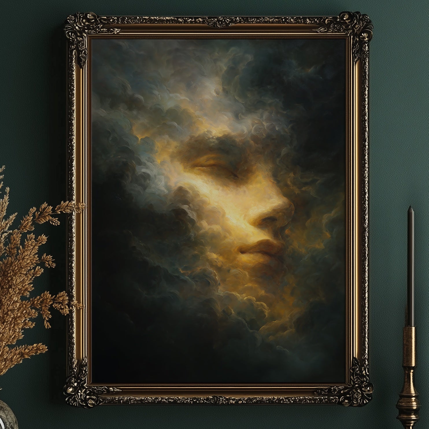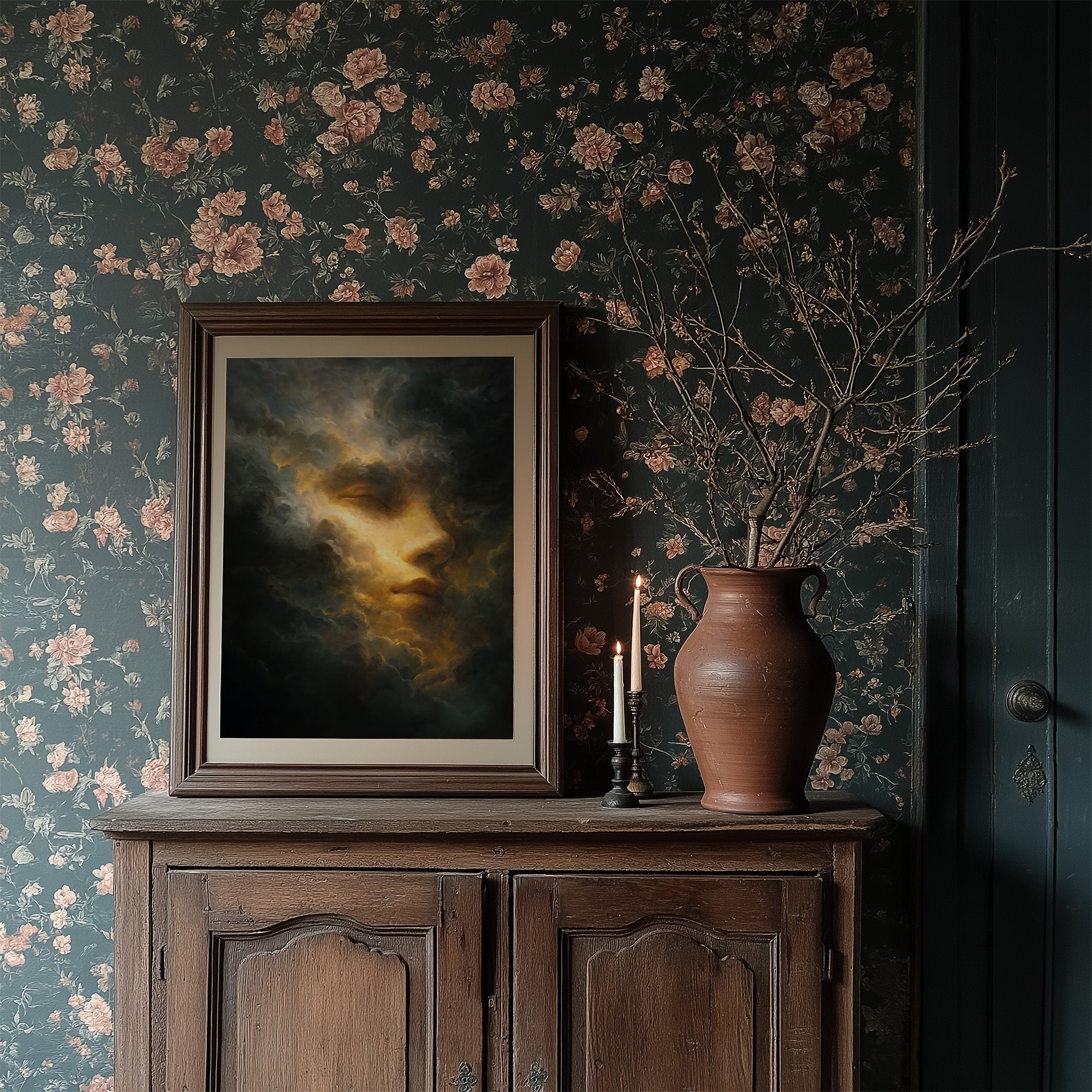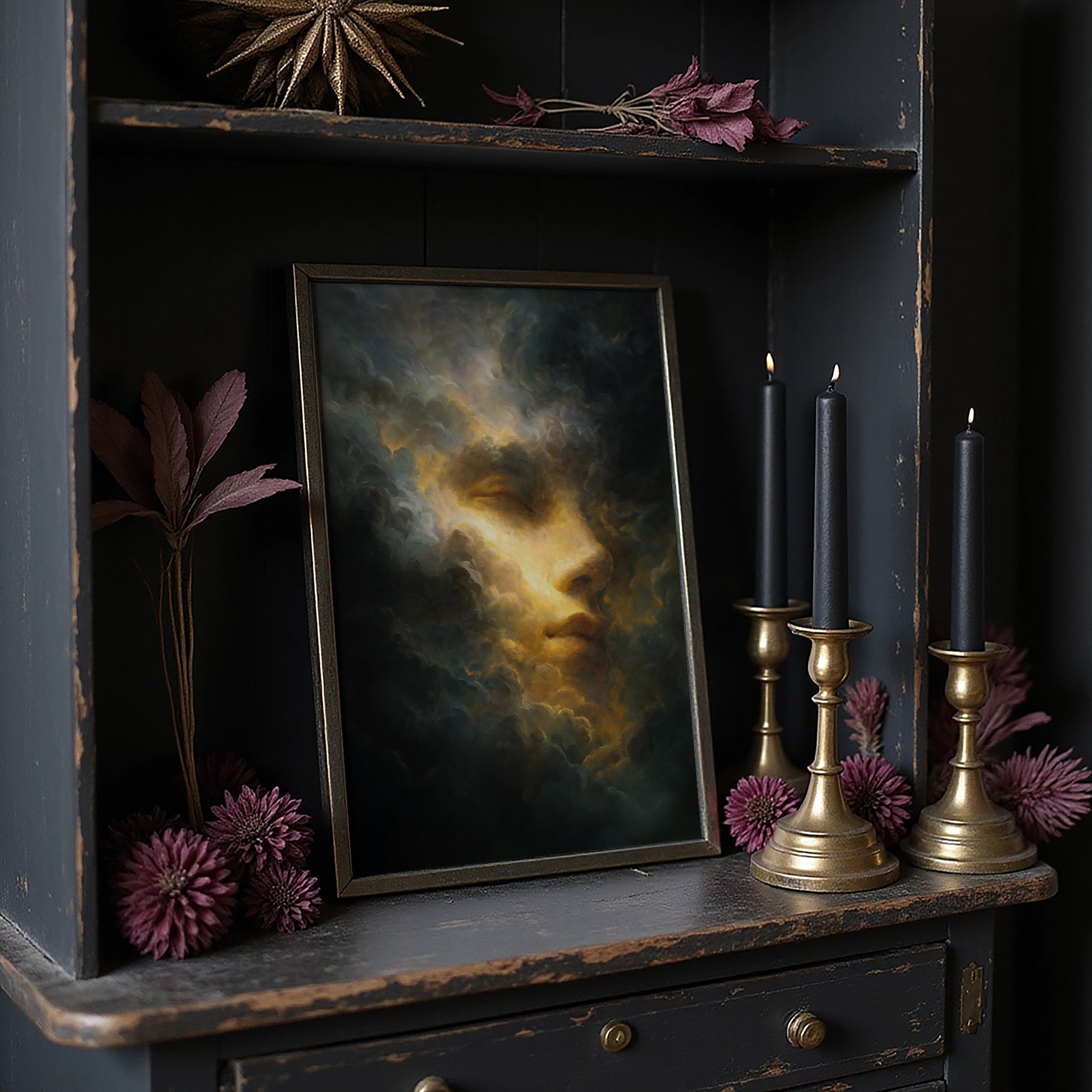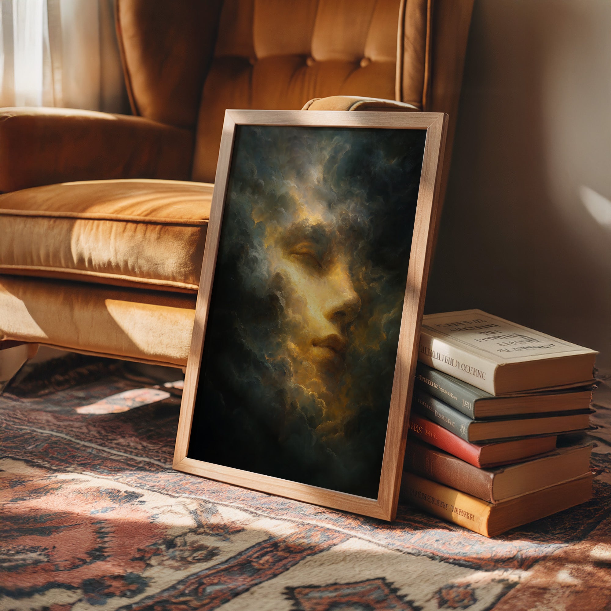 A haunting presence emerges from swirling tempests and golden light, neither fully formed nor completely abstract. The ethereal portrait blends stormy grays with warm amber hues, creating a dreamlike vision where features materialize and dissolve like thoughts at dawn. Against the dramatic black wall, this mysterious figure exists in the liminal space between reality and imagination, a testament to the beautiful uncertainty of human perception. This striking piece would command attention in a minimalist living space or create an evocative focal point in a sophisticated study.