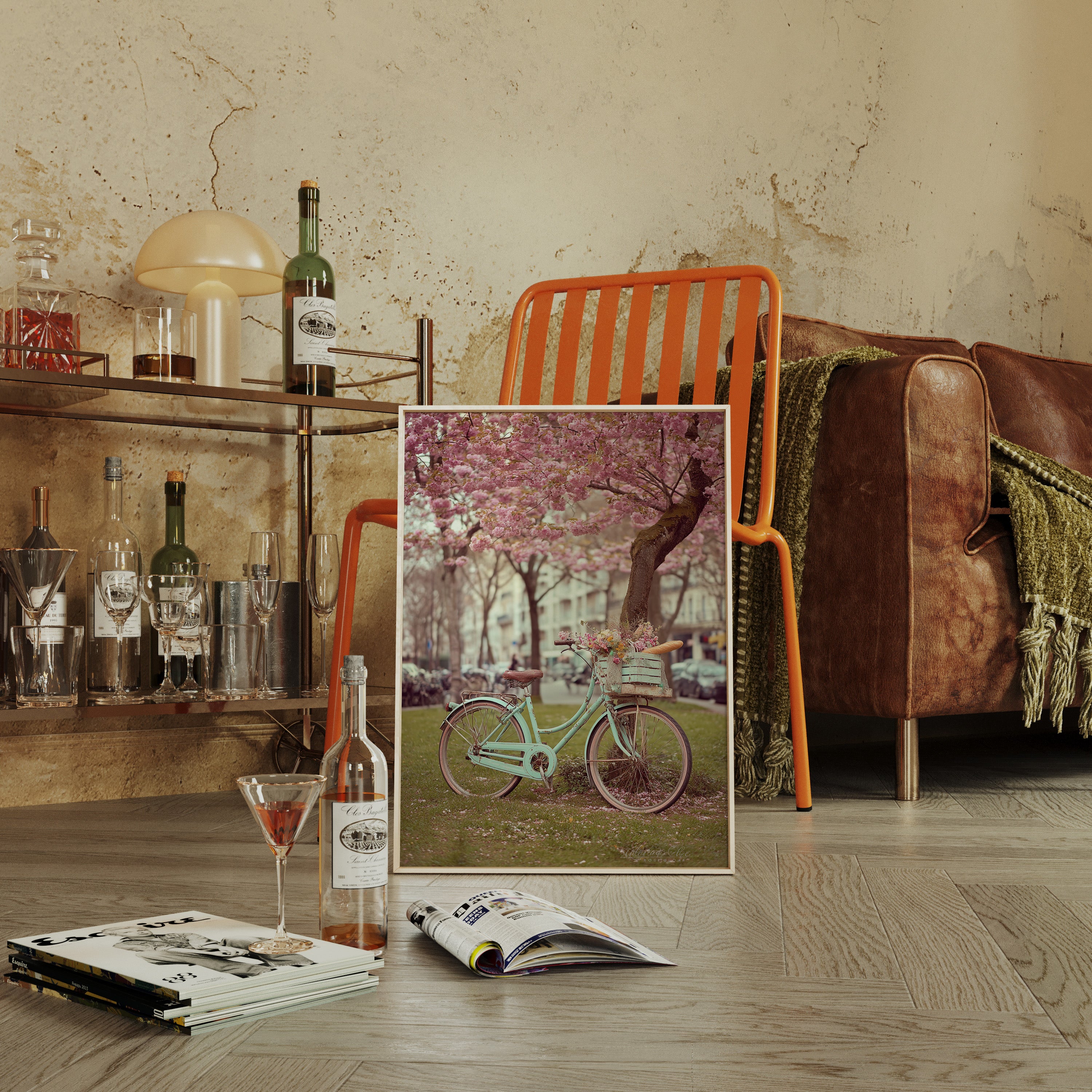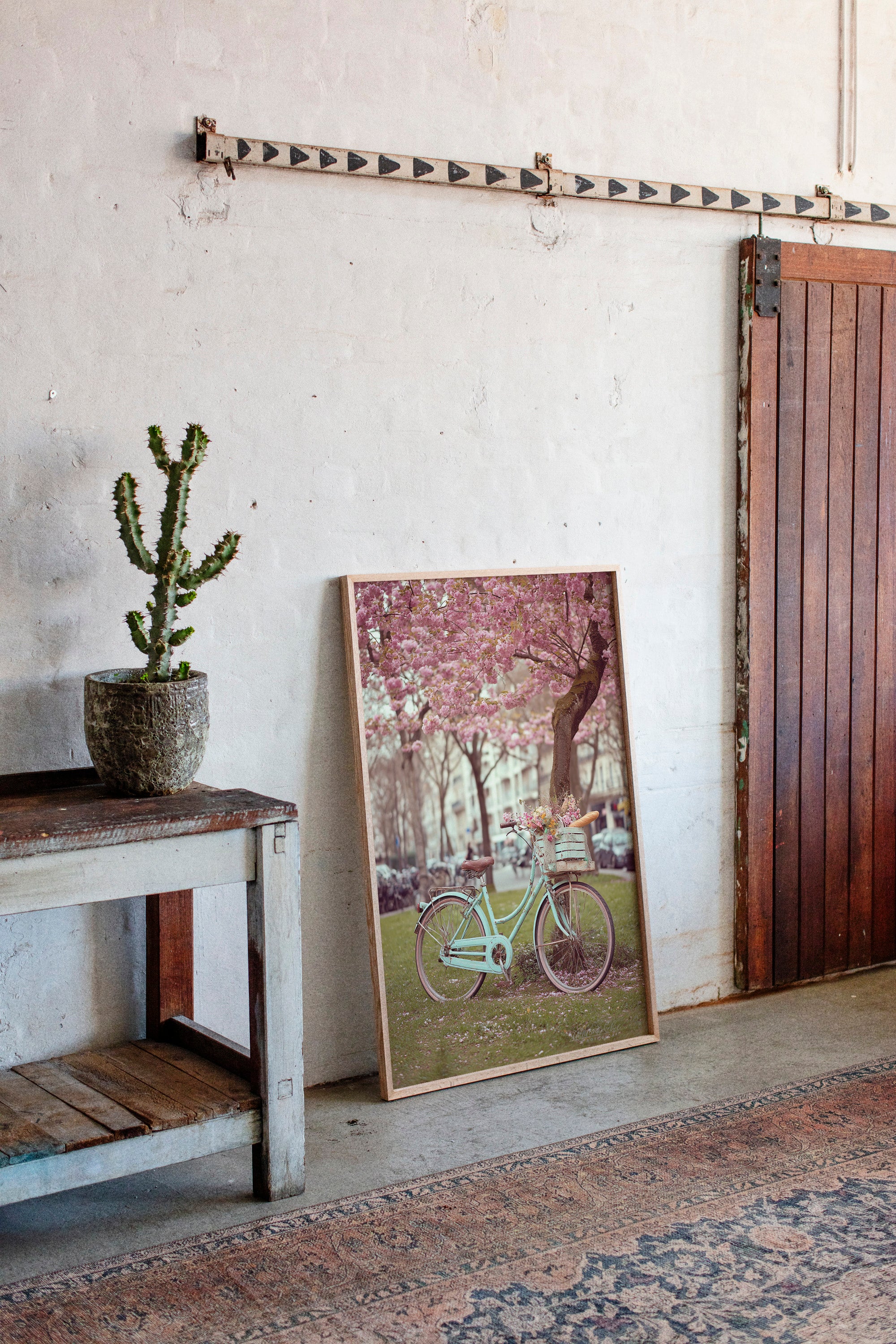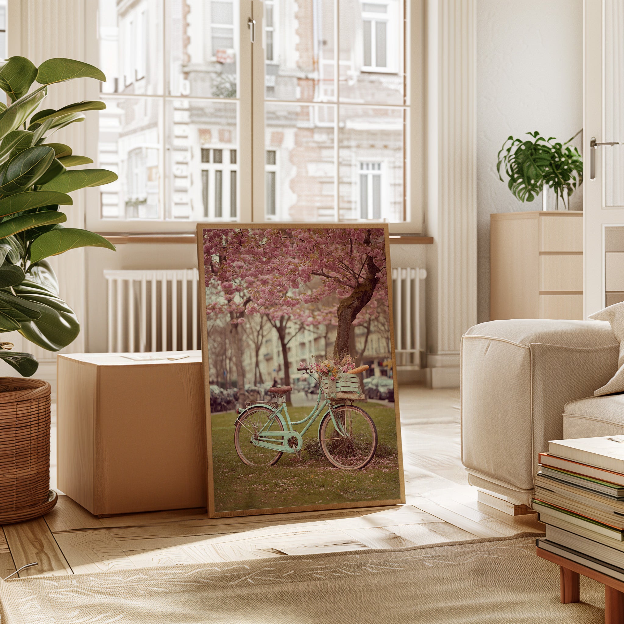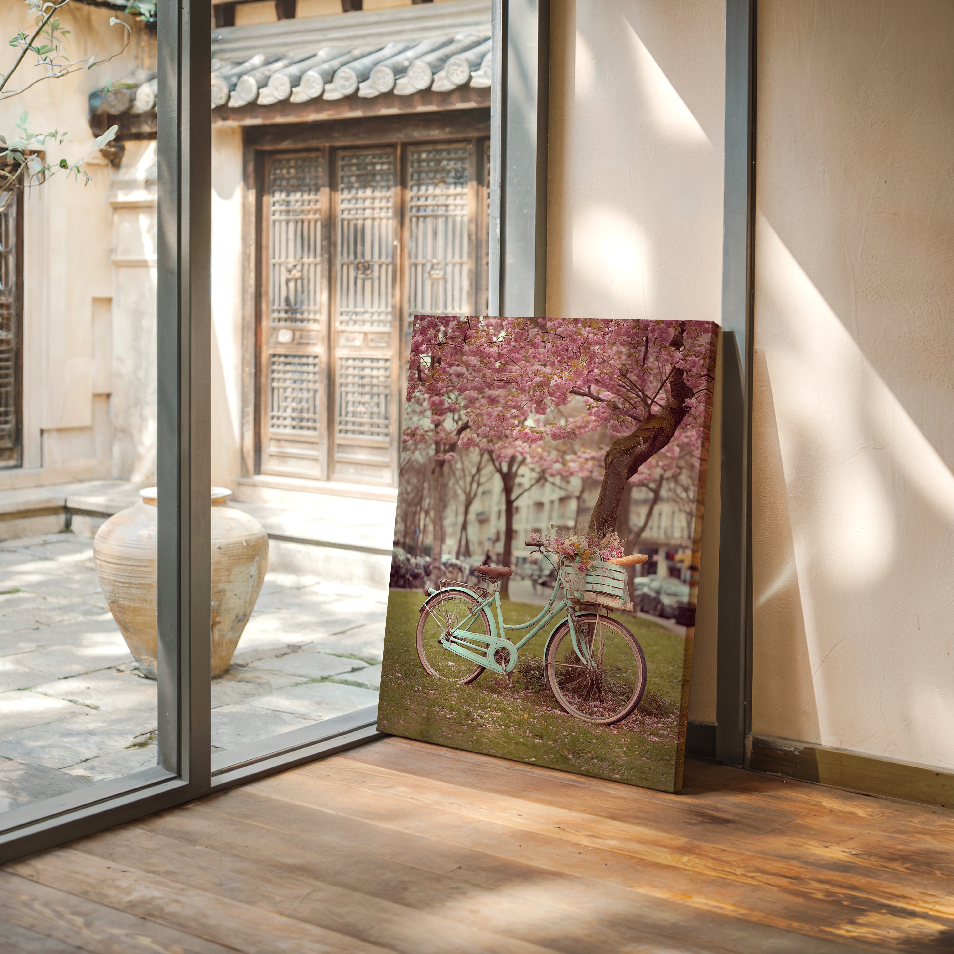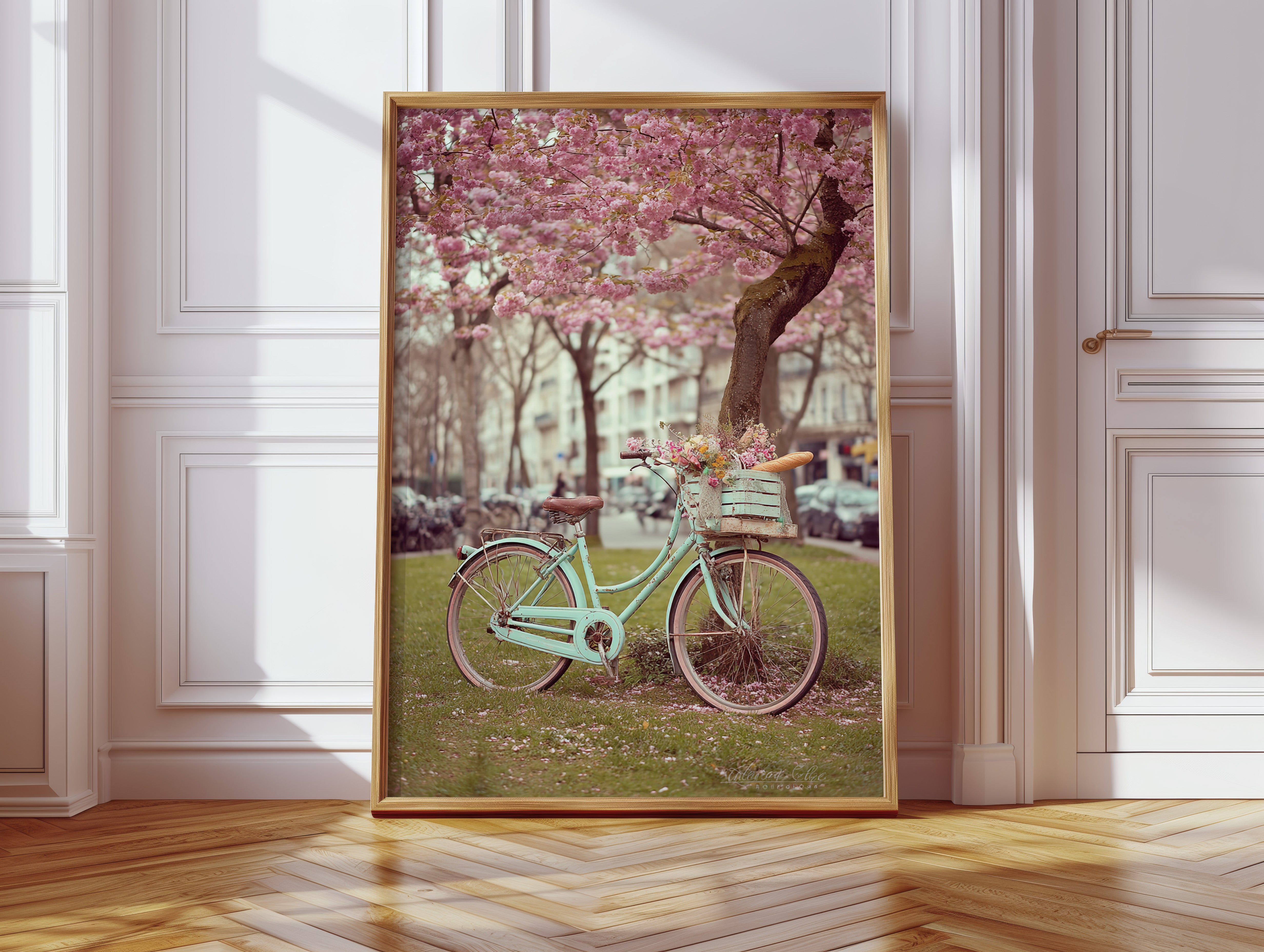 This photographic piece captures the enchanting essence of a vintage bicycle adorned with a basket of blooms, a scene reminiscent of leisurely strolls through quaint city streets. The pastel tones and classic composition evoke a sense of nostalgia and tranquility.