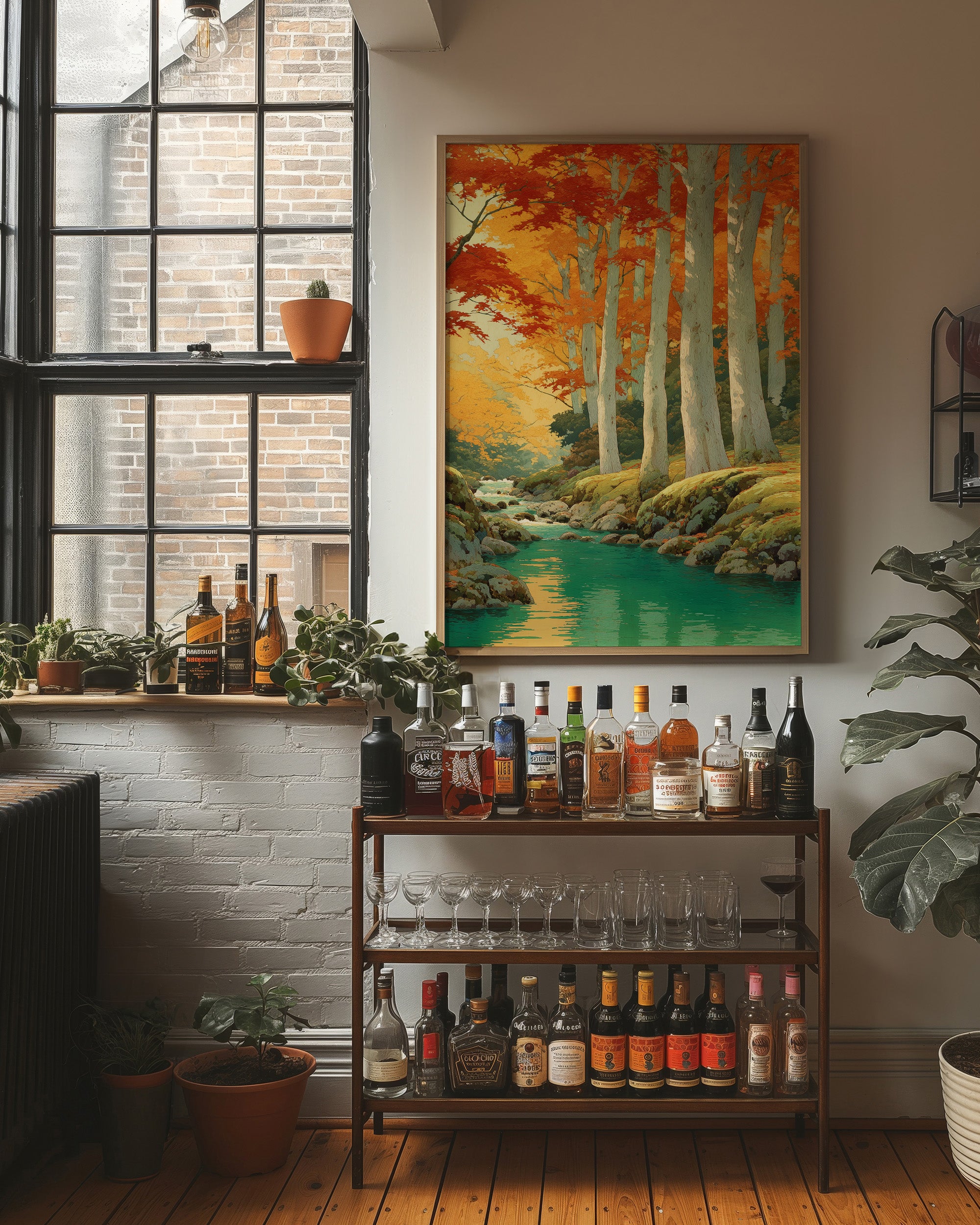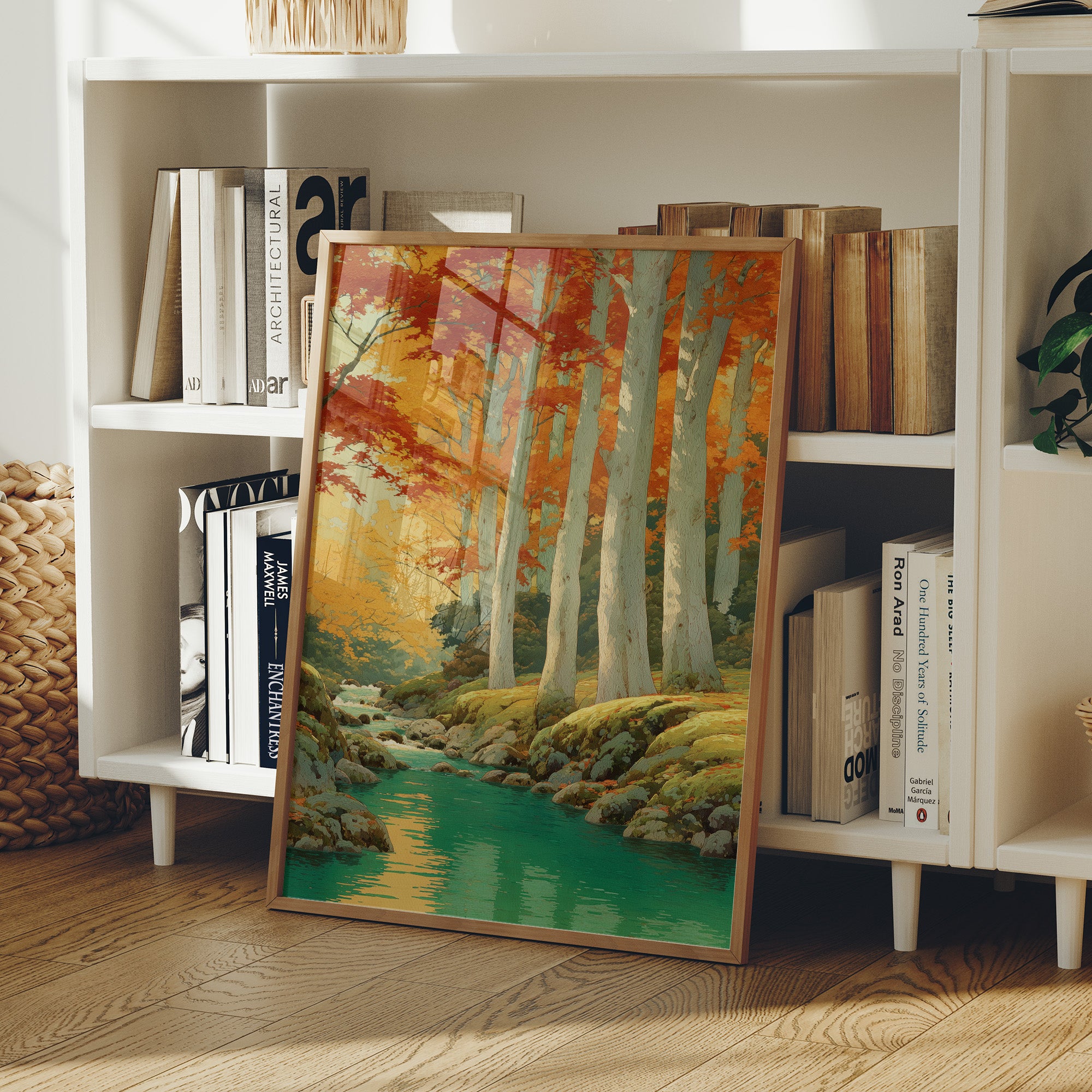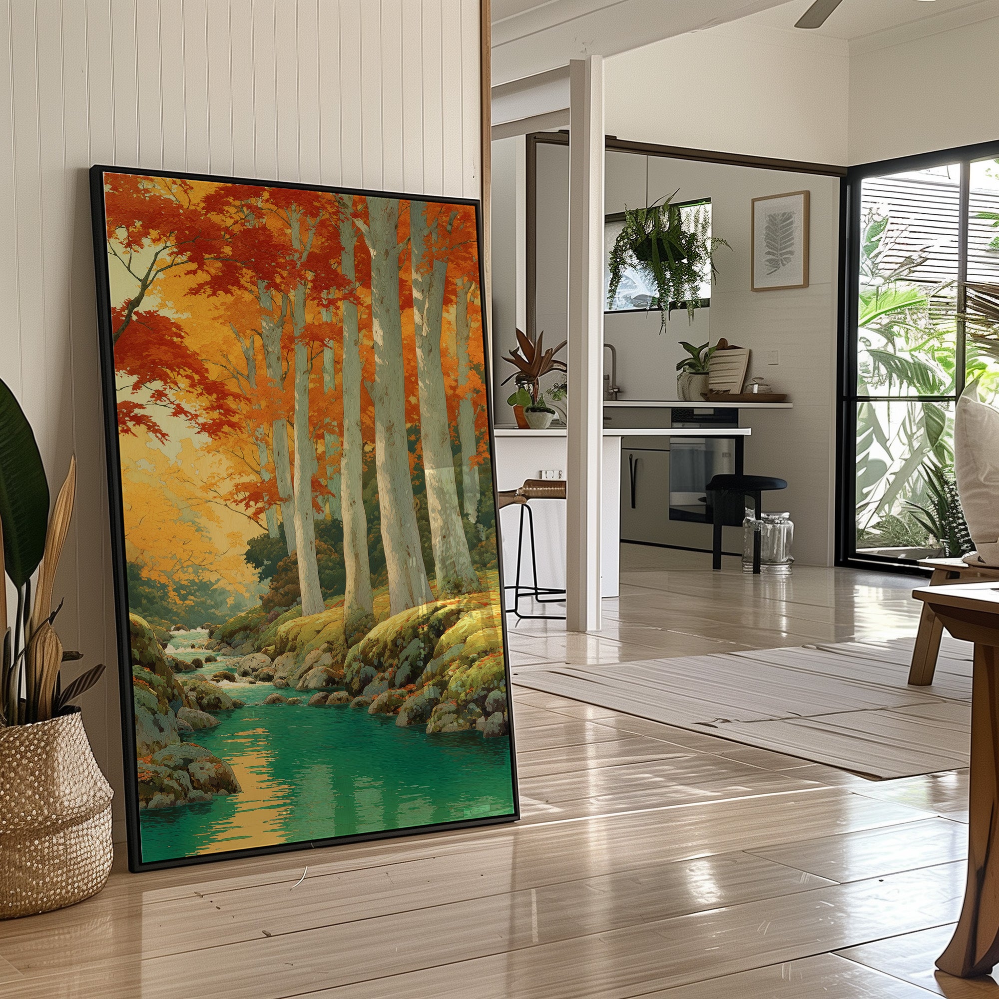 Sunlight filters through a canopy of flame-colored leaves, casting golden warmth across a secluded forest scene. Slender birch trunks stand like pale sentinels against a backdrop of vibrant orange and red foliage, their reflection dancing in the tranquil turquoise waters below. The composition captures that magical moment when autumn's palette is at its peak, with moss-covered stones dotting the riverbank and creating a natural frame for the mirror-like stream. Perfect for a reading nook or meditation space where you seek to bring the transformative energy of nature indoors. The piece's harmonious blend of warm and cool tones makes it an ideal focal point for rooms seeking to balance serenity with dramatic natural beauty.