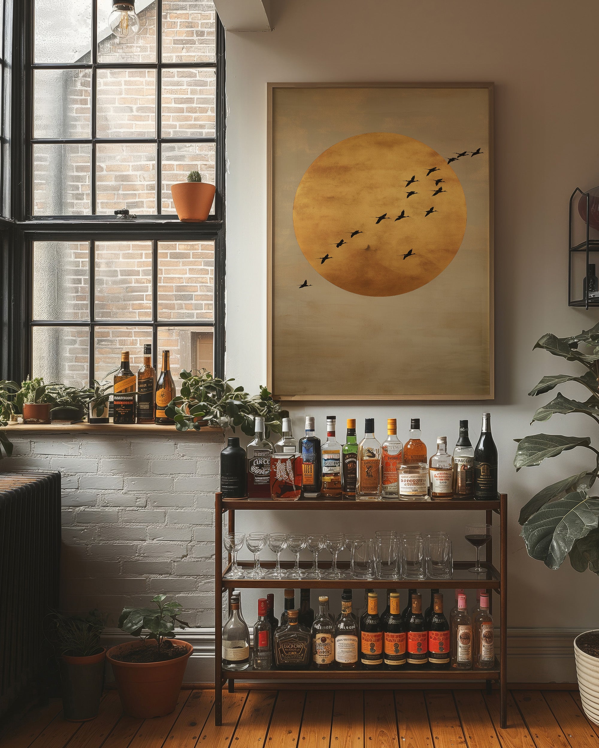 A serene moment captured as migrating birds traverse across a luminous golden moon. The minimalist composition creates a powerful visual metaphor for journey and transformation, with the stark silhouettes of birds arranged in perfect formation against the warm ochre circle. This contemporary piece balances simplicity with depth, using a restrained palette of amber and grey tones to evoke a sense of timeless transition. This piece would bring a sense of calm sophistication to a reading nook or meditation space, where its contemplative nature can be fully appreciated in moments of quiet reflection.