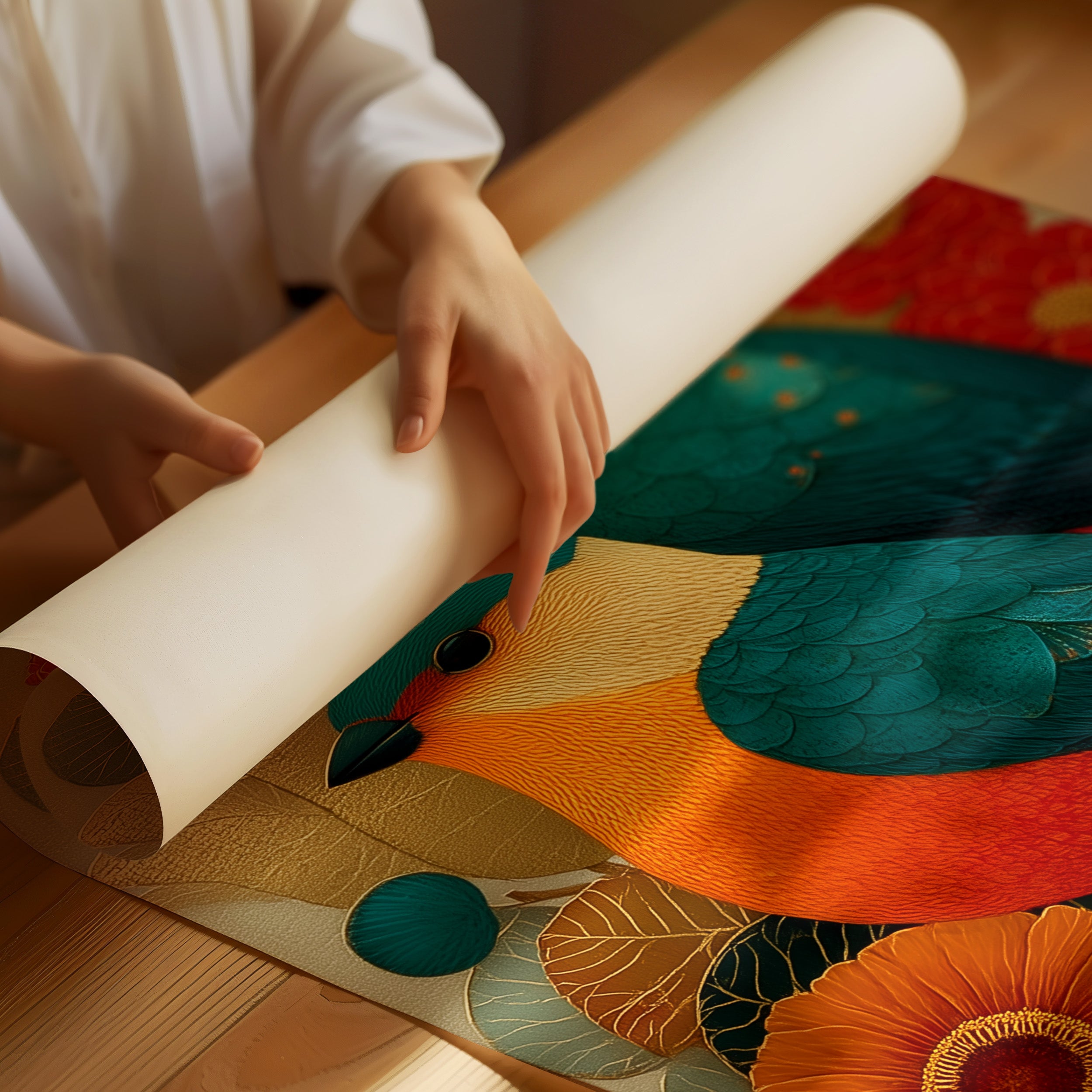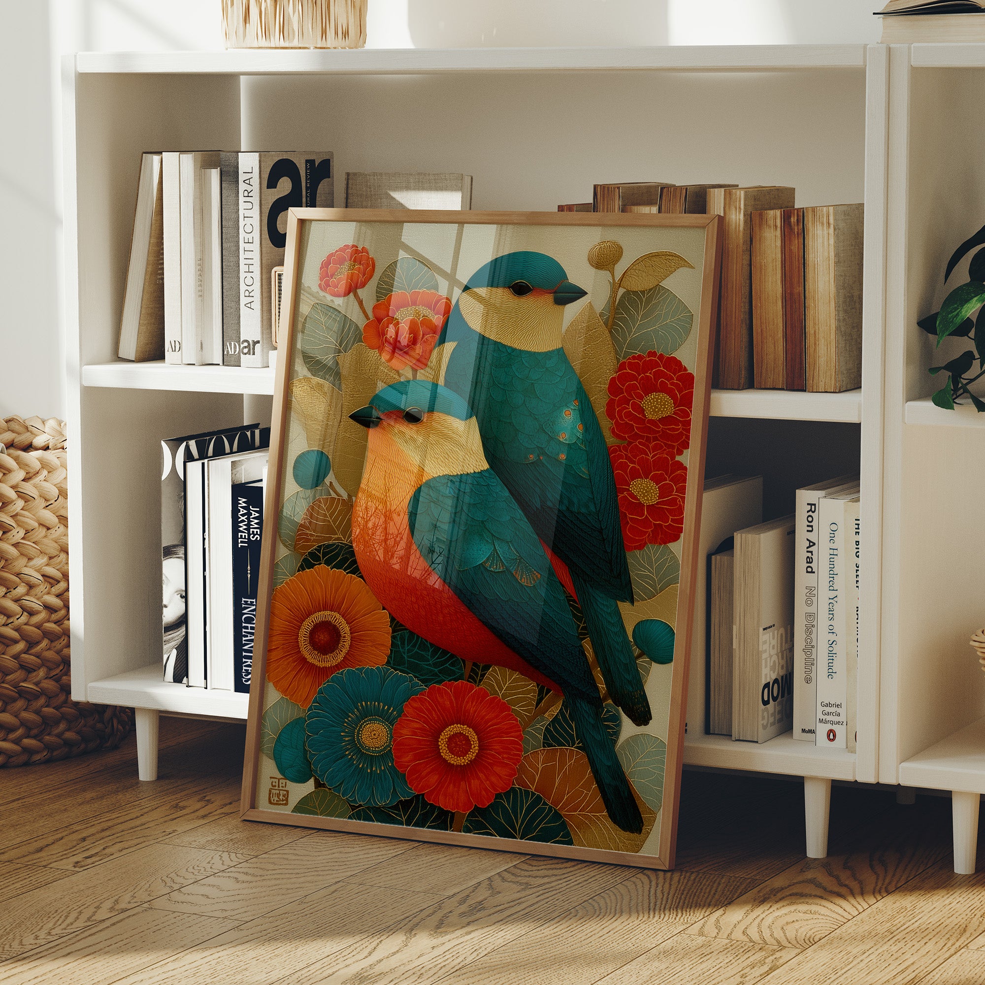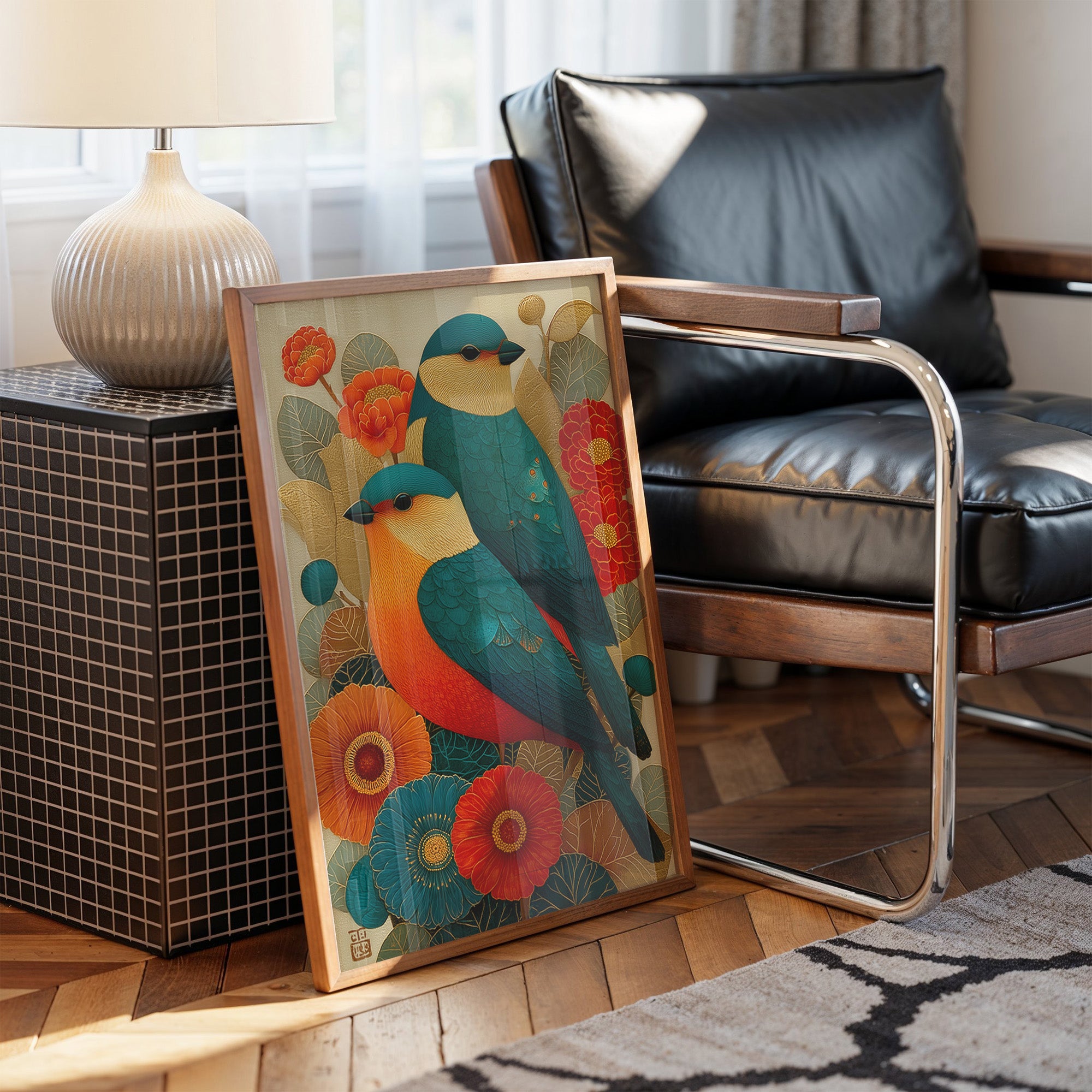 Vibrant teal songbirds rest among a garden of coral-colored flowers, their feathers catching the warm golden light. The composition marries Eastern artistic influence with modern color blocking, creating a harmonious blend of nature and design. Delicate details in the birds' plumage and the intricate flower petals showcase masterful illustration technique against a serene neutral background. This striking piece would make a bold statement in a modern dining room or bring artistic flair to a reading nook, especially when paired with mid-century modern furniture.
