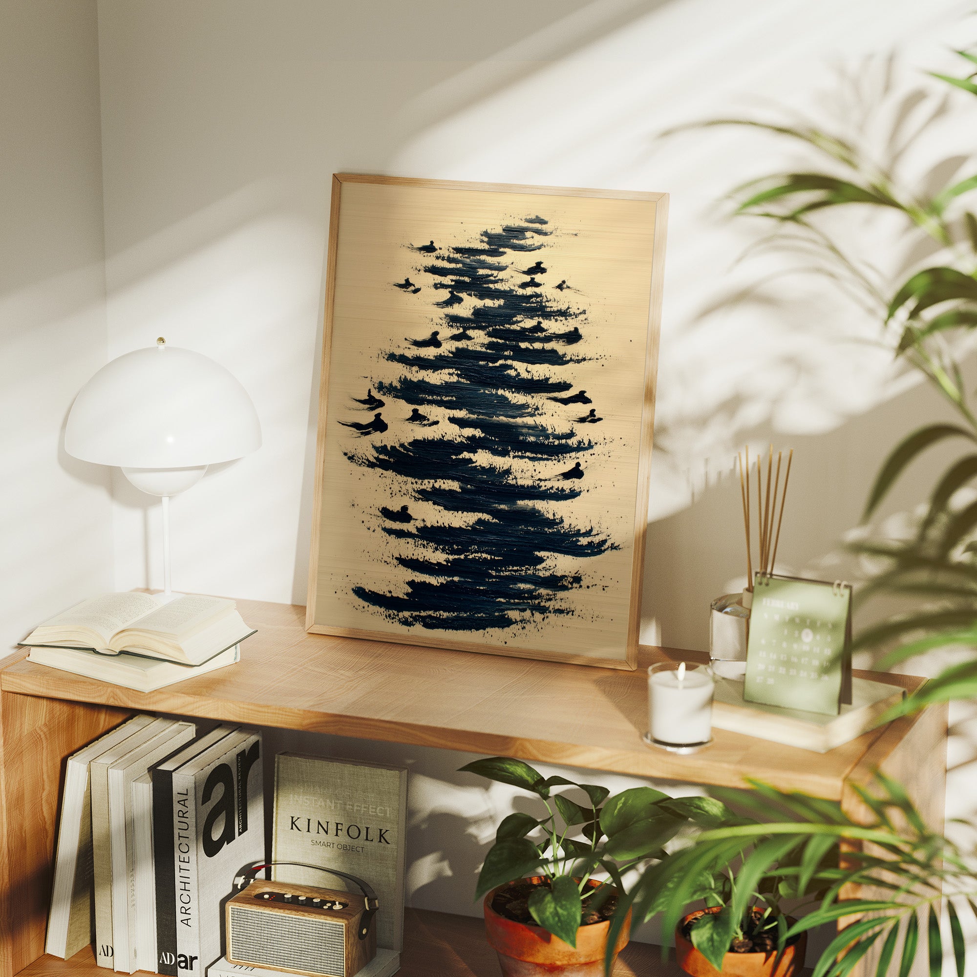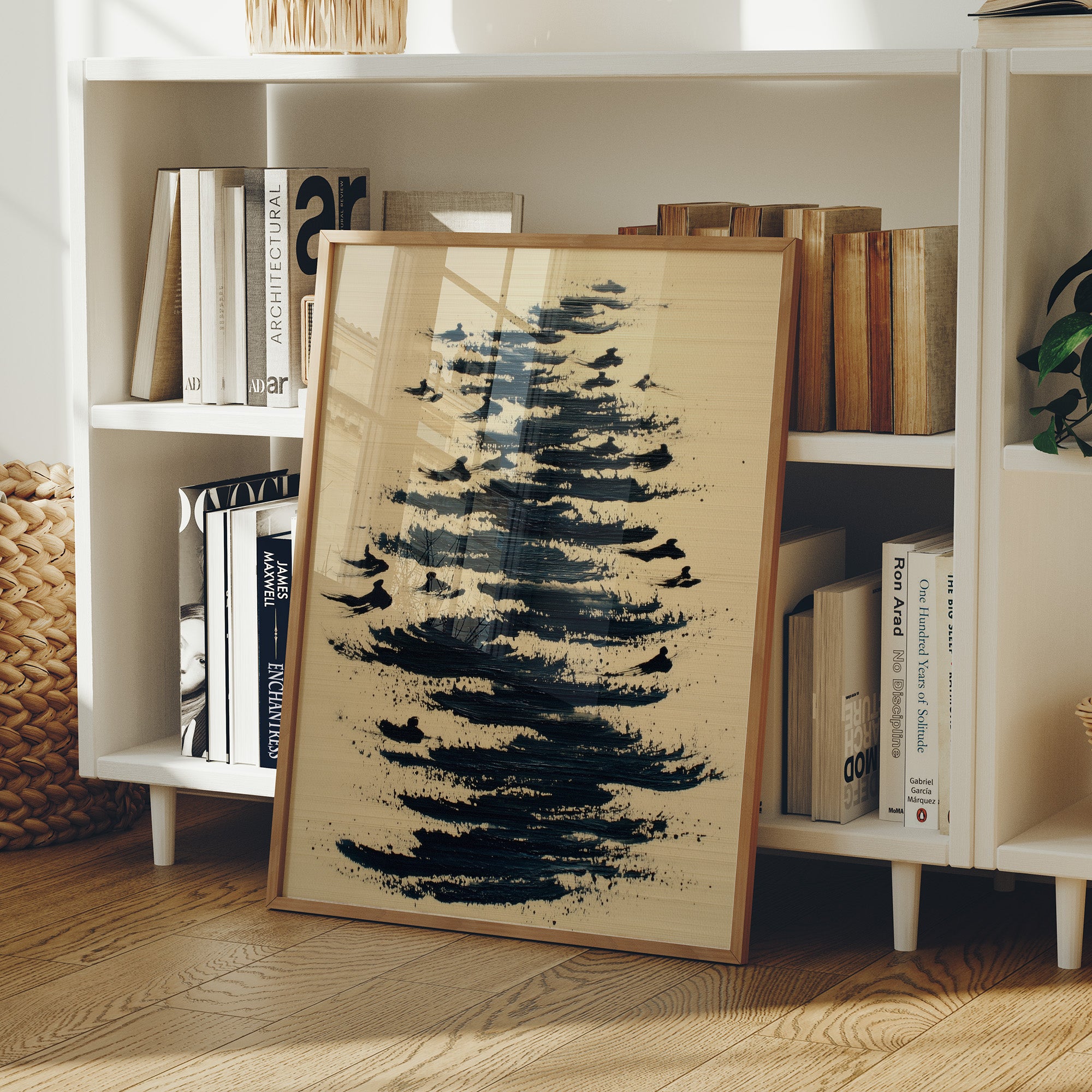 Stark silhouettes of birds glide through dramatic brushstrokes, creating a mesmerizing dance of movement and stillness. The contrast between the cream background and deep navy strokes evokes the feeling of birds navigating through turbulent waters or windswept skies. The composition's dynamic energy is balanced by its minimalist approach, where each mark seems both deliberate and spontaneous. This piece would bring sophisticated energy to a modern living room or add contemplative charm to a home office, especially when paired with natural wood tones and leather accents.