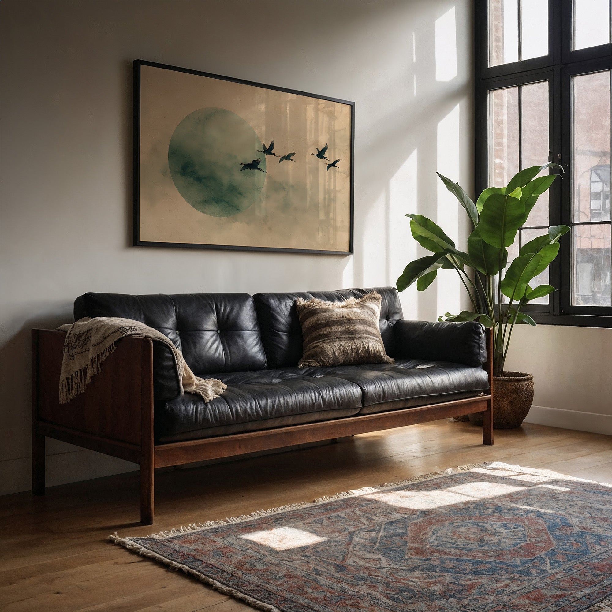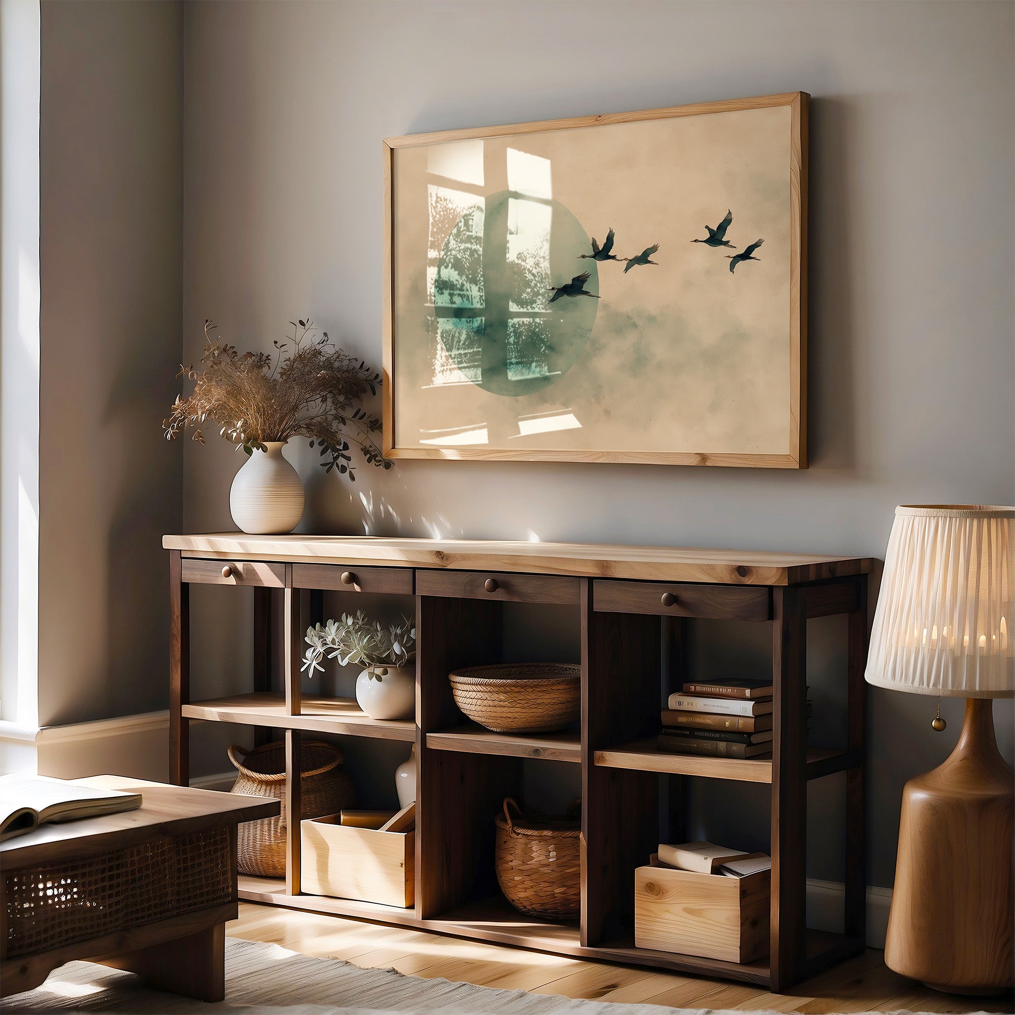 Afternoon sunlight spills across a corduroy couch, casting delicate plant shadows that dance along cream walls. A minimalist print captures the essence of migration - silhouetted birds gliding past a misty jade moon, their formation cutting through clouded skies with quiet determination. The scene creates a perfect harmony between the warm amber light and cool ethereal tones, while the surrounding houseplants add living texture to this contemplative corner. This piece would elevate a reading nook, meditation space, or any room seeking a sense of peaceful movement and natural connection. Its subtle palette and serene composition make it especially suited for spaces dedicated to relaxation and mindful moments.
