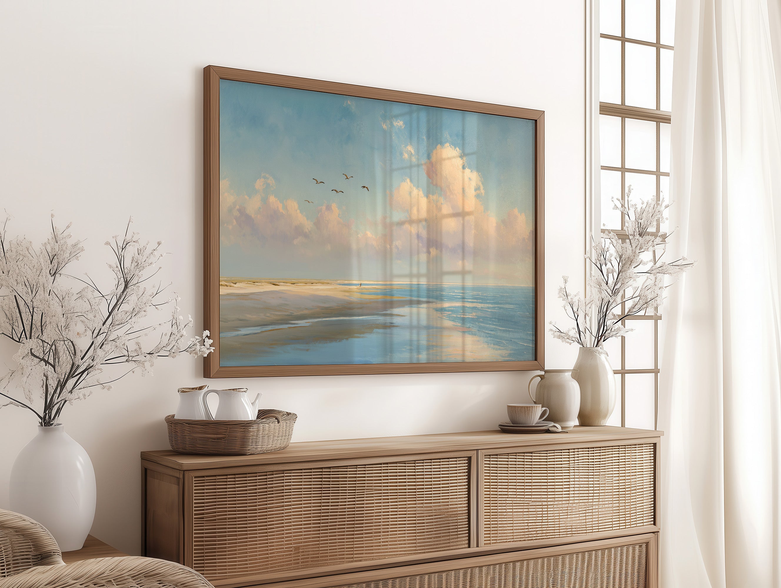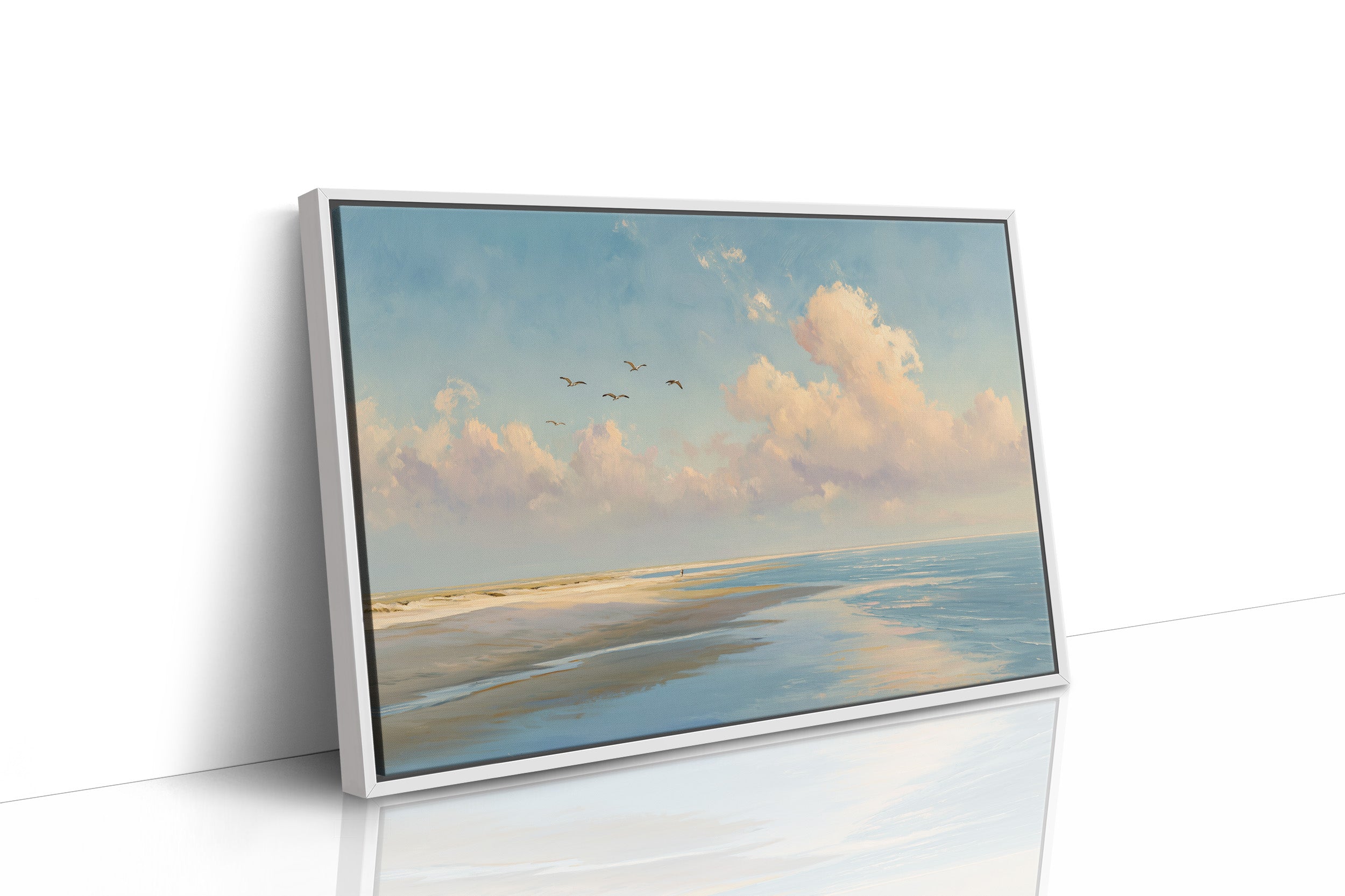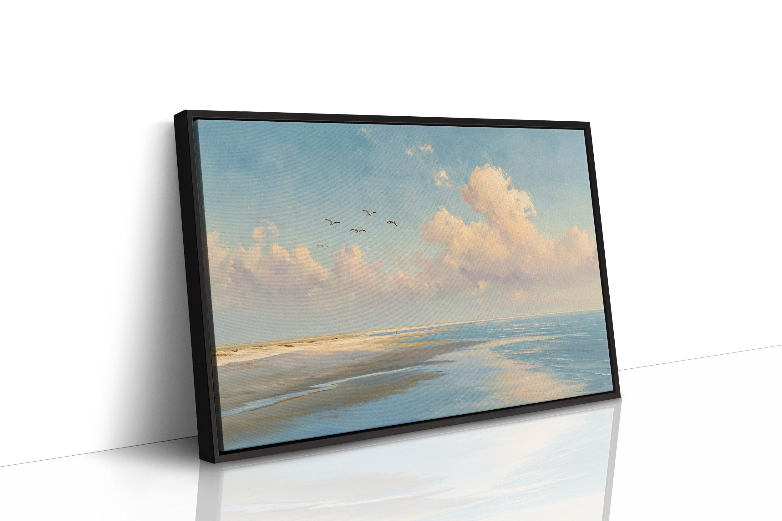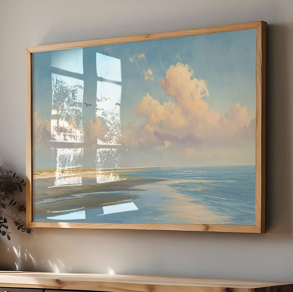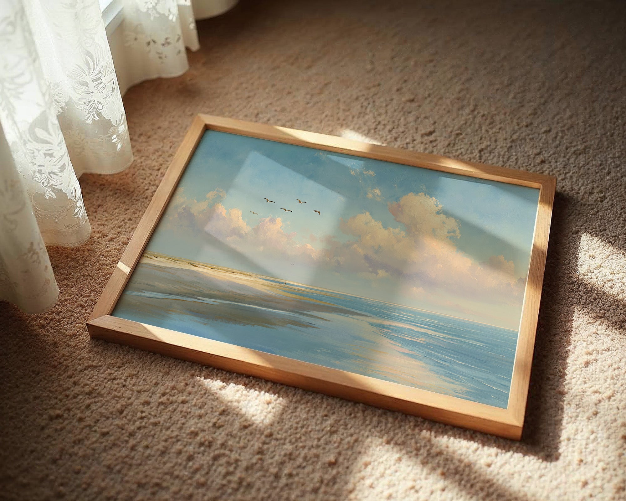 Sunlight bathes the shoreline in golden warmth as birds glide freely across a canvas of billowing clouds. The meeting of sand and sea creates a perfect harmony of textures, where azure waters mirror the expansive sky above. Gentle waves leave shimmering reflections on wet sand, capturing the ephemeral beauty of coastal tranquility in its purest form. This serene coastal scene brings natural elegance to living rooms, bedrooms, or any space where you seek a moment of peaceful escape and contemplation.