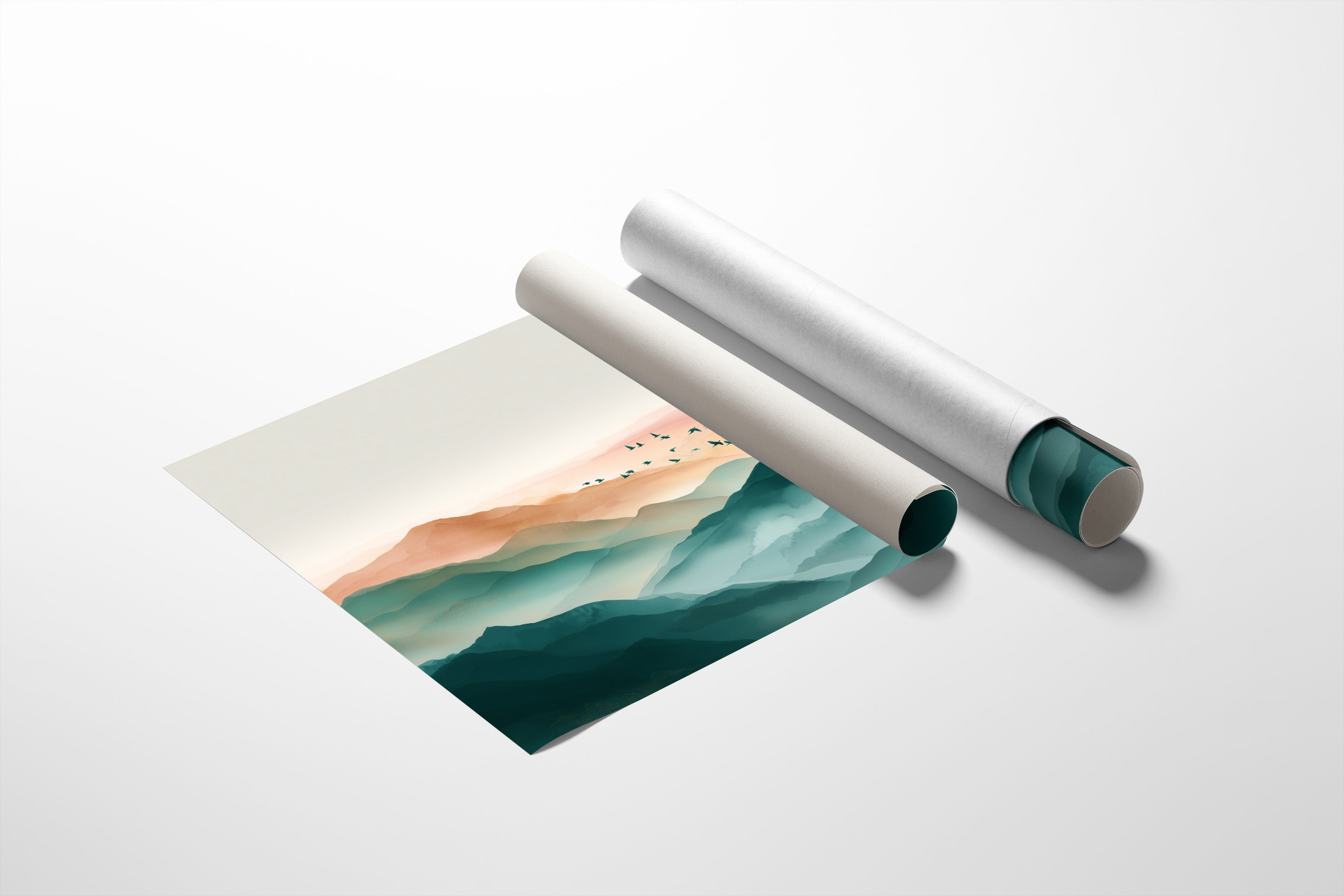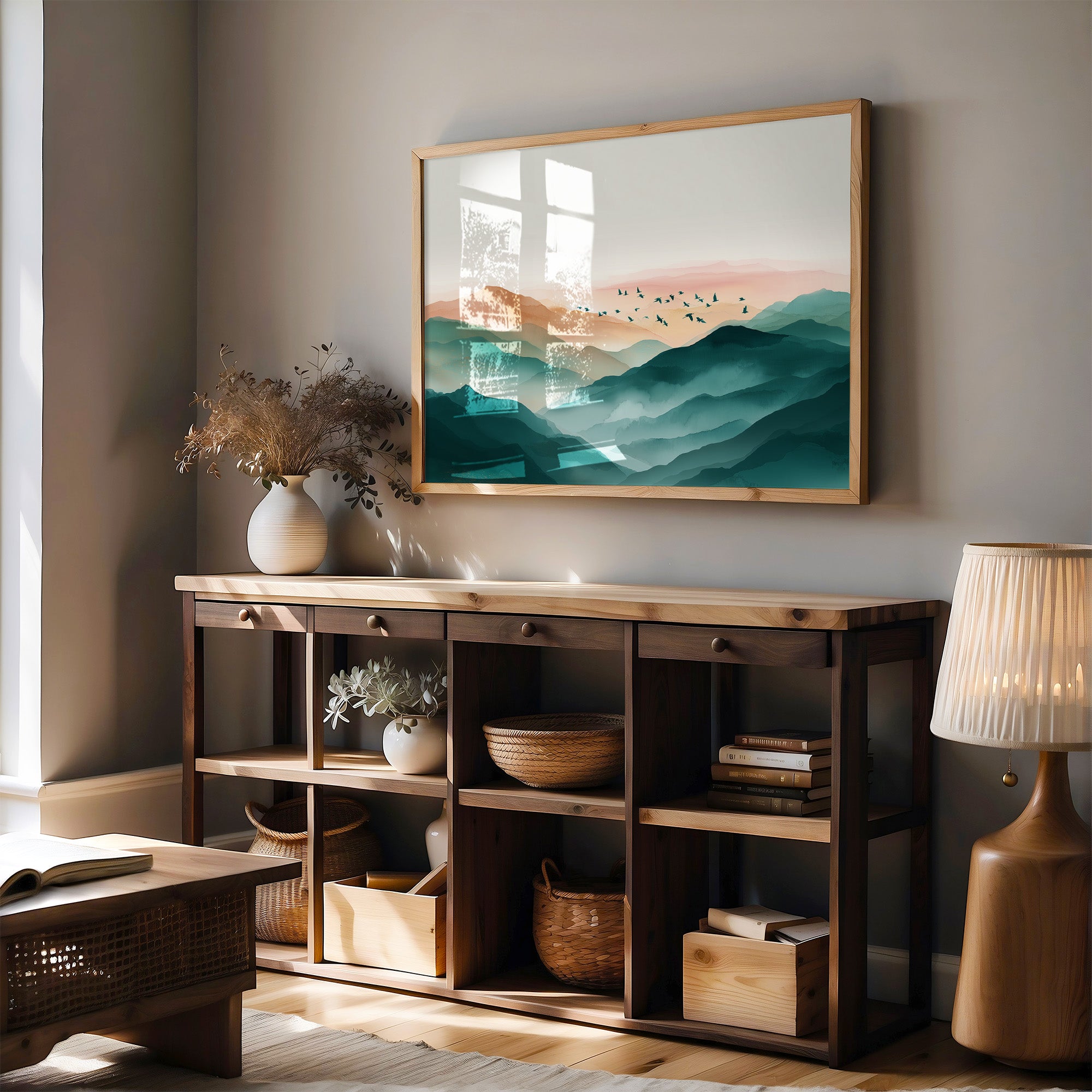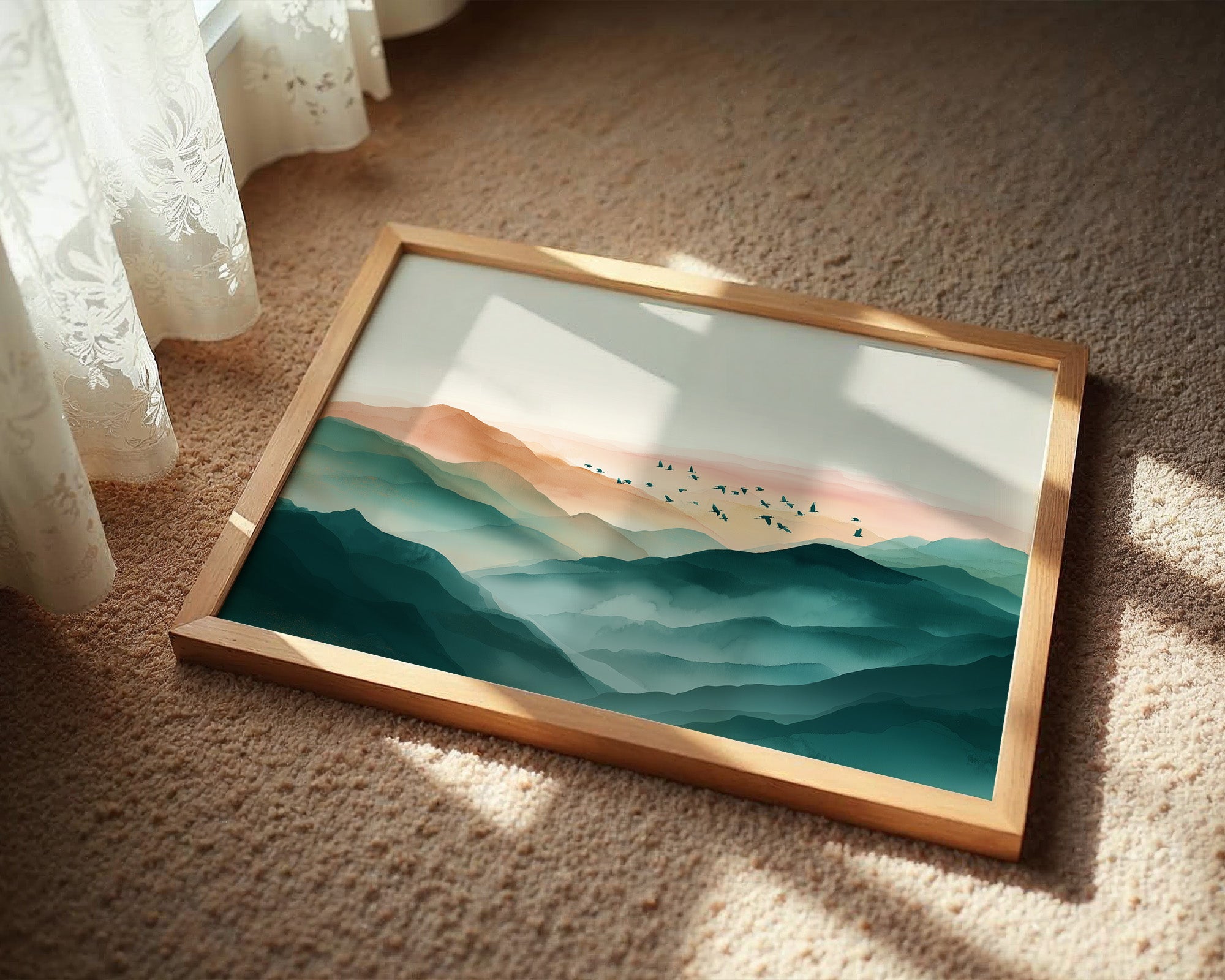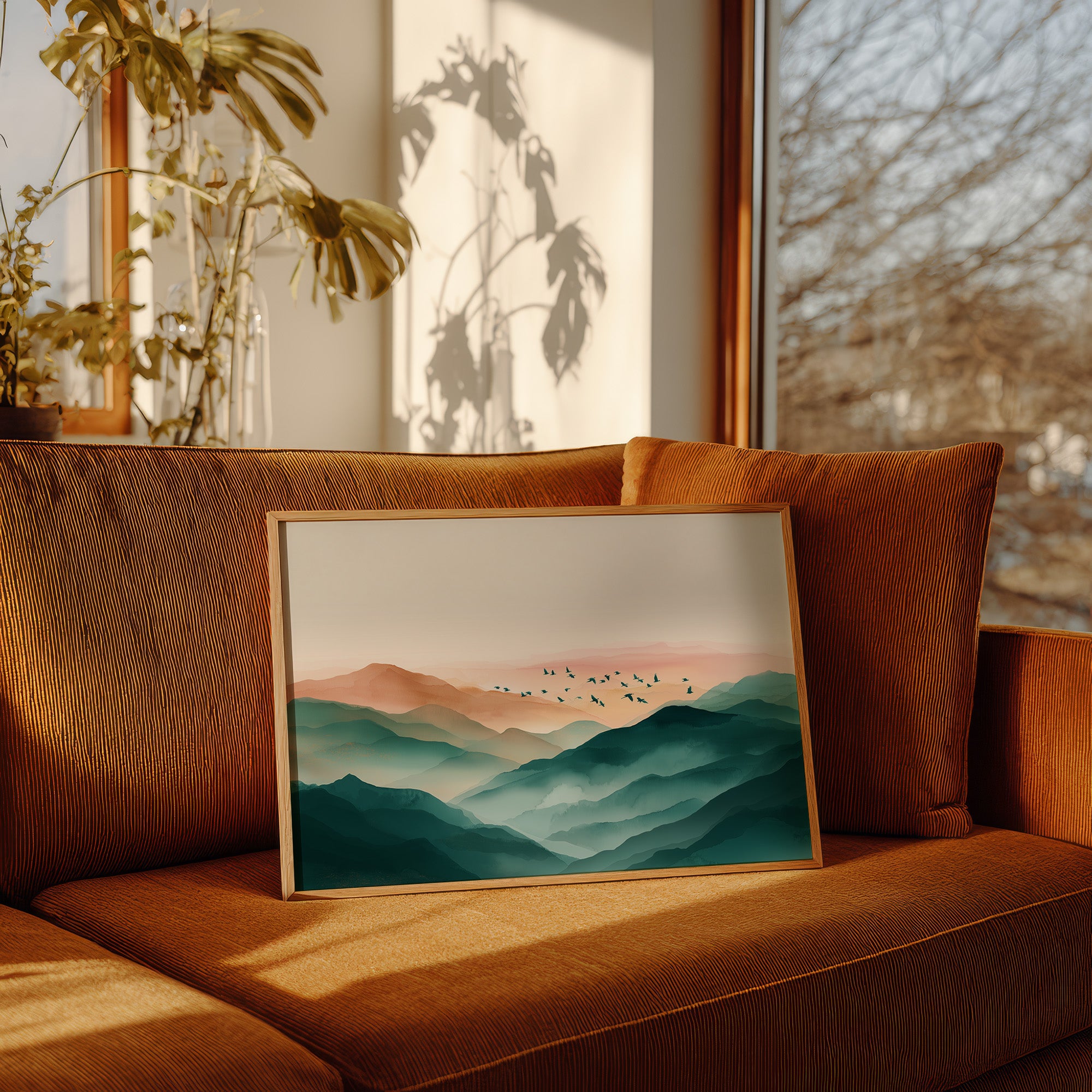 Warm afternoon light streams across a serene living space, casting delicate plant shadows on cream walls. A contemporary landscape print captures the essence of rolling mountains in ethereal teals and coral hues, where birds glide freely through the misty atmosphere. The artwork's peaceful palette harmonizes with the rich corduroy texture of the sofa, creating a meditation on natural beauty and tranquility. Perfect for a reading nook, home office, or any space where you seek to bring the calming presence of mountain vistas indoors.