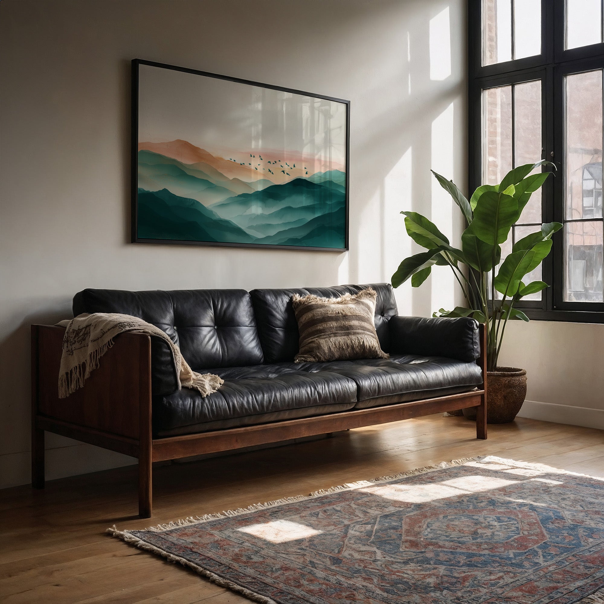 Your artwork should take up 60-75% of wall space above furniture. For standard sofas, choose 24"x36" or larger. When in doubt, go slightly bigger.