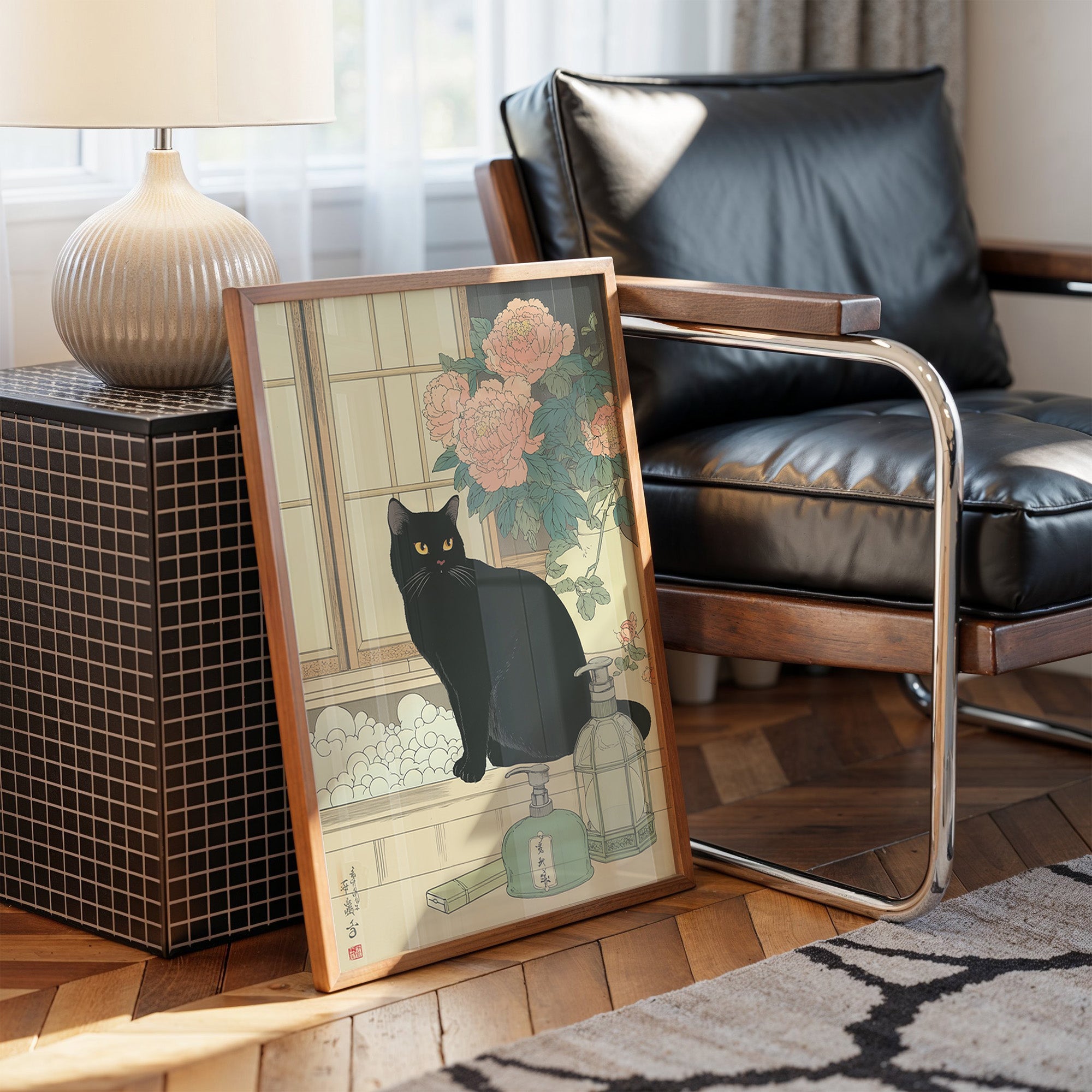 A mysterious black cat sits regally by a window, its golden eyes gleaming against soft morning light. The scene captures a moment of serene domesticity, where vintage glass bottles and blooming pink peonies create an elegant Japanese-inspired composition. The delicate balance of traditional art elements with modern simplicity transforms an everyday corner into a contemplative sanctuary. This piece would bring a sophisticated touch of Asian influence to a reading nook, home office, or any space where quiet contemplation is cherished.