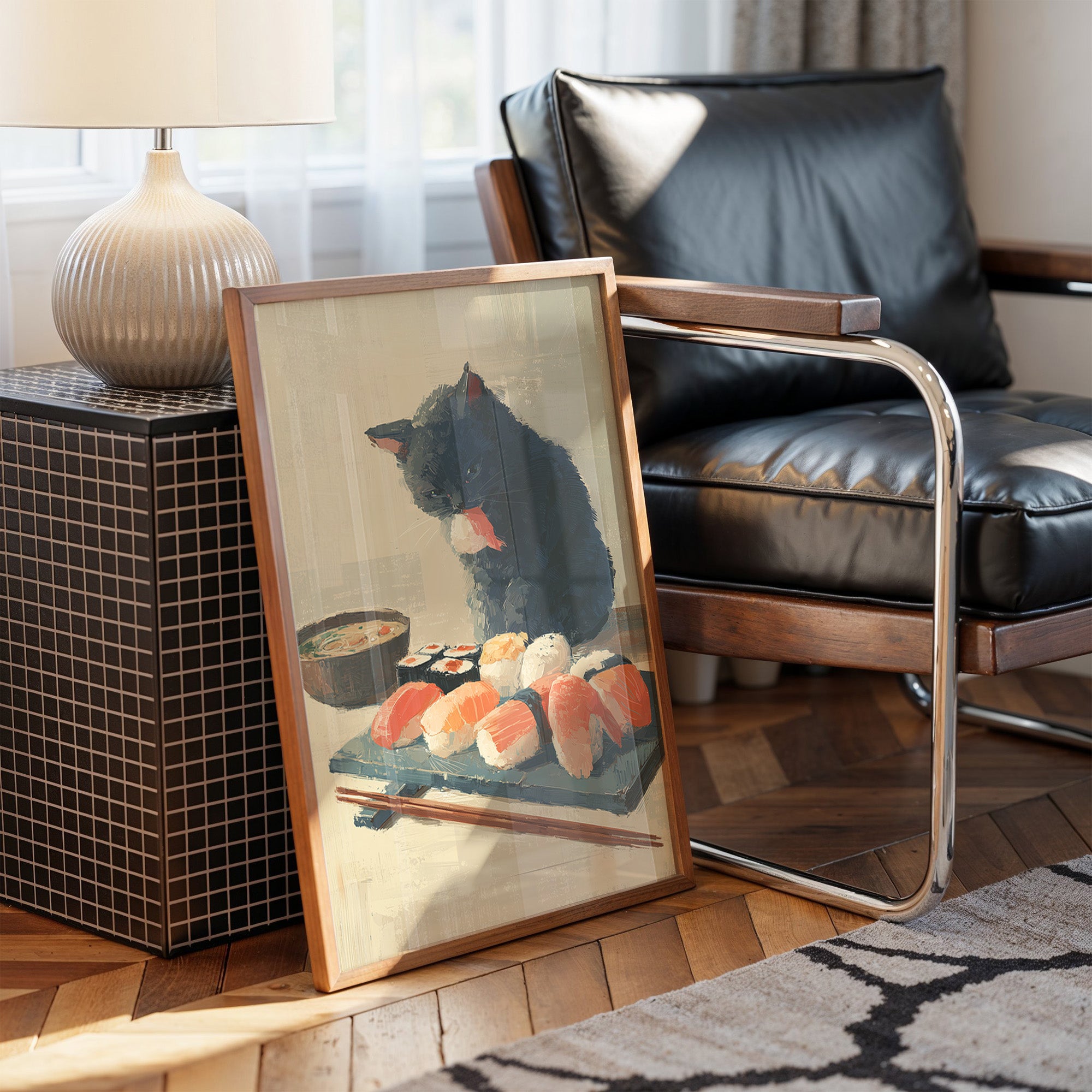 A charming scene unfolds as a curious black cat perches near a pristine arrangement of salmon nigiri, its pink tongue betraying anticipation. The artwork captures a moment of mischievous contemplation, with rich textures in the cat's fur contrasting against the smooth, coral-hued fish and pristine white rice. Warm neutral tones and gentle shadows create an intimate dining moment, while subtle brushstrokes bring personality to both the feline subject and culinary display. This playful piece brings character and sophistication to dining areas, kitchen spaces, or any room seeking a blend of whimsy and culinary artistry.