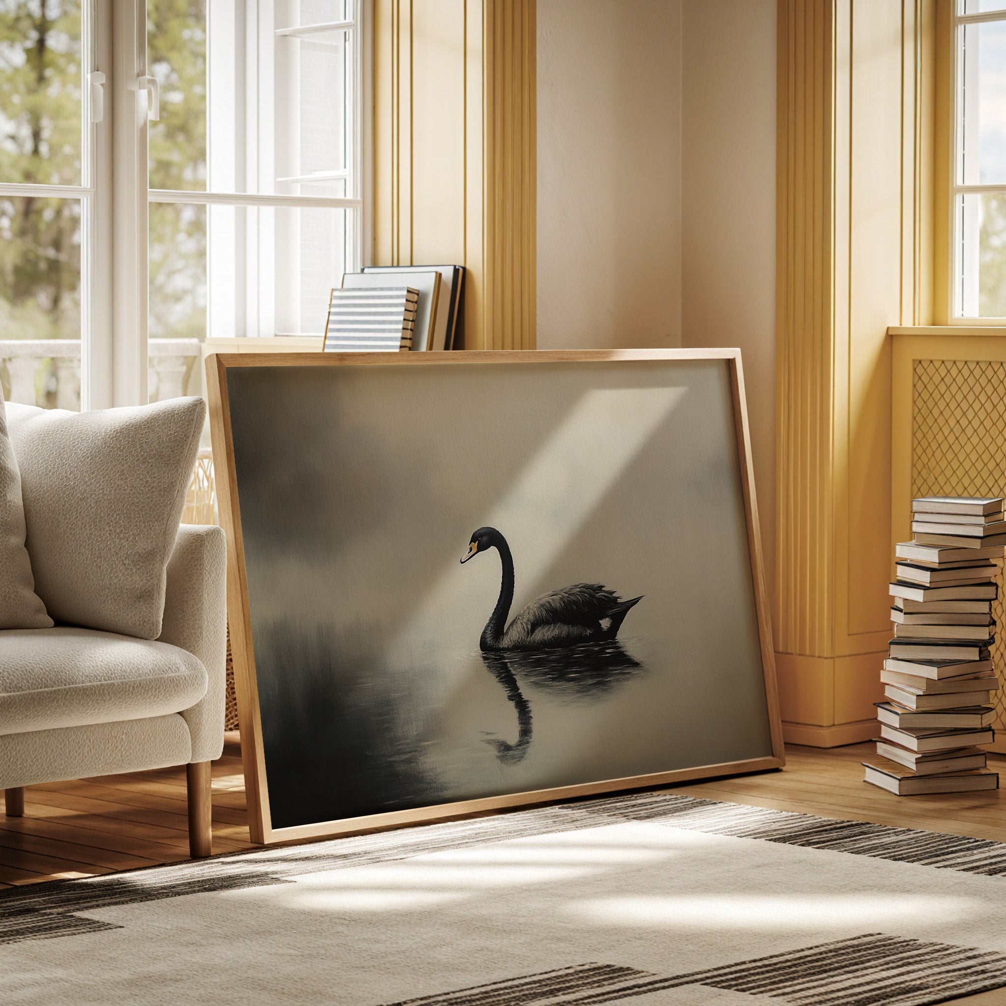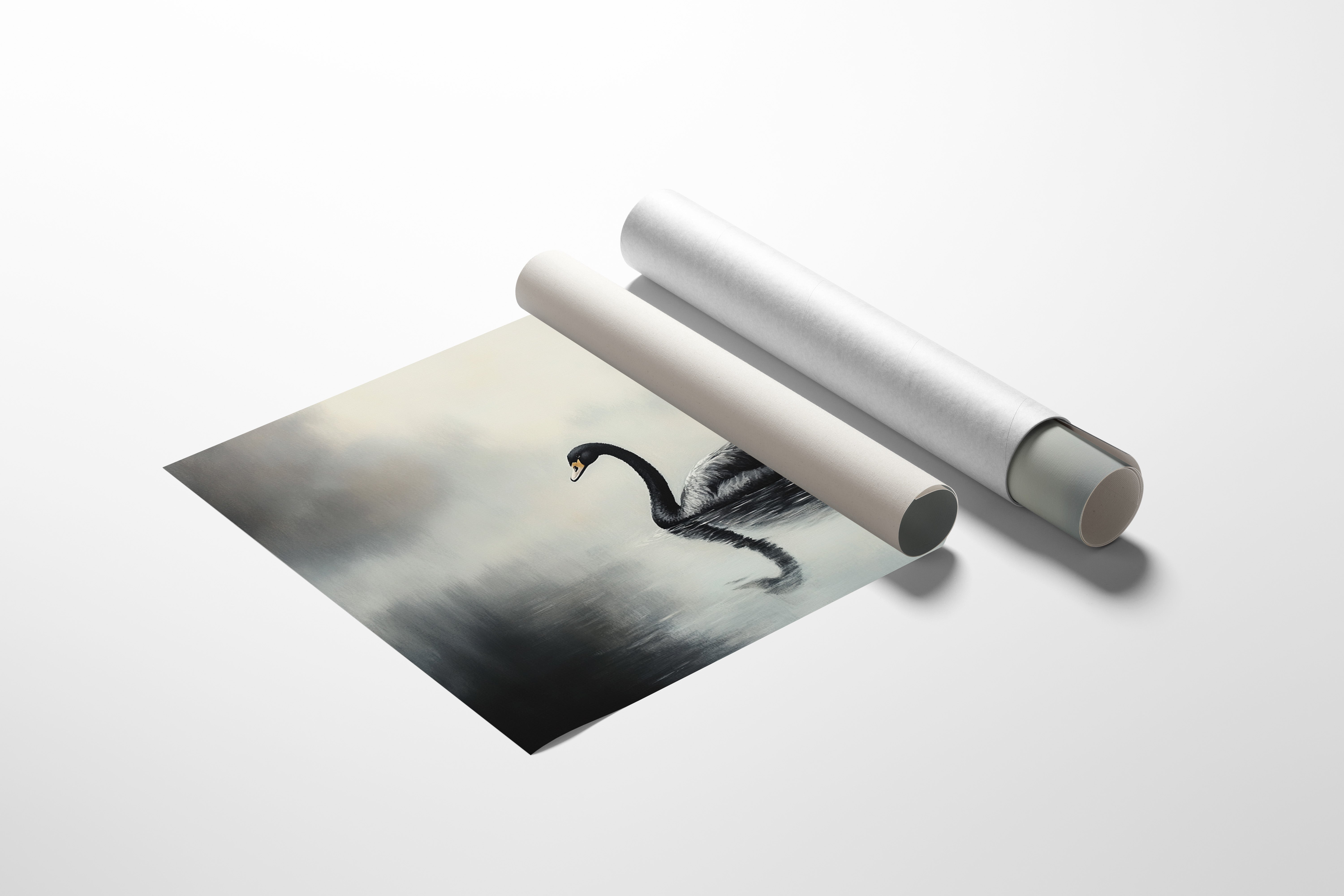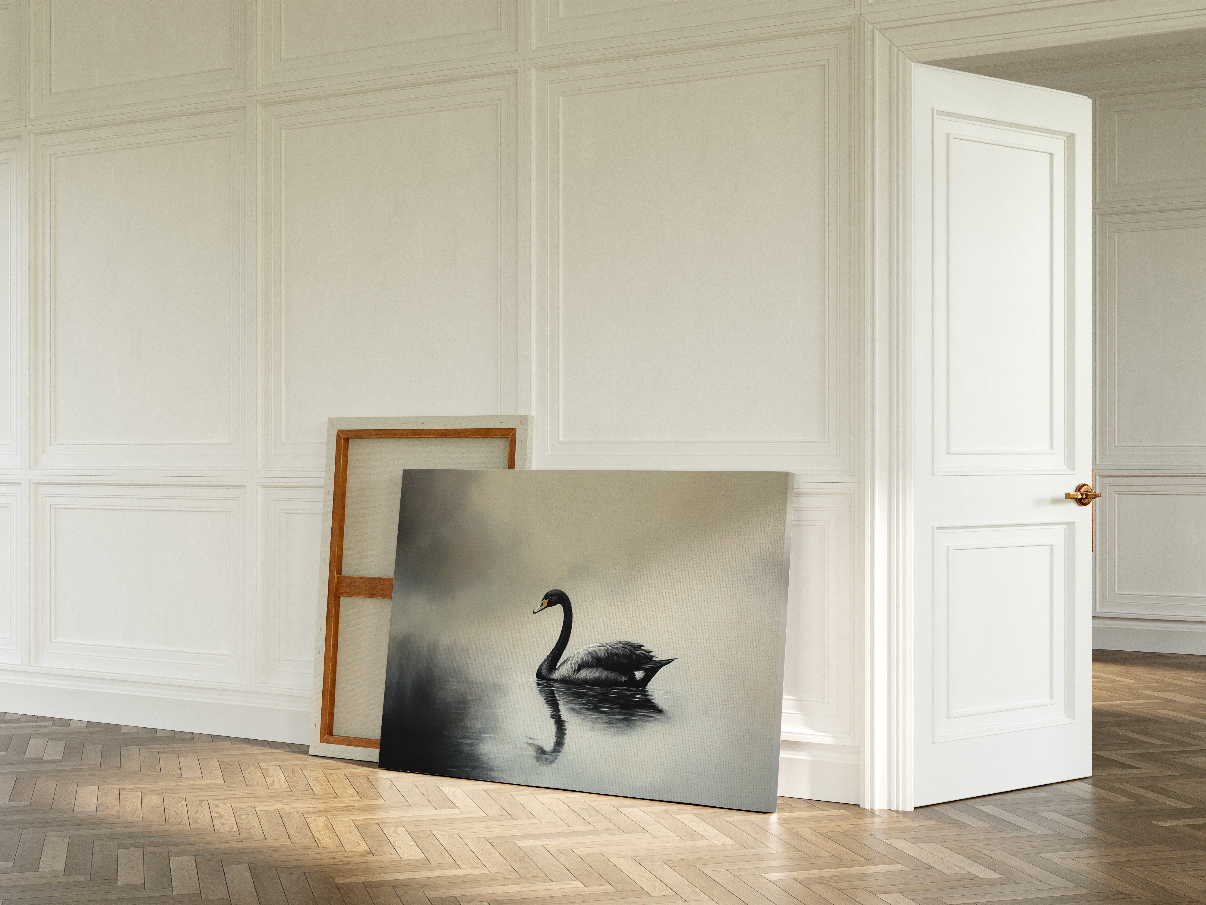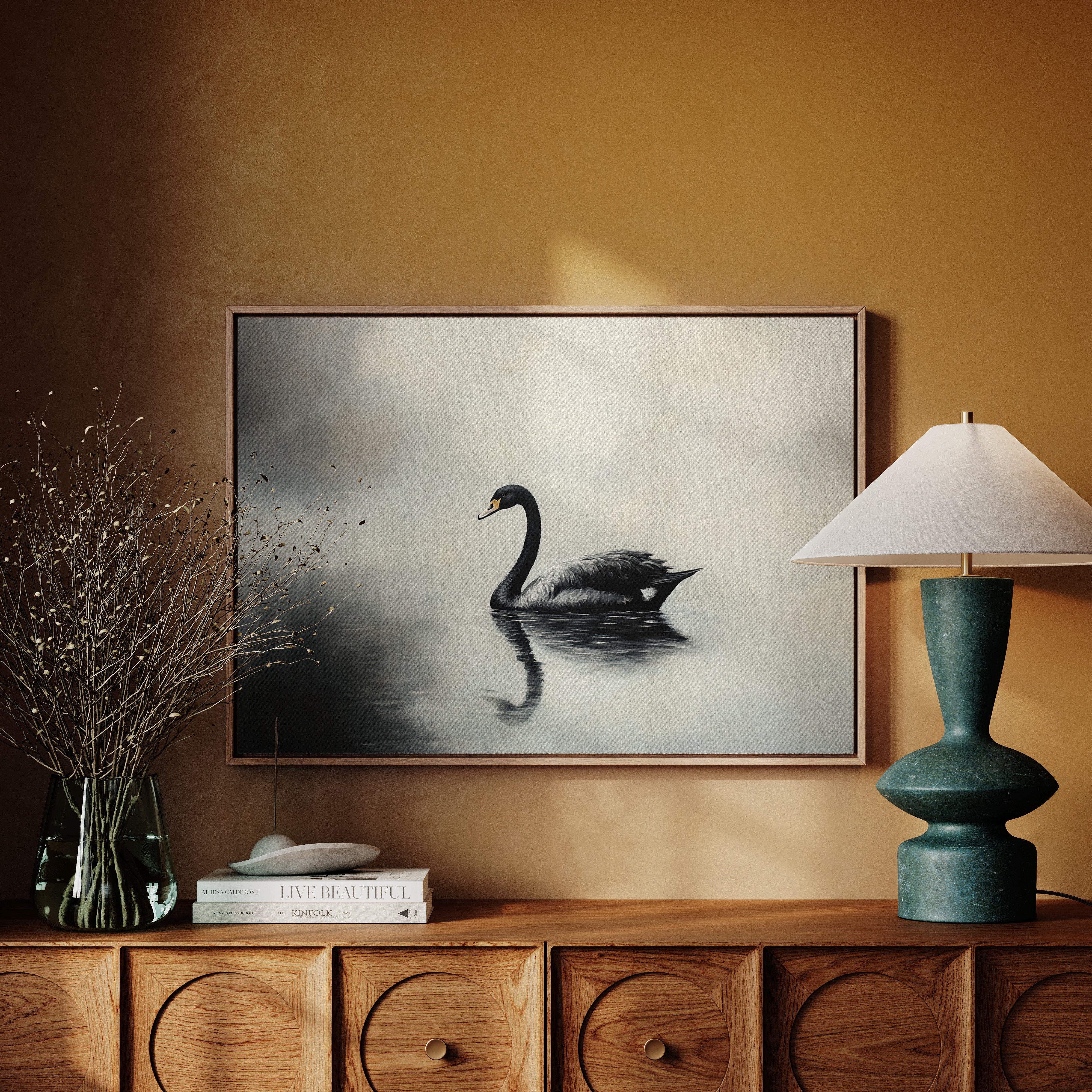A solitary moment captures the quiet grace of a black swan drifting through misty waters. The bird's elegant silhouette creates a perfect mirror image on the glass-like surface, its reflection rippling softly in the silvery light. The monochromatic palette of grays and blacks is punctuated only by the swan's golden beak, while the surrounding fog creates an ethereal atmosphere of peaceful solitude. This piece brings a sense of tranquility and sophisticated drama to any space, ideal for creating a serene focal point in a modern living room or adding understated elegance to a minimalist bedroom.