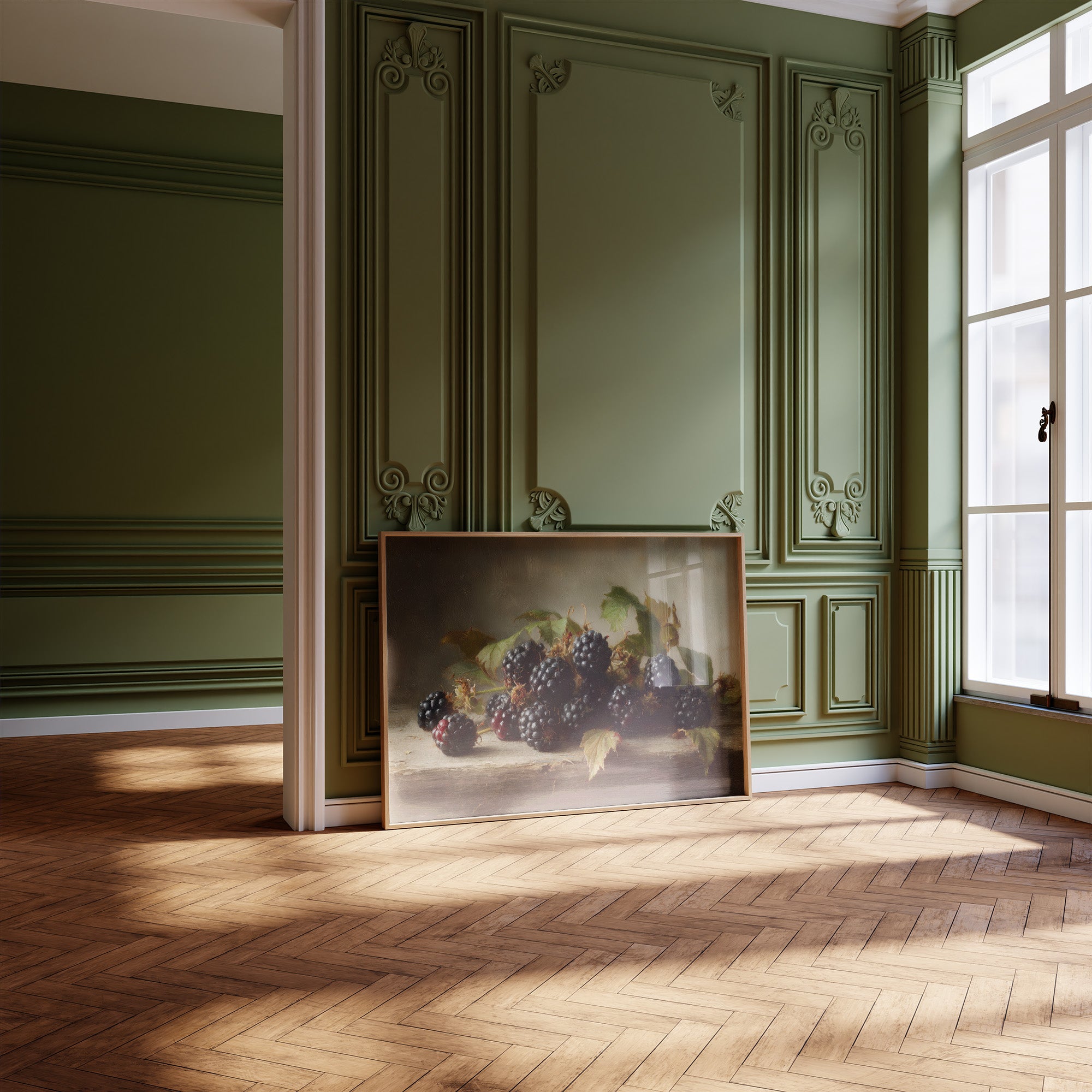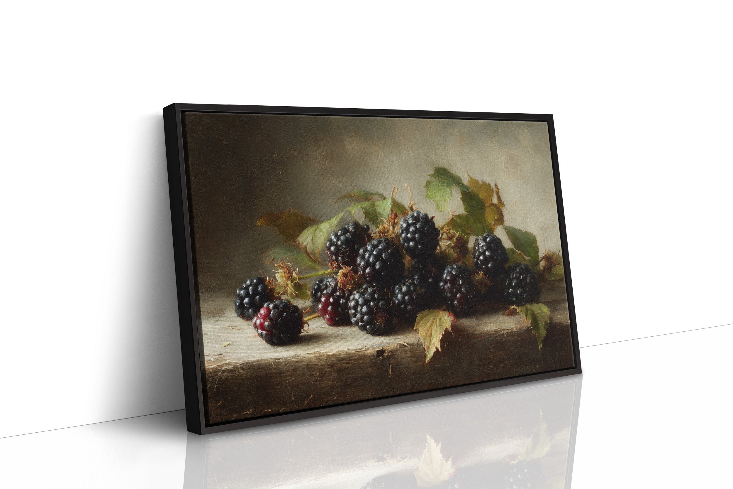 A classical still life painting rests in quiet conversation with rows of well-loved books. Rich, plump blackberries glisten against verdant leaves in the framed artwork, creating a moment where past and present artistic traditions merge. The warm wooden shelves filled with leather-bound volumes and contemporary titles form a perfect backdrop, enhancing the painting's timeless quality while small potted plants add living texture to this intellectual sanctuary. This piece brings sophisticated charm to a home library, reading nook, or any space where literary and artistic appreciation naturally converge.