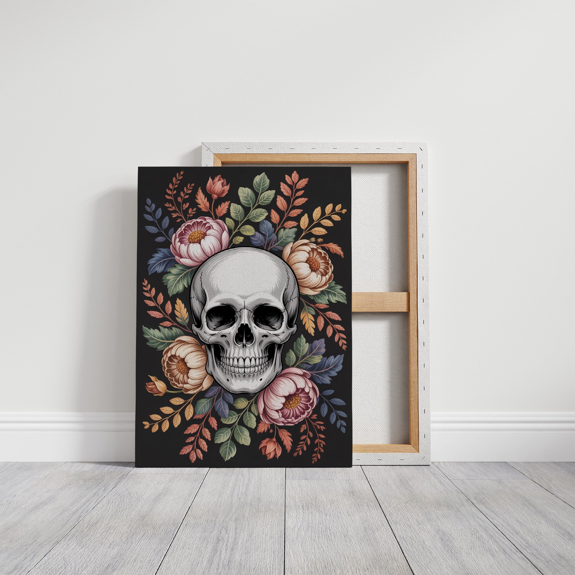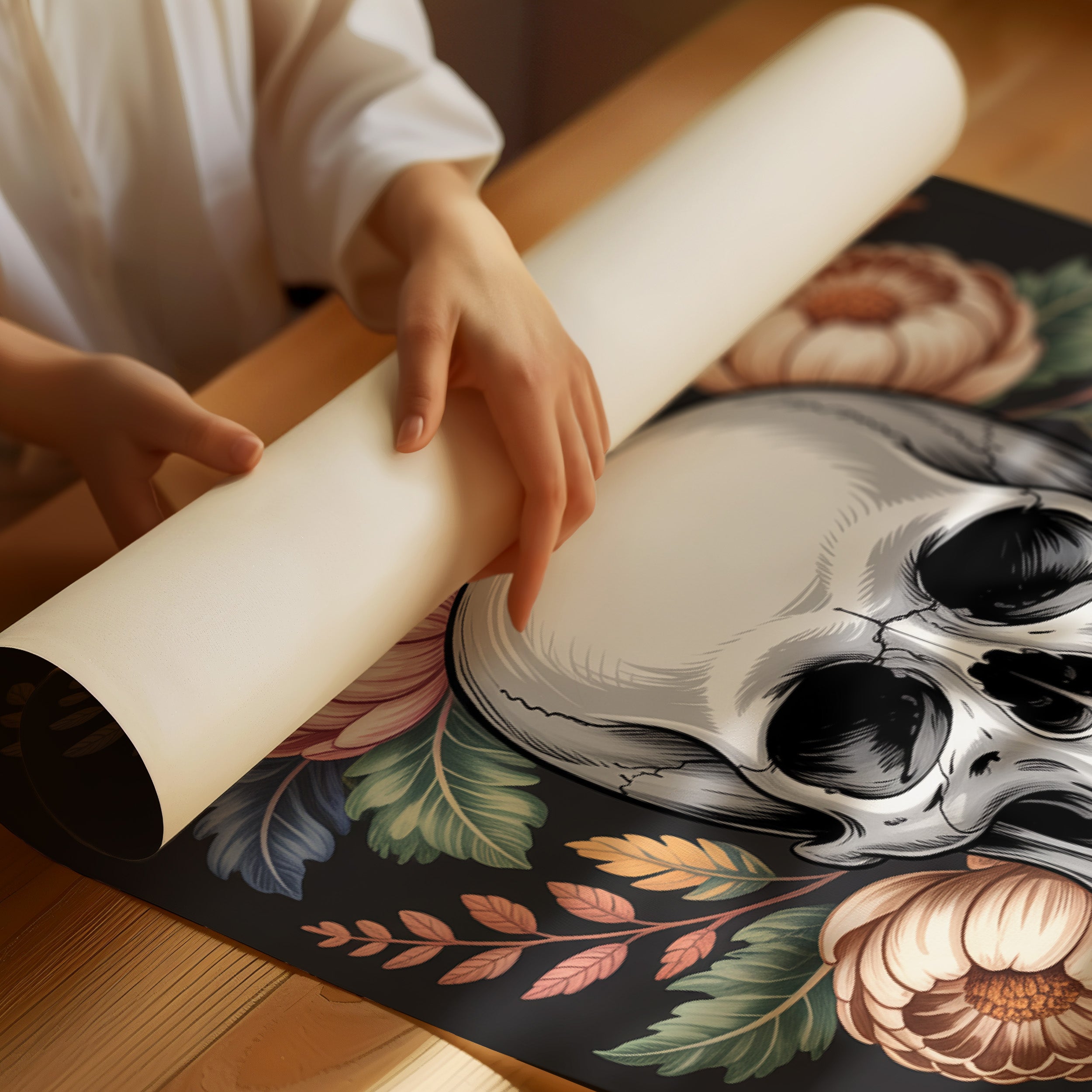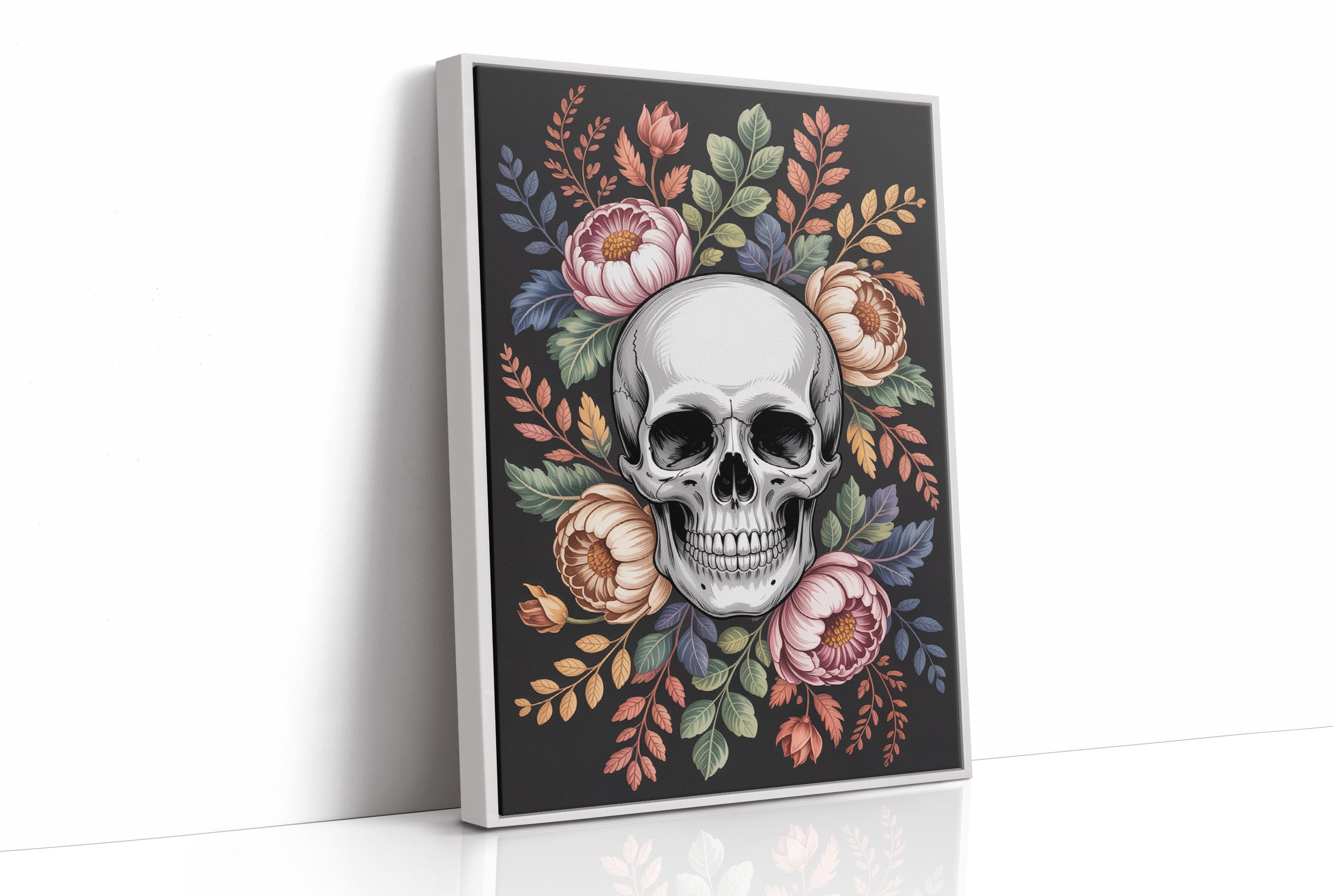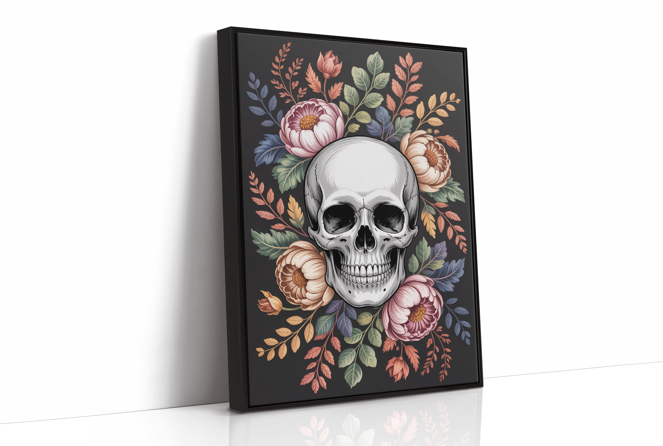 A striking contrast between life and mortality unfolds against a deep black backdrop. Delicate peonies in soft pinks and creams cradle a meticulously detailed skull, their petals unfurling with quiet determination. Colorful foliage in muted blues, greens, and corals weaves throughout the composition, creating a lush botanical frame that softens the stark white of bone. This modern vanitas speaks to the beautiful paradox of existencewhere fragility meets strength, and endings nurture beginnings. Perfect for a statement wall in a home office, creative studio, or any space where contemplative depth and artistic boldness are welcomed.