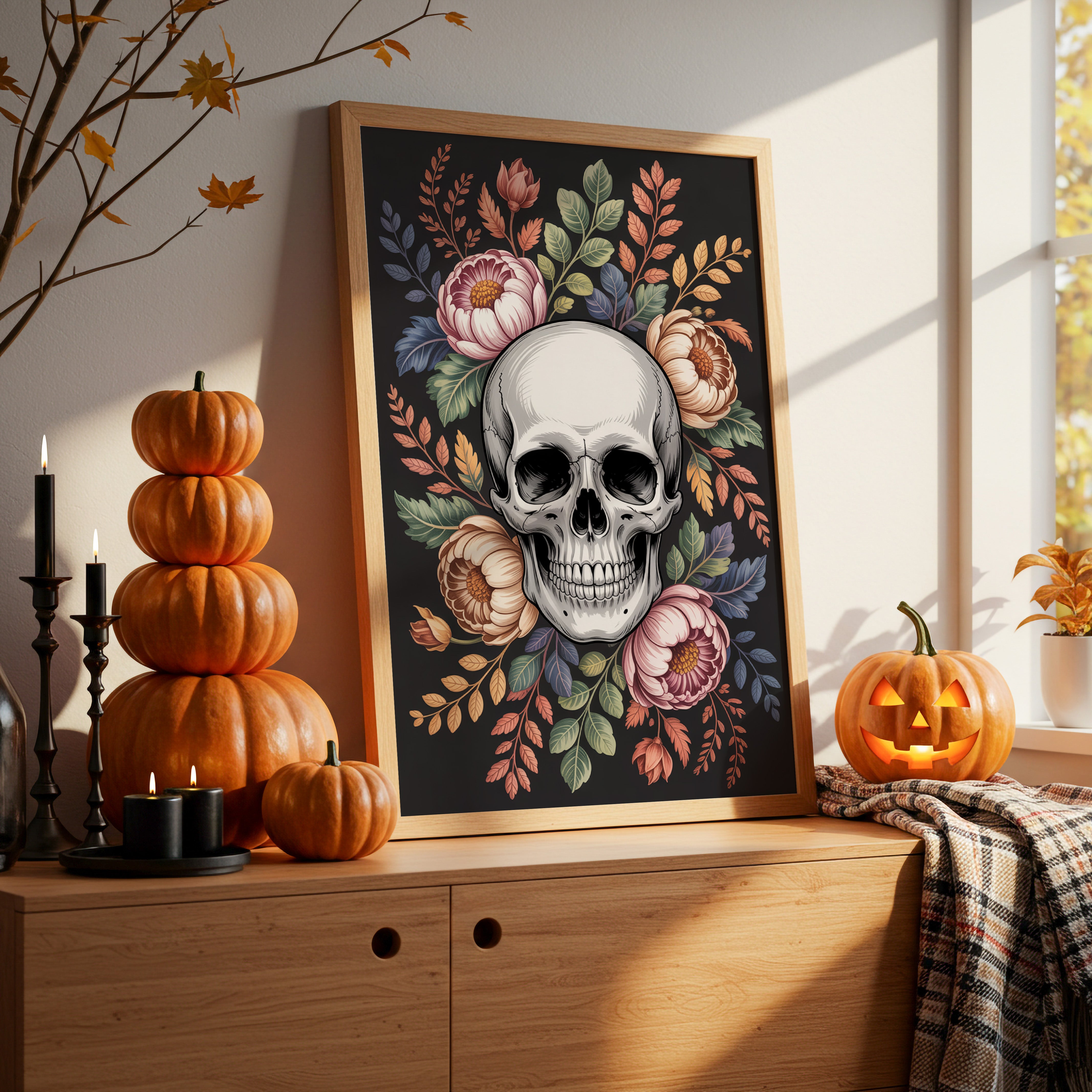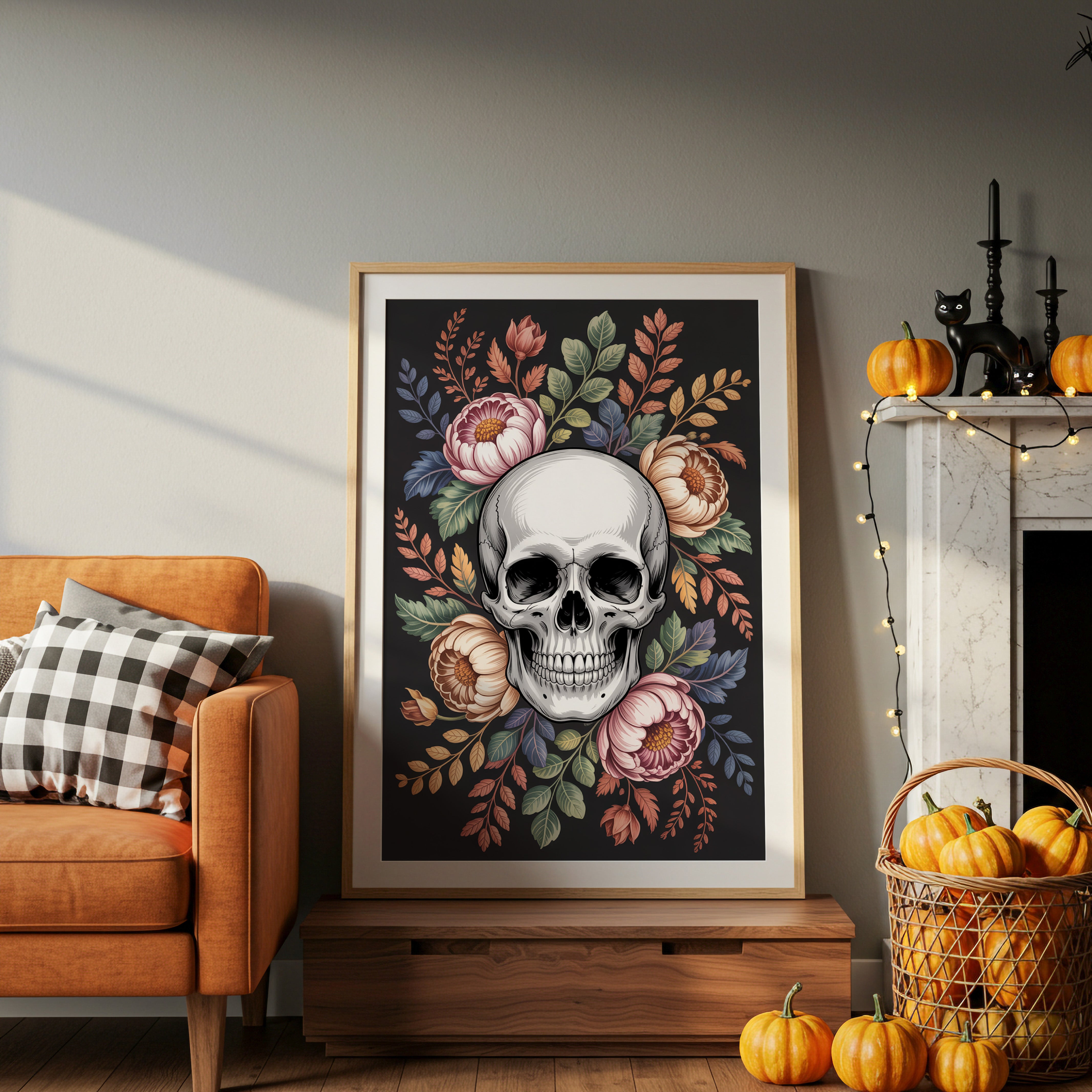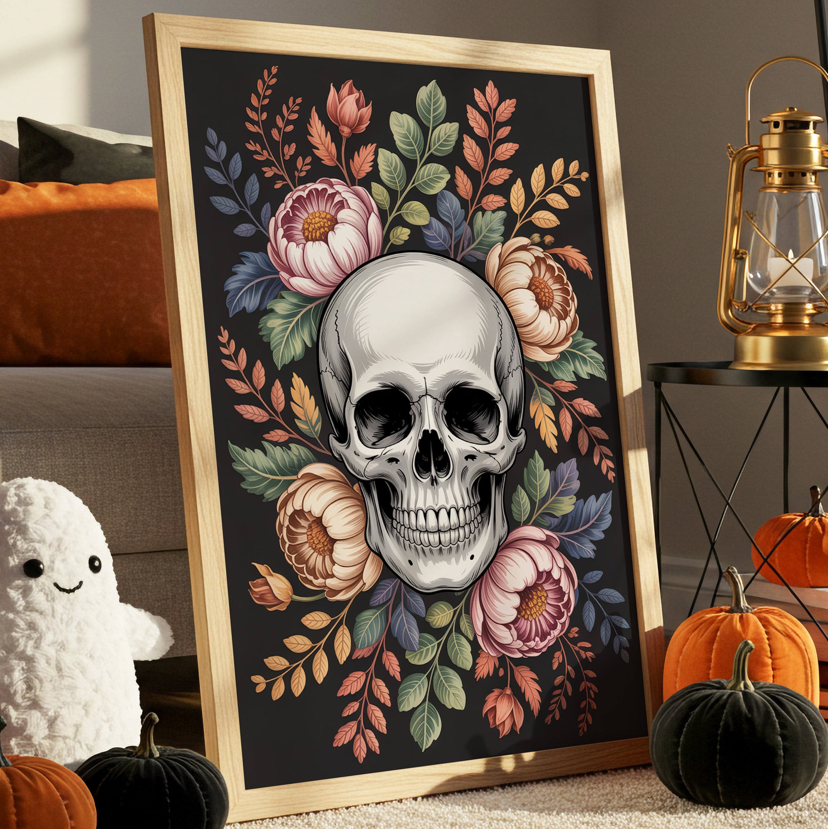 A striking contrast between life and mortality unfolds against a deep black backdrop. Delicate peonies in soft pinks and creams cradle a meticulously detailed skull, their petals unfurling with quiet determination. Colorful foliage in muted blues, greens, and corals weaves throughout the composition, creating a lush botanical frame that softens the stark white of bone. This modern vanitas speaks to the beautiful paradox of existencewhere fragility meets strength, and endings nurture beginnings. Perfect for a statement wall in a home office, creative studio, or any space where contemplative depth and artistic boldness are welcomed.