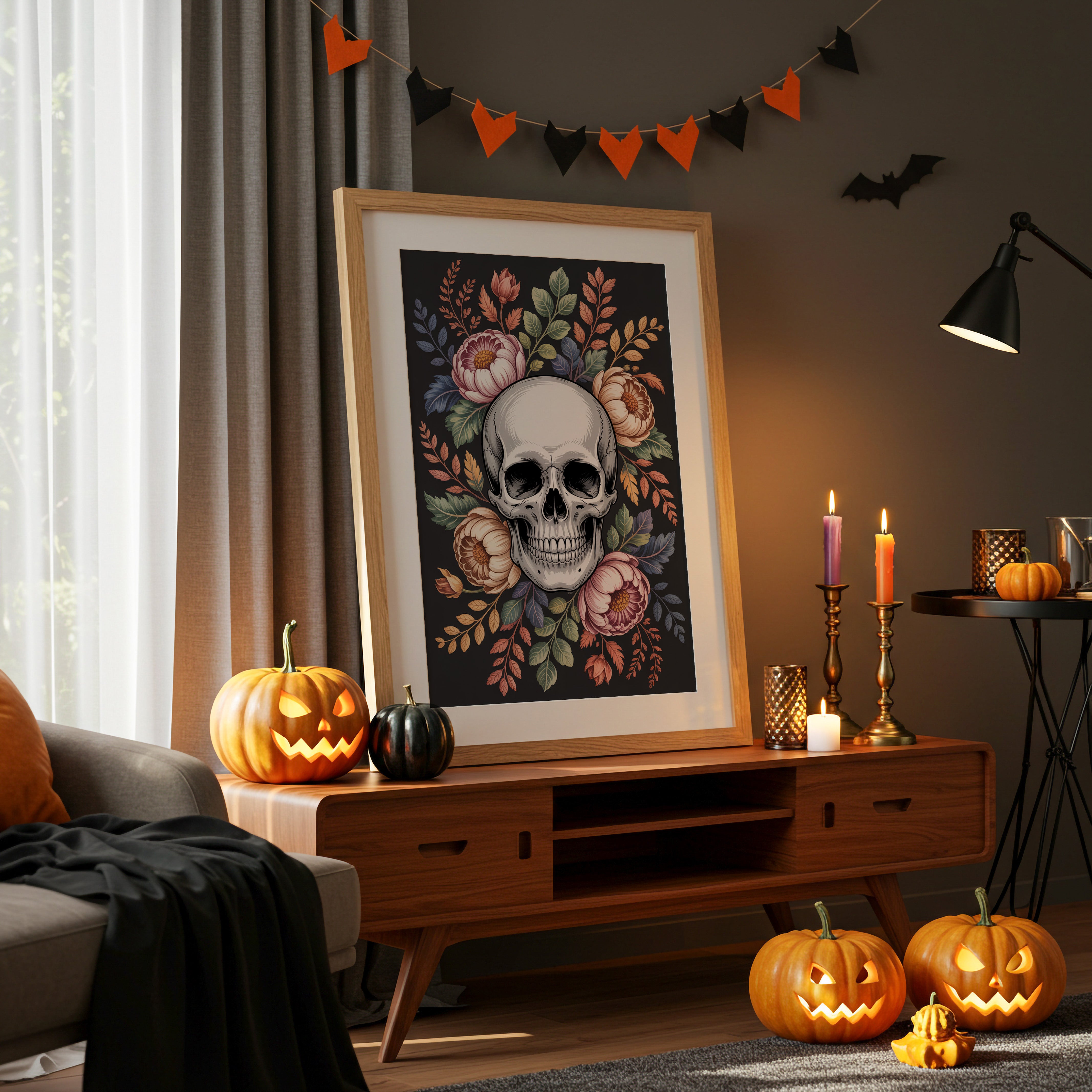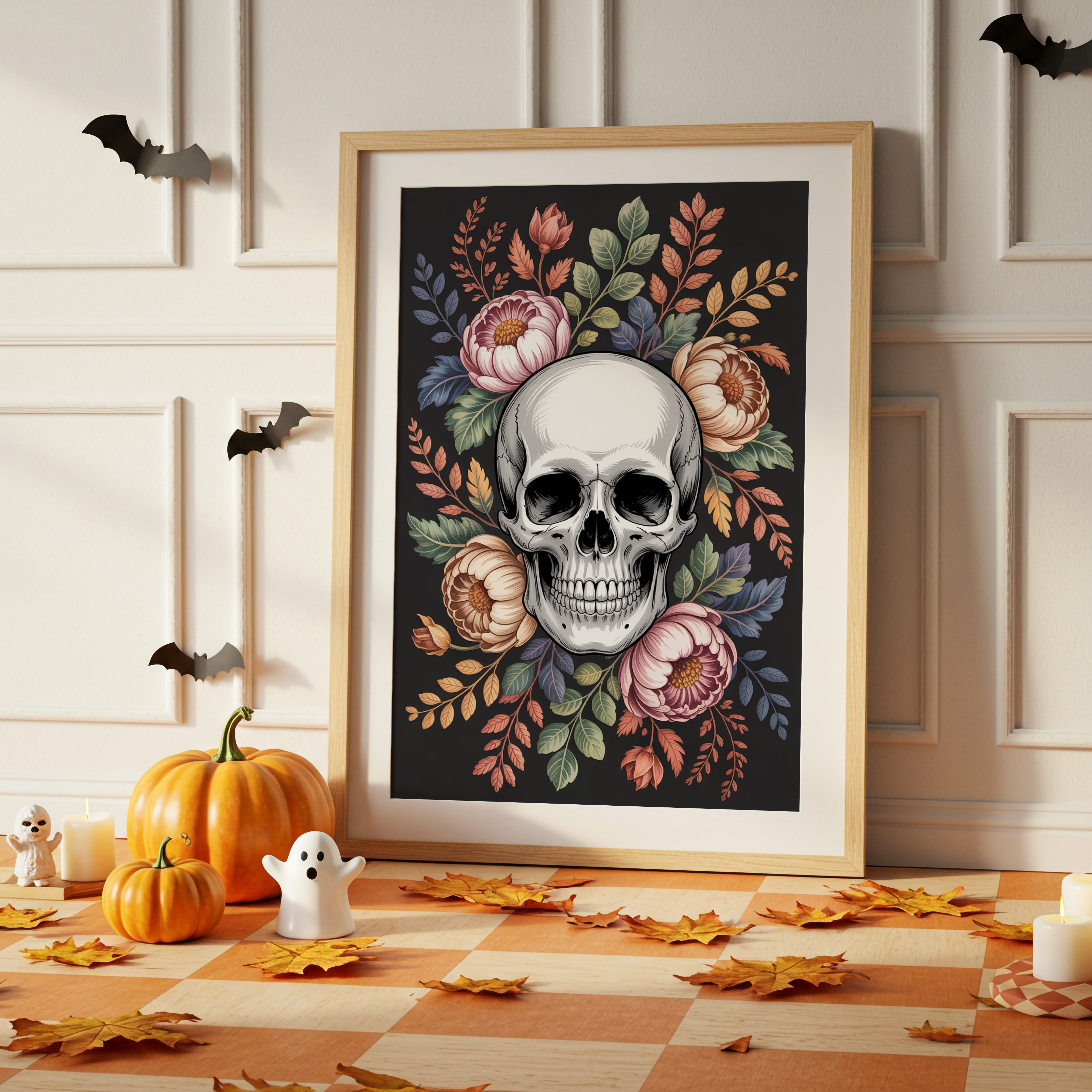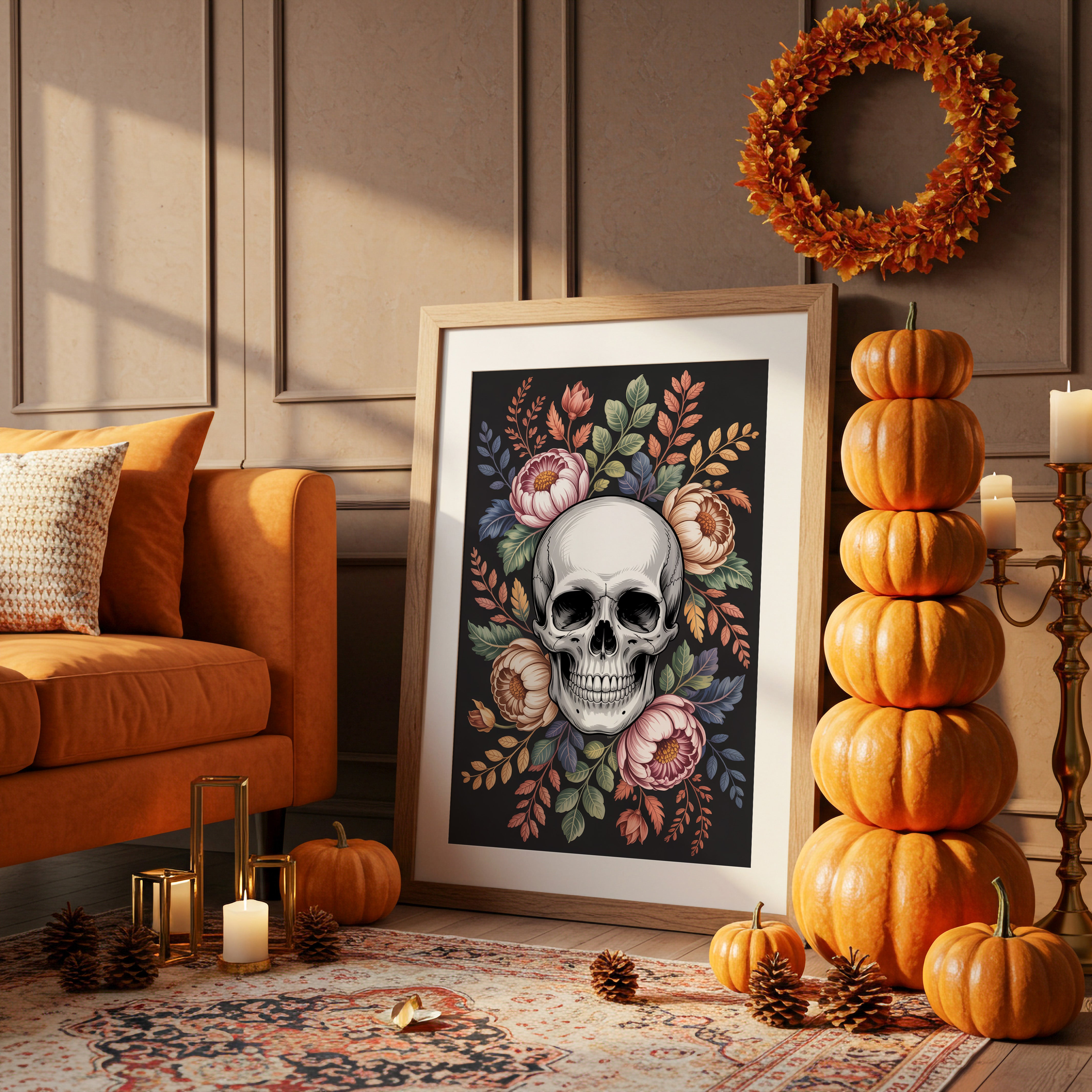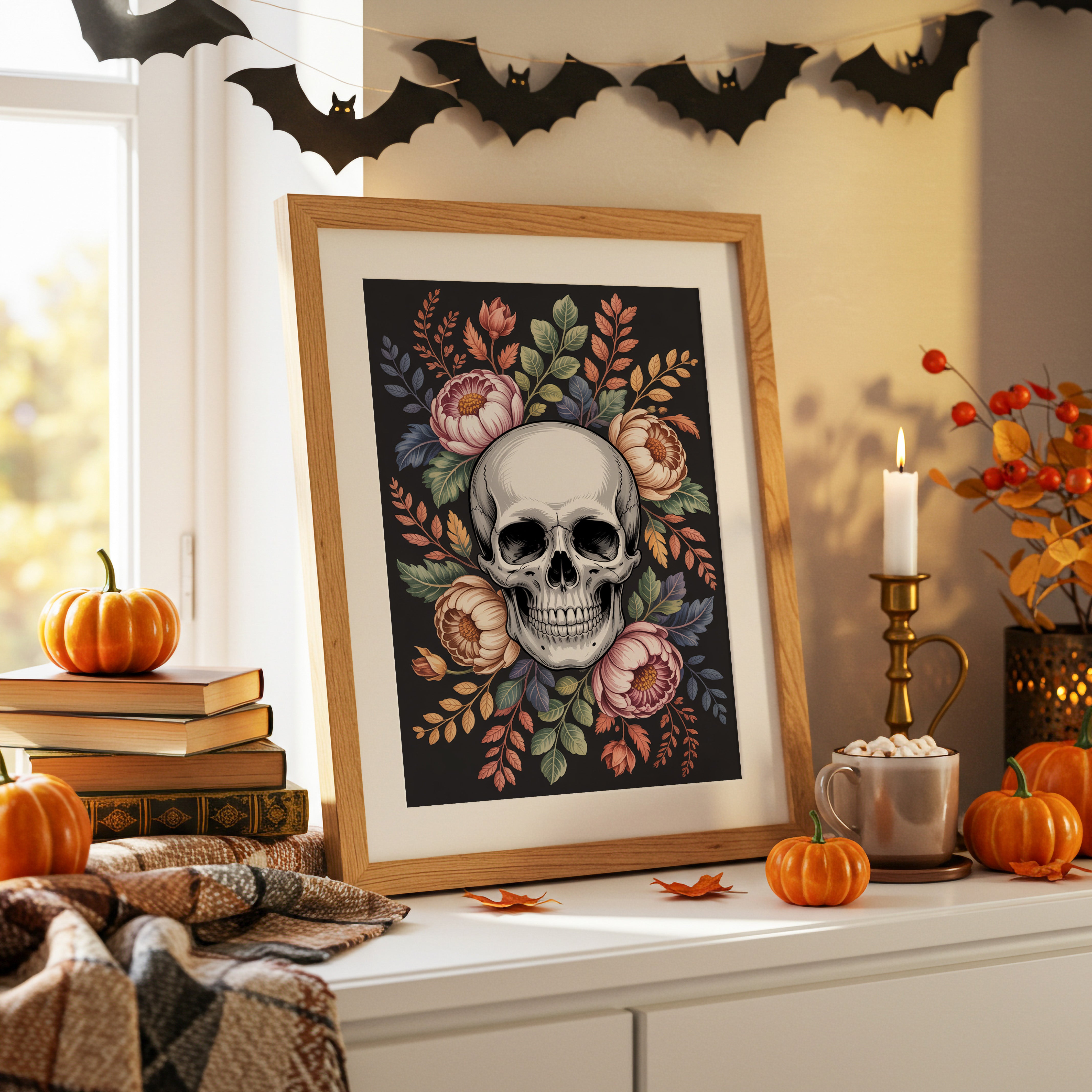 A striking contrast between life and mortality unfolds against a deep black backdrop. Delicate peonies in soft pinks and creams cradle a meticulously detailed skull, their petals unfurling with quiet determination. Colorful foliage in muted blues, greens, and corals weaves throughout the composition, creating a lush botanical frame that softens the stark white of bone. This modern vanitas speaks to the beautiful paradox of existencewhere fragility meets strength, and endings nurture beginnings. Perfect for a statement wall in a home office, creative studio, or any space where contemplative depth and artistic boldness are welcomed.