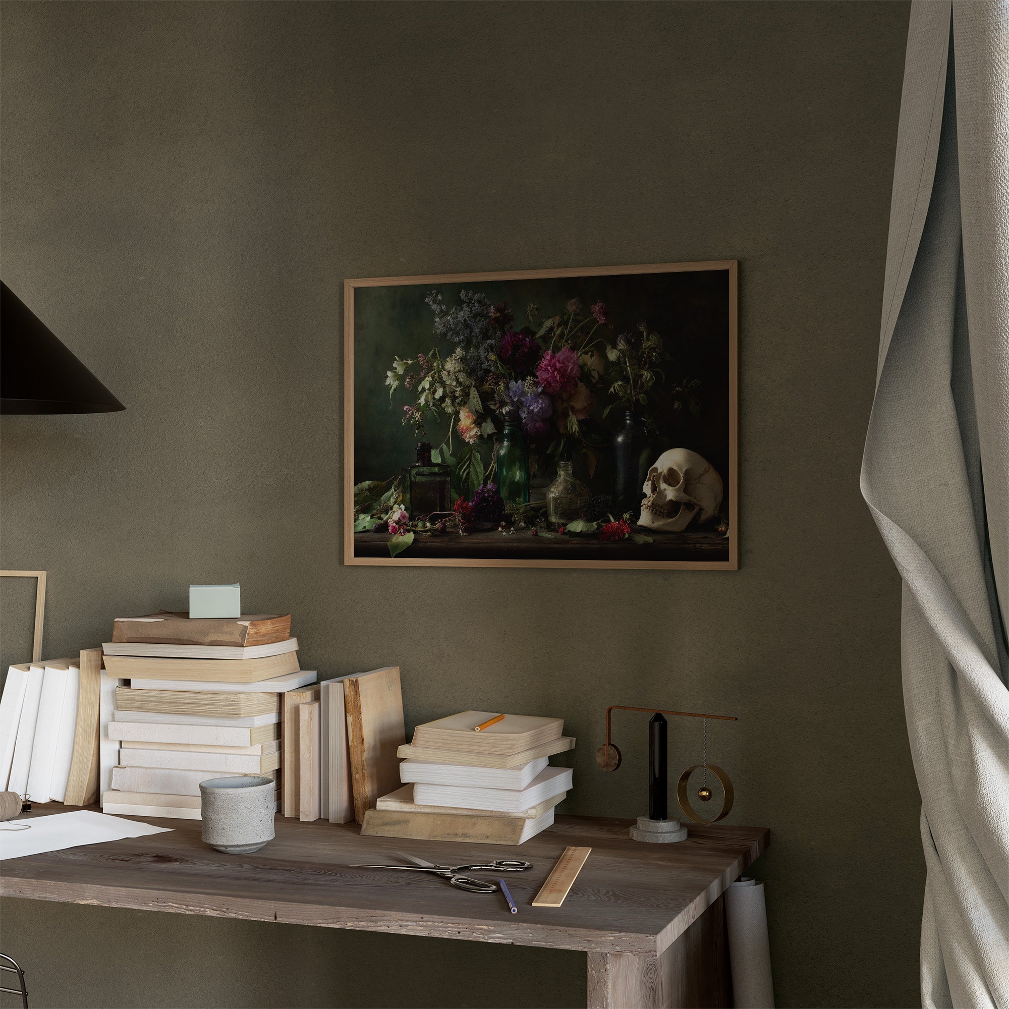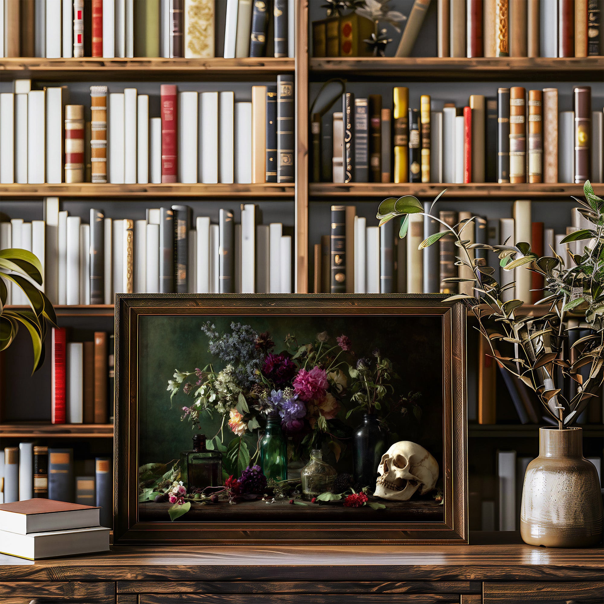 A richly detailed still life painting rests against towering bookshelves, creating an intimate dialogue between knowledge and mortality. Vibrant peonies and delicate wildflowers burst from dark glass bottles, their petals catching light against a moody emerald background, while a contemplative skull sits in quiet contrast to the living blooms. This contemporary vanitas bridges centuries of artistic tradition, marrying the lushness of Dutch masters with modern sensibility.