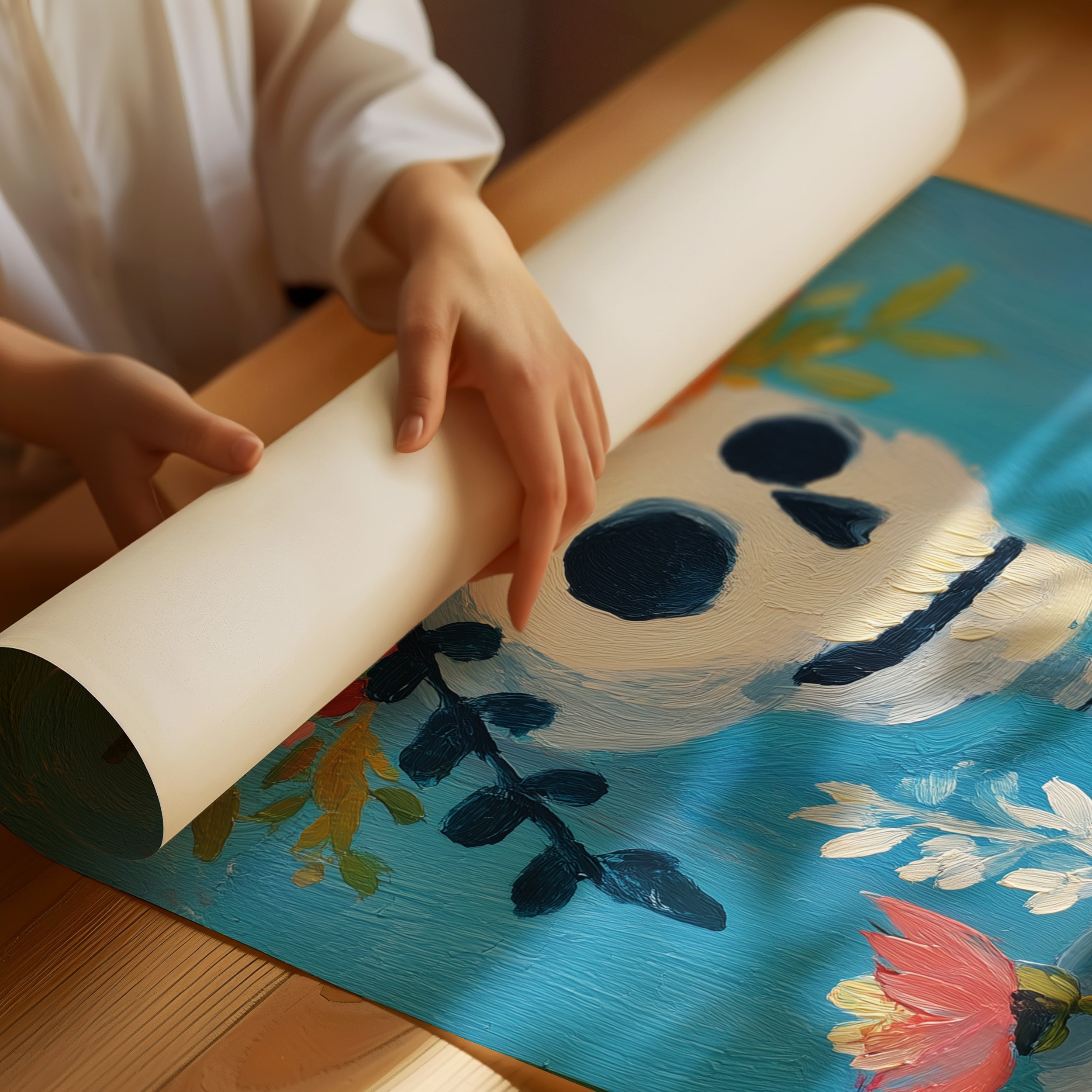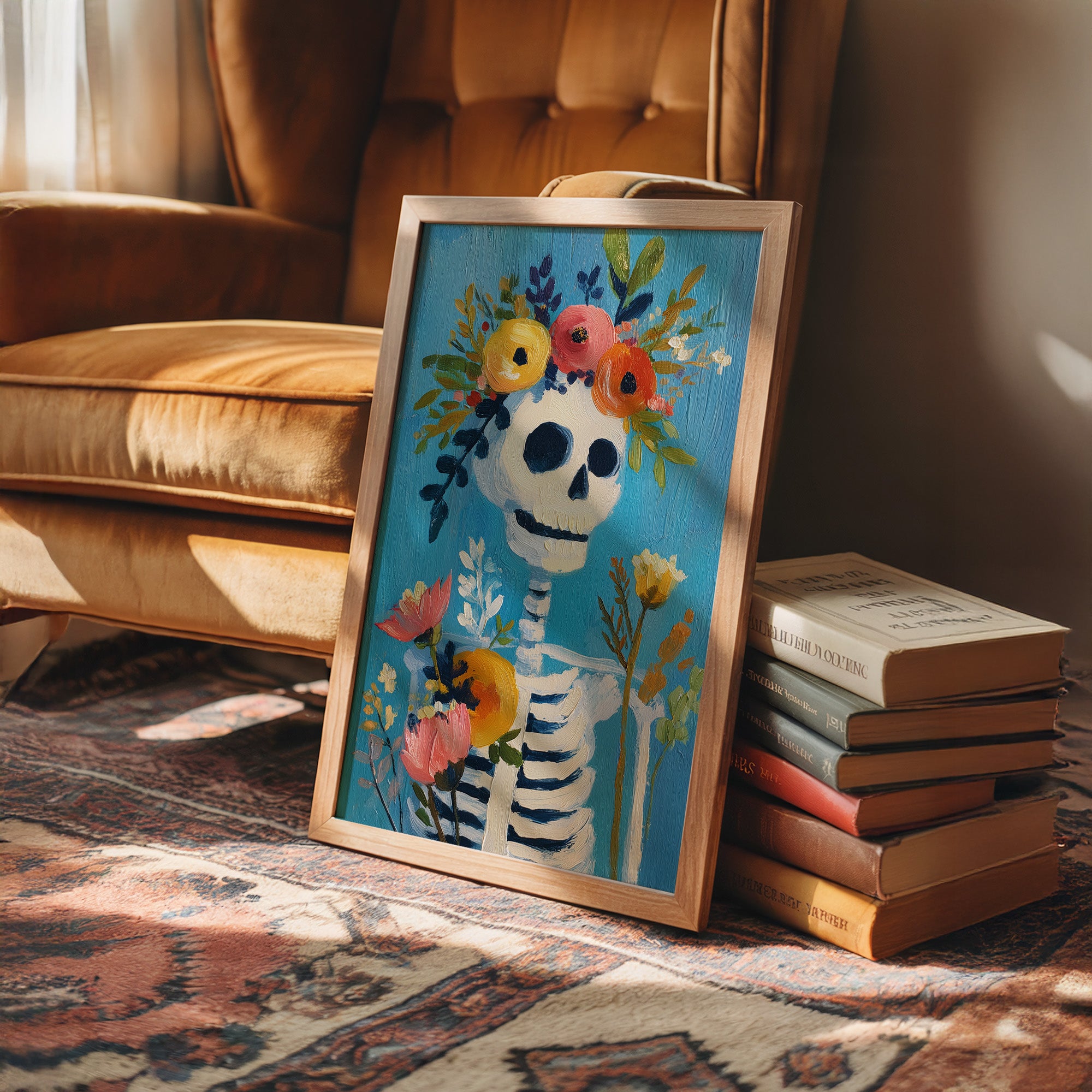 A vibrant celebration of life and death intertwined, where coral pinks and golden yellows burst against a serene turquoise backdrop. The skeleton adorned with a crown of wildflowers stands as a poetic reminder that beauty flourishes even in mortality, with painterly strokes creating texture and depth throughout the composition. This striking piece brings a bold yet thoughtful statement to moody dining rooms, creative studios, or as an unexpected focal point in contemporary living spaces.