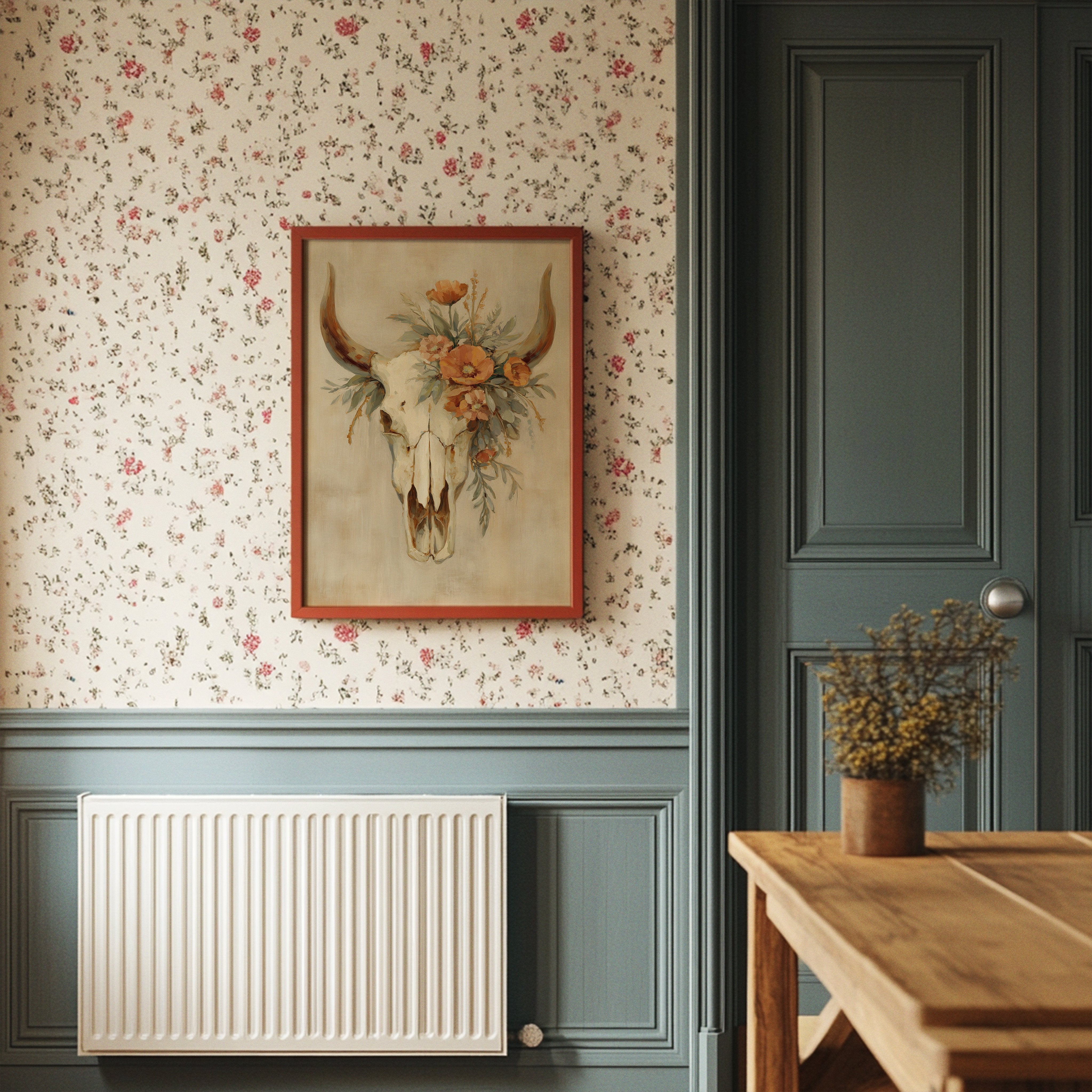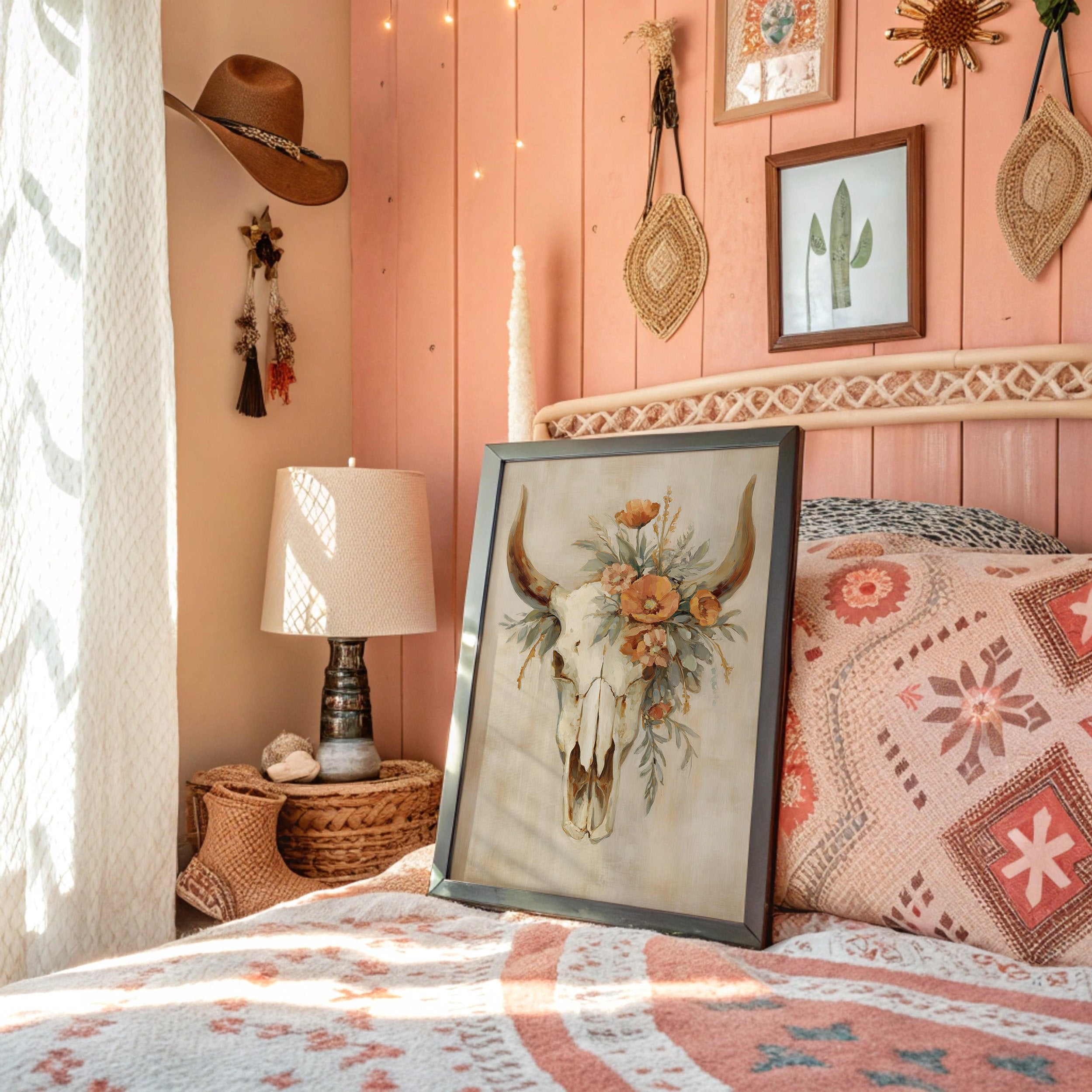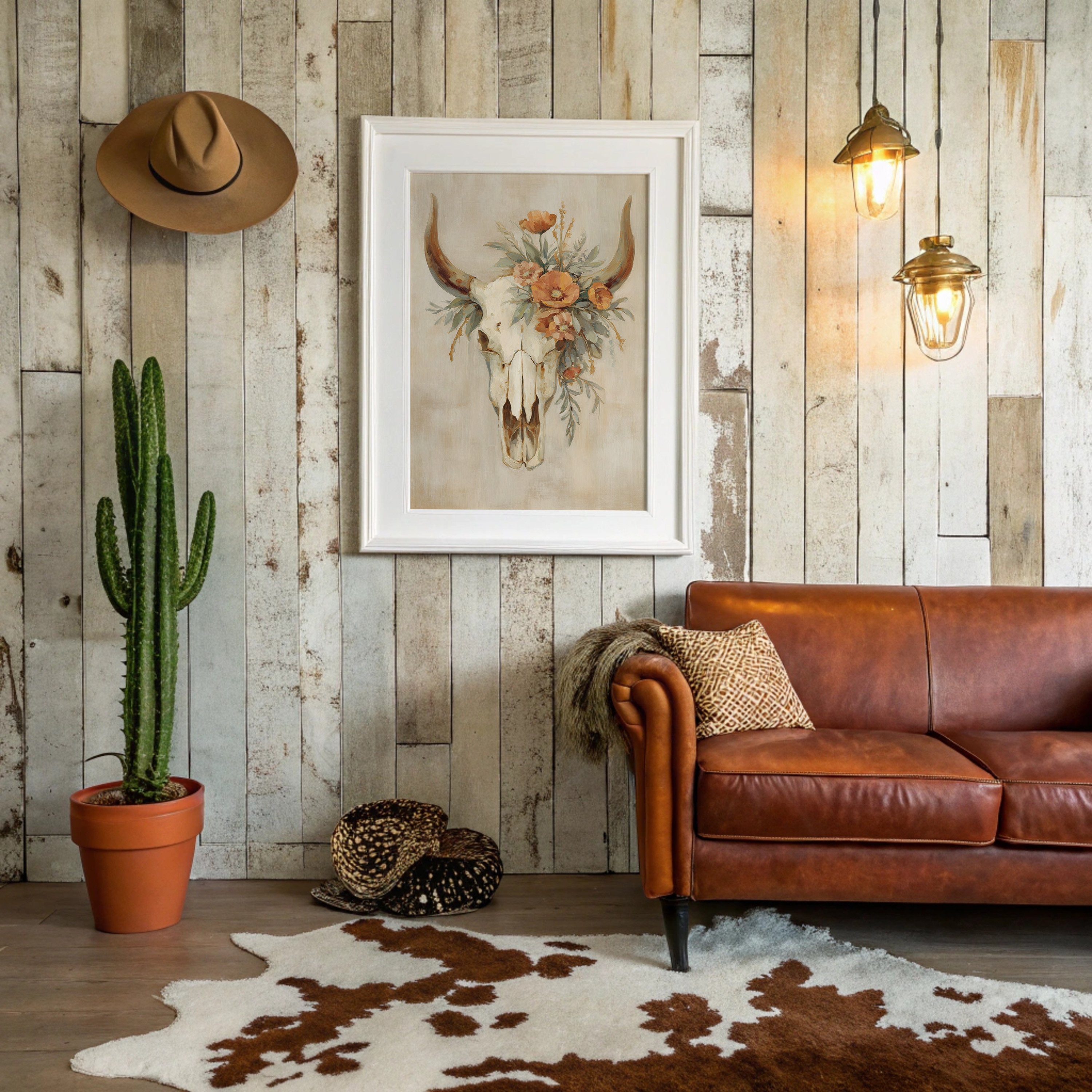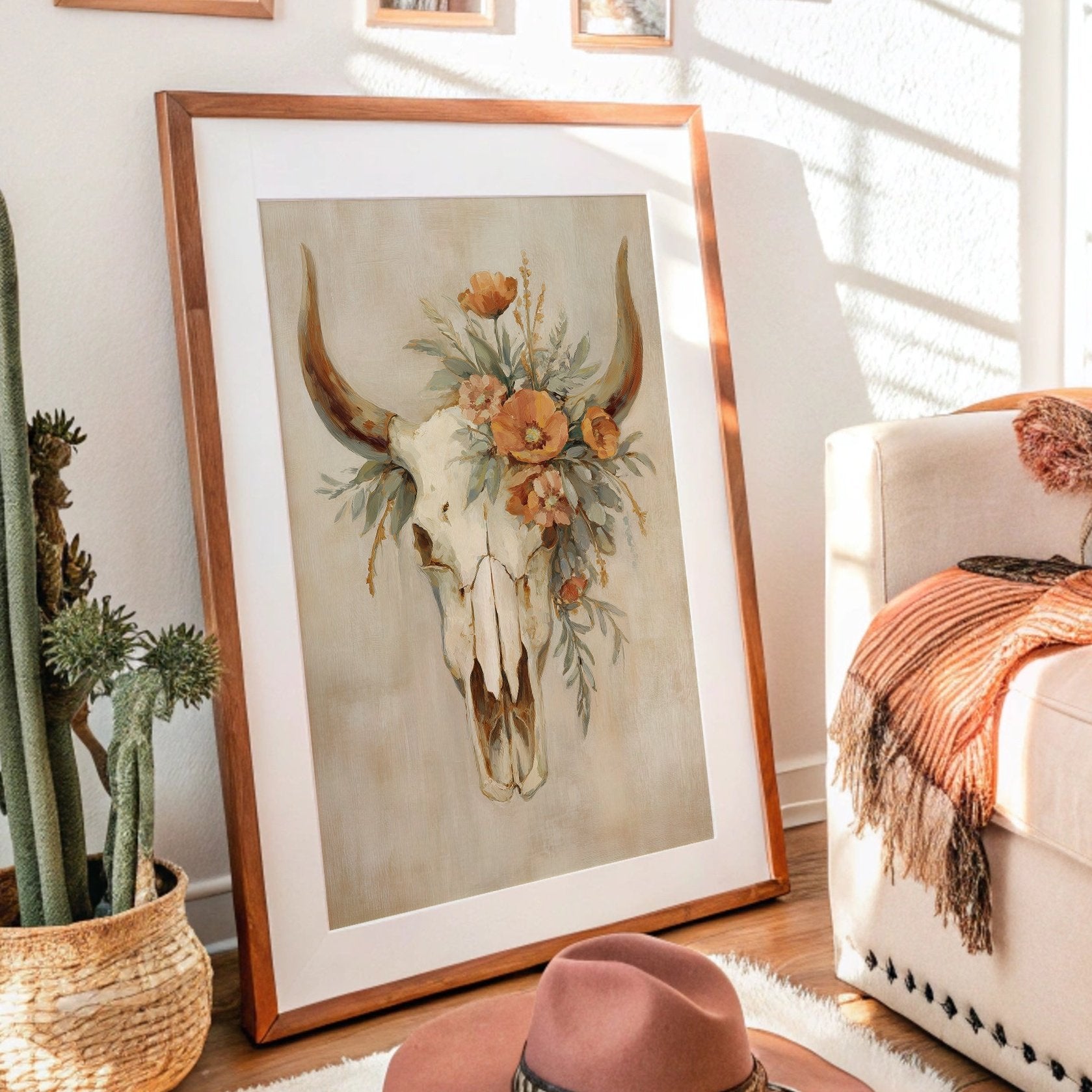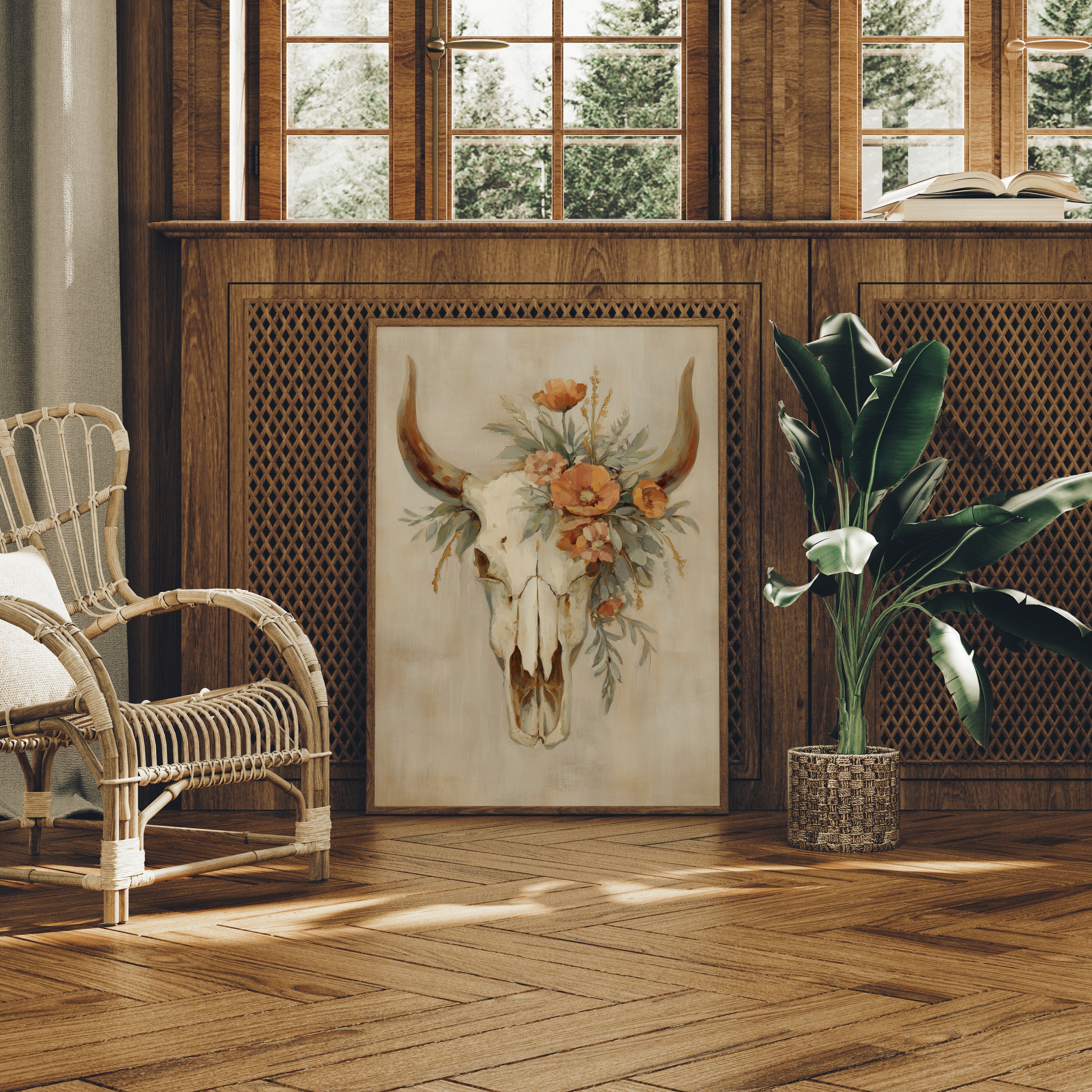 Delicate coral poppies crown a sun-bleached skull, where death and life intertwine in quiet harmony. The watercolor softness of the floral arrangement contrasts with the stark permanence of bone, creating a visual poetry against the neutral backdrop. This rustic-meets-refined piece anchors a southwestern-inspired living space, complete with reclaimed wood walls and warm leather furnishings.