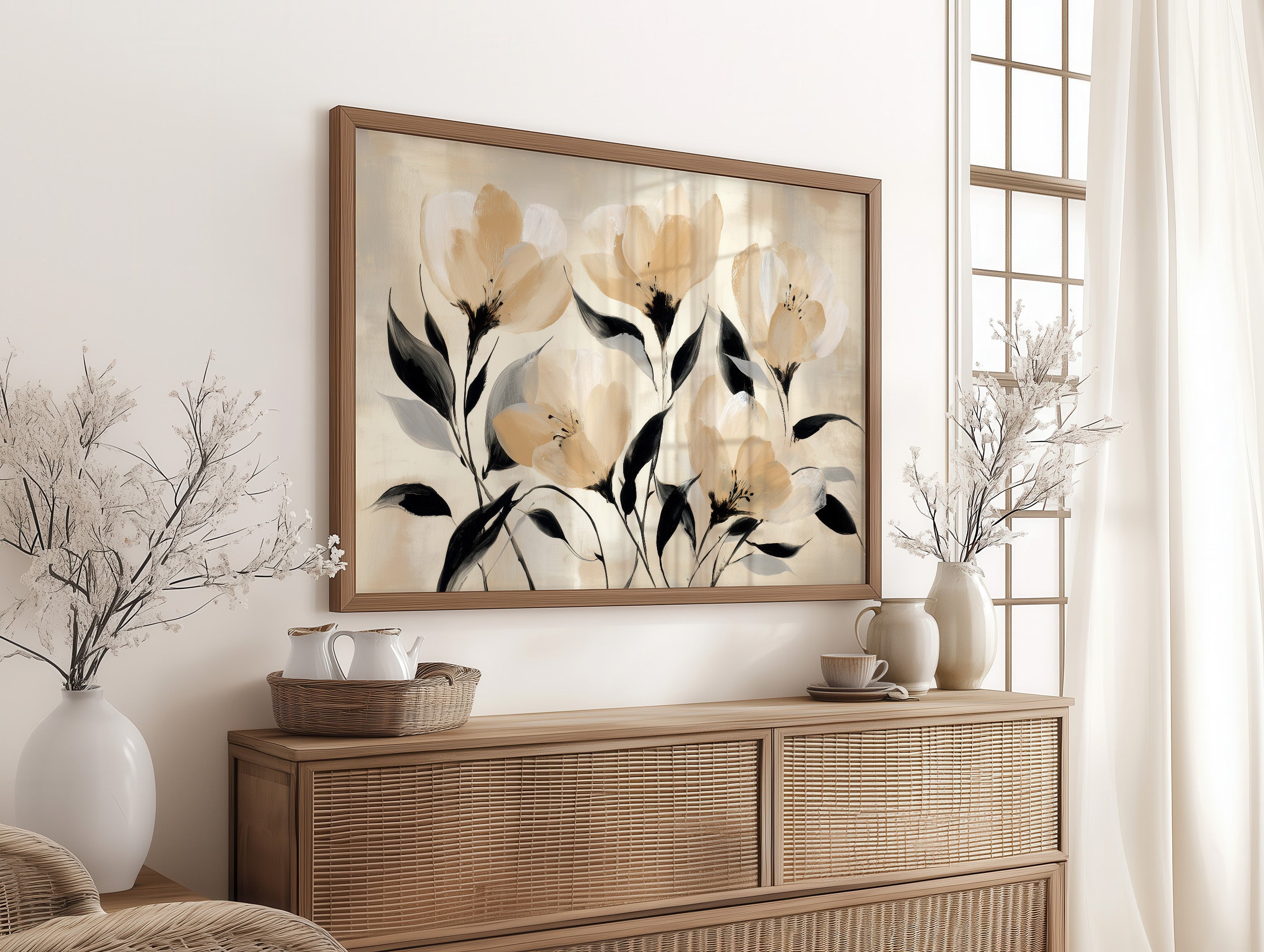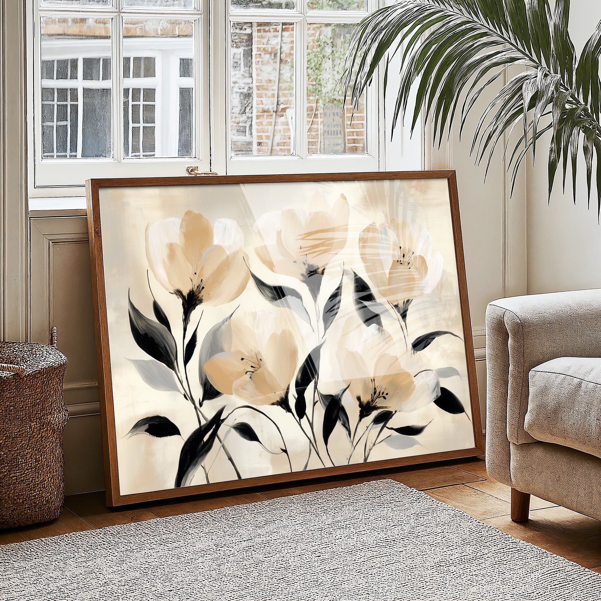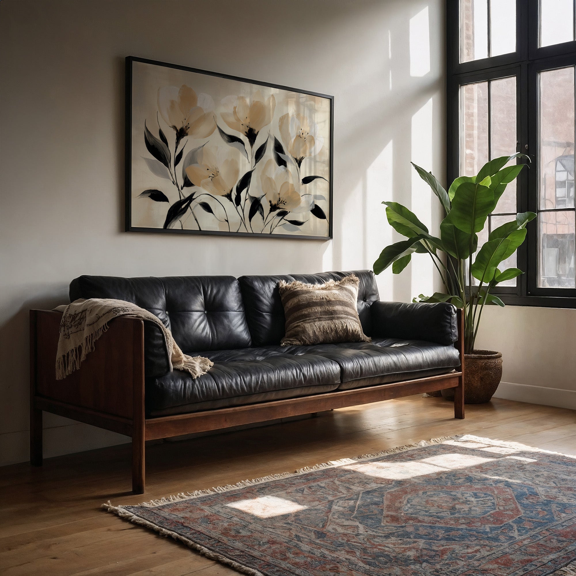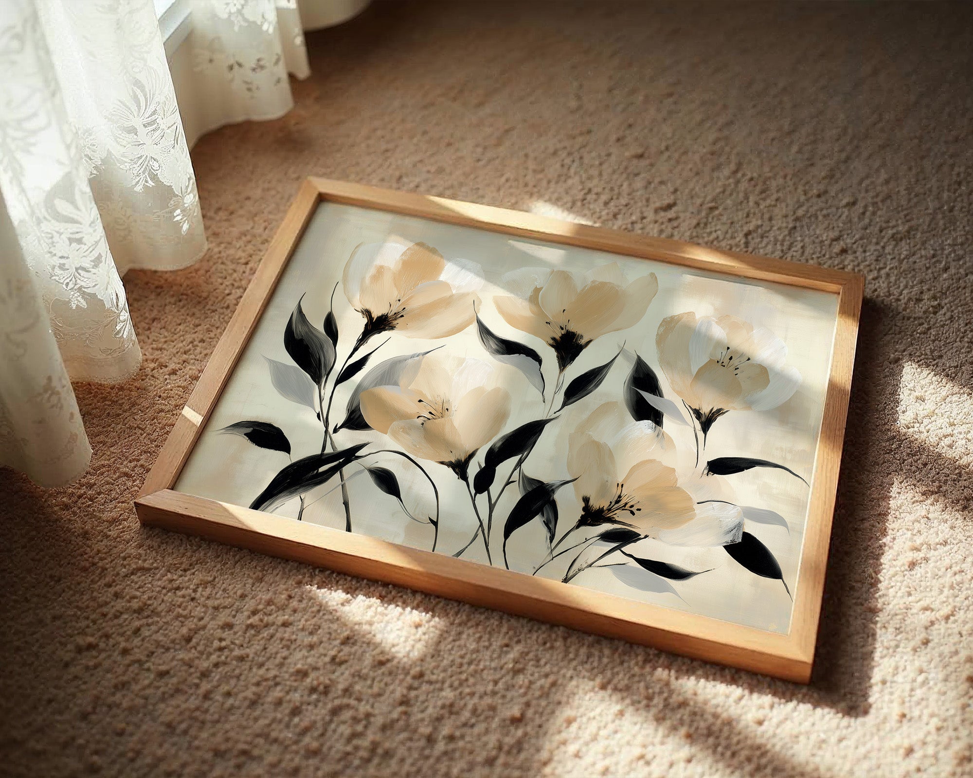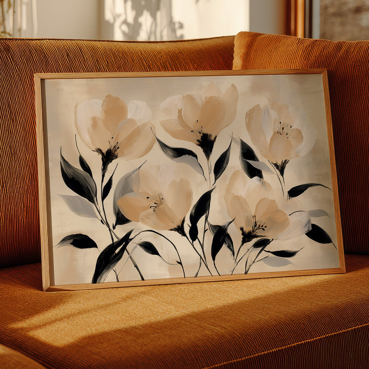Golden hour sunlight streams across a corduroy couch, creating a canvas of warmth and shadow play. A minimalist floral painting featuring delicate cream-colored blooms with bold black stems rests against plush cushions, while houseplant shadows dance on the wall behind. The scene captures that perfect moment when day melts into evening, where natural and artistic beauty converge in quiet harmony. This contemporary piece would elevate any living space seeking to blend modern botanical artistry with cozy, sun-drenched comfort.