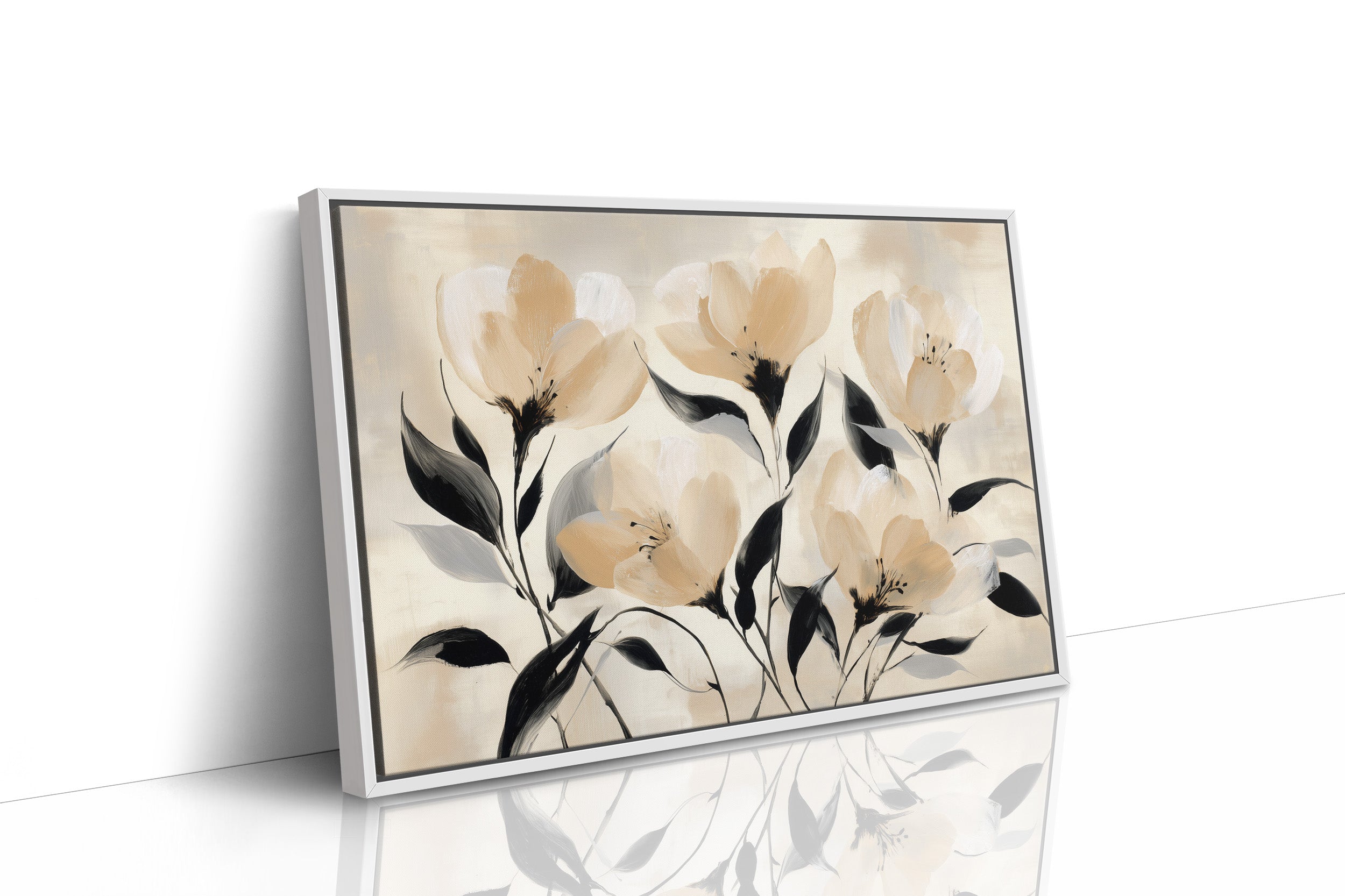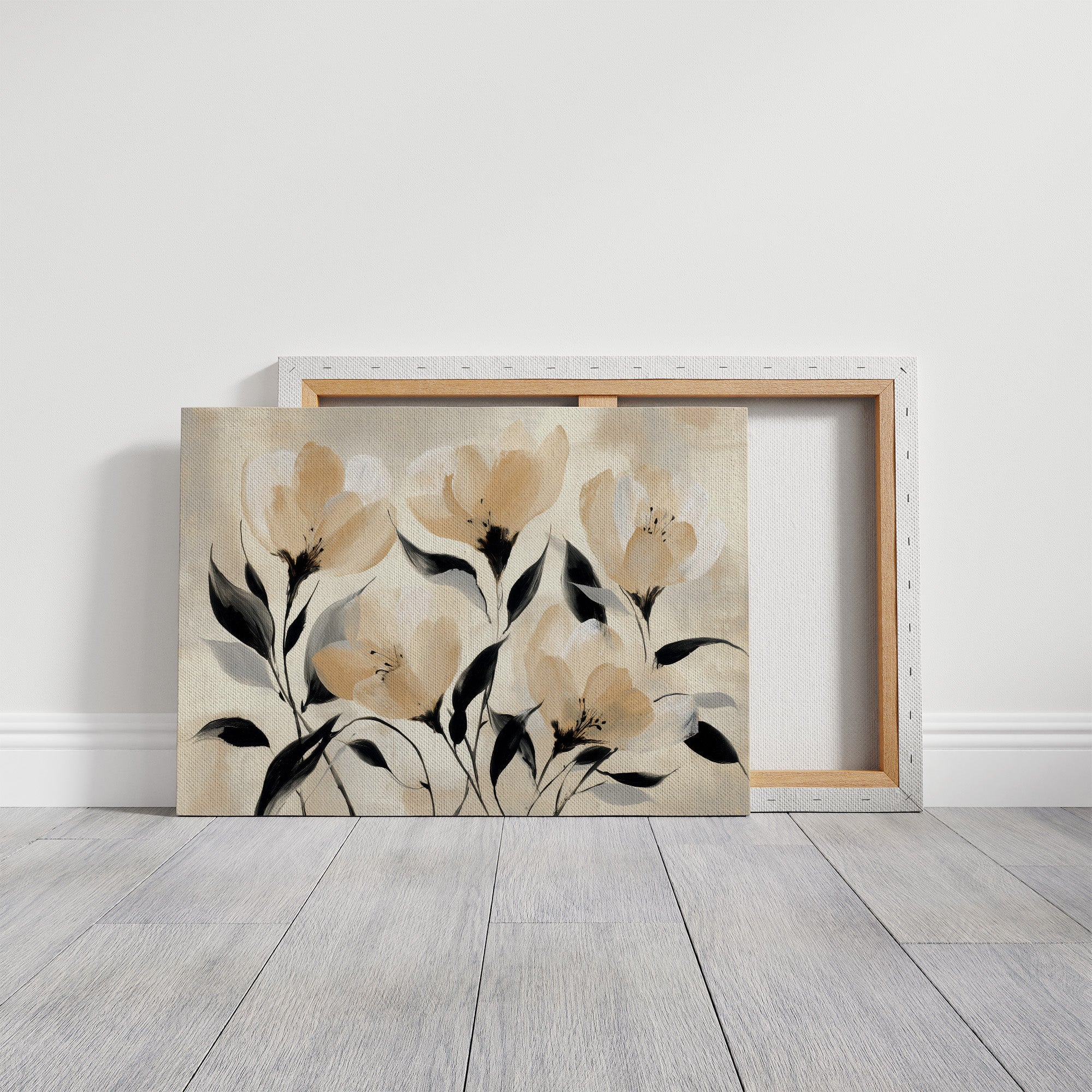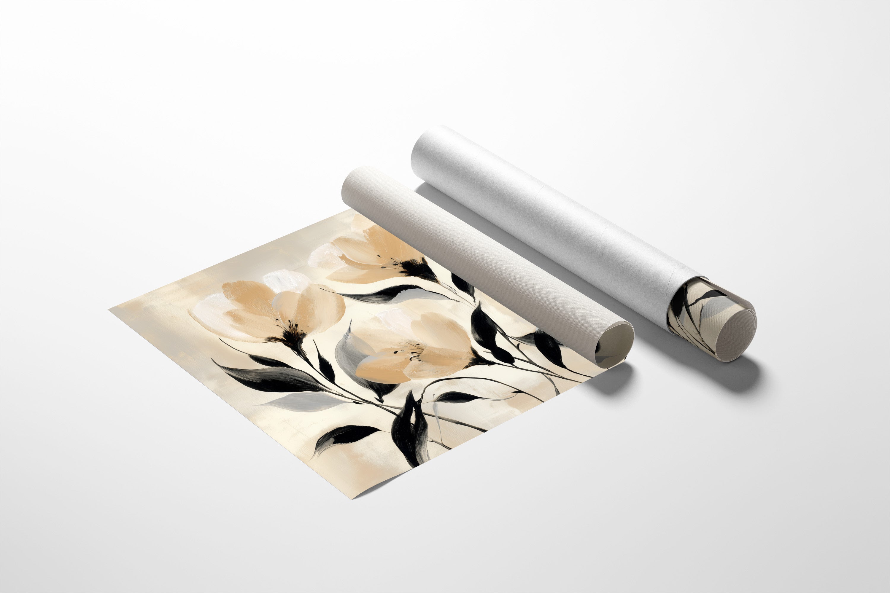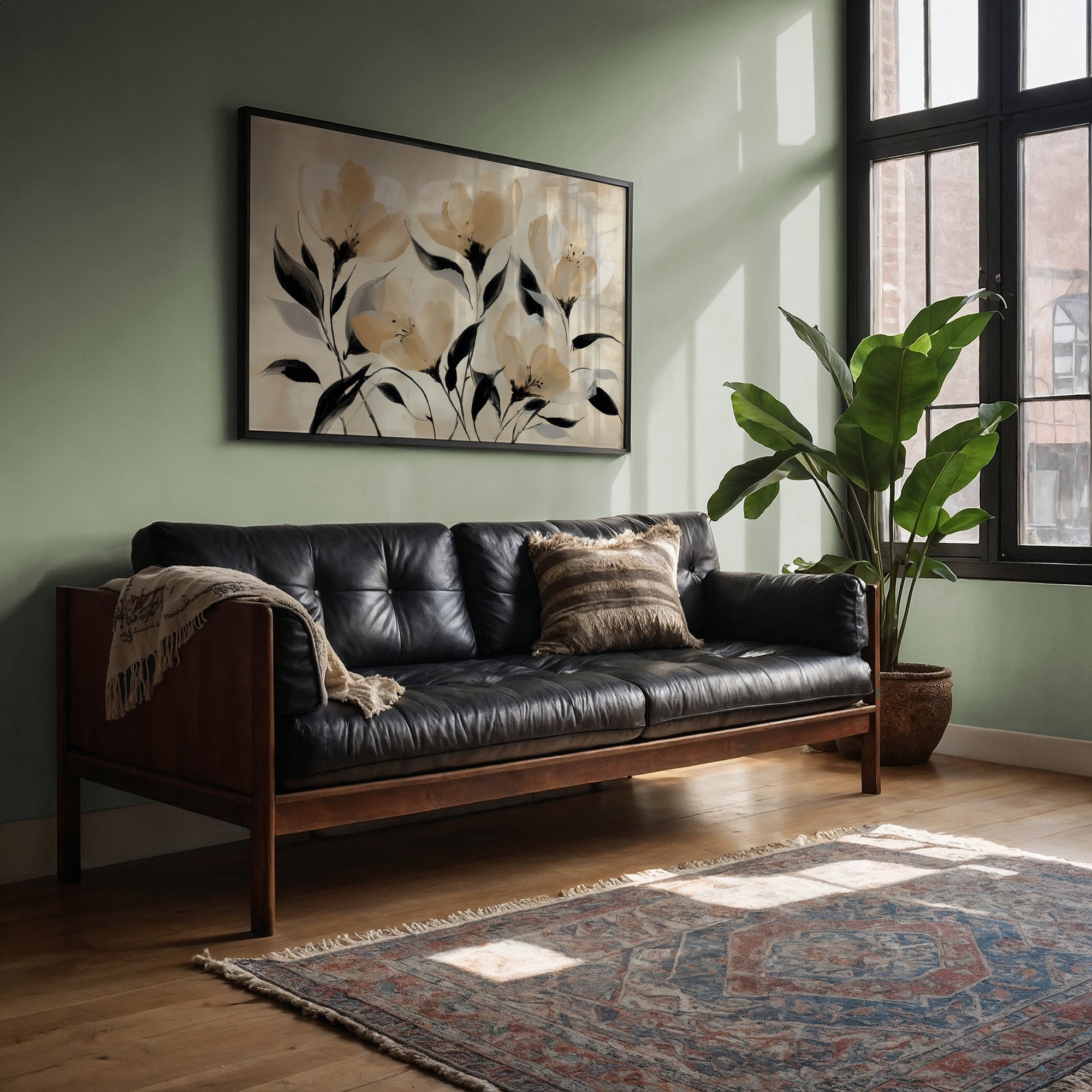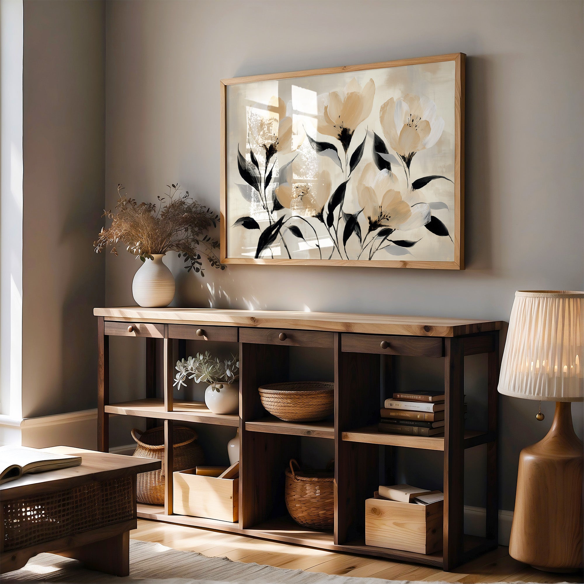 Golden hour sunlight streams across a corduroy couch, creating a canvas of warmth and shadow play. A minimalist floral painting featuring delicate cream-colored blooms with bold black stems rests against plush cushions, while houseplant shadows dance on the wall behind. The scene captures that perfect moment when day melts into evening, where natural and artistic beauty converge in quiet harmony. This contemporary piece would elevate any living space seeking to blend modern botanical artistry with cozy, sun-drenched comfort.