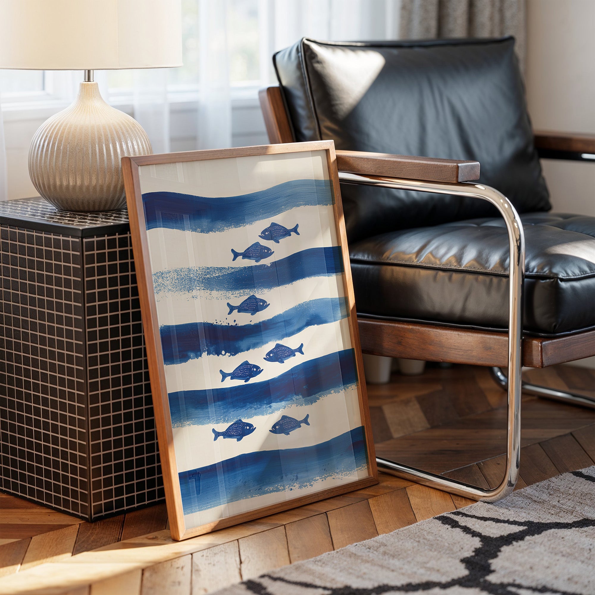 Sunlight drifts across the room, illuminating a serene scene where navy fish glide through brushstrokes of ocean blue. The wooden-framed artwork brings a coastal rhythm to the sophisticated space, its hand-painted waves creating a gentle motion against cream canvas. This piece stands casually against a leather chair, suggesting the relaxed elegance of a well-curated home.