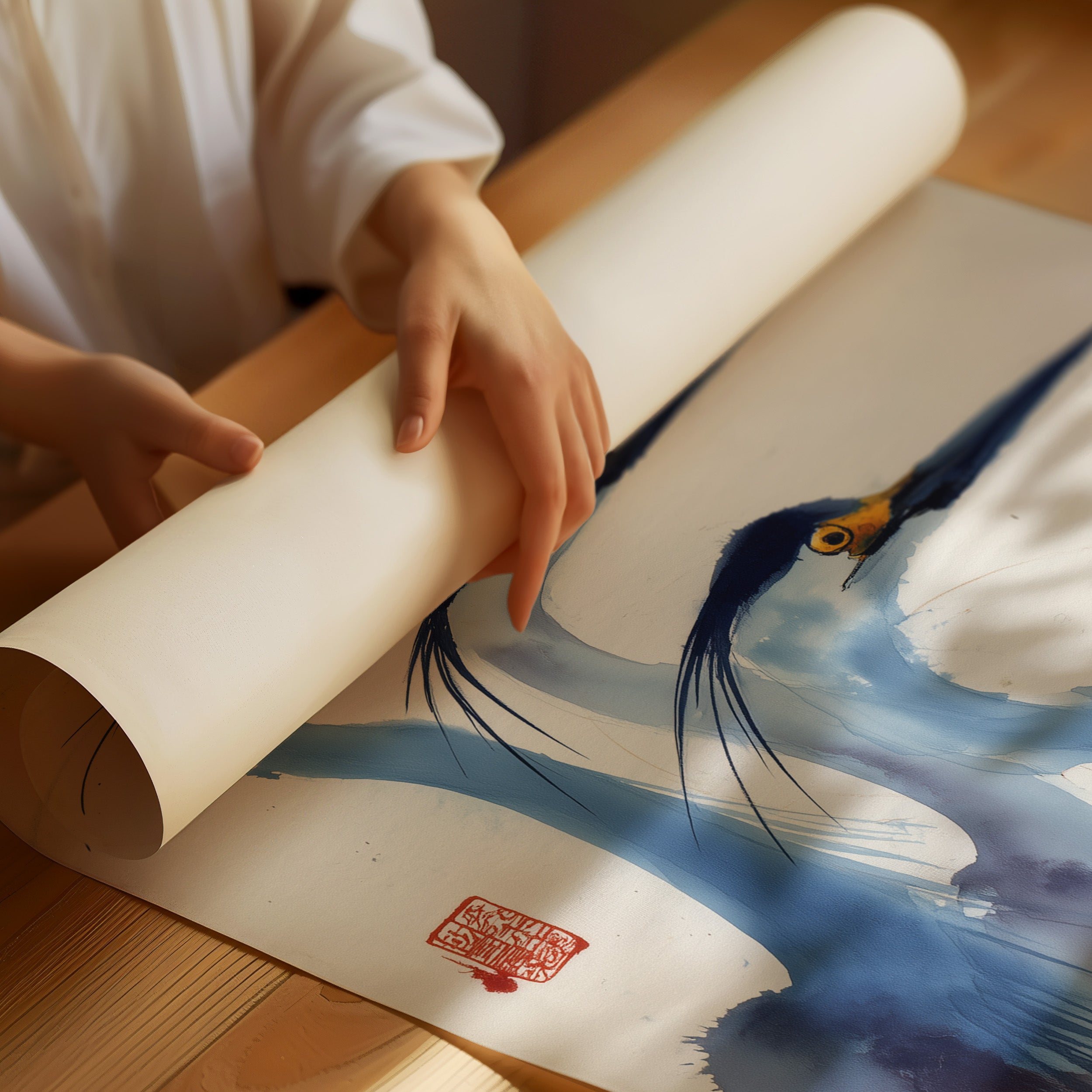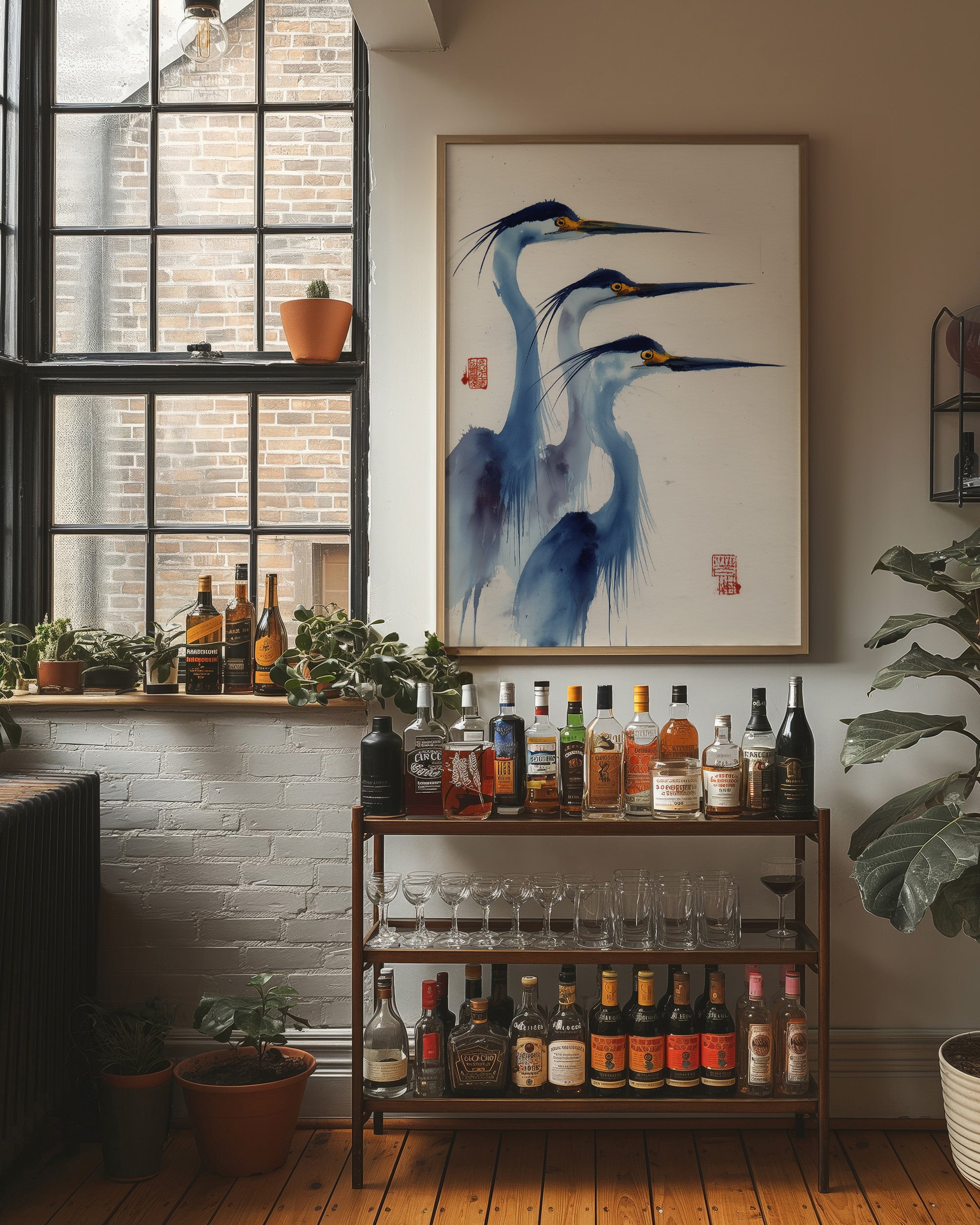 Delicate brushstrokes capture three graceful herons in a moment of serene contemplation, their long necks creating a rhythmic harmony against a misty background. The traditional Asian ink technique brings these majestic birds to life through varying shades of indigo and slate blue, their golden eyes providing subtle points of warmth within the cool palette. This contemporary interpretation of classical Eastern artistry rests thoughtfully against a modern bookshelf, bridging past and present. This piece would elevate any space seeking to create a sense of tranquility, particularly suited for a reading nook, meditation room, or sophisticated home office where its peaceful presence can be fully appreciated.