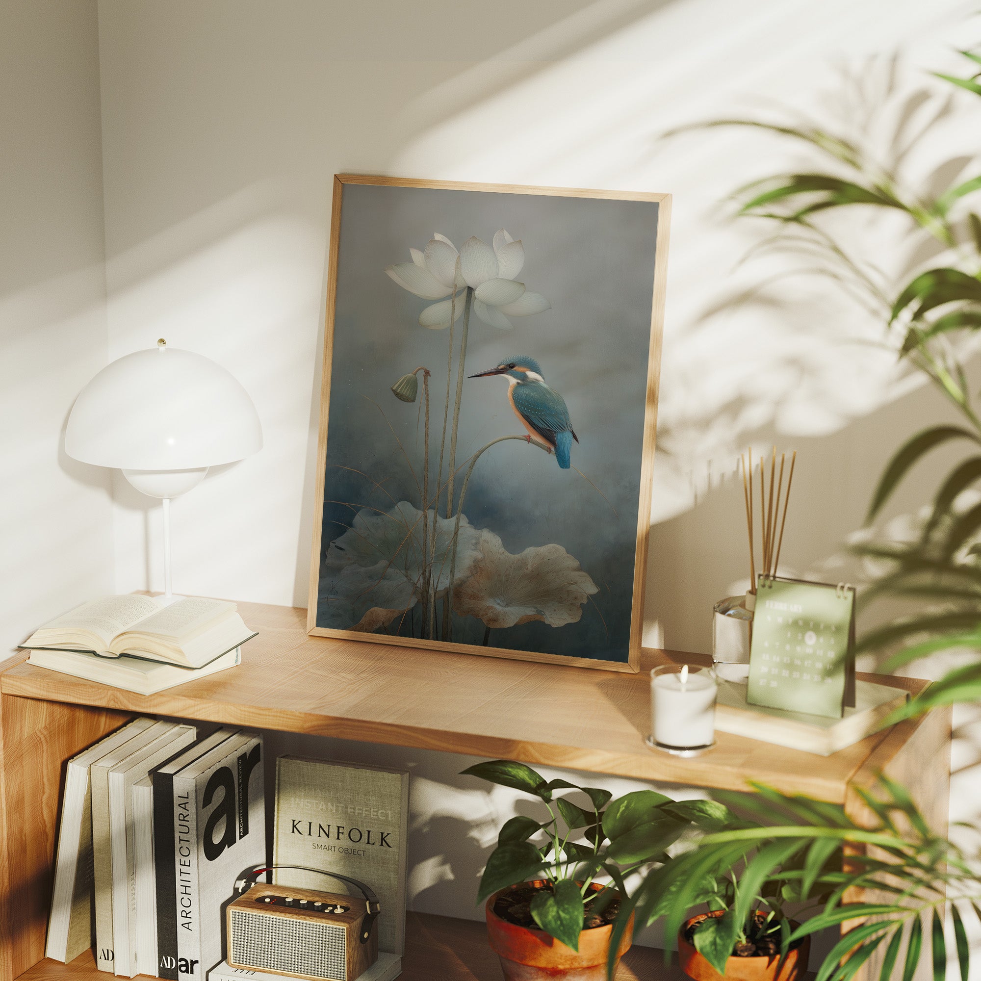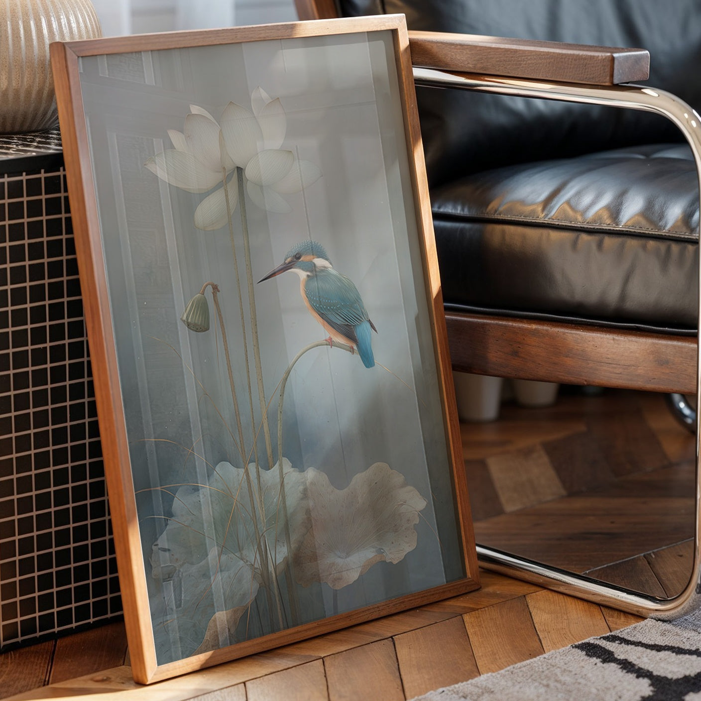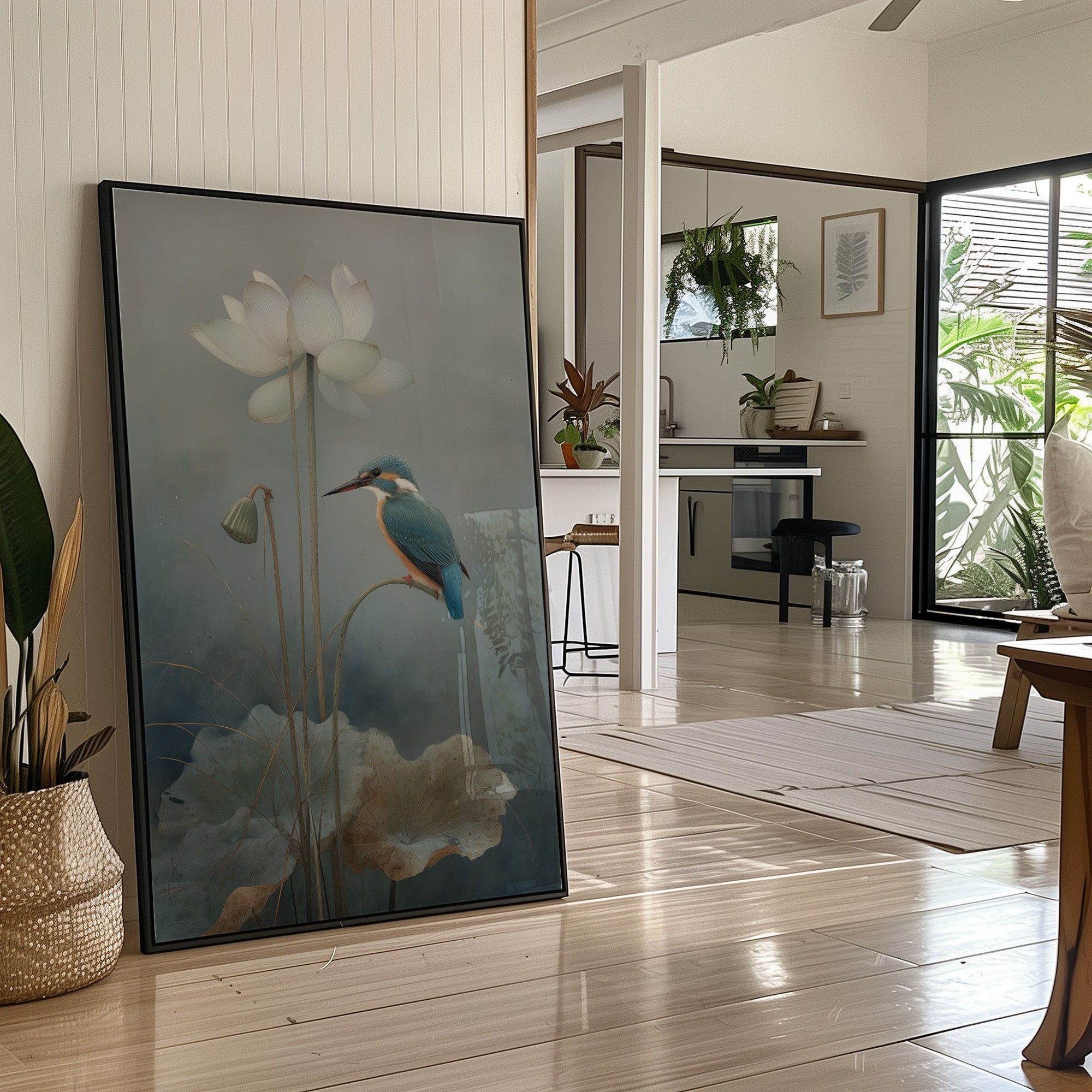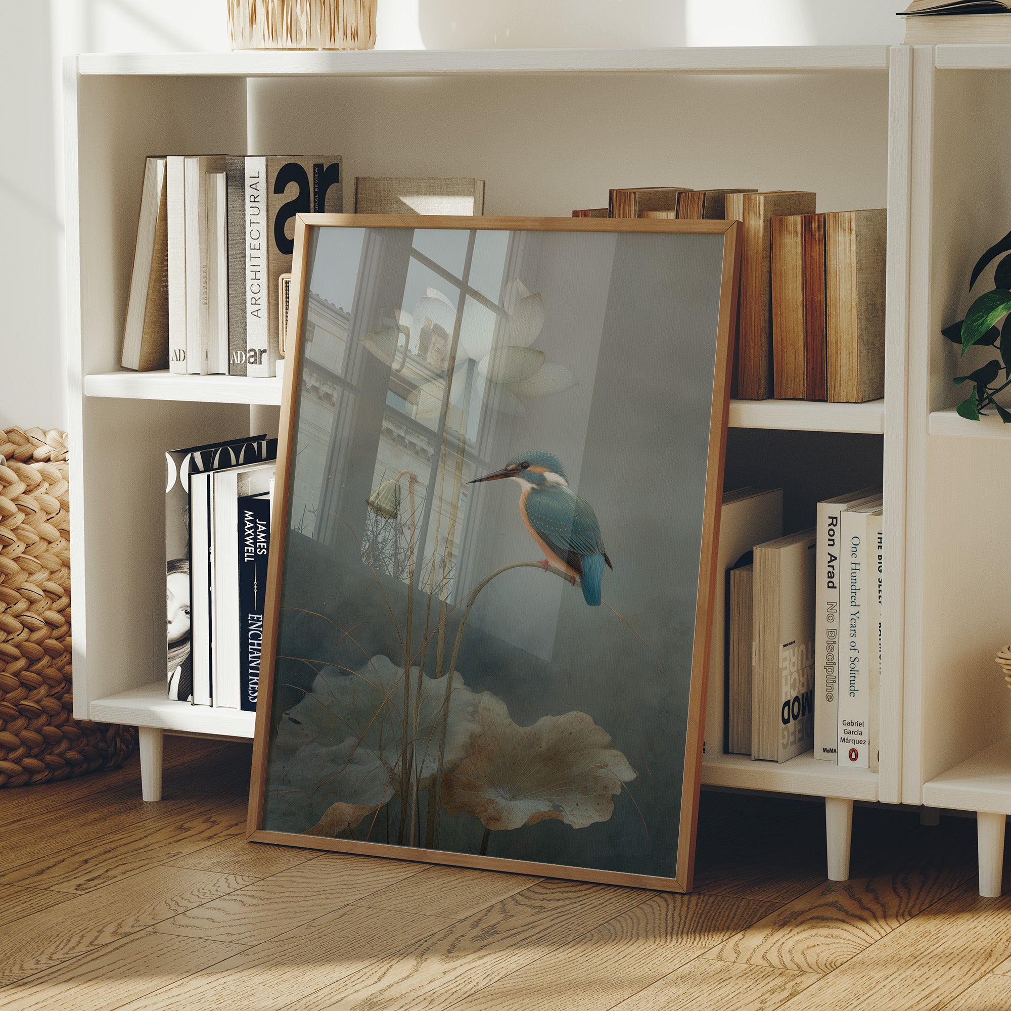 A kingfisher perches gracefully amidst ethereal morning fog, its vibrant blue plumage cutting through the soft, misty atmosphere. The scene captures a moment of perfect stillness, where delicate reeds and leaves create natural frames around this watchful sentinel. Muted greens and blues blend with silvery grays, creating a dreamlike quality that transforms a simple nature scene into something almost mythical. This contemporary piece would bring a sense of tranquility to a reading nook or home office, where its quiet drama can be fully appreciated.
