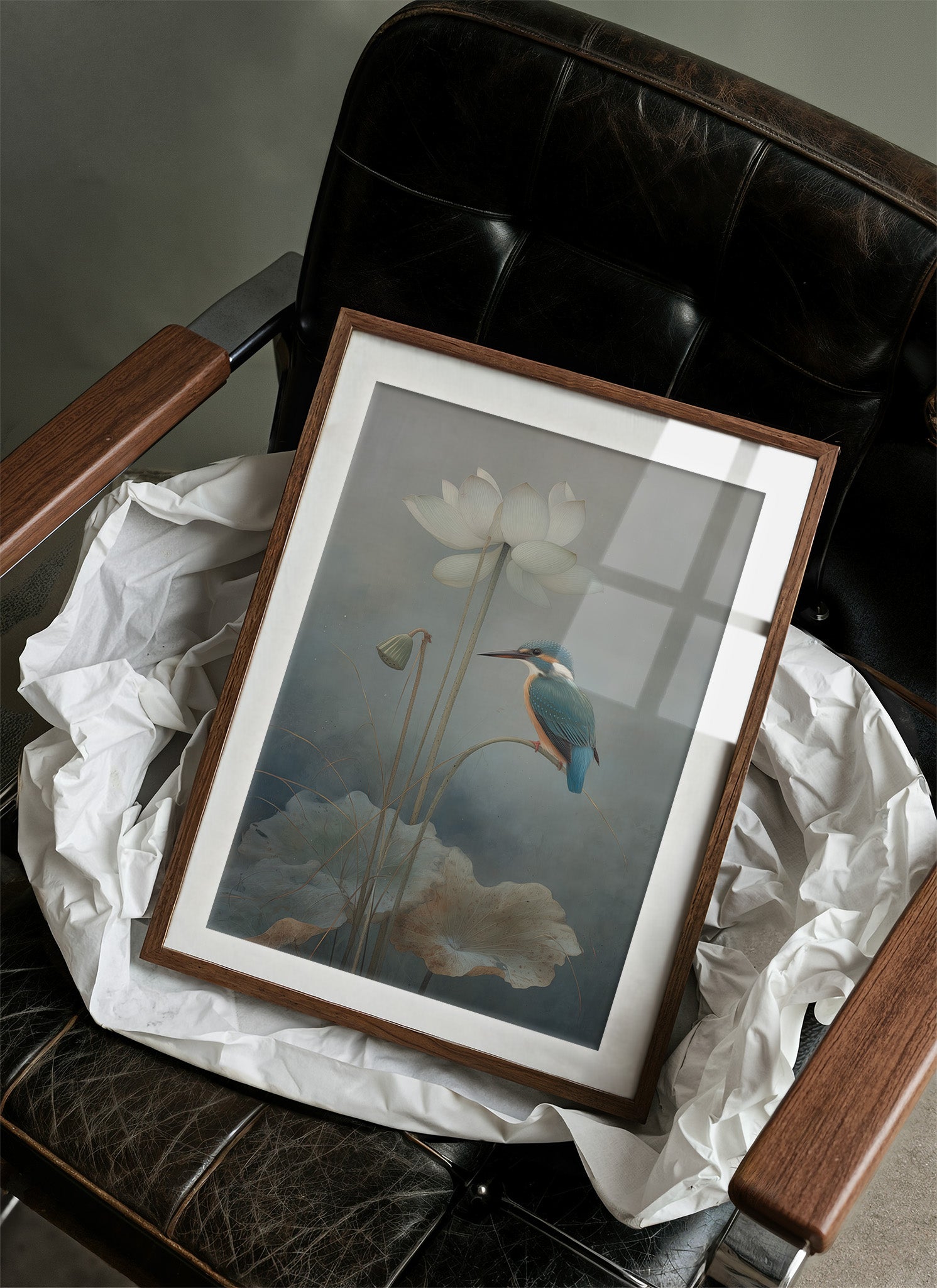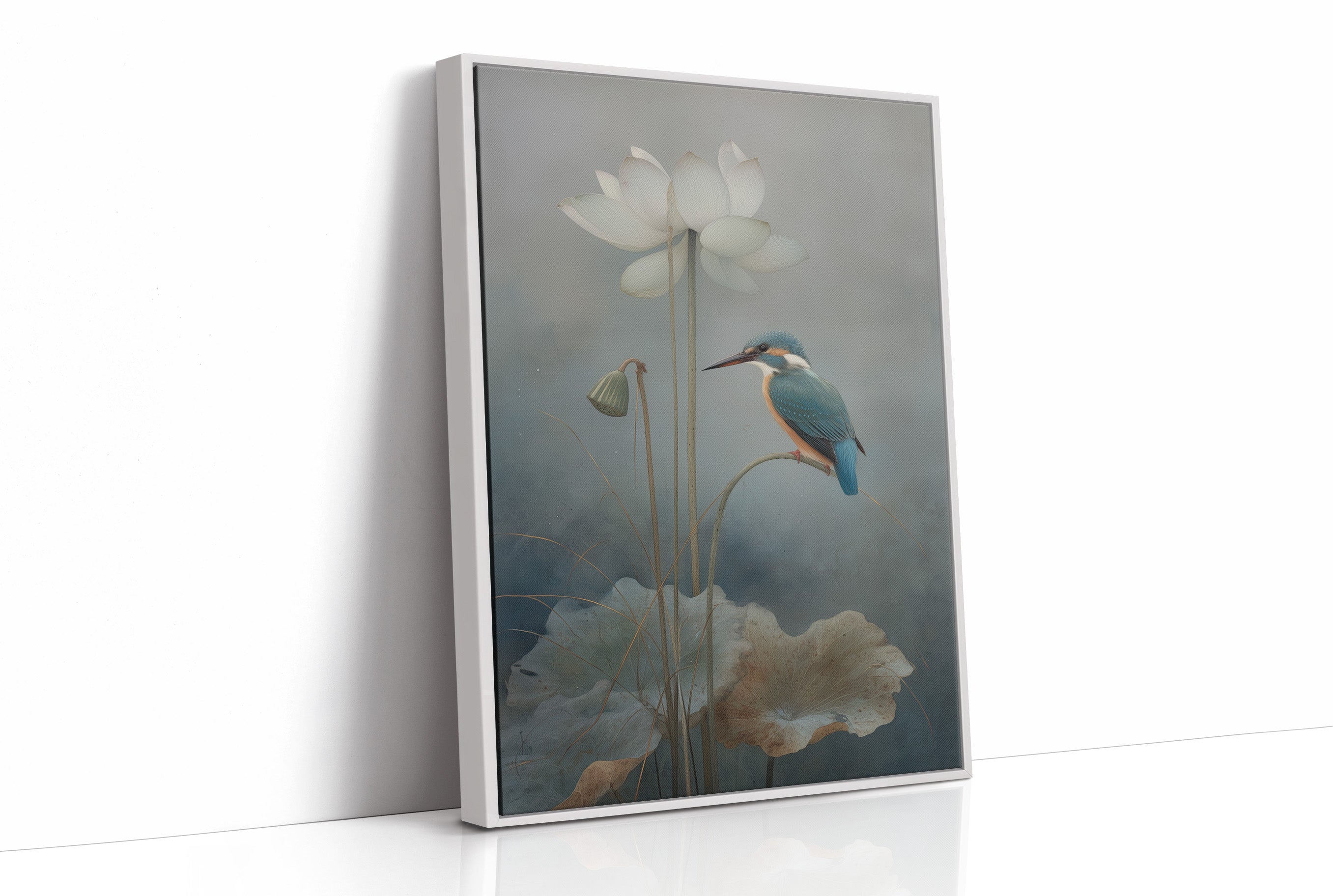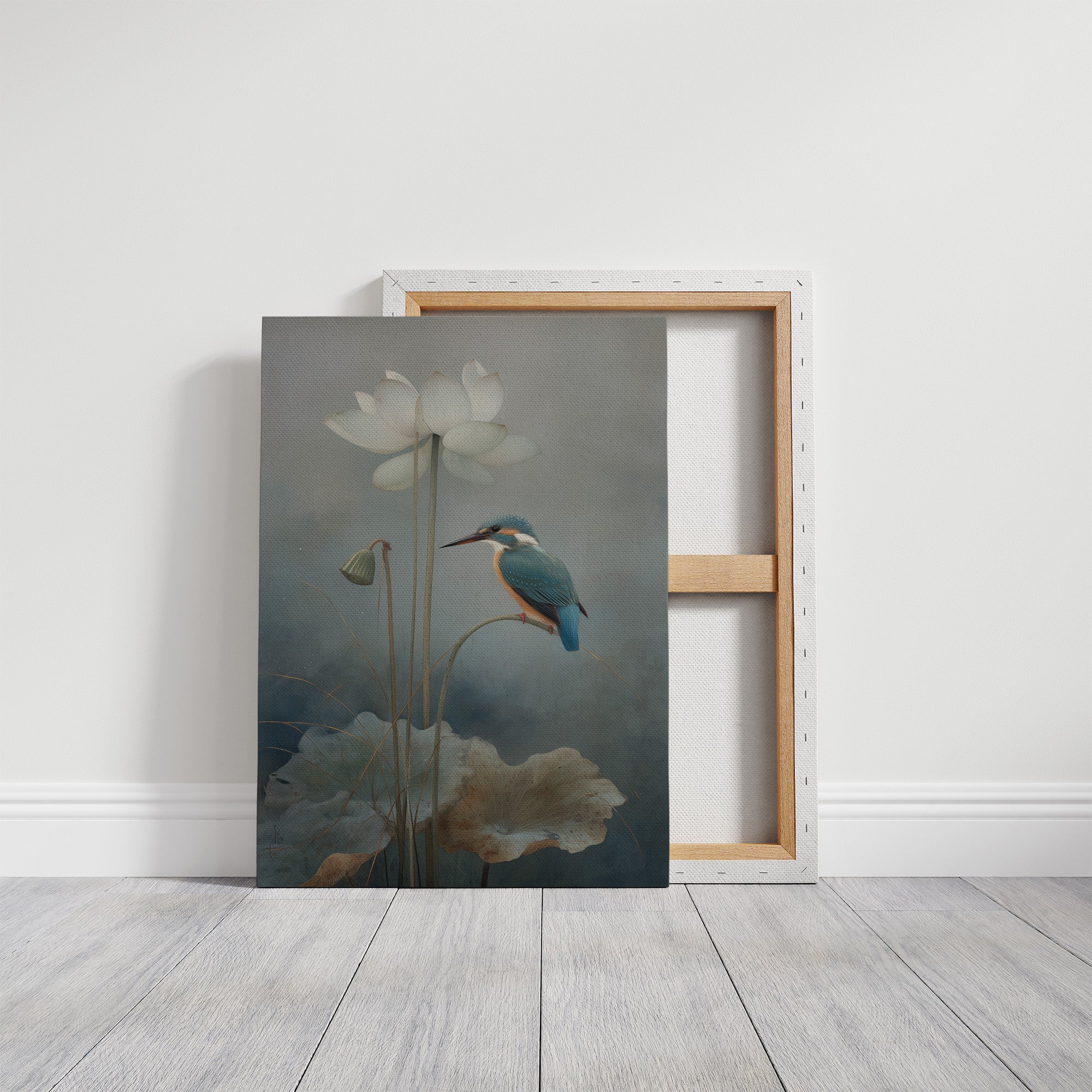A kingfisher perches gracefully amidst ethereal morning fog, its vibrant blue plumage cutting through the soft, misty atmosphere. The scene captures a moment of perfect stillness, where delicate reeds and leaves create natural frames around this watchful sentinel. Muted greens and blues blend with silvery grays, creating a dreamlike quality that transforms a simple nature scene into something almost mythical. This contemporary piece would bring a sense of tranquility to a reading nook or home office, where its quiet drama can be fully appreciated.