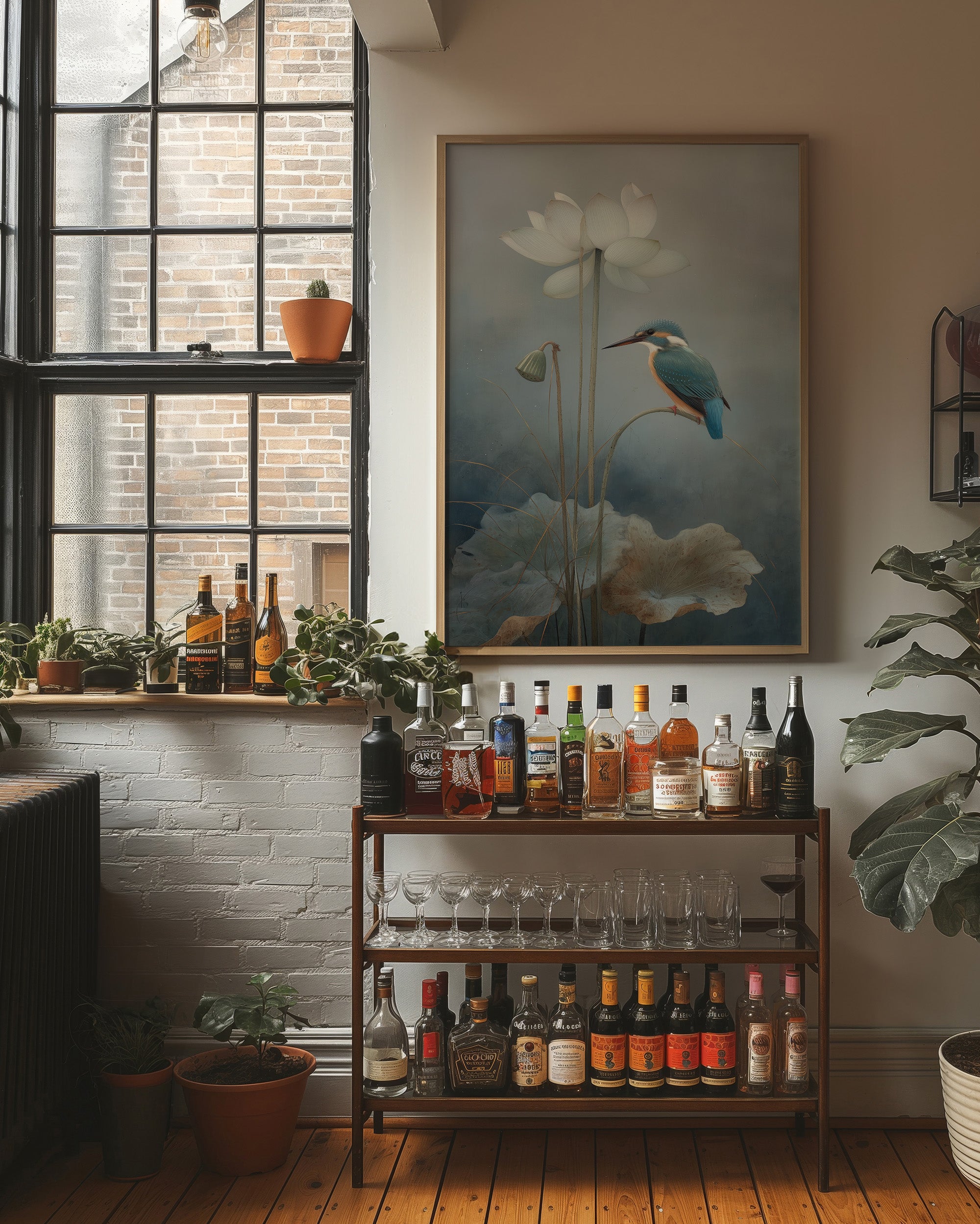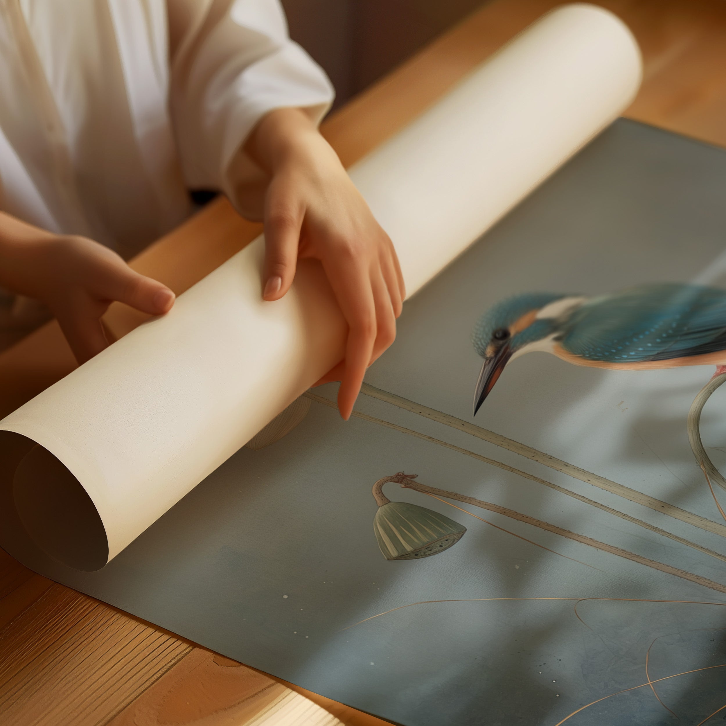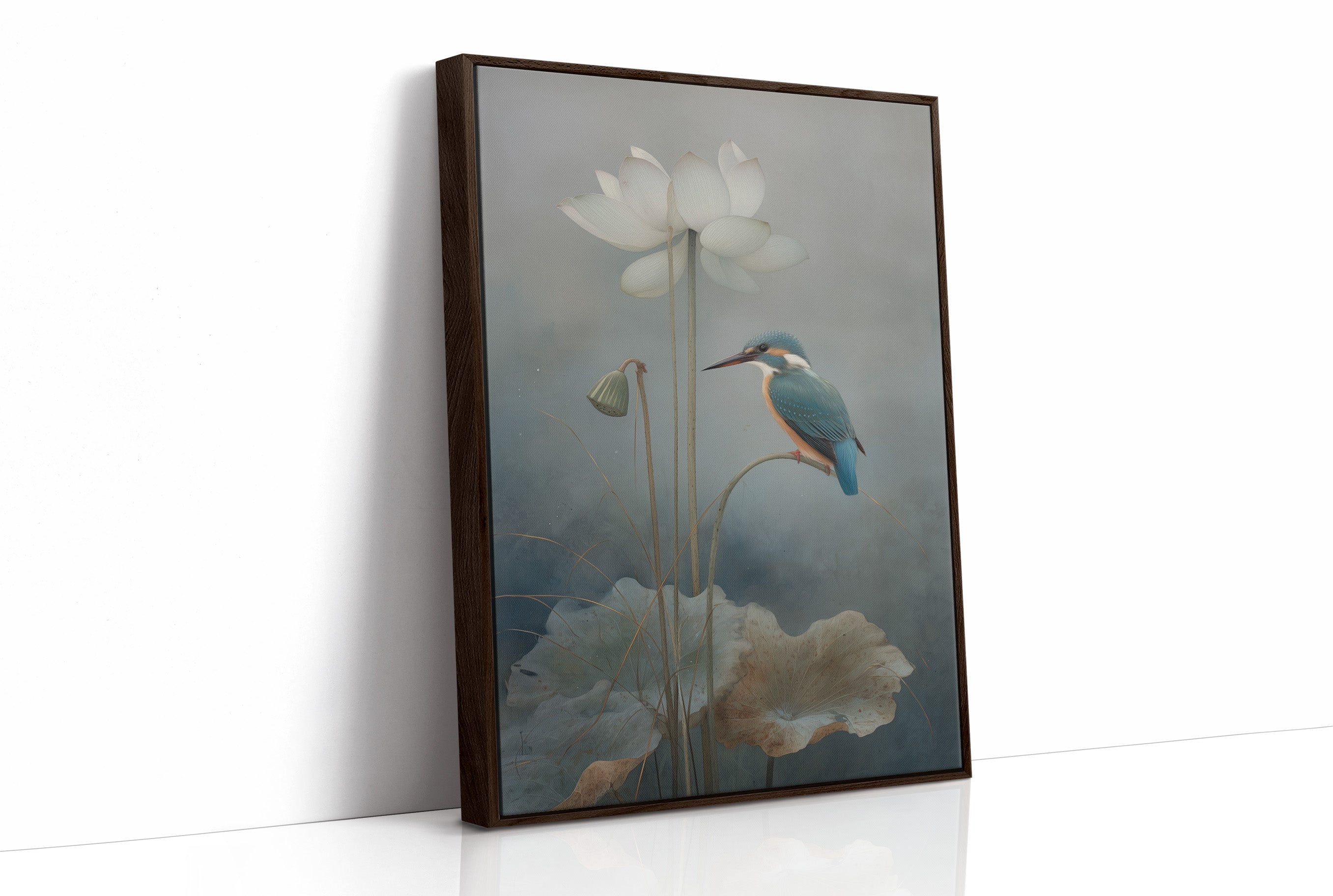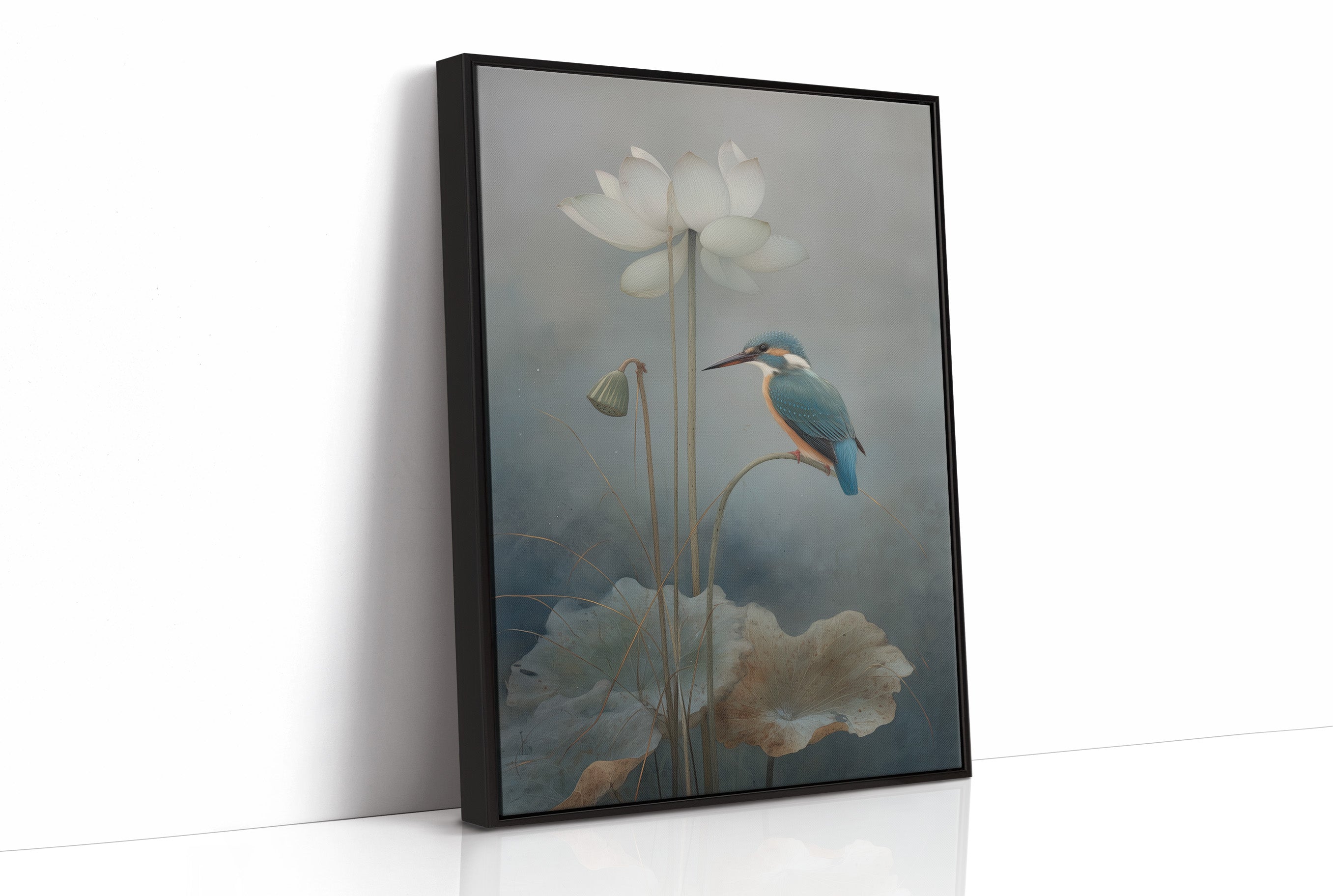 A kingfisher perches gracefully amidst ethereal morning fog, its vibrant blue plumage cutting through the soft, misty atmosphere. The scene captures a moment of perfect stillness, where delicate reeds and leaves create natural frames around this watchful sentinel. Muted greens and blues blend with silvery grays, creating a dreamlike quality that transforms a simple nature scene into something almost mythical. This contemporary piece would bring a sense of tranquility to a reading nook or home office, where its quiet drama can be fully appreciated.