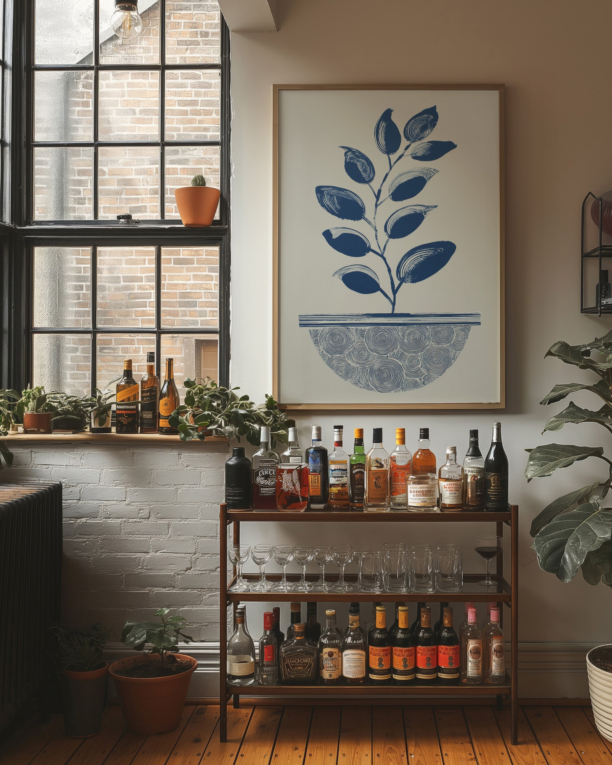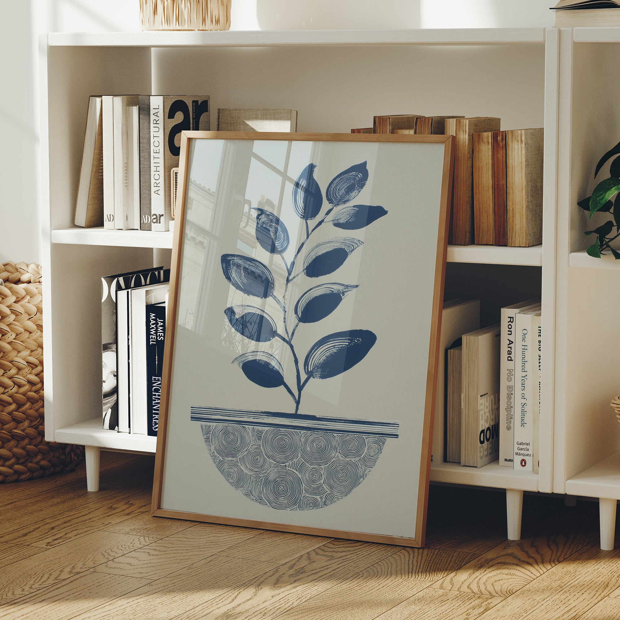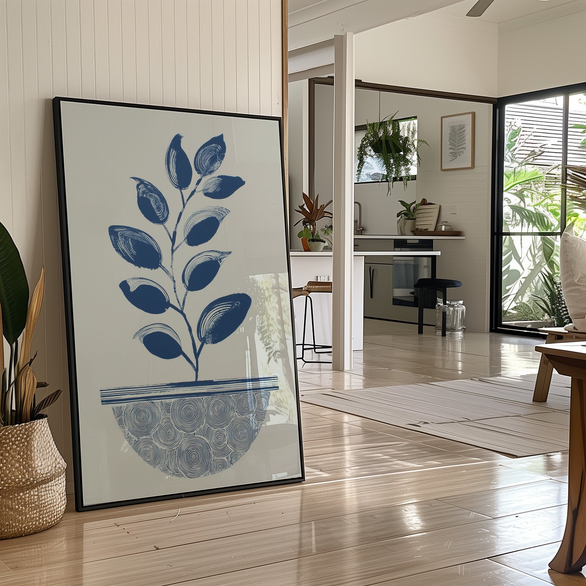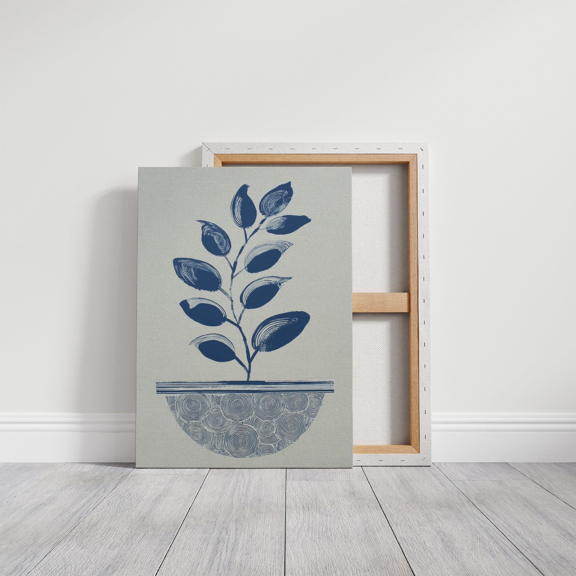 Sunlight streams across hardwood floors, illuminating a minimalist botanical illustration where indigo leaves rise gracefully from a patterned bowl. The simple yet striking composition in navy and cream tones creates a moment of zen-like tranquility. The artistic rendering combines organic leaf shapes with geometric spiral patterns, offering a modern take on traditional botanical studies. This piece would bring sophisticated serenity to a reading nook, home office, or any space where calm contemplation is desired.