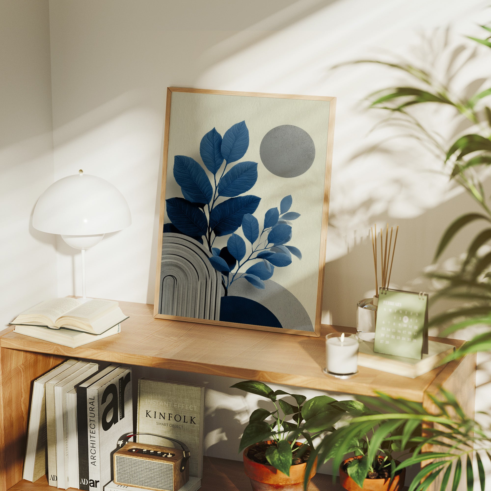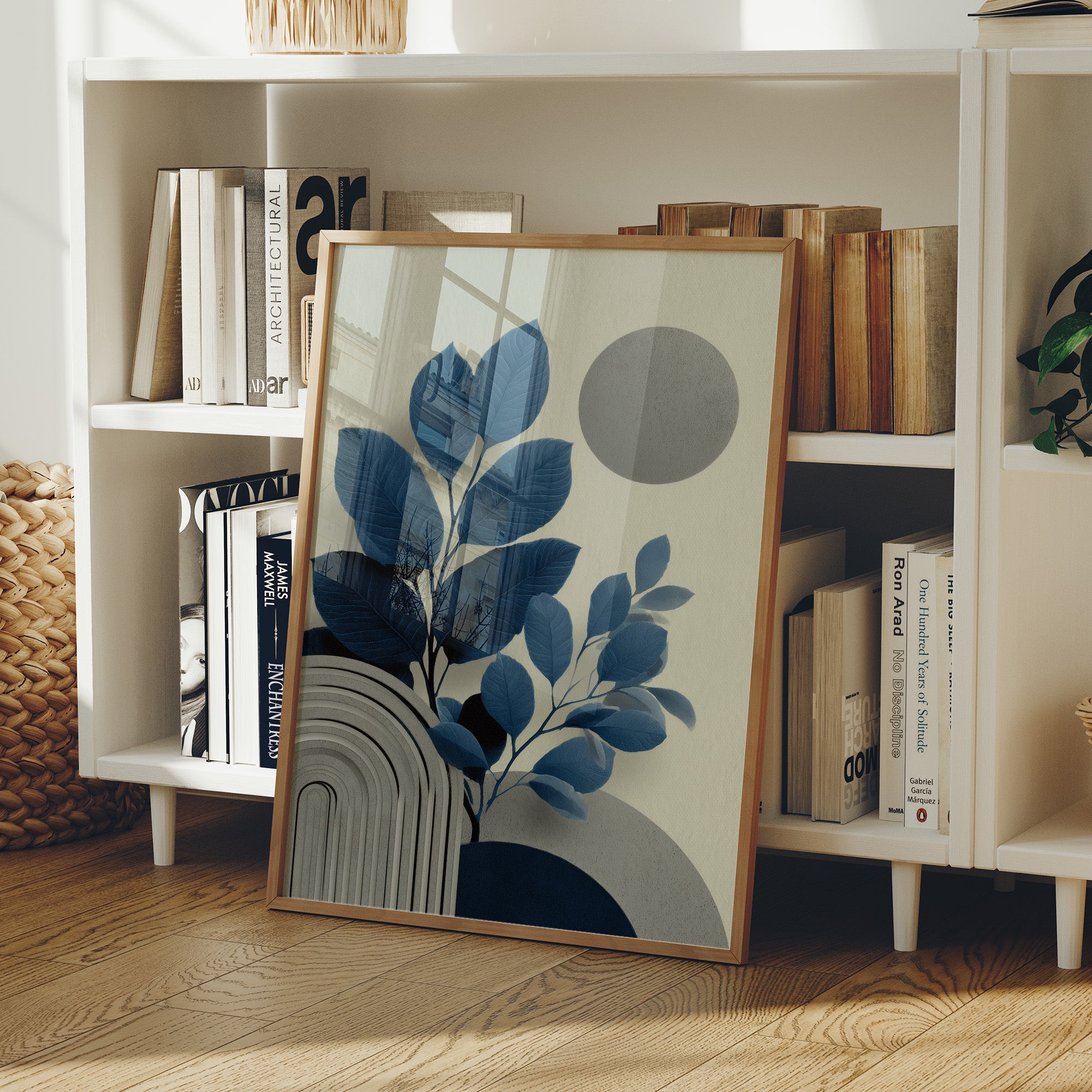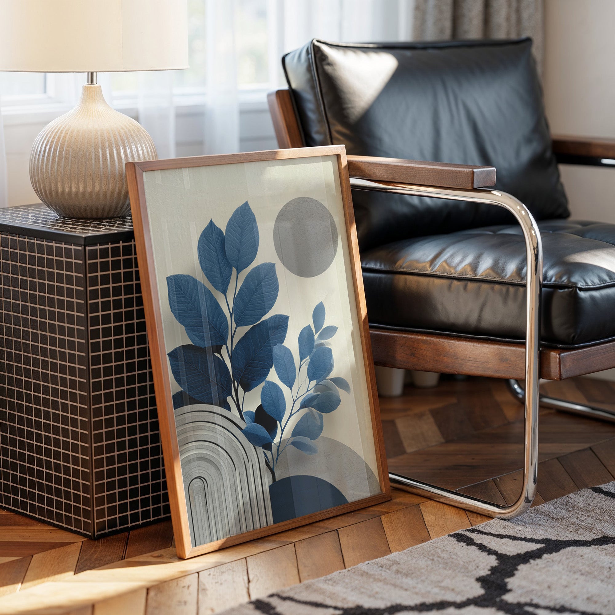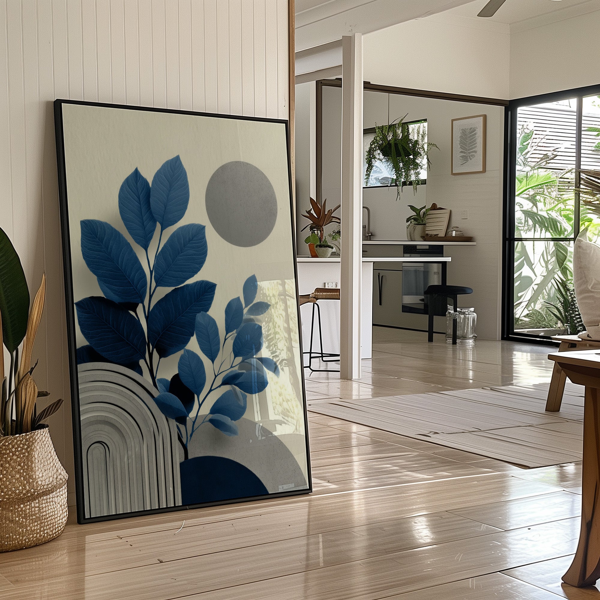 Deep indigo leaves stretch gracefully across a canvas of cream, their silhouettes bold yet serene against geometric silver circles. The composition flows with modern elegance, combining organic botanical forms with clean architectural lines and arcs that create a harmonious rhythm. In this contemporary piece, nature meets geometric abstraction, where deep blues and soft grays paint a story of balance and serenity. This statement piece would transform a minimal living space, creating a sophisticated focal point in a modern dining room or brightening a neutral hallway with its striking presence.