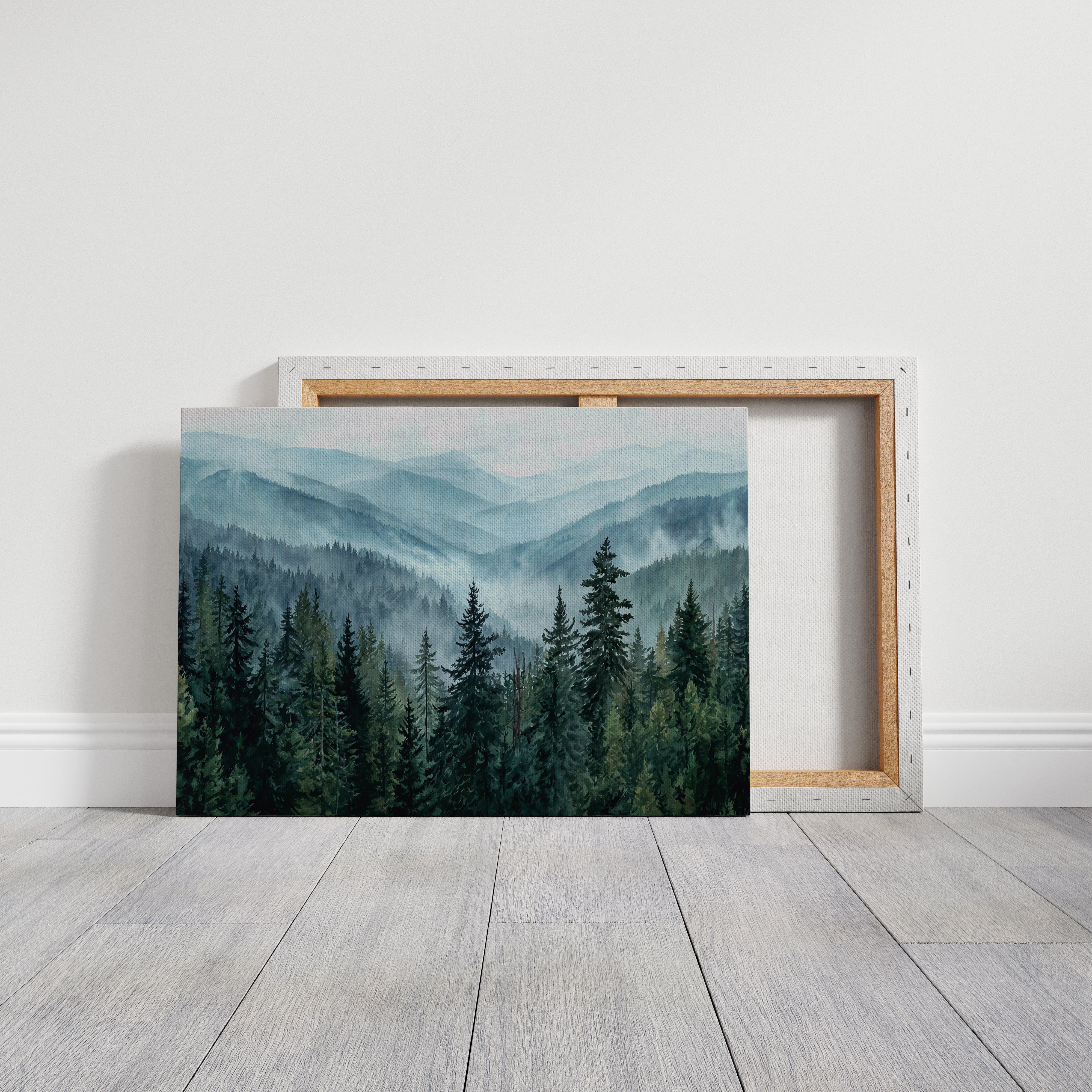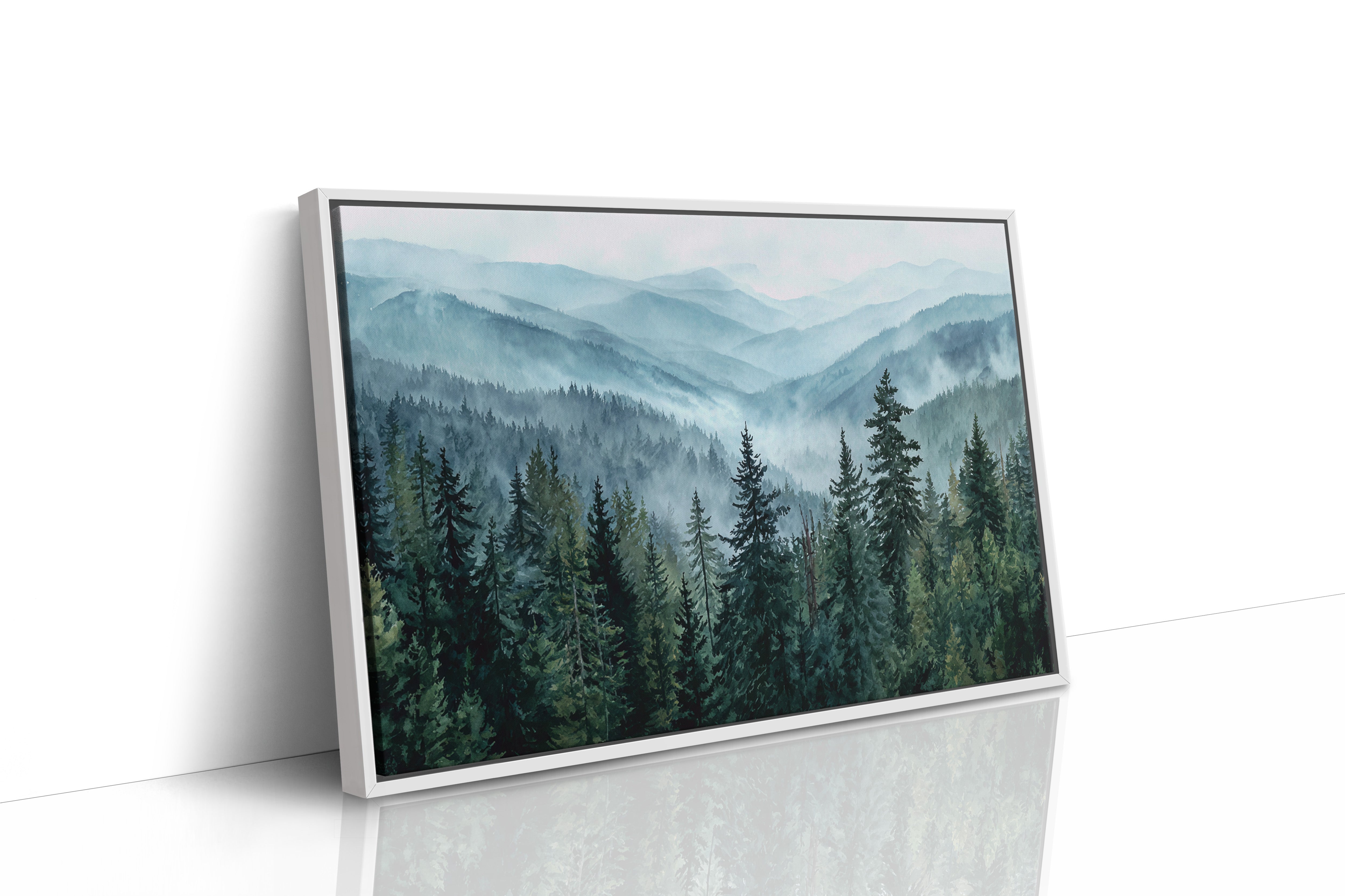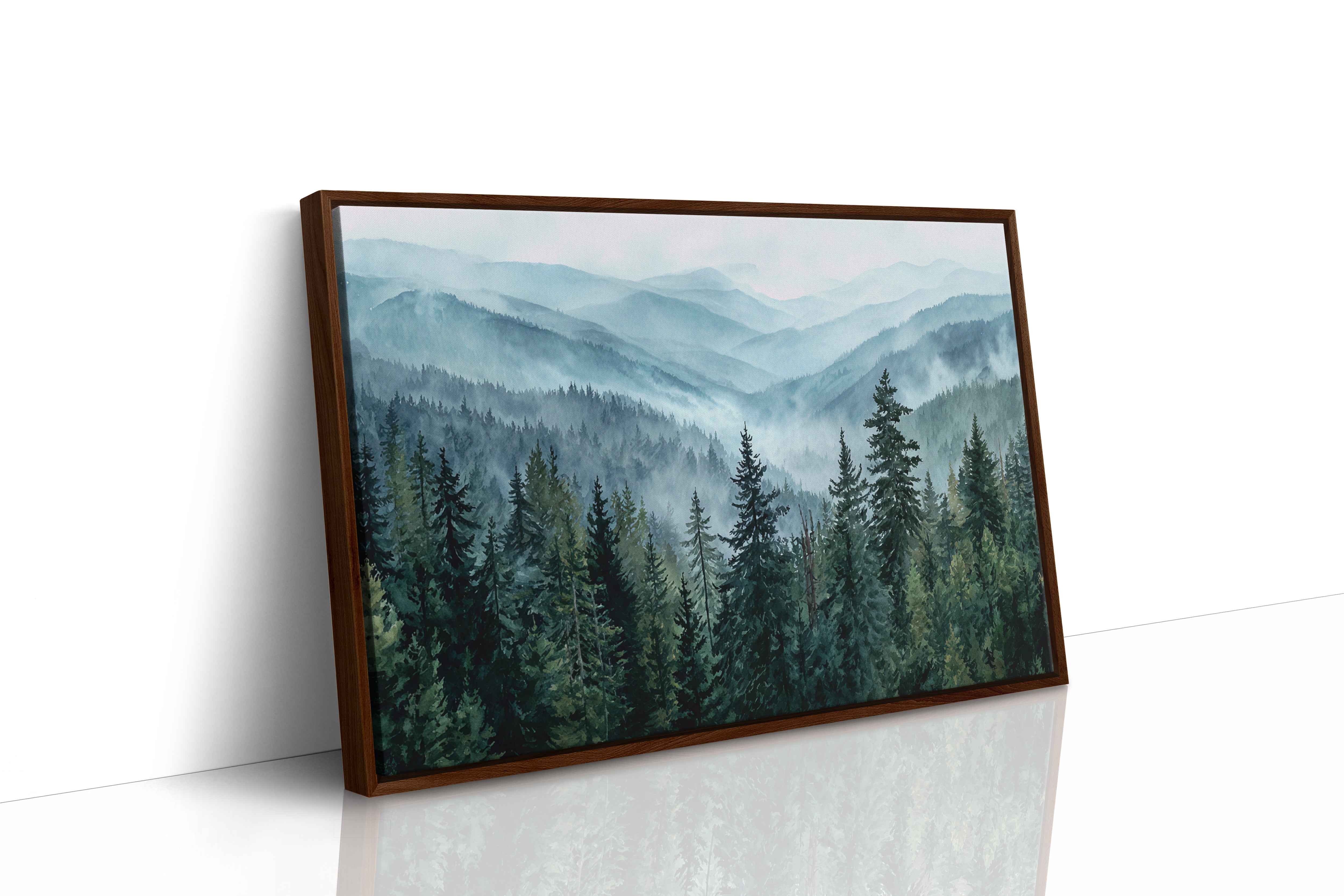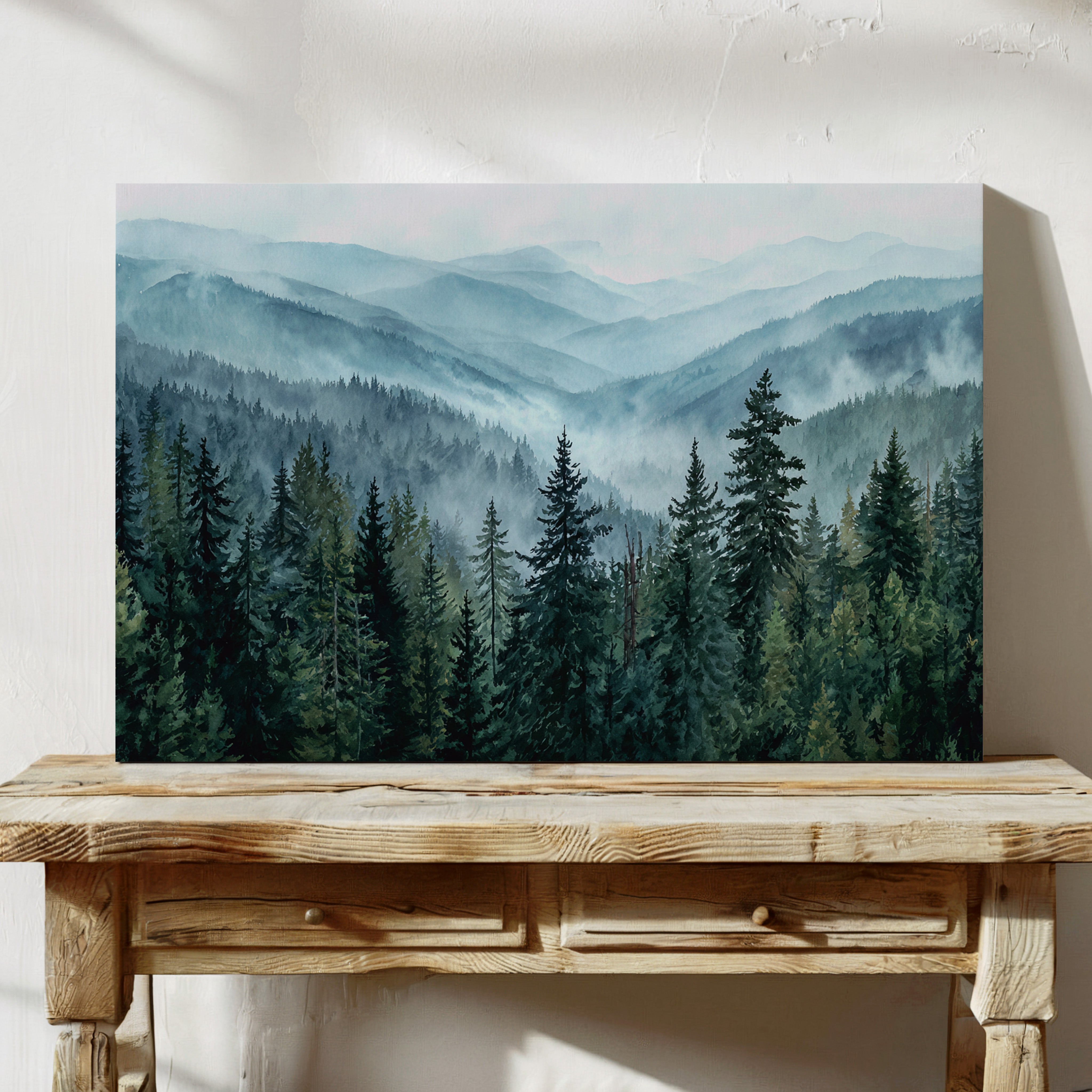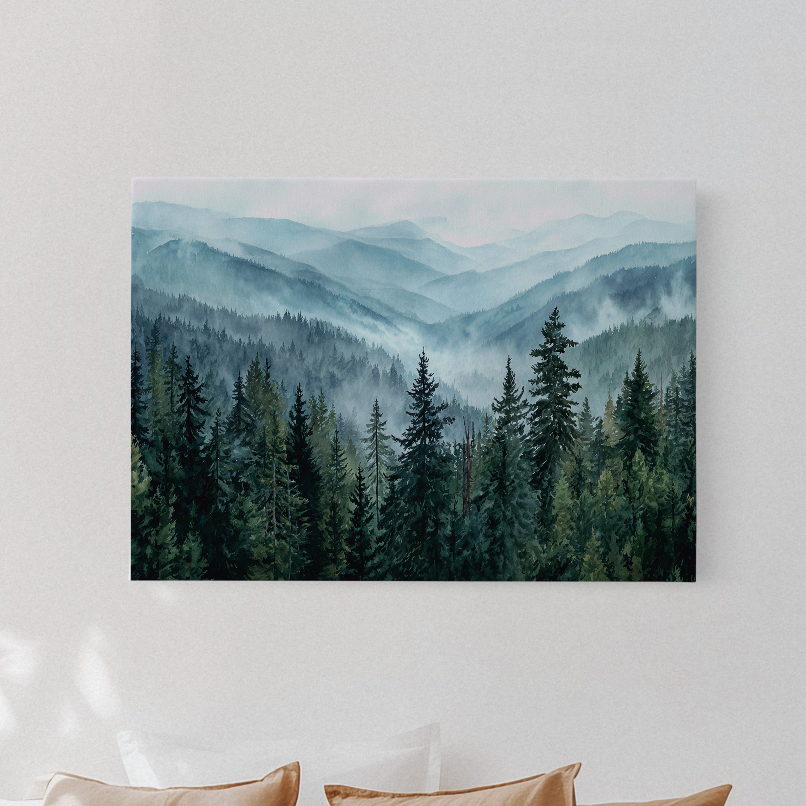 Morning mist weaves through evergreen sentinels, creating a ethereal dance of light and shadow. The cascading ridges fade into deeper shades of blue, each layer revealing another chapter of the wilderness story. Majestic pines stand proud in the foreground, their deep emerald needles contrasting against the soft, atmospheric haze that blankets the distant peaks. This scene captures the timeless dialogue between earth and sky, where mountain air transforms into rolling waves of fog. Perfect for spaces seeking to invoke a sense of tranquility and natural grandeur, especially in meditation rooms or sophisticated living areas where one can contemplate nature's endless mysteries.