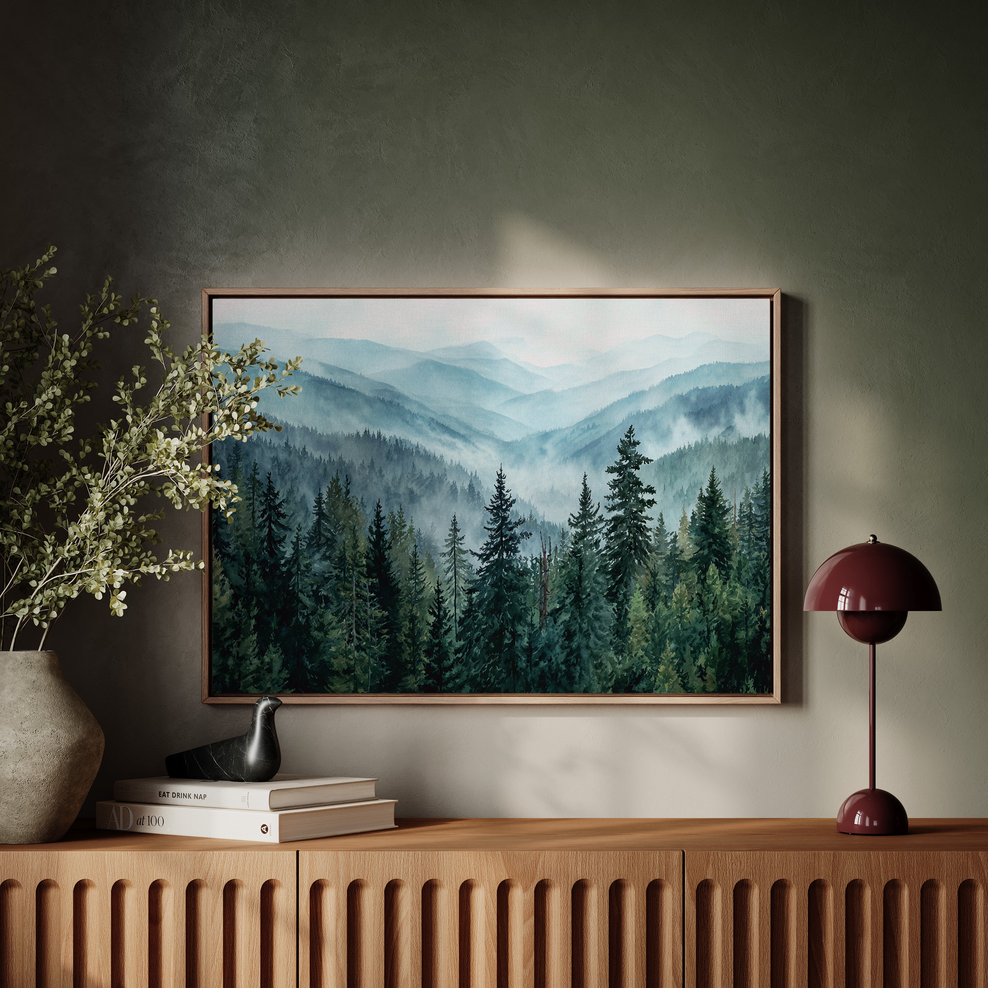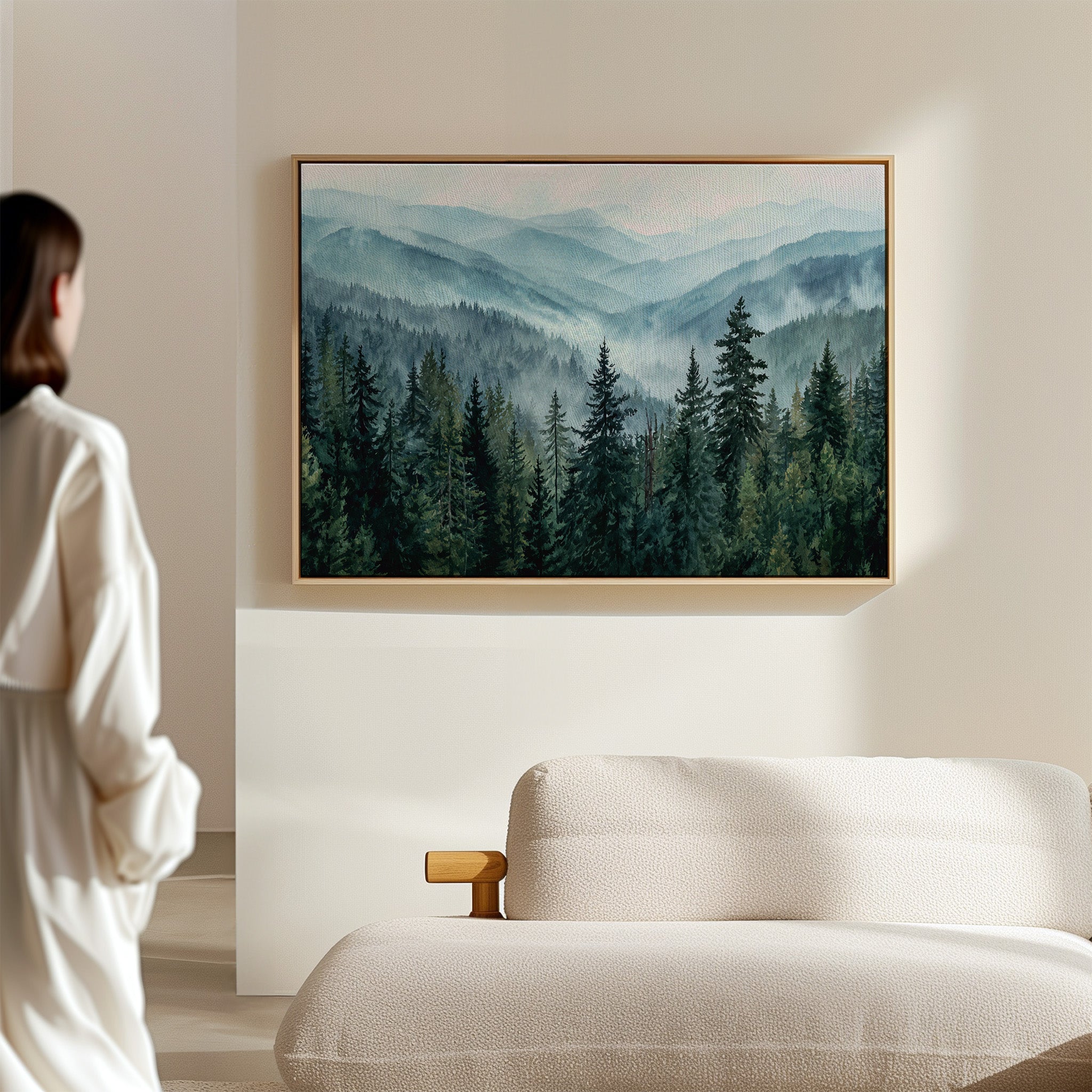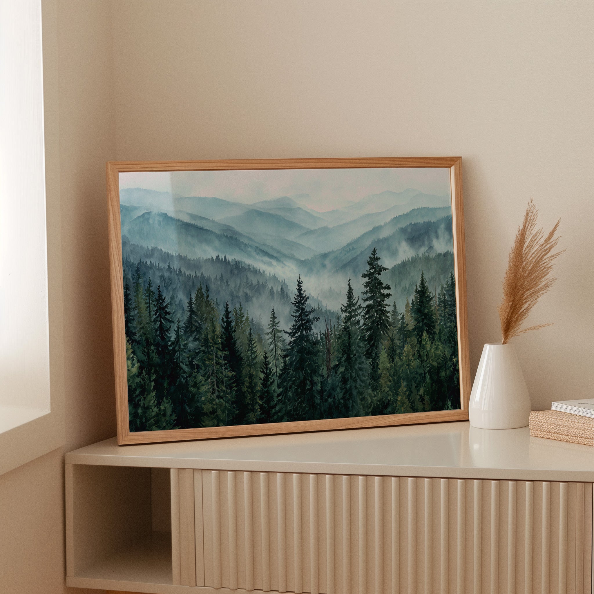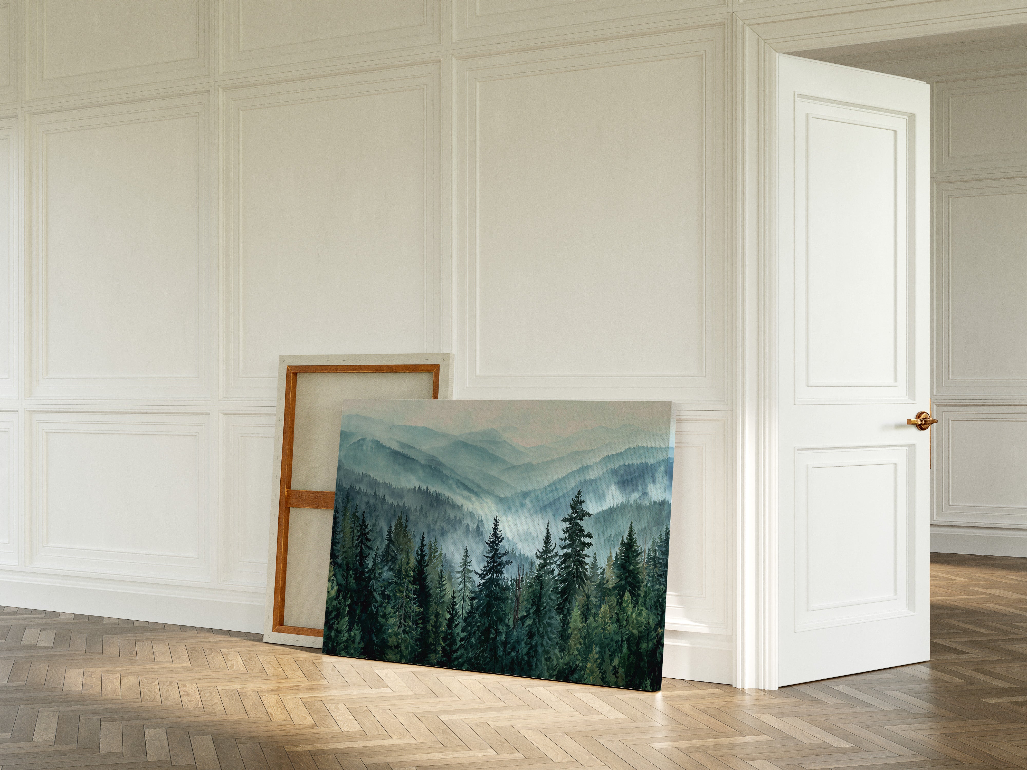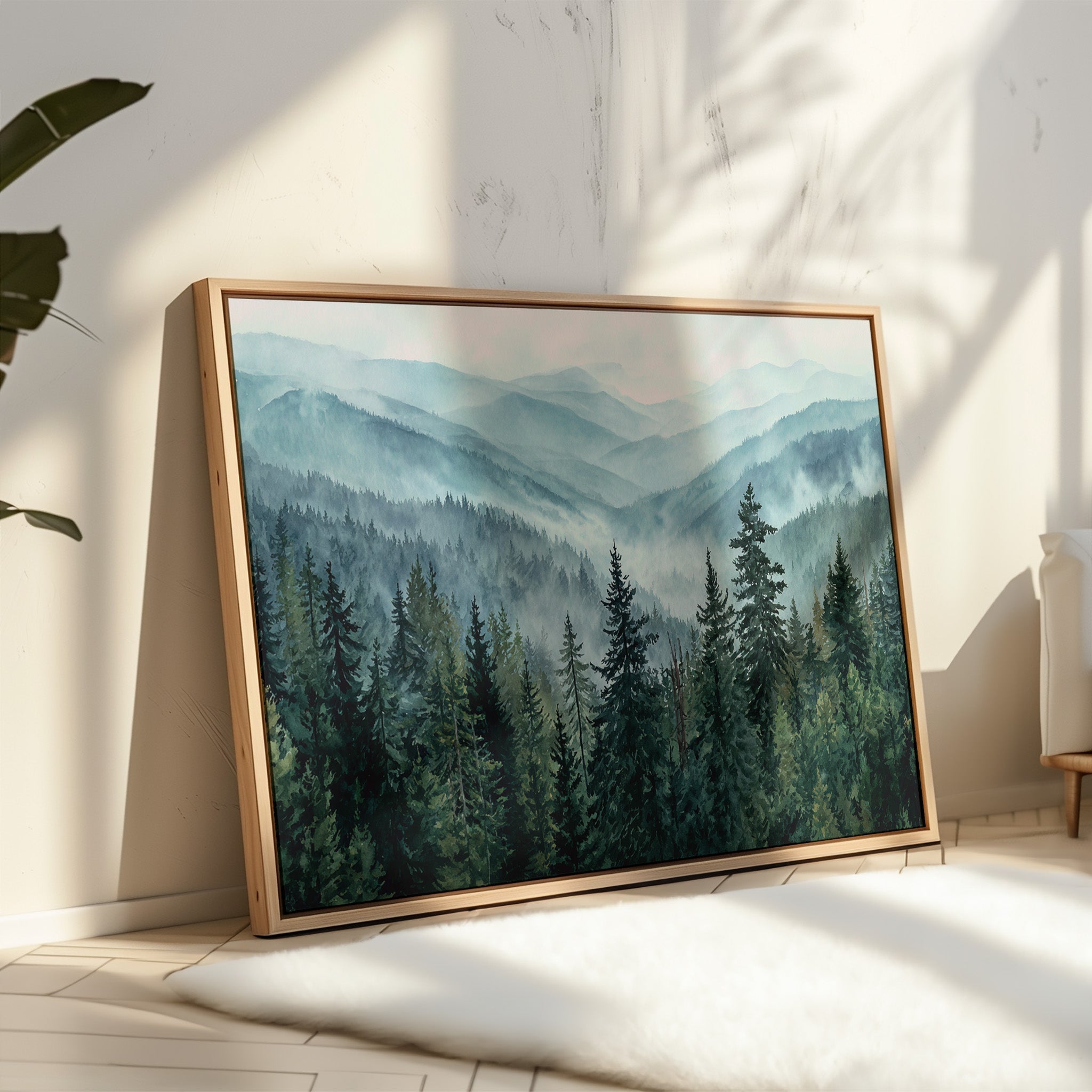 Morning mist weaves through evergreen sentinels, creating a ethereal dance of light and shadow. The cascading ridges fade into deeper shades of blue, each layer revealing another chapter of the wilderness story. Majestic pines stand proud in the foreground, their deep emerald needles contrasting against the soft, atmospheric haze that blankets the distant peaks. This scene captures the timeless dialogue between earth and sky, where mountain air transforms into rolling waves of fog. Perfect for spaces seeking to invoke a sense of tranquility and natural grandeur, especially in meditation rooms or sophisticated living areas where one can contemplate nature's endless mysteries.