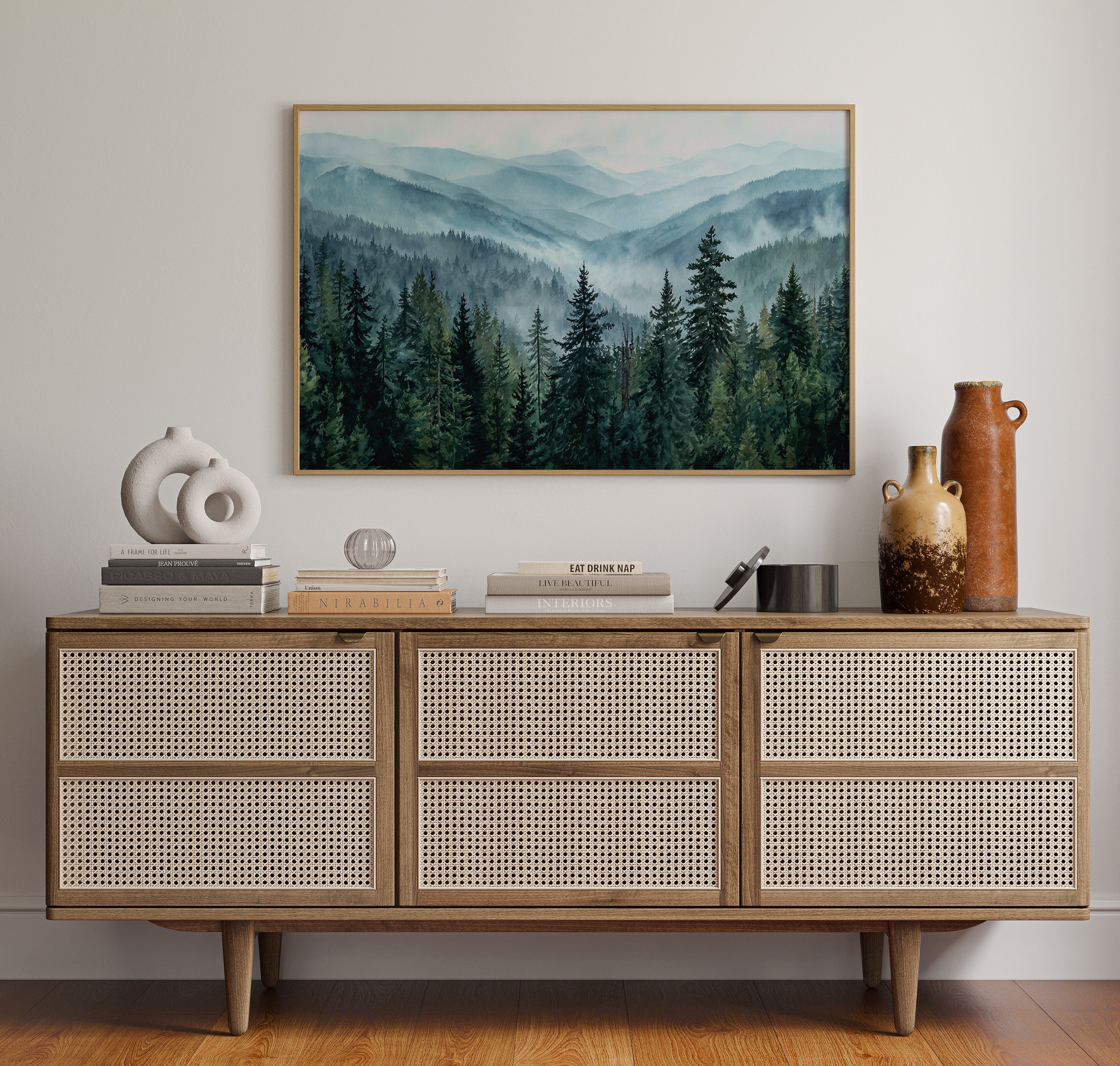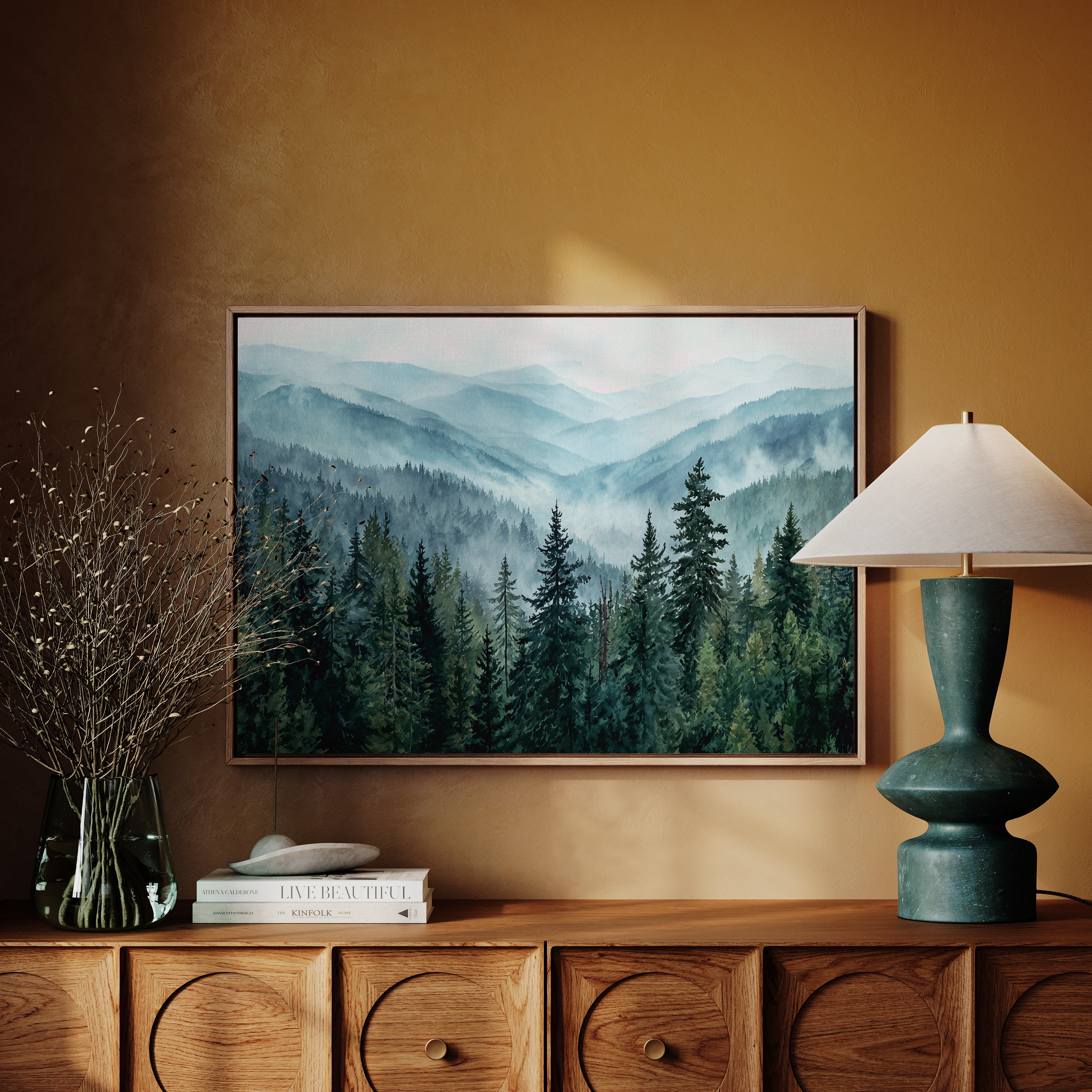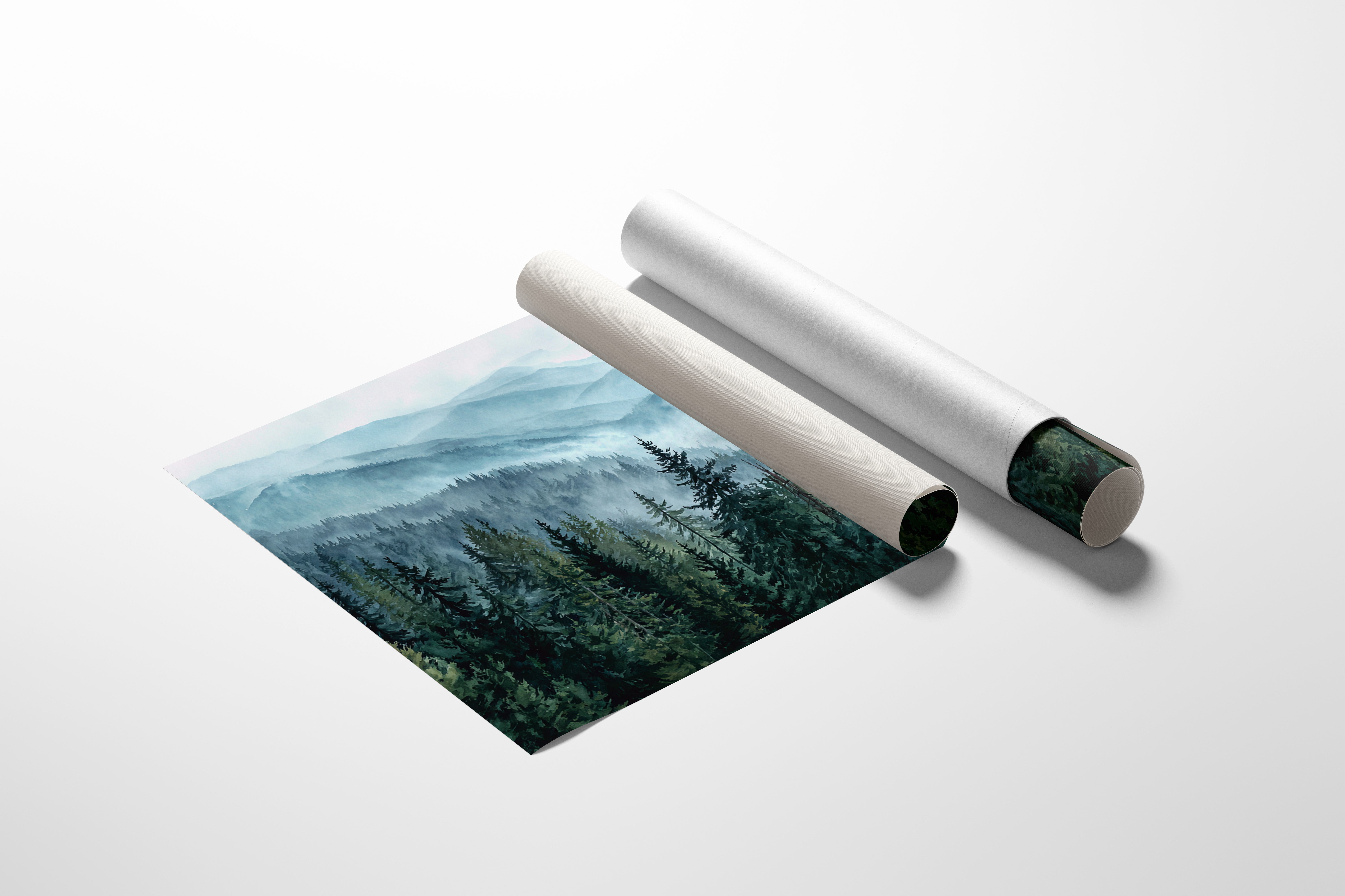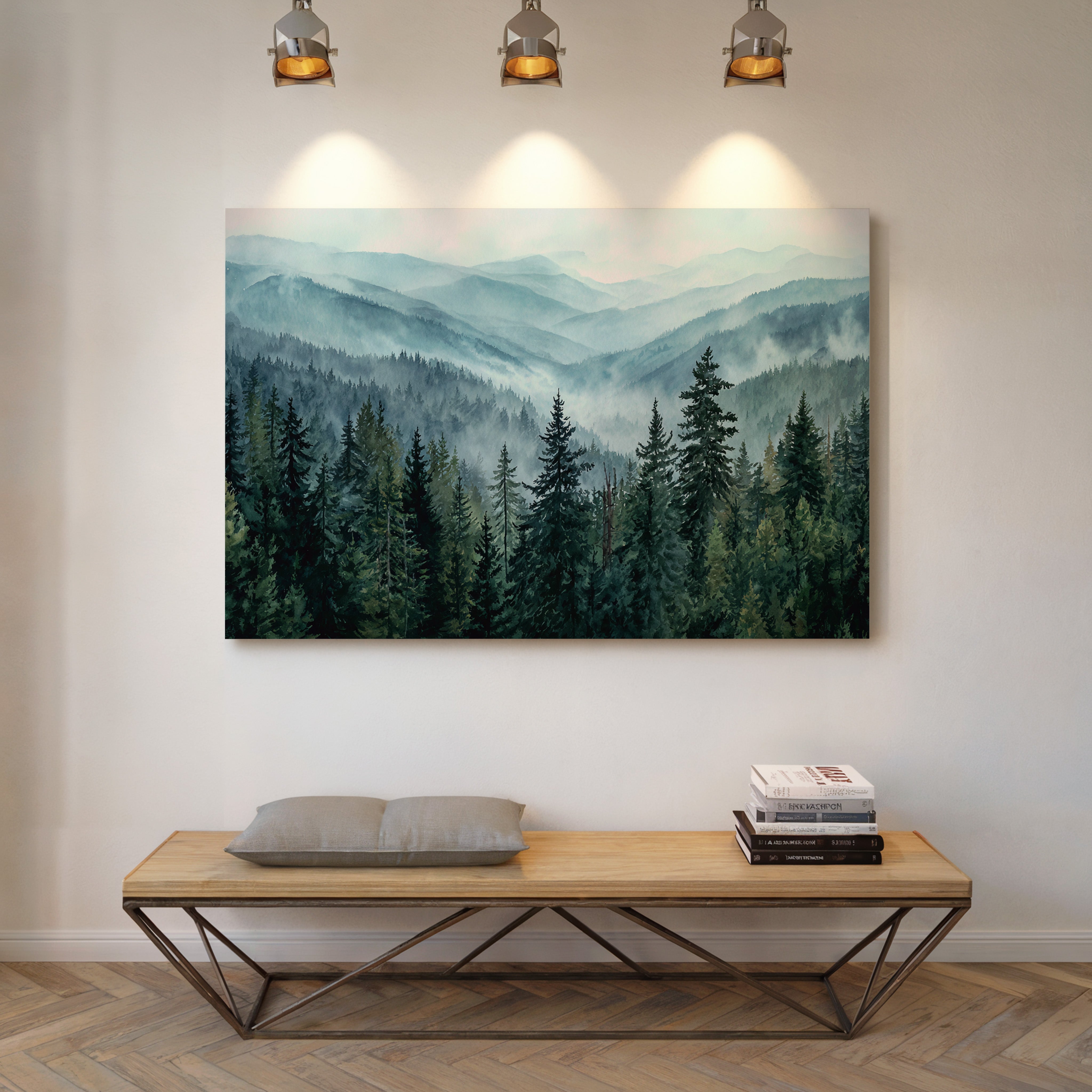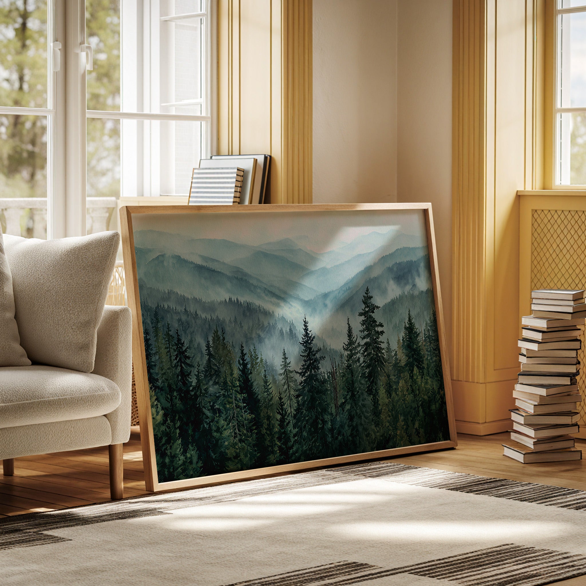 Morning mist weaves through evergreen sentinels, creating a ethereal dance of light and shadow. The cascading ridges fade into deeper shades of blue, each layer revealing another chapter of the wilderness story. Majestic pines stand proud in the foreground, their deep emerald needles contrasting against the soft, atmospheric haze that blankets the distant peaks. This scene captures the timeless dialogue between earth and sky, where mountain air transforms into rolling waves of fog. Perfect for spaces seeking to invoke a sense of tranquility and natural grandeur, especially in meditation rooms or sophisticated living areas where one can contemplate nature's endless mysteries.