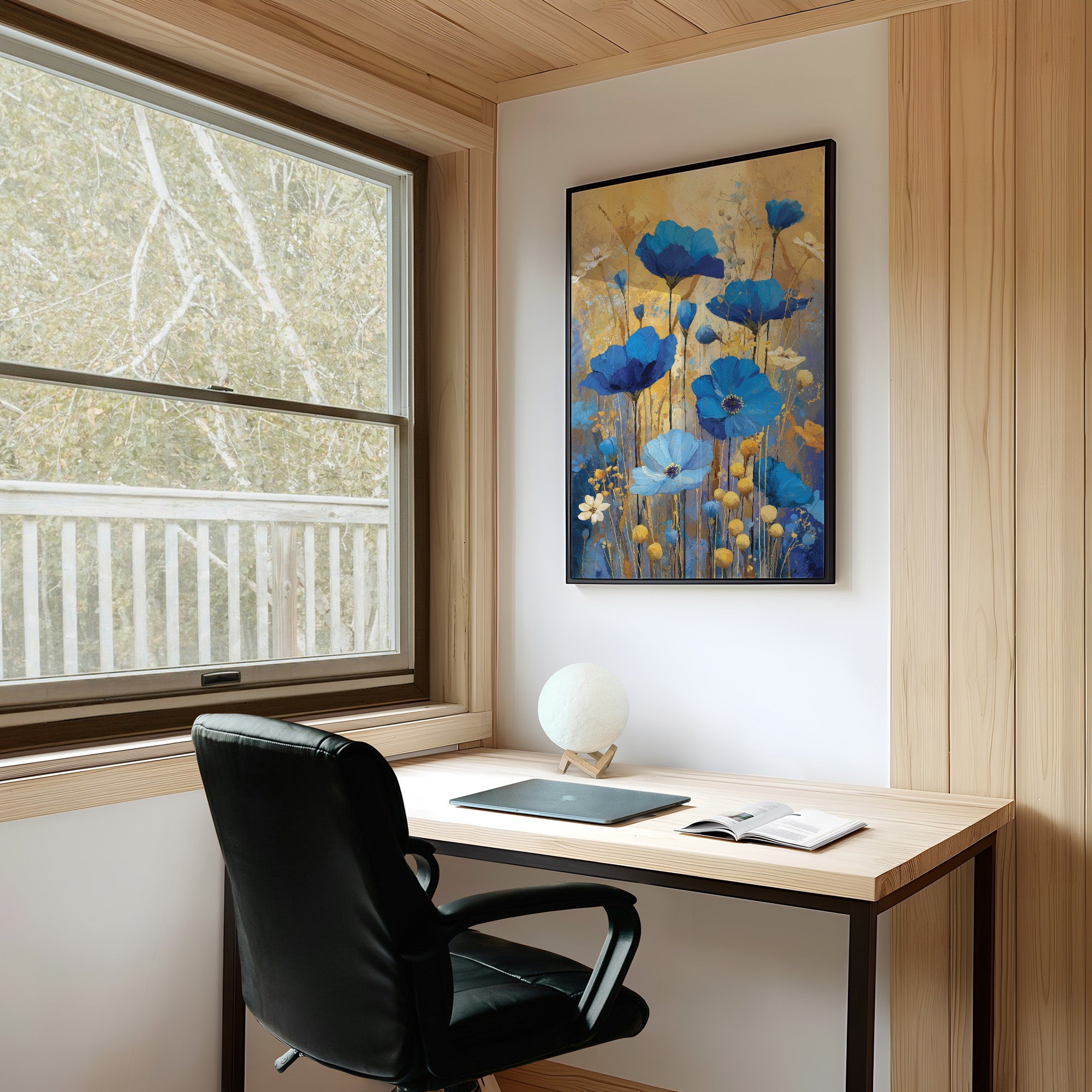 Bold blue blossoms rise against a warm golden backdrop, their textured petals catching the light like wildflowers at the edge of a sunlit meadow. This expressive floral piece blends modern impressionism with abstract brushwork, bringing movement and warmth into the space. A striking addition to living rooms, bedrooms, or creative studios where color and texture can shine.