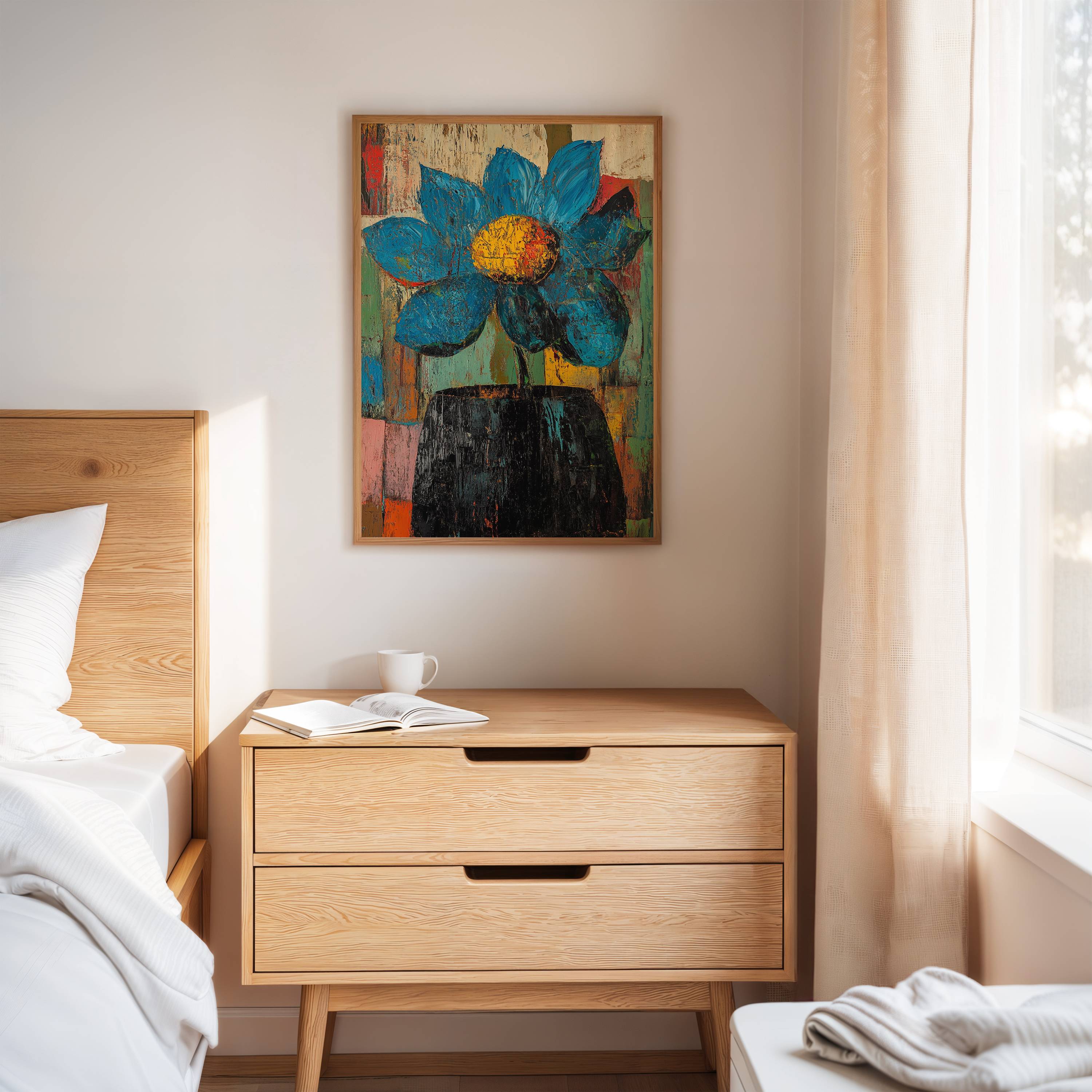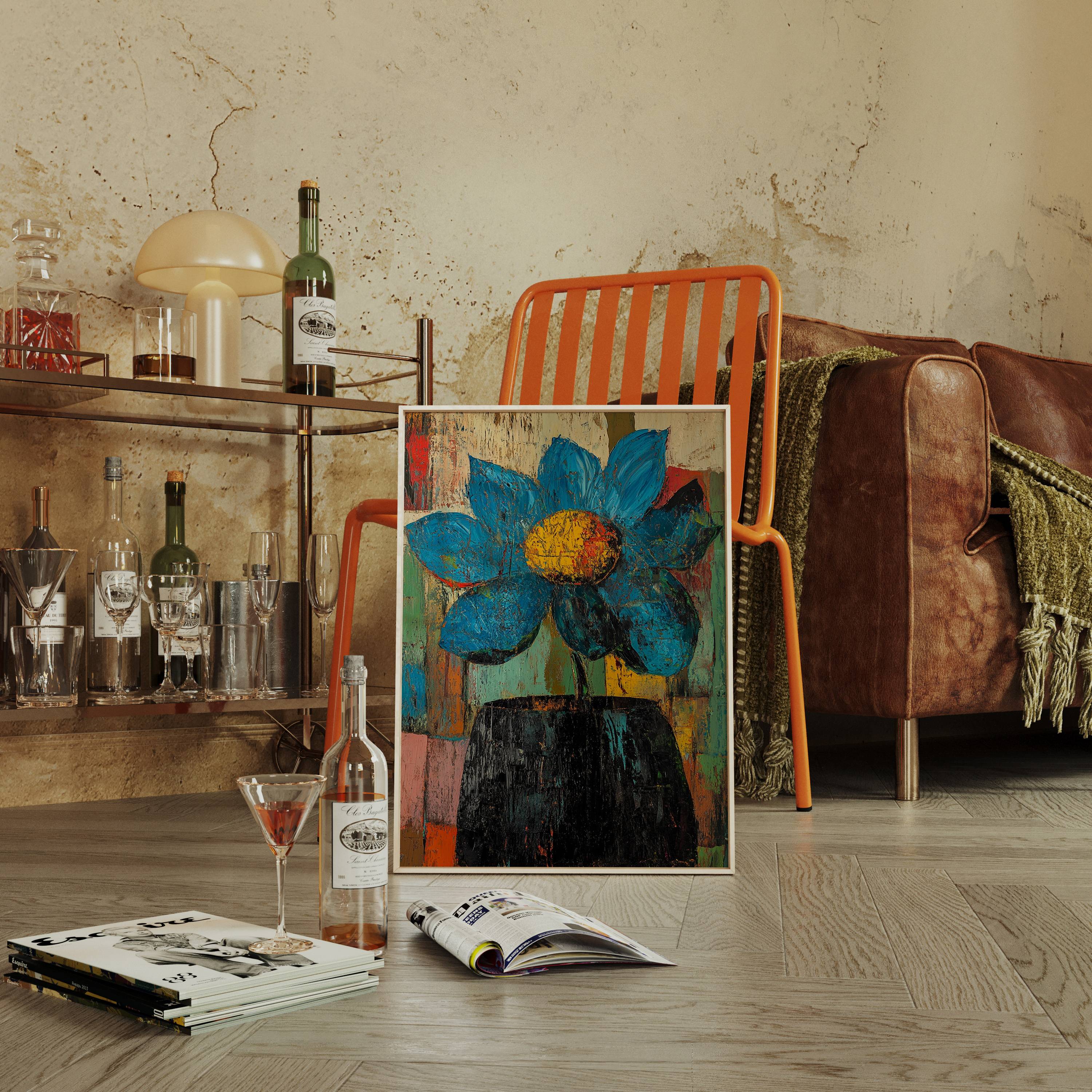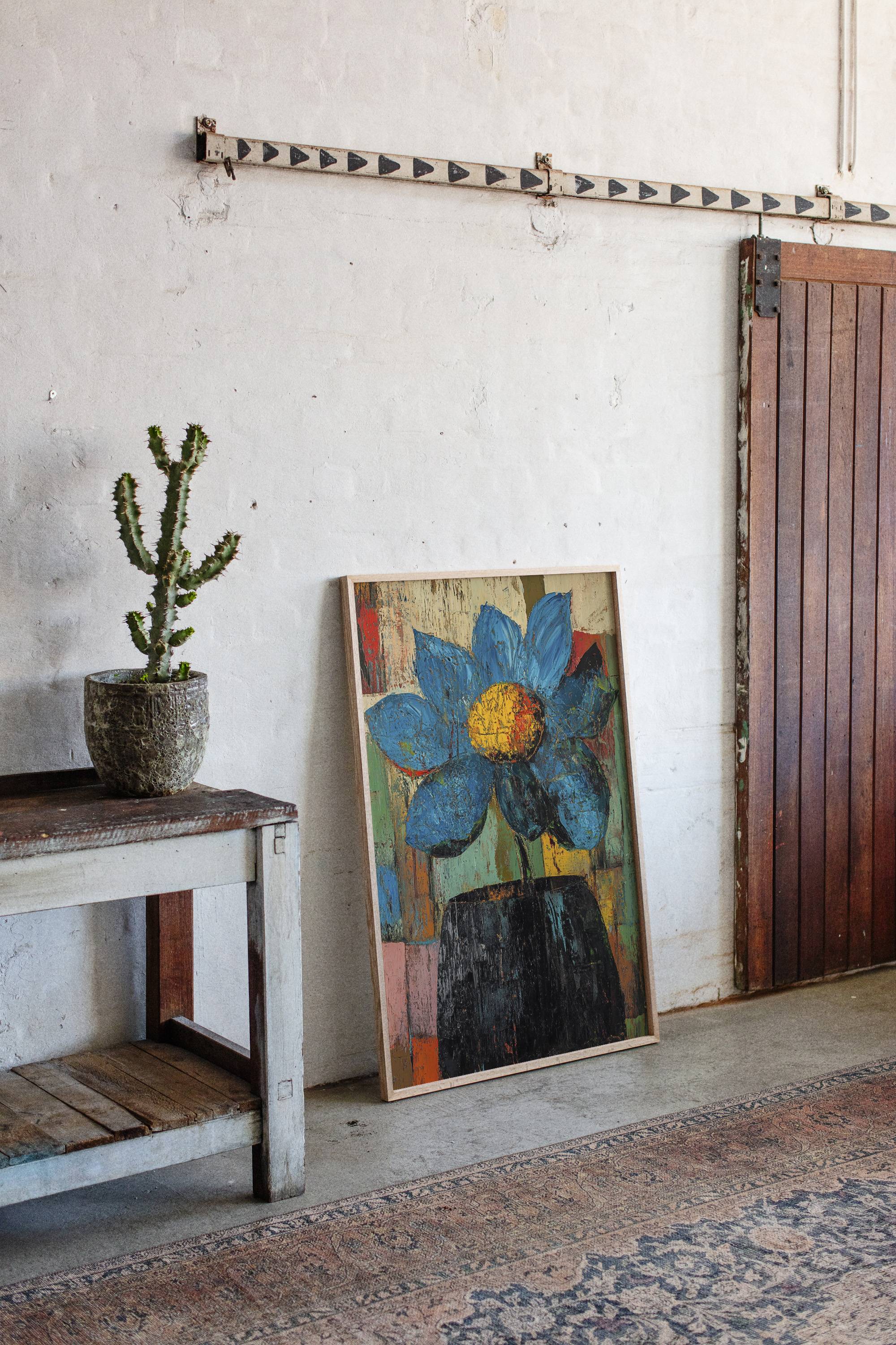 A vibrant turquoise flower commands attention against a weathered, multi-colored backdrop, its presence both bold and poetic. The textured petals, rendered in thick, expressive brushstrokes, surround a golden center that glows like a captured sun. Deep blacks and distressed surfaces create a compelling contrast with the vivid blues and scattered warm accents, suggesting both decay and renewal. This contemporary piece would make a striking focal point in a modern dining room or add artistic depth to a minimalist living space, where its emotional rawness can spark conversation and contemplation.
