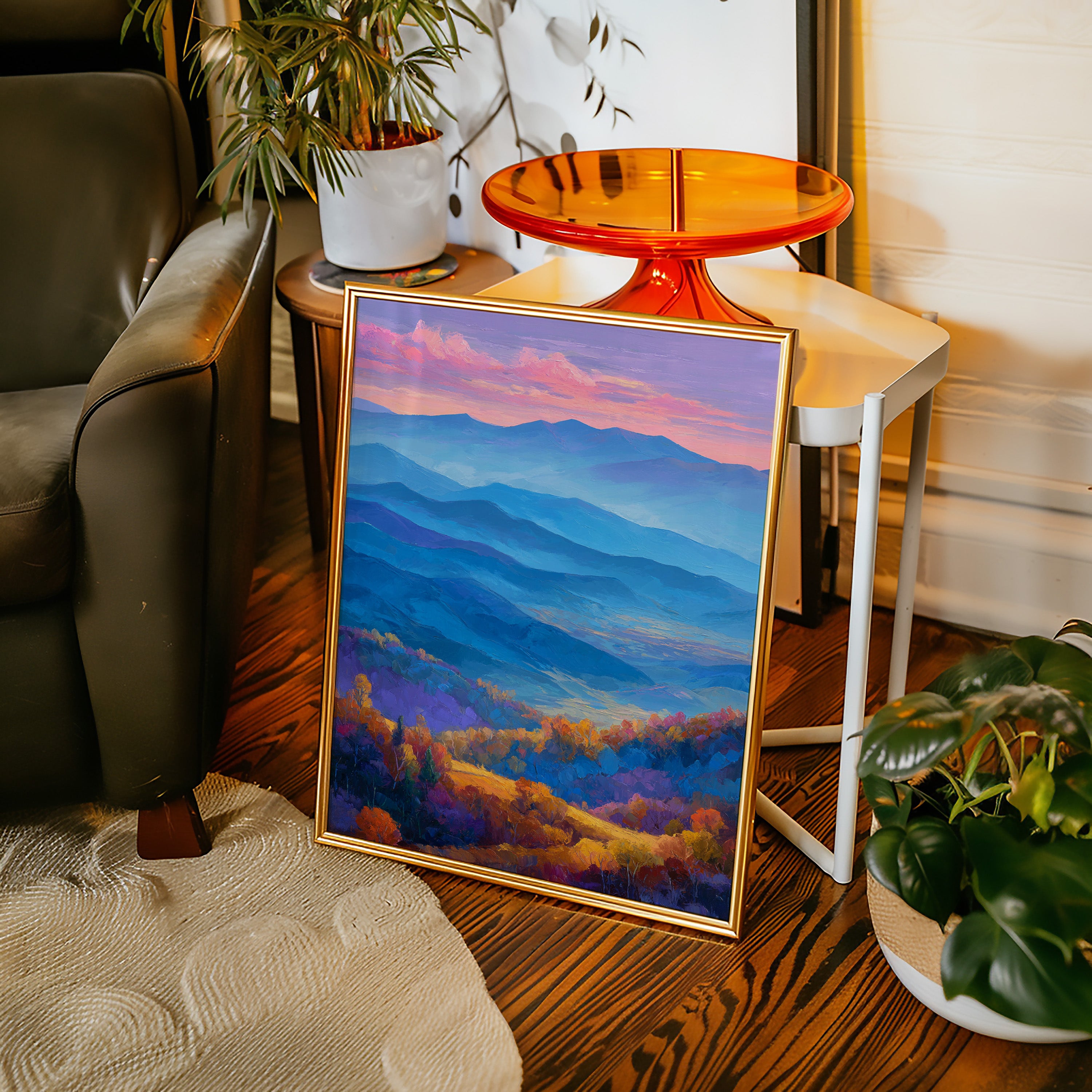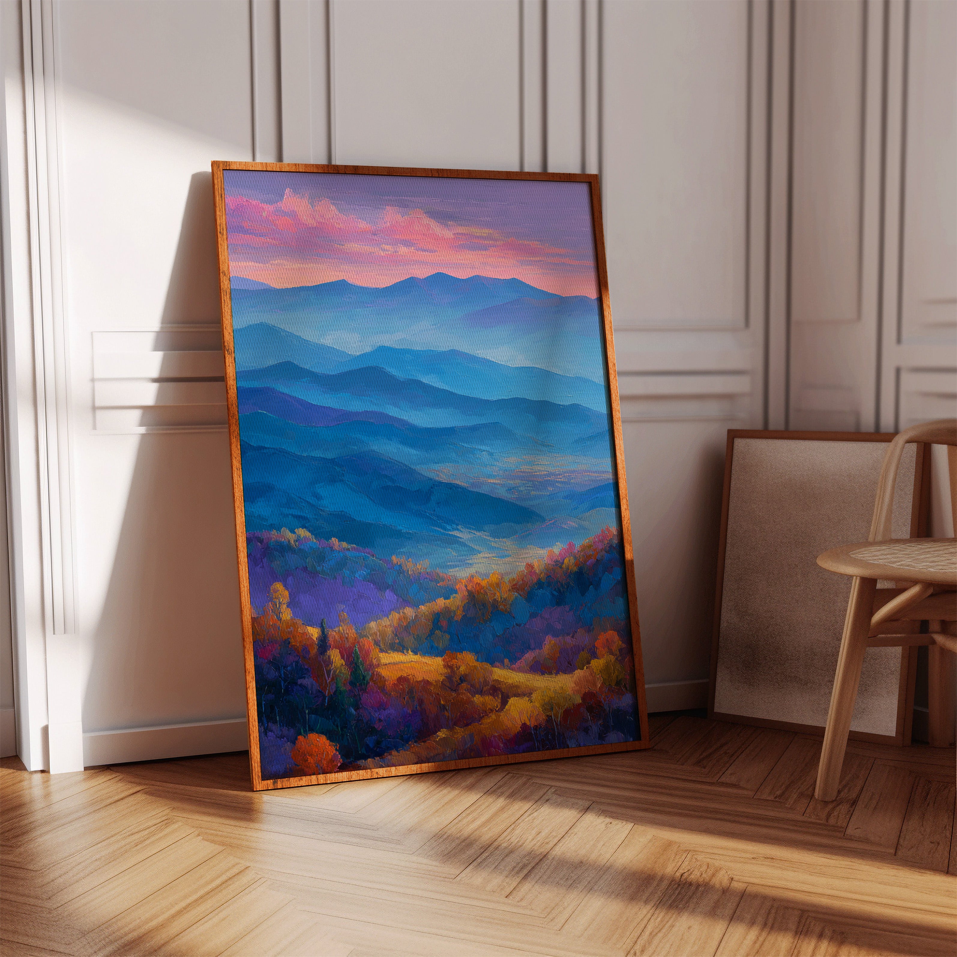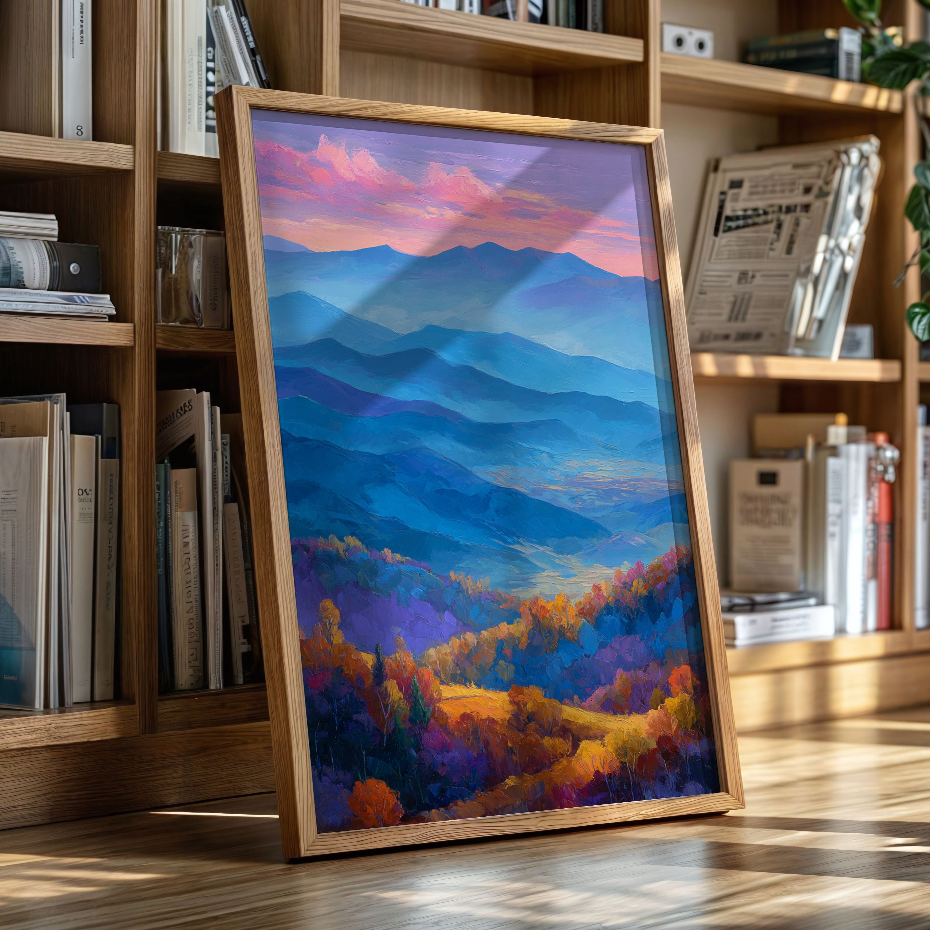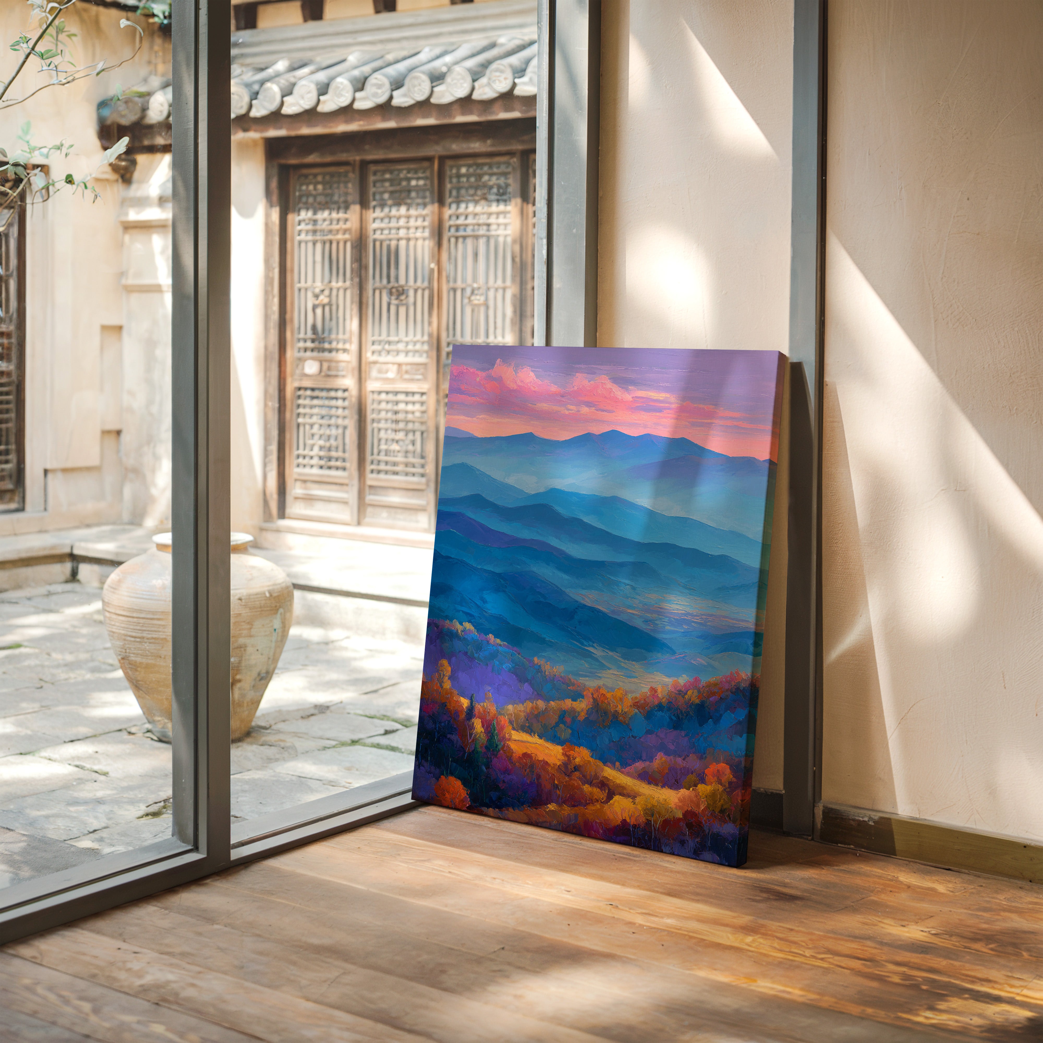 Dawn breaks over rolling mountains, painting the sky in tender coral hues that dance with twilight purple. Layer upon layer of ridges cascade into the distance, each fold draped in deepening shades of blue and indigo. In the foreground, autumn has set the valley ablaze with golden meadows and vibrant foliage, creating a dramatic contrast against the cool mountain palette. The textured brushstrokes capture the rugged terrain while maintaining a dreamlike quality, as if the landscape itself is flowing like music. This piece would bring serene majesty to a living room or office space, creating a window to the wilderness that changes with the day's light.